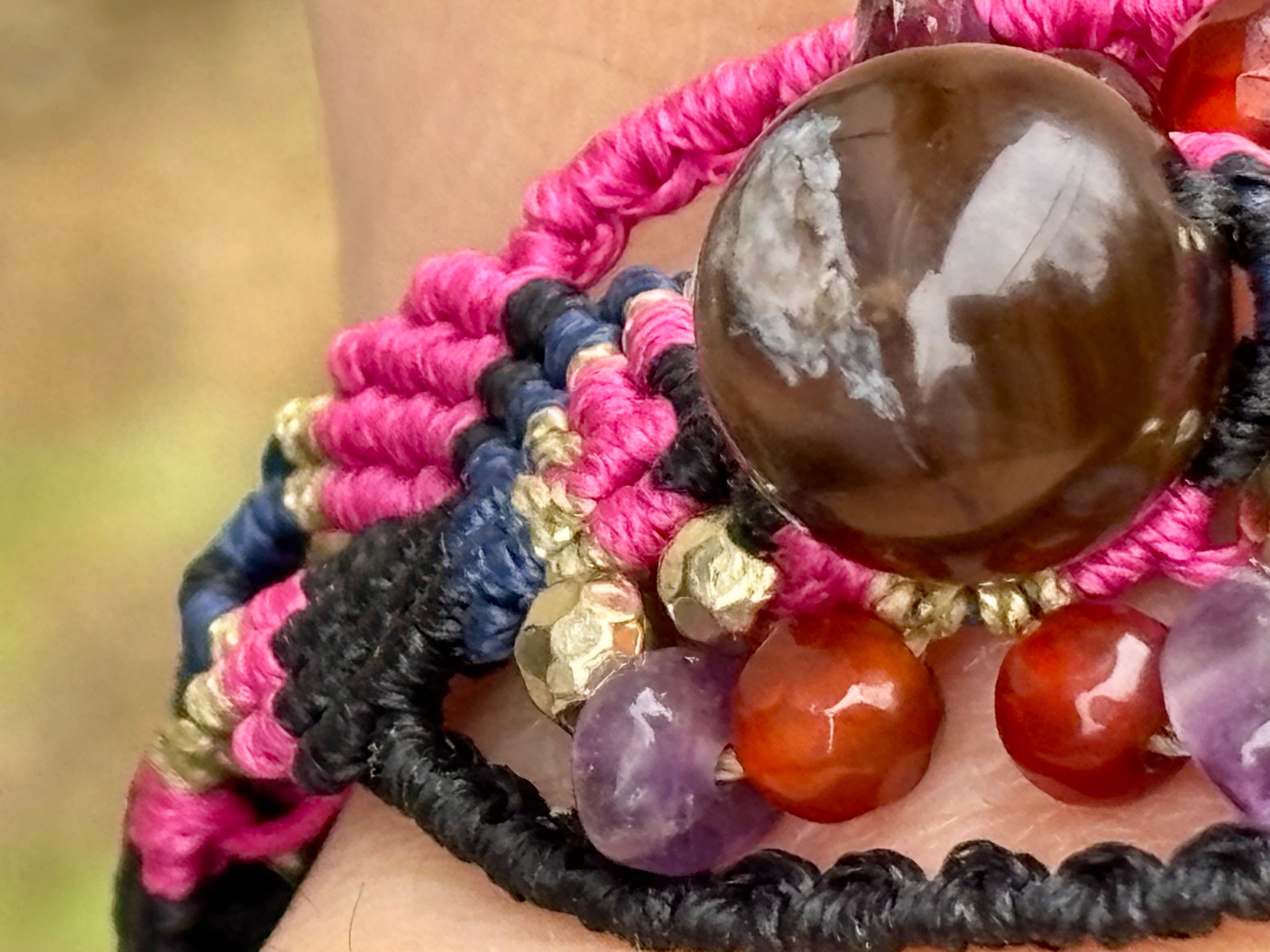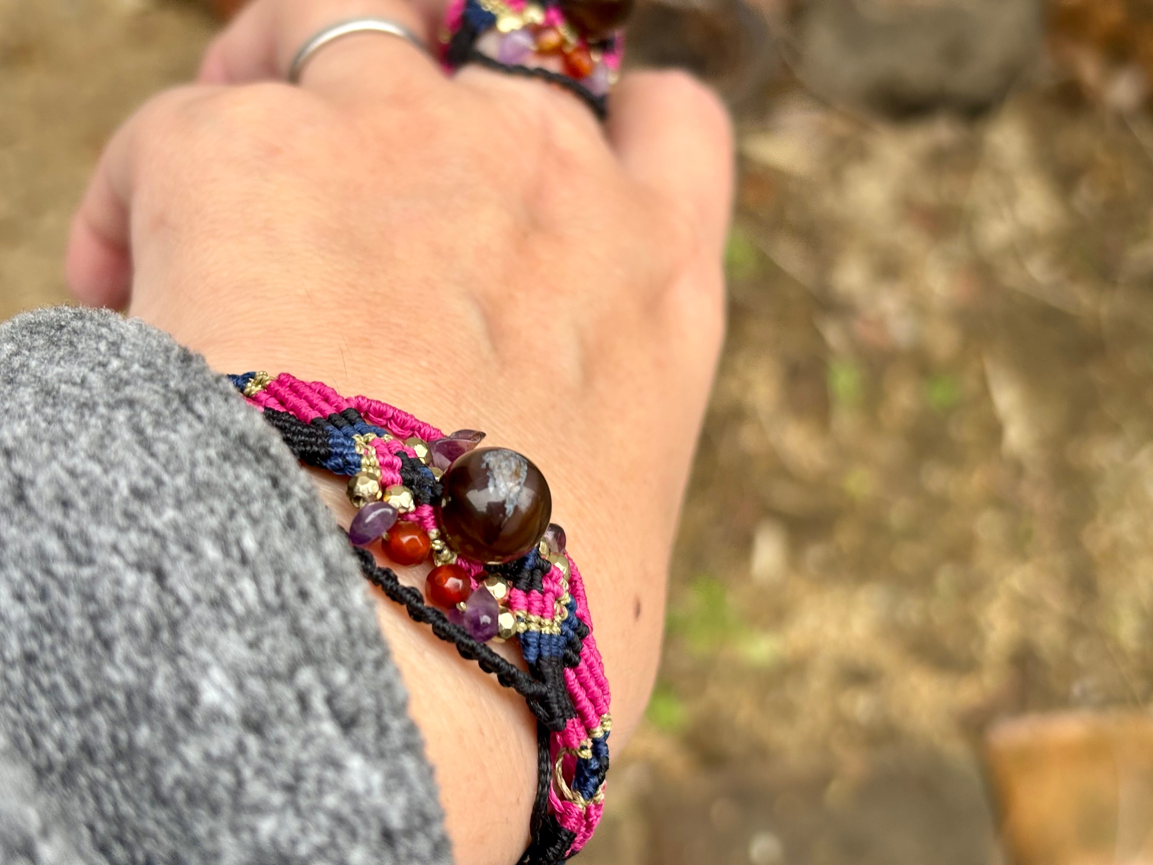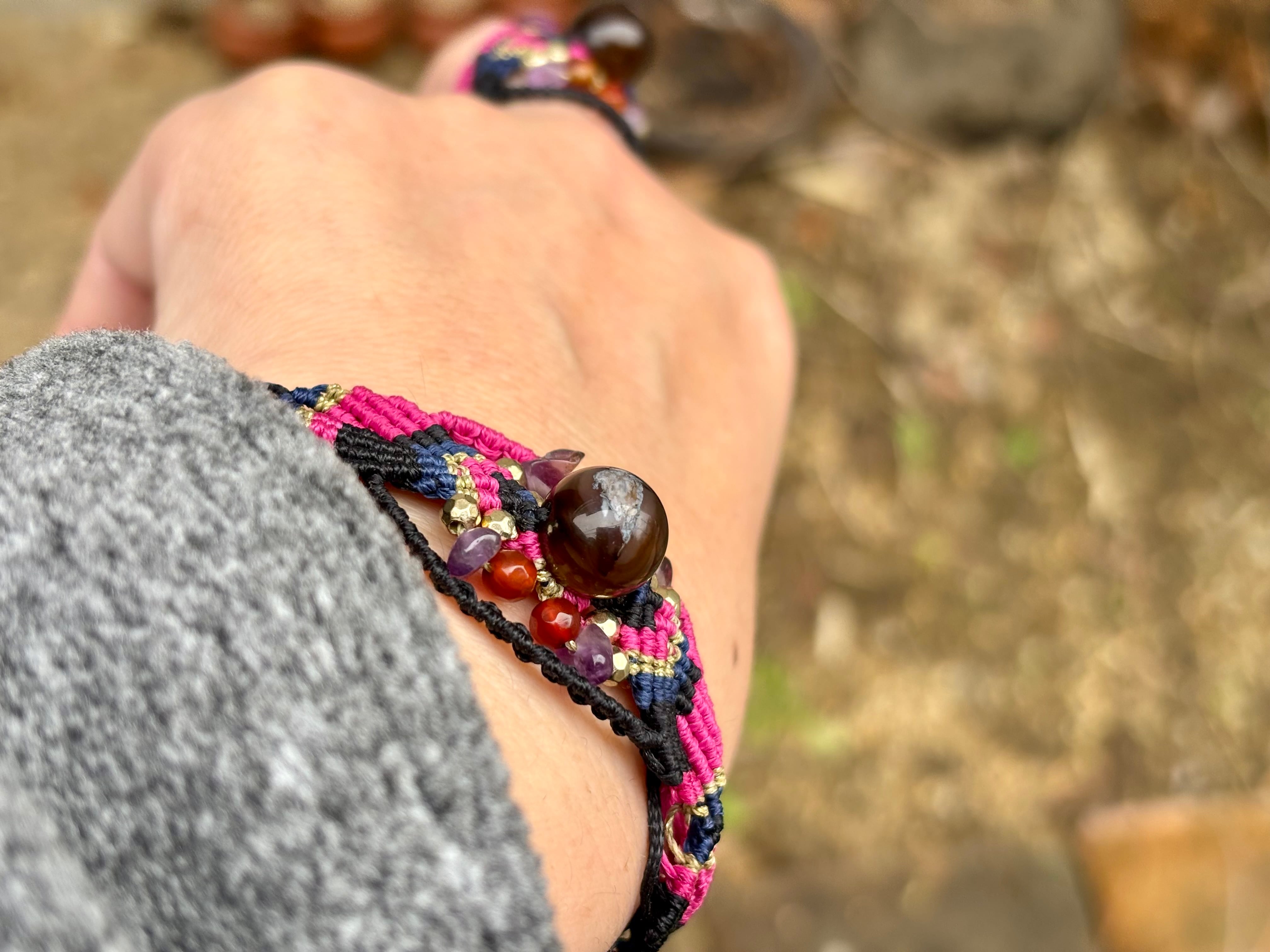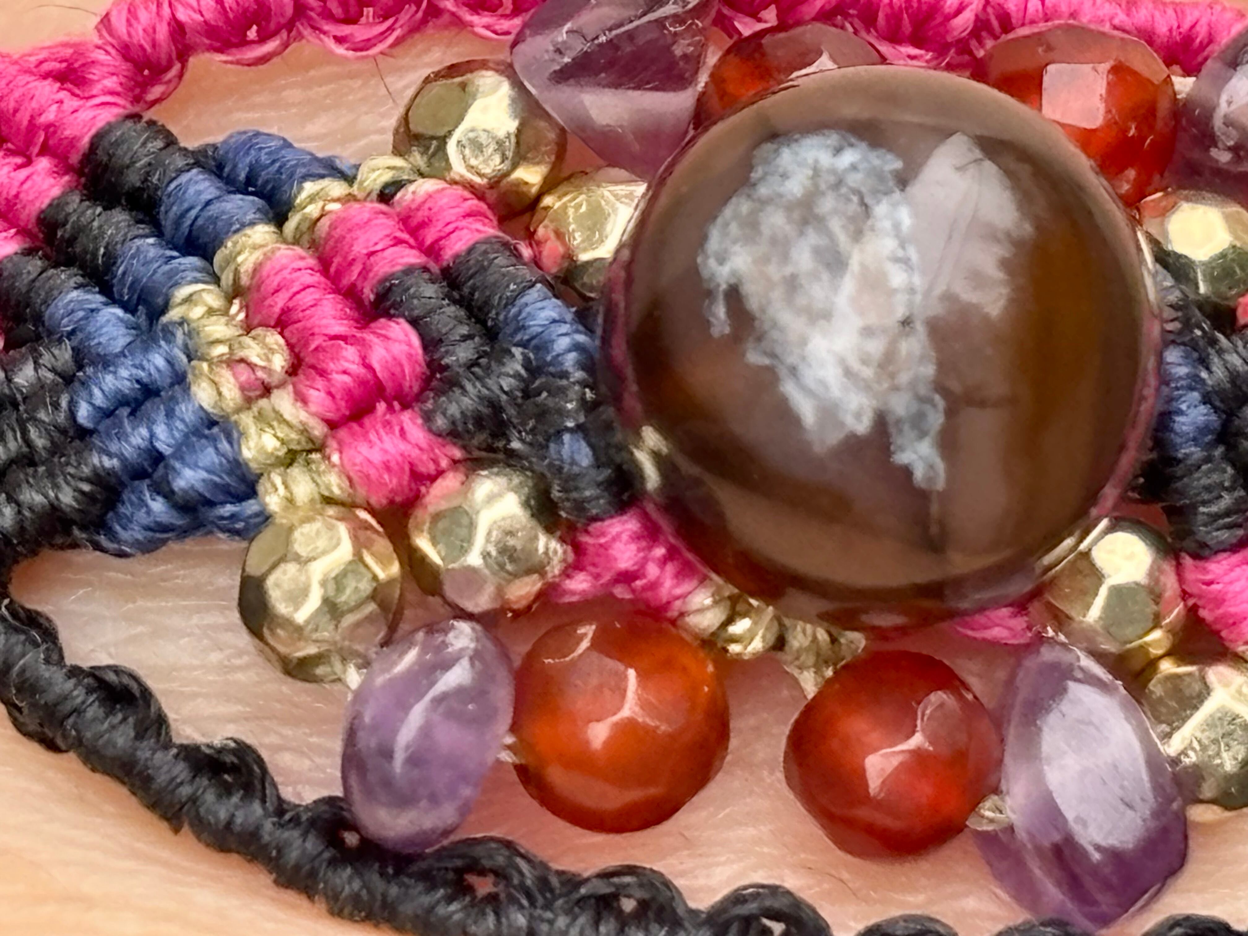 #1019黒♡桜瑪瑙一点物(ブラック桜瑪瑙×カーネリアン×アメジスト マクラメ編みブレスレット)