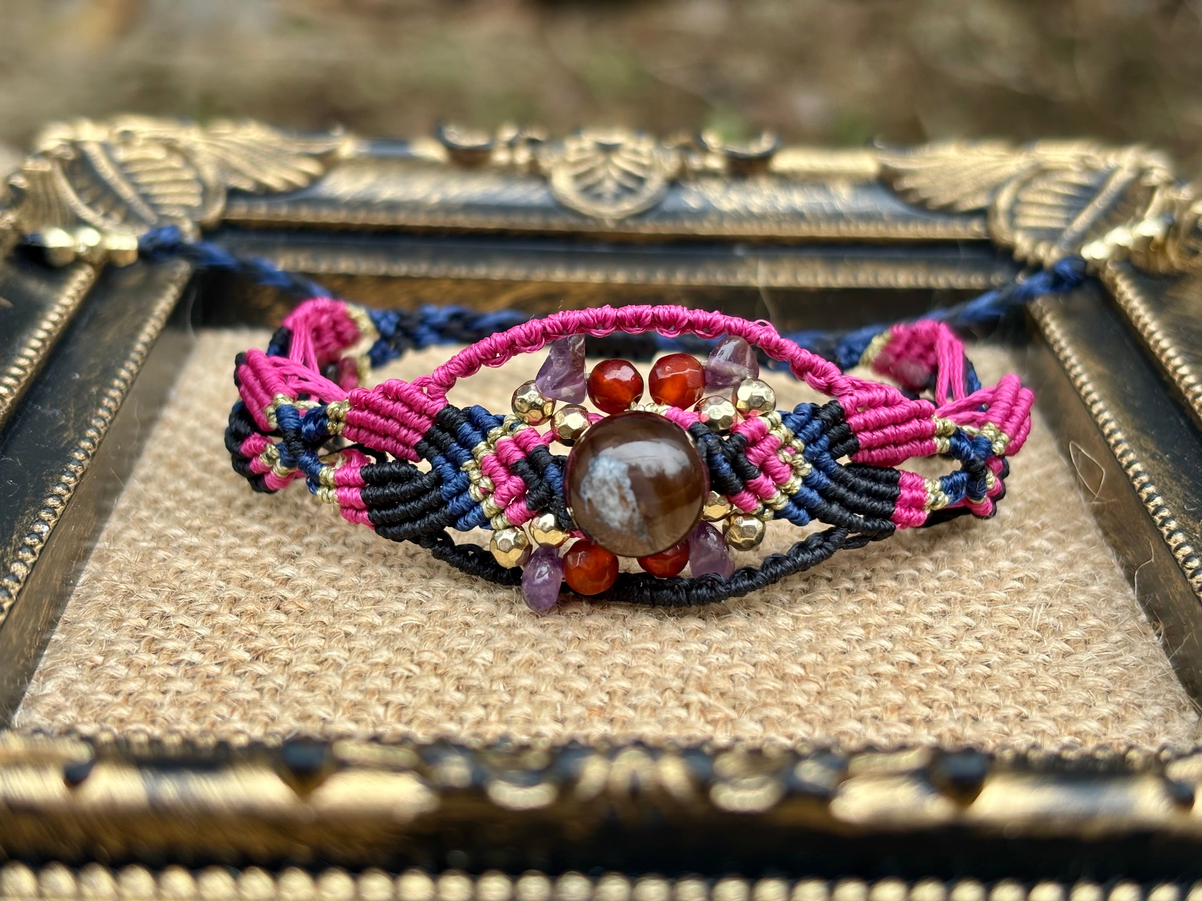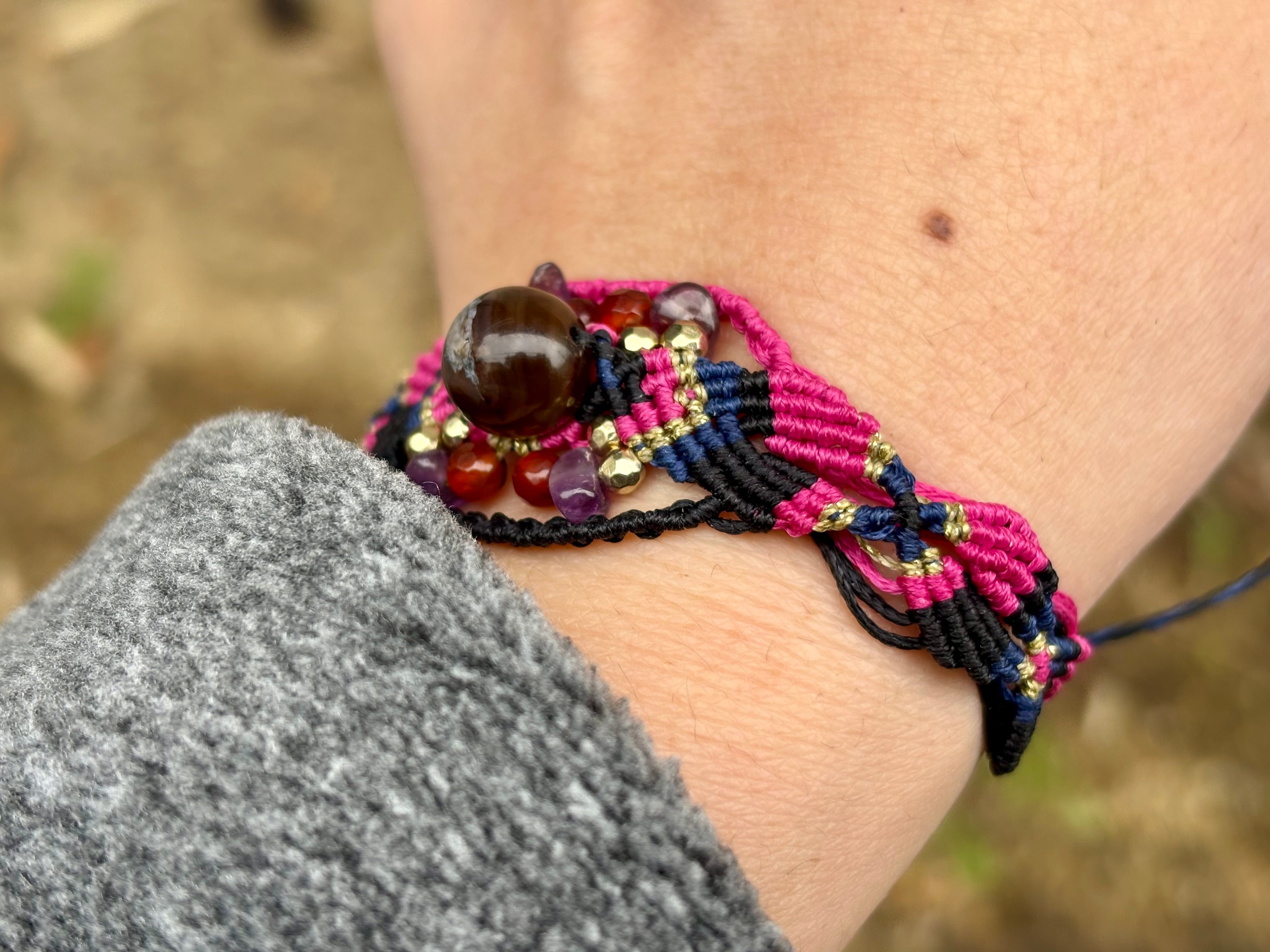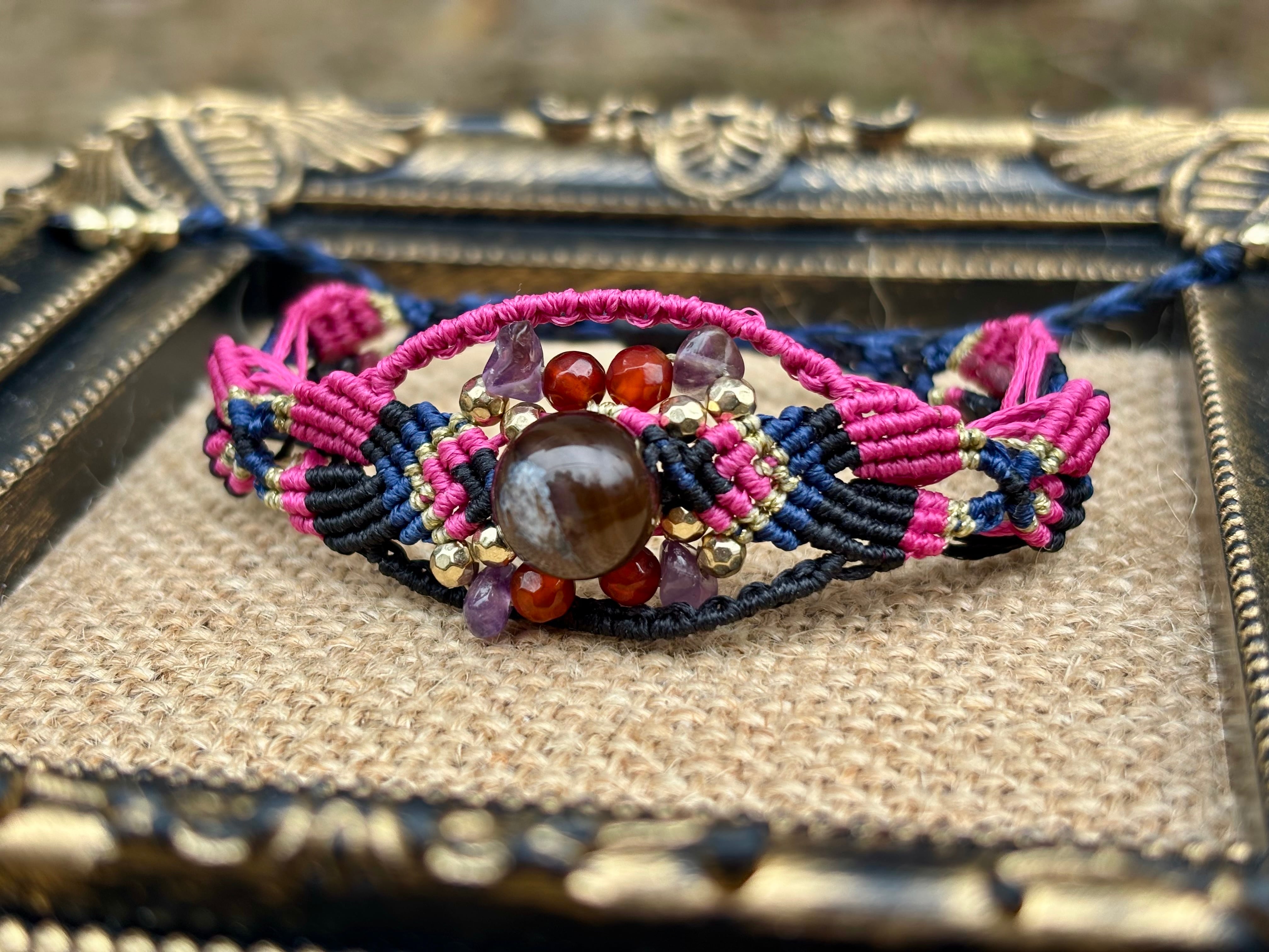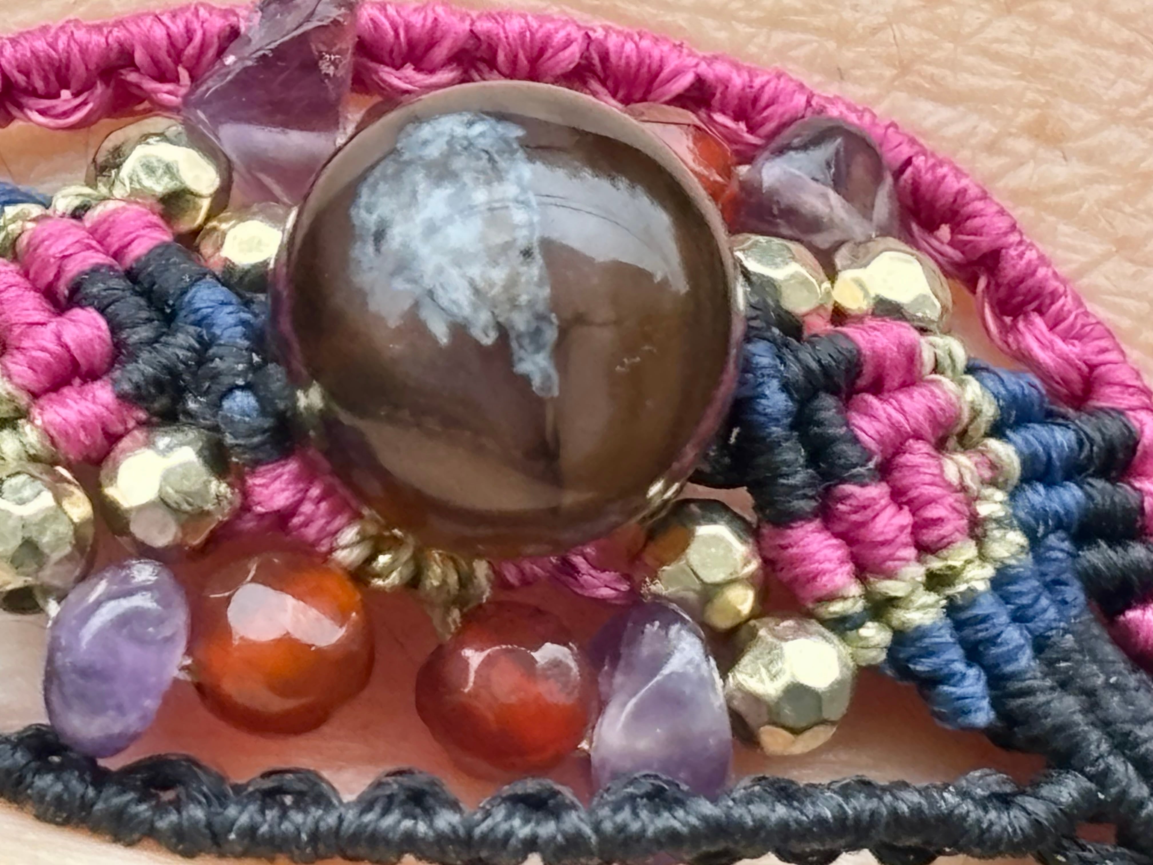 #1019黒♡桜瑪瑙一点物(ブラック桜瑪瑙×カーネリアン×アメジスト マクラメ編みブレスレット)