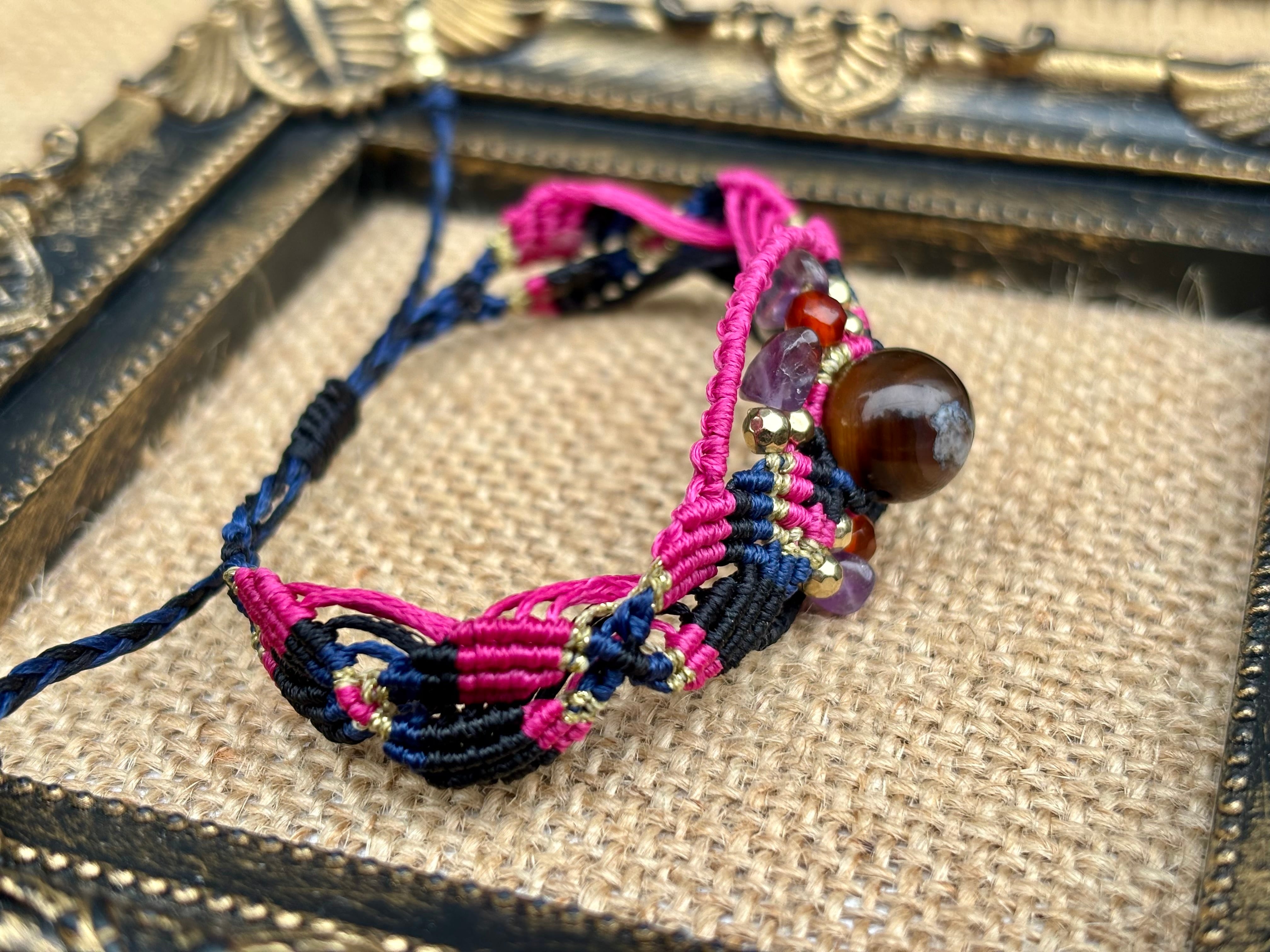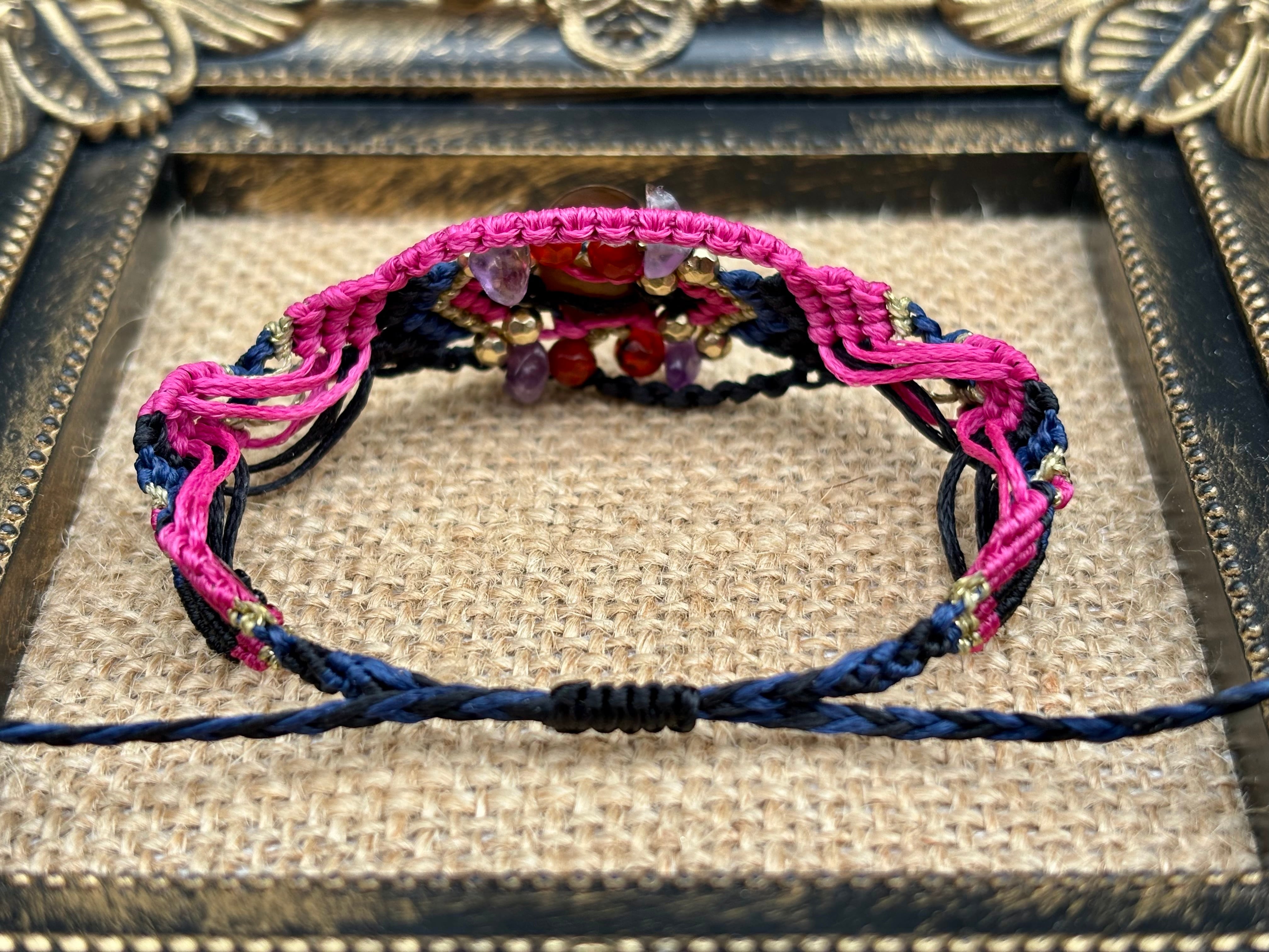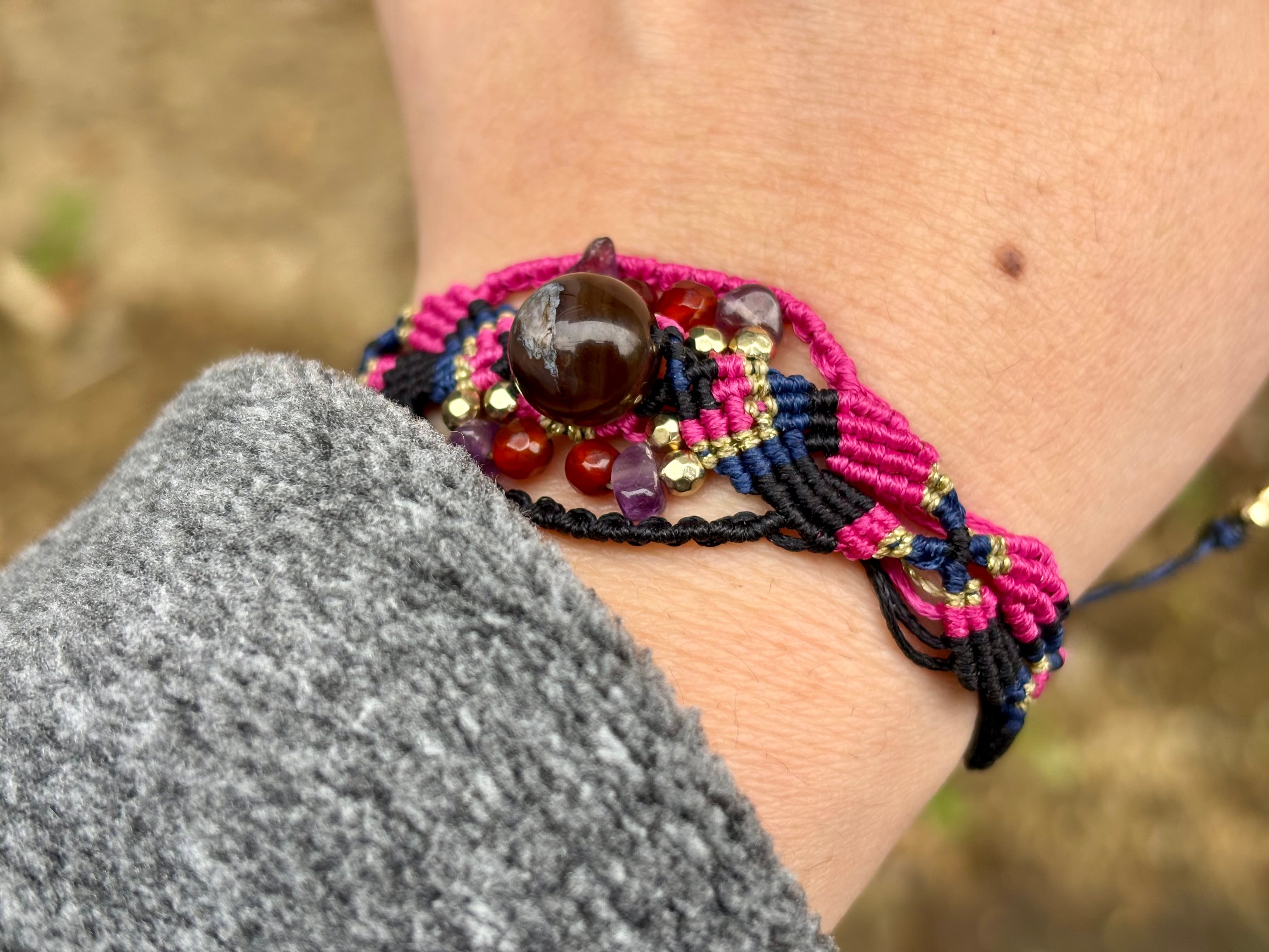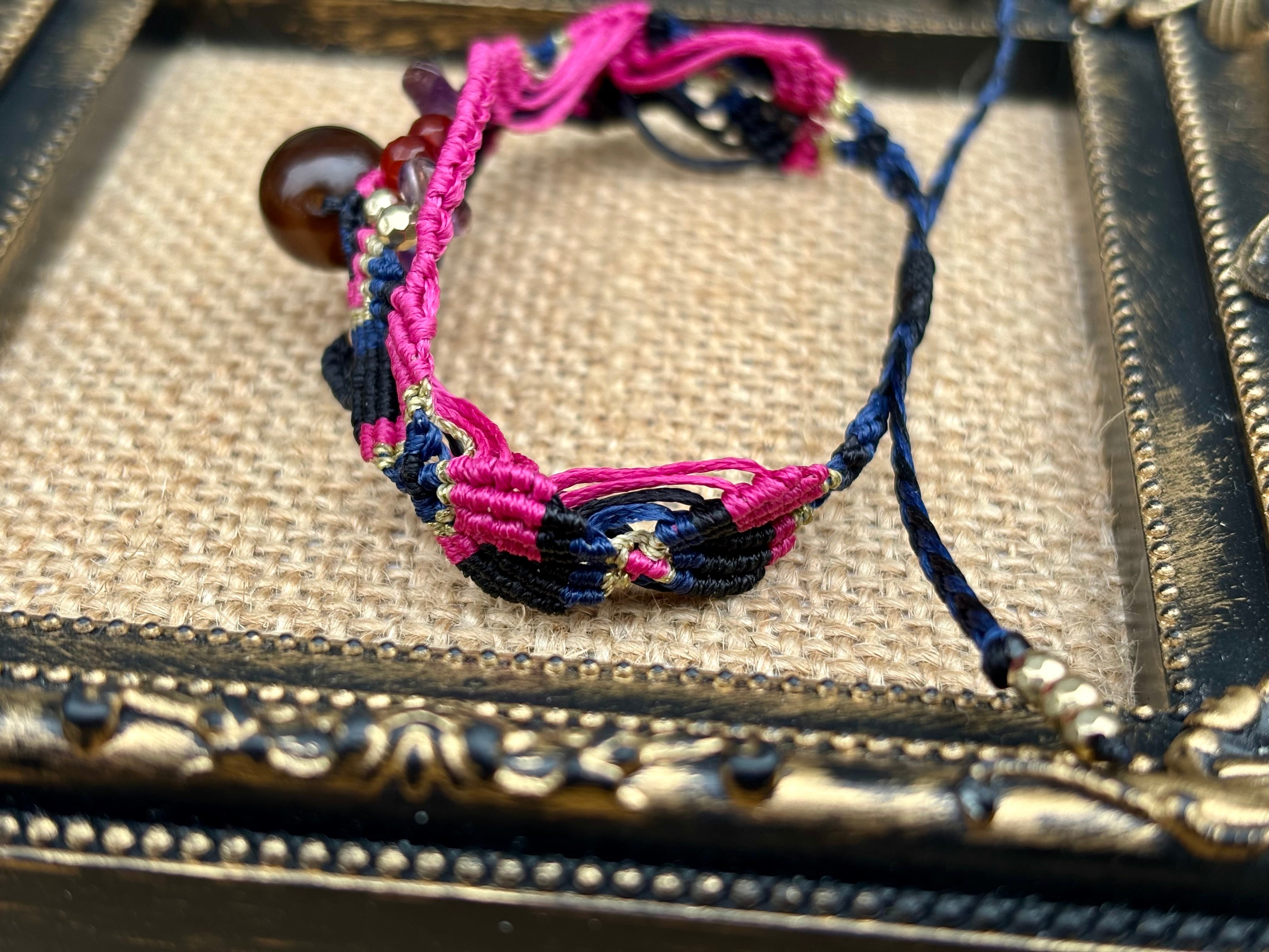 #1019黒♡桜瑪瑙一点物(ブラック桜瑪瑙×カーネリアン×アメジスト マクラメ編みブレスレット)