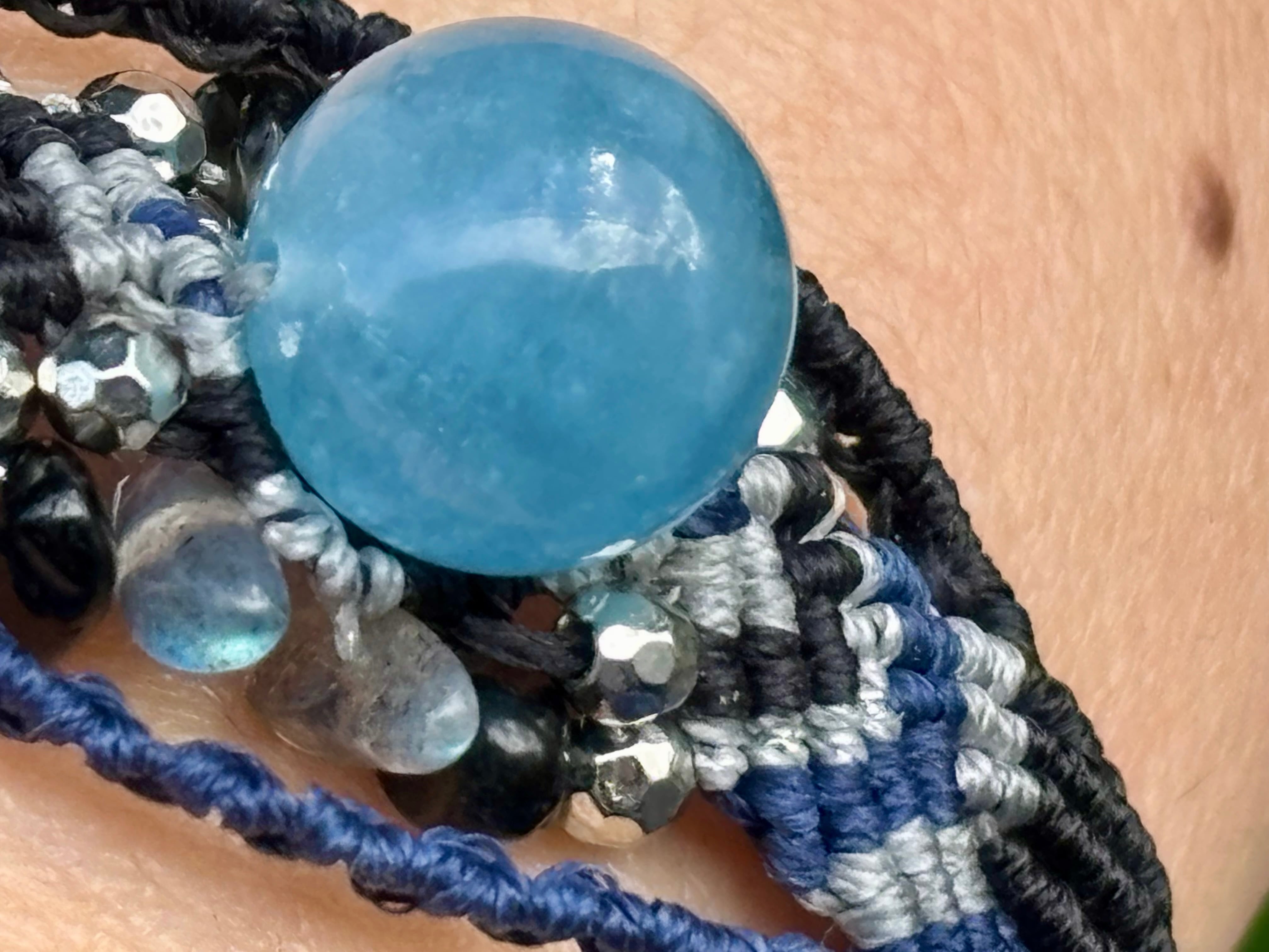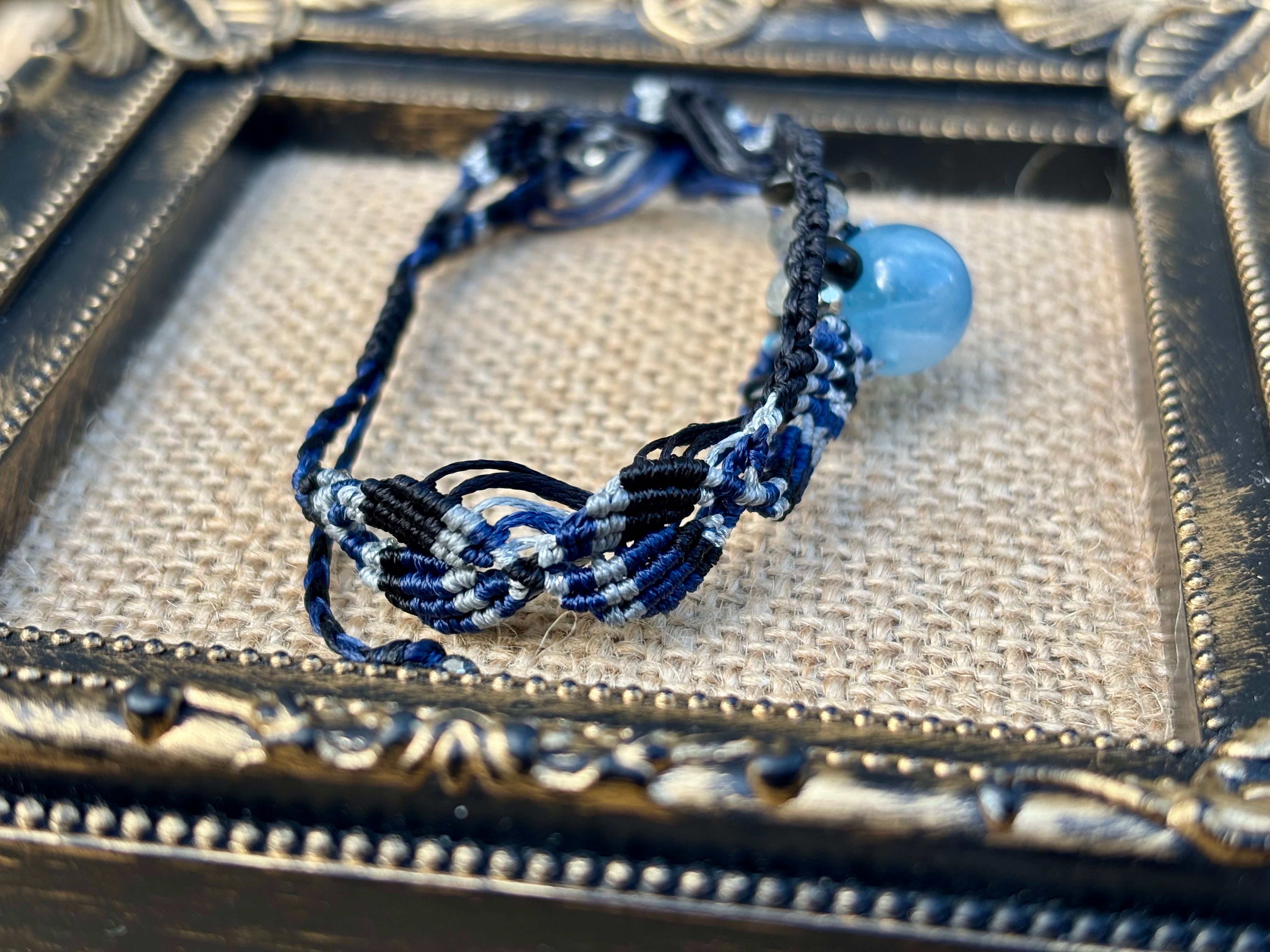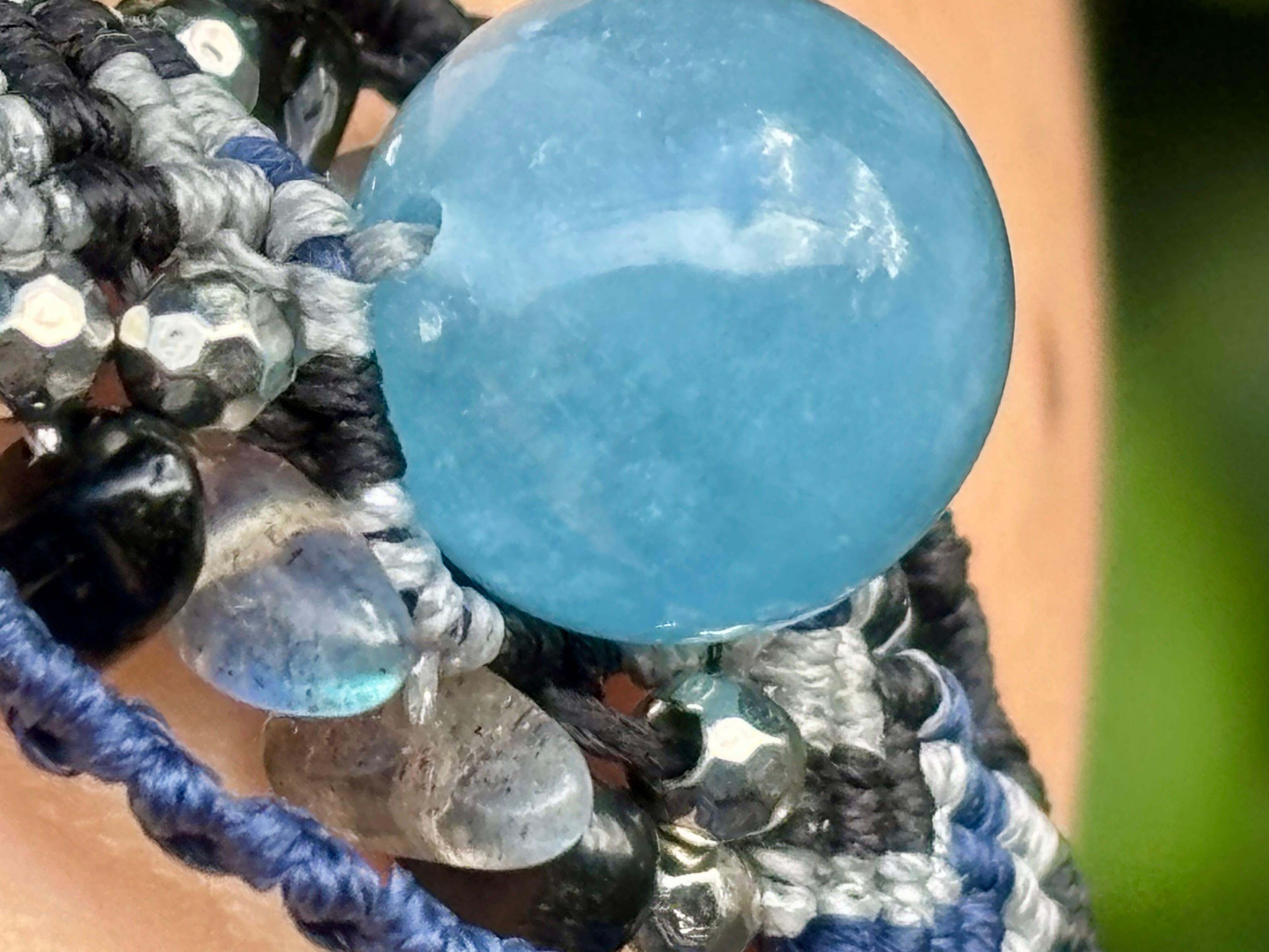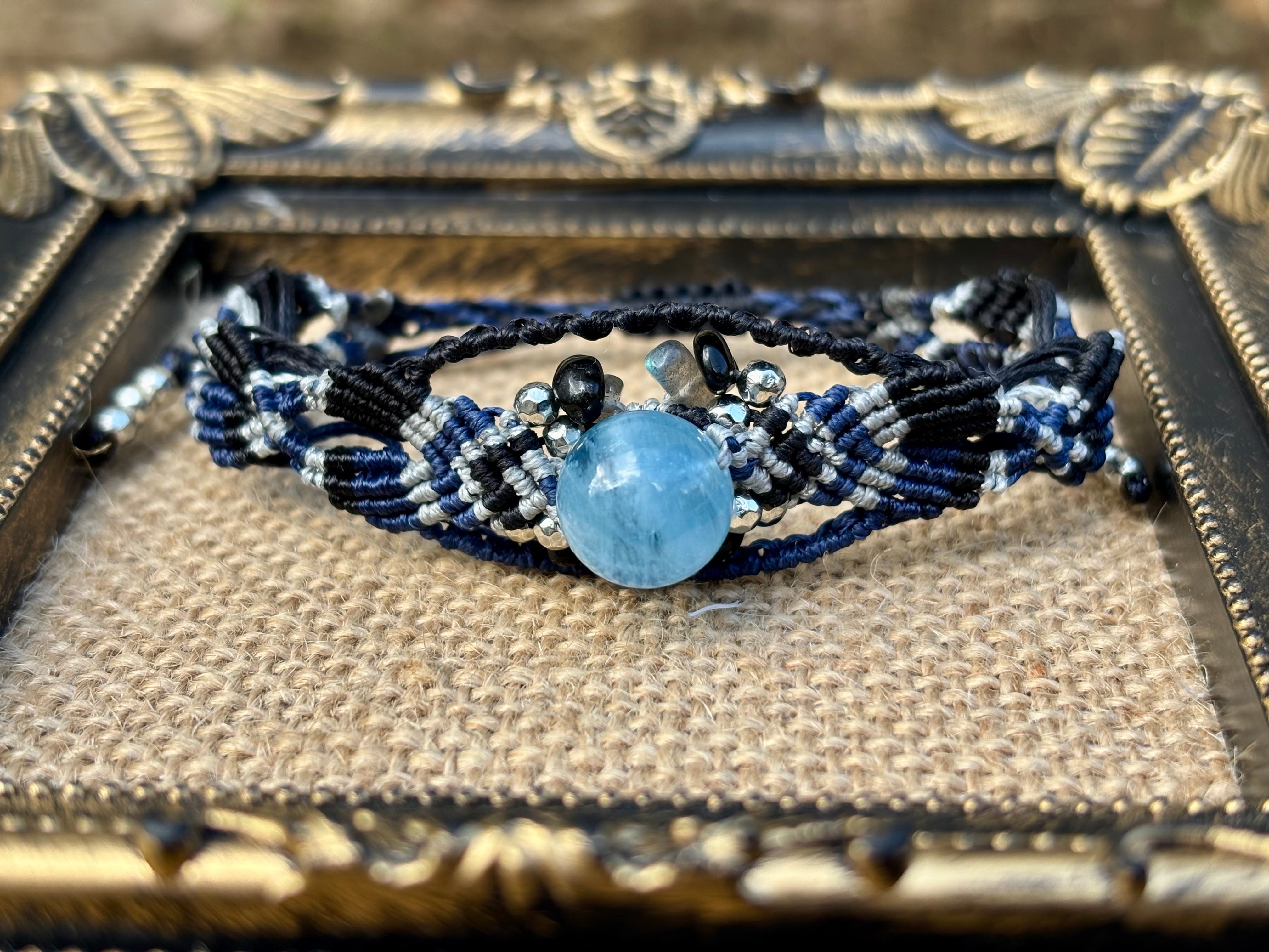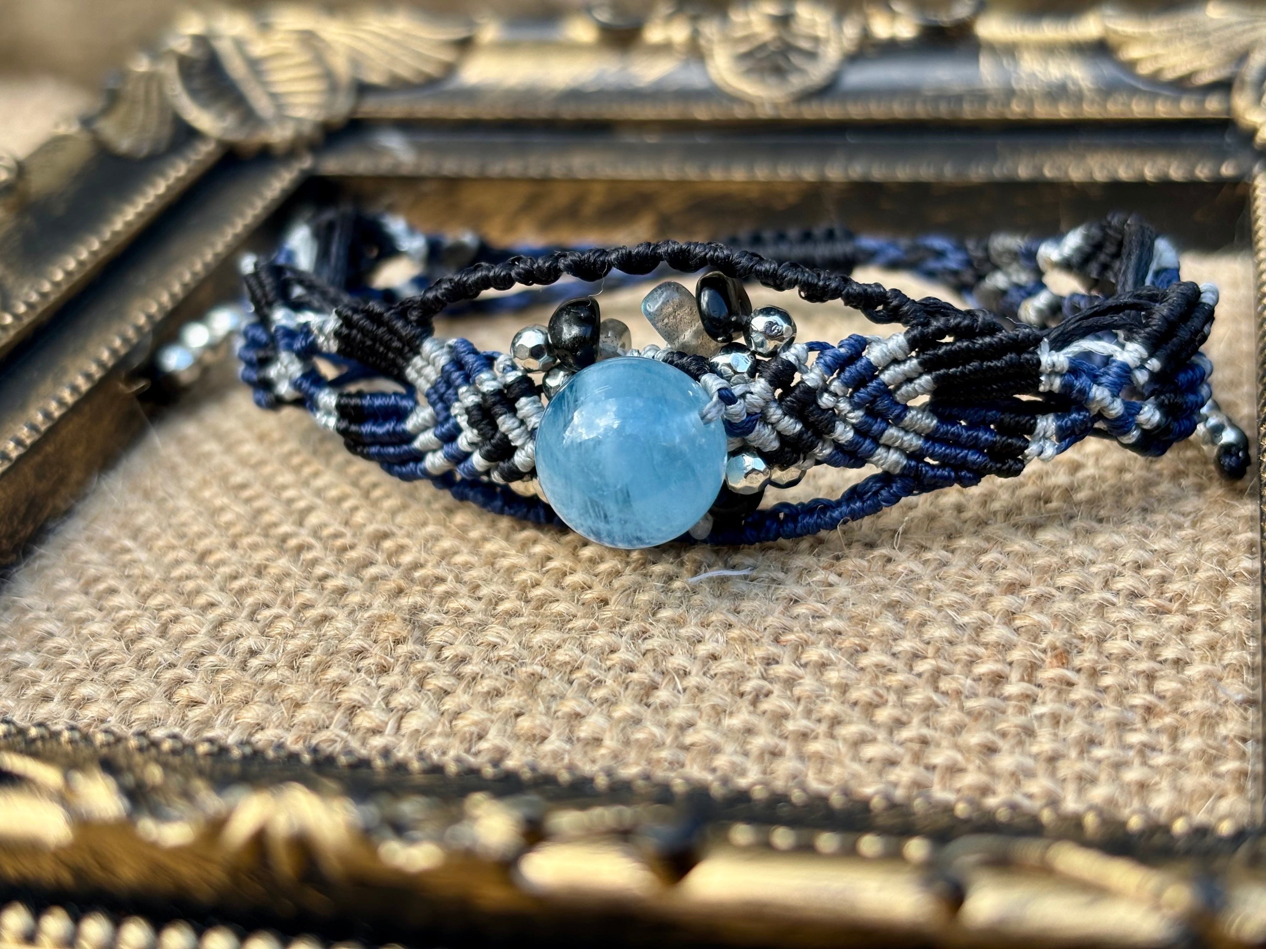 #1031高評価4Aアクアマリン一点物(アクアマリン×ラブラドライト×オニキス マクラメ編みブレスレット)