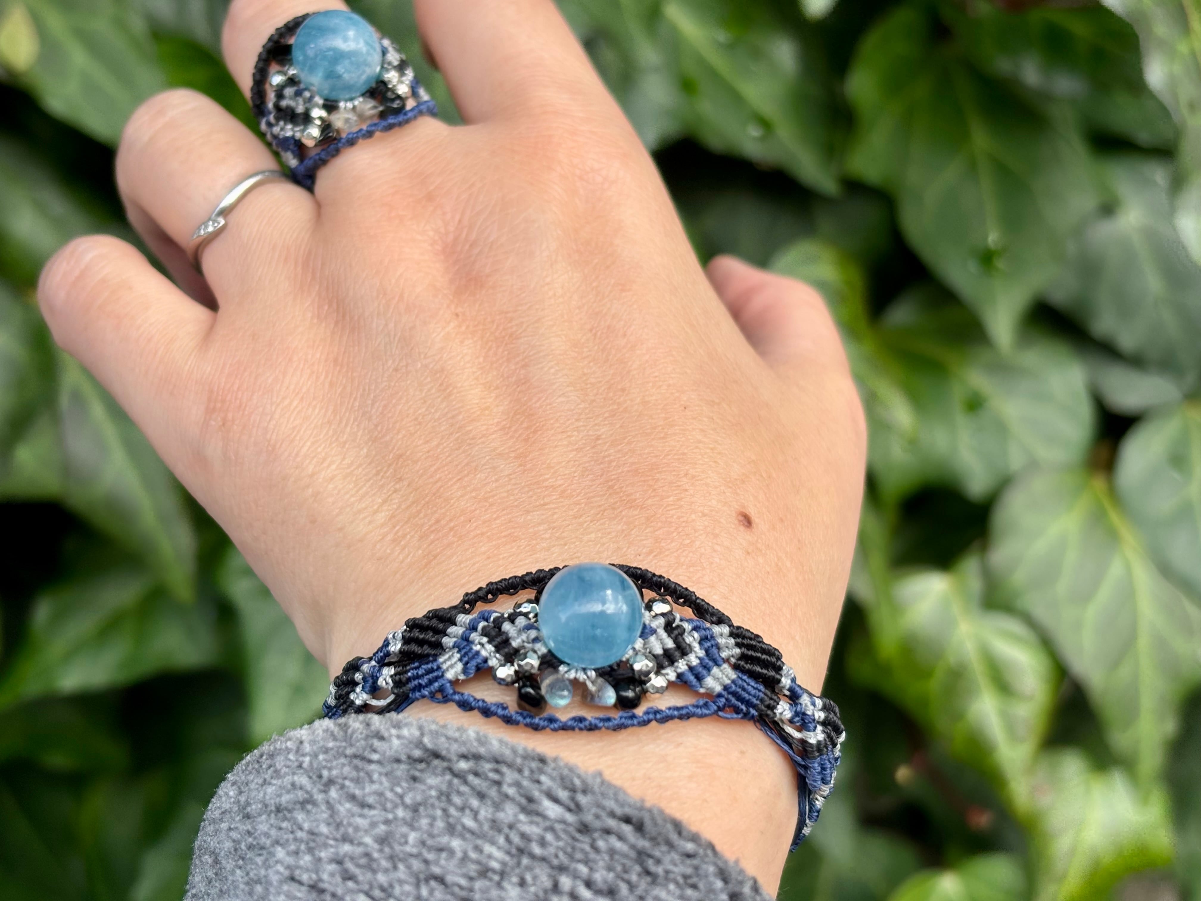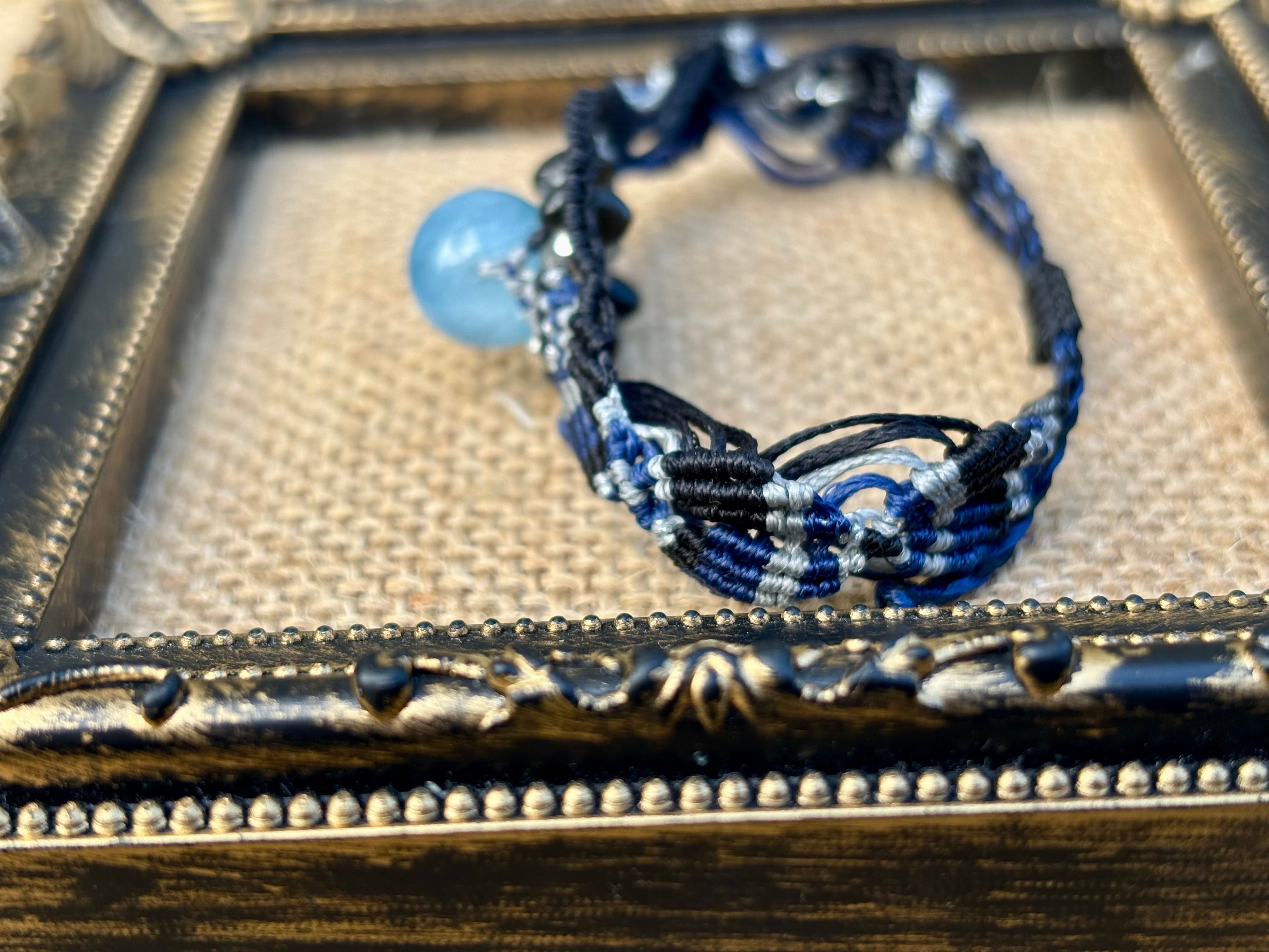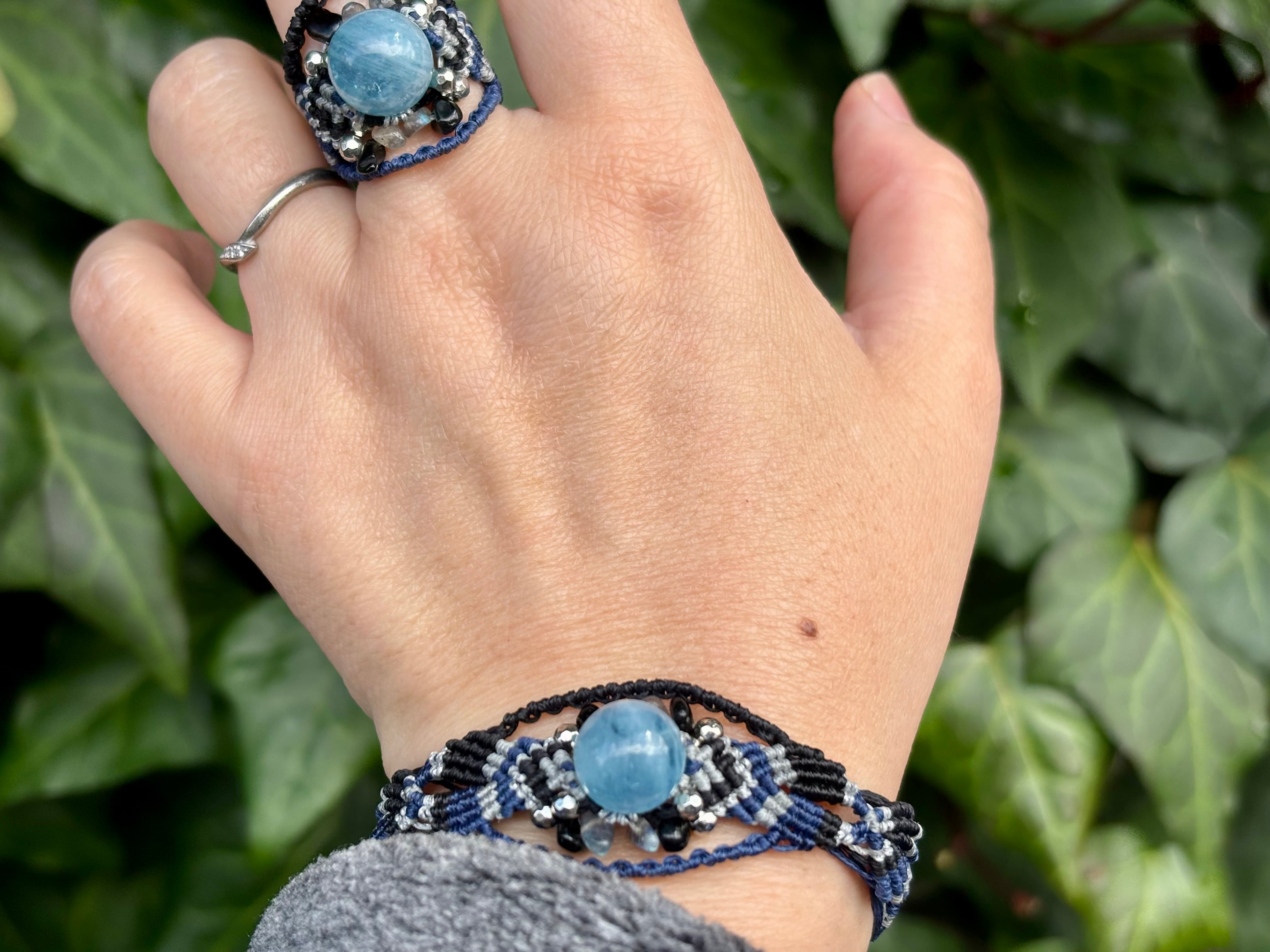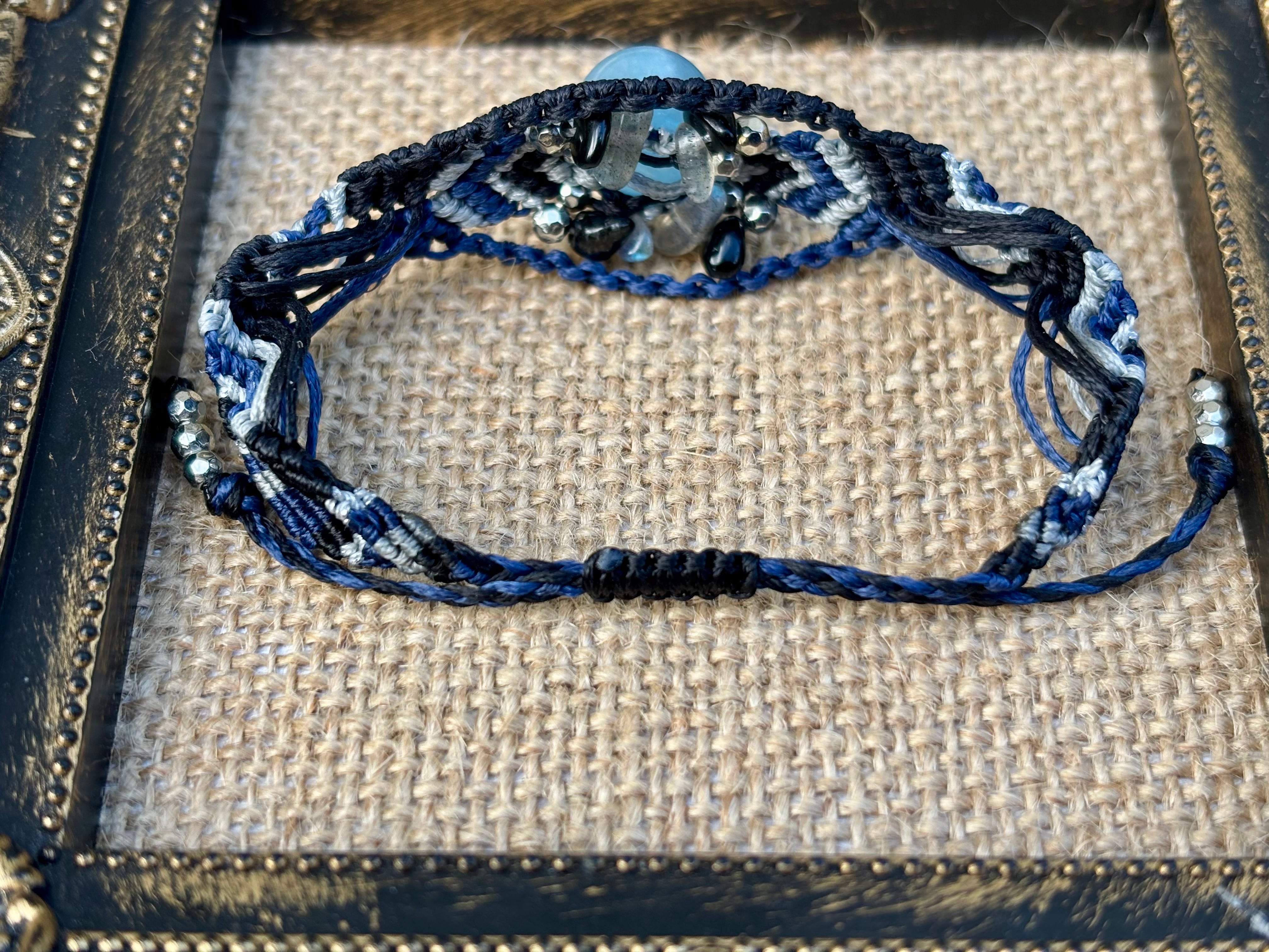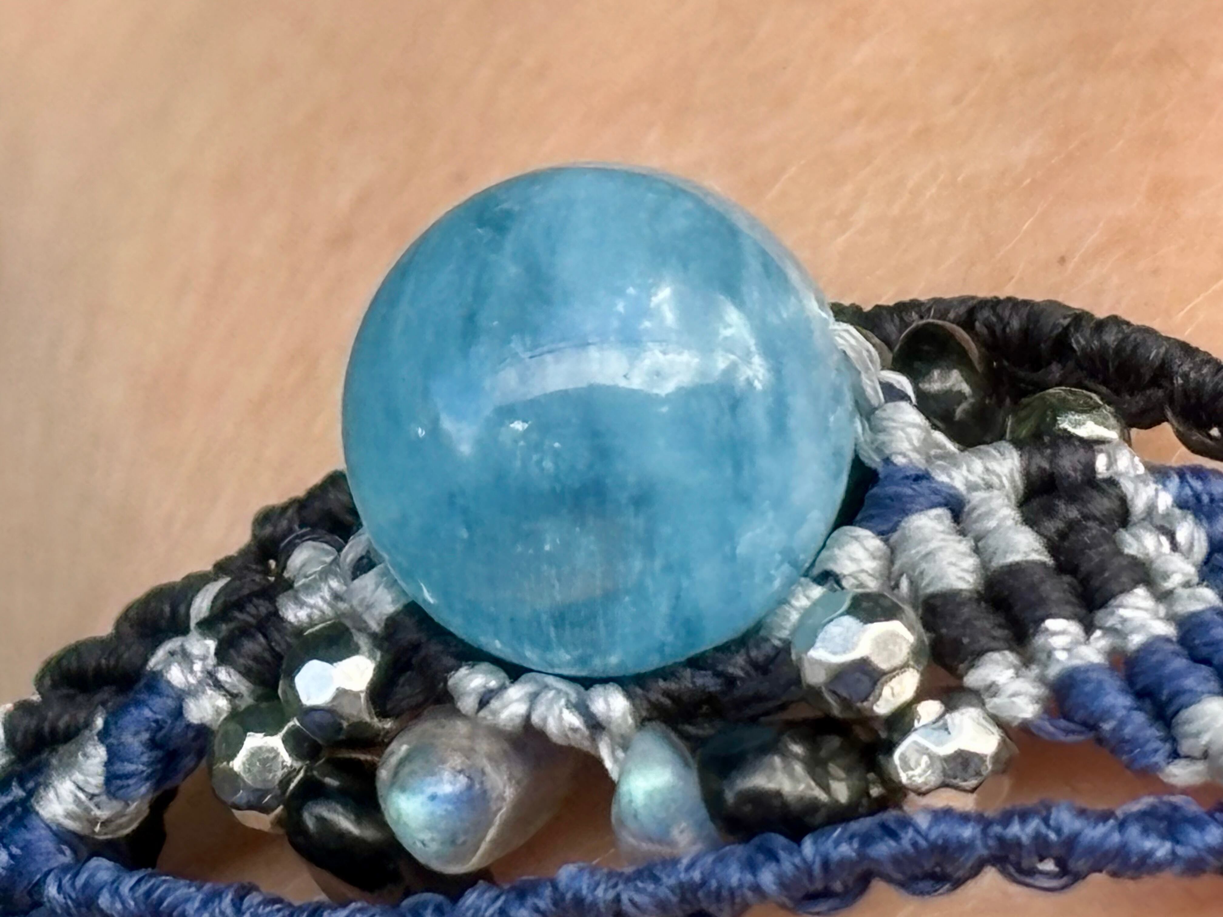 #1031高評価4Aアクアマリン一点物(アクアマリン×ラブラドライト×オニキス マクラメ編みブレスレット)