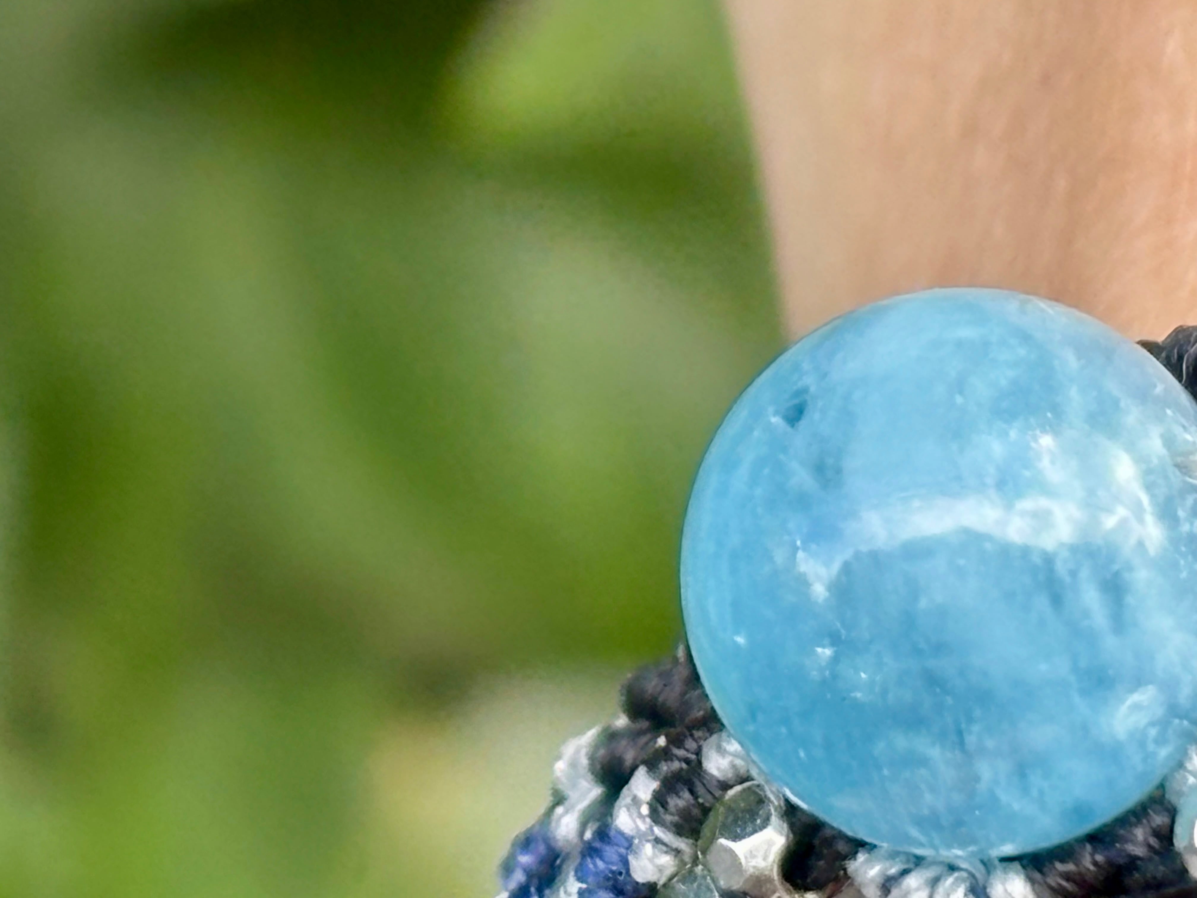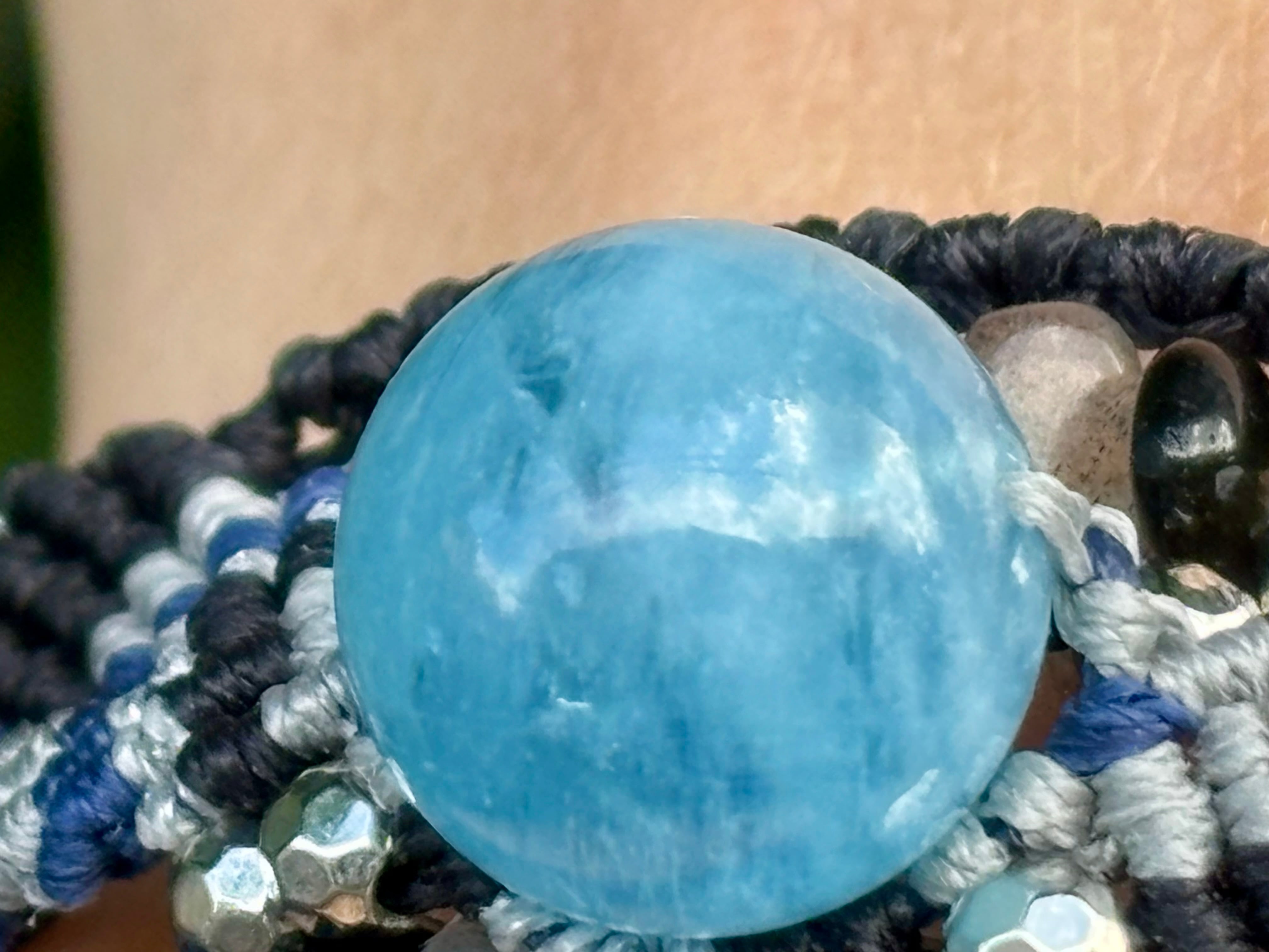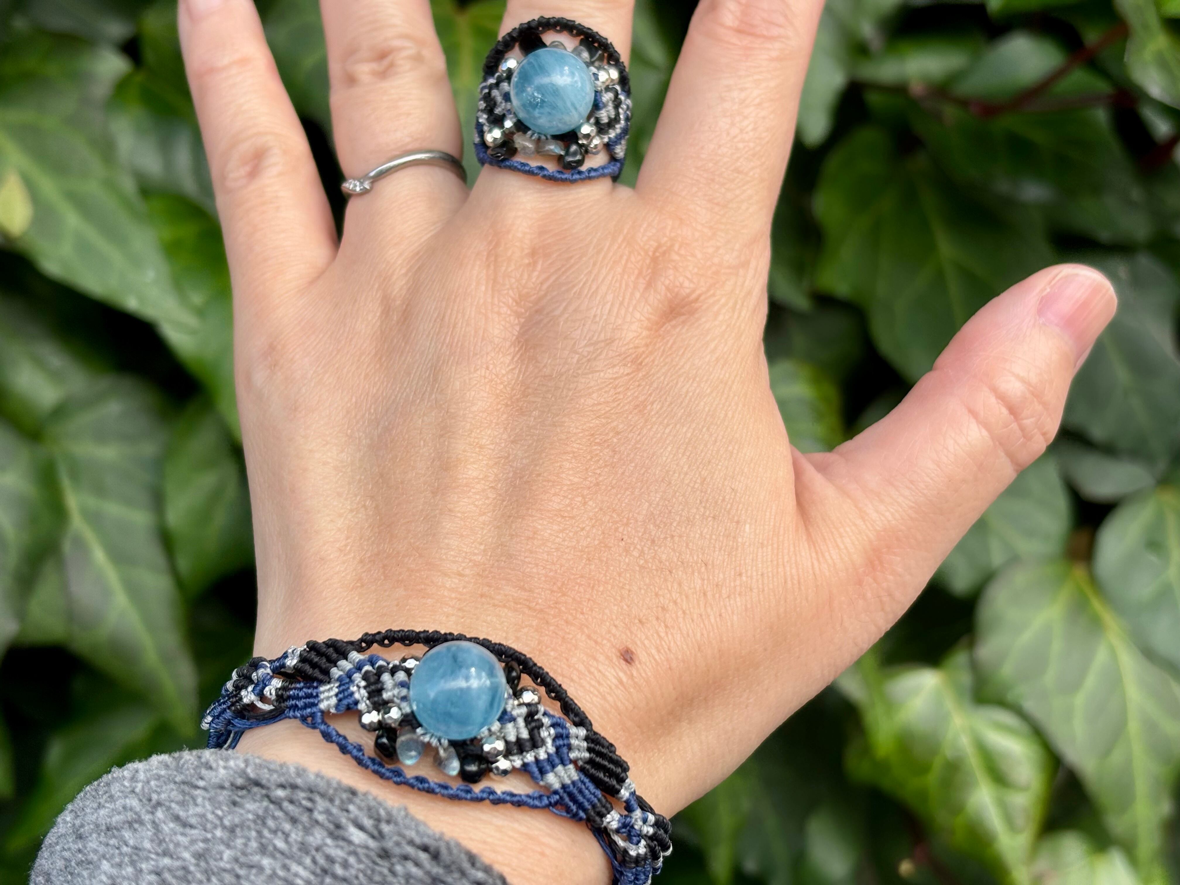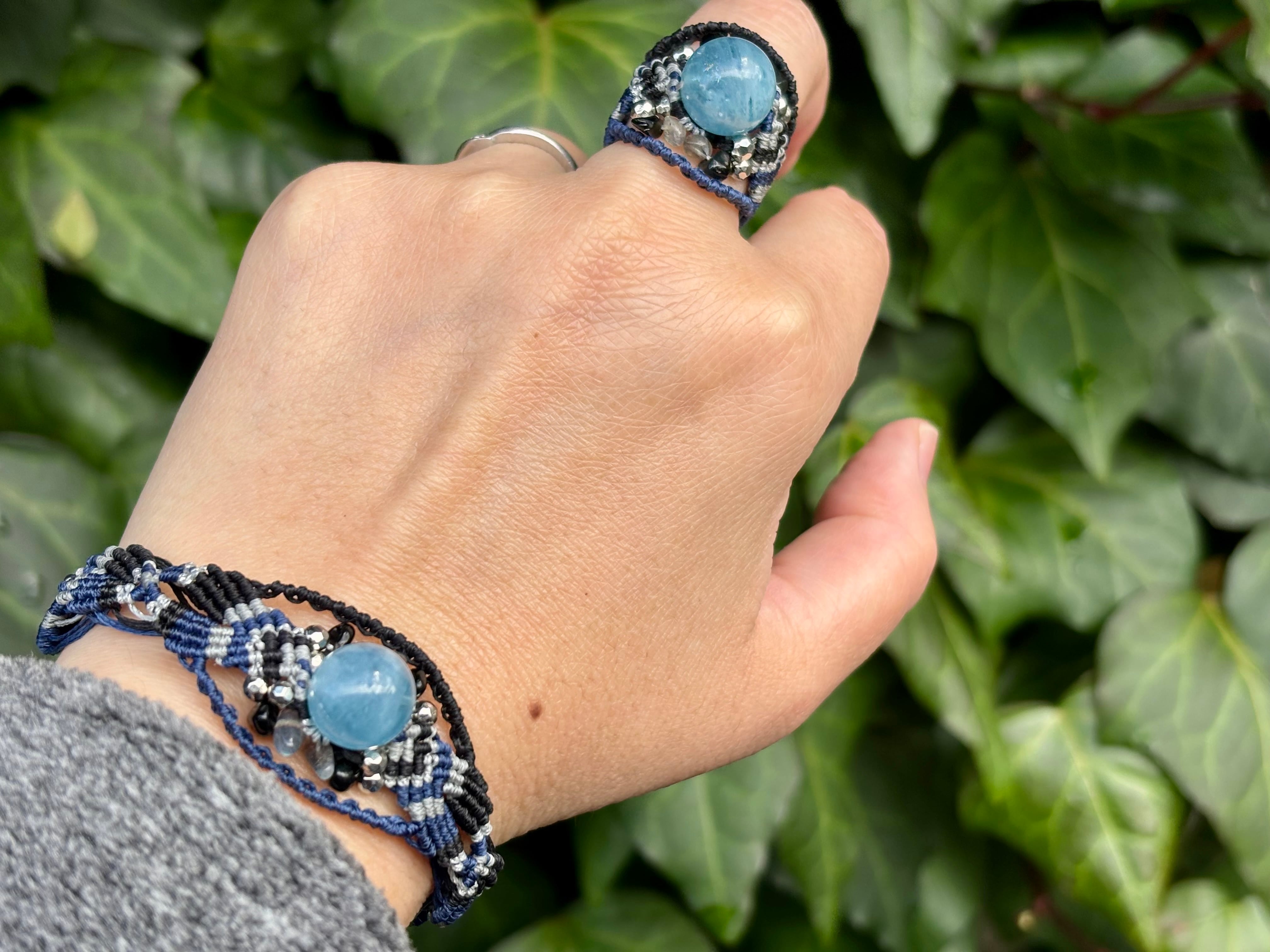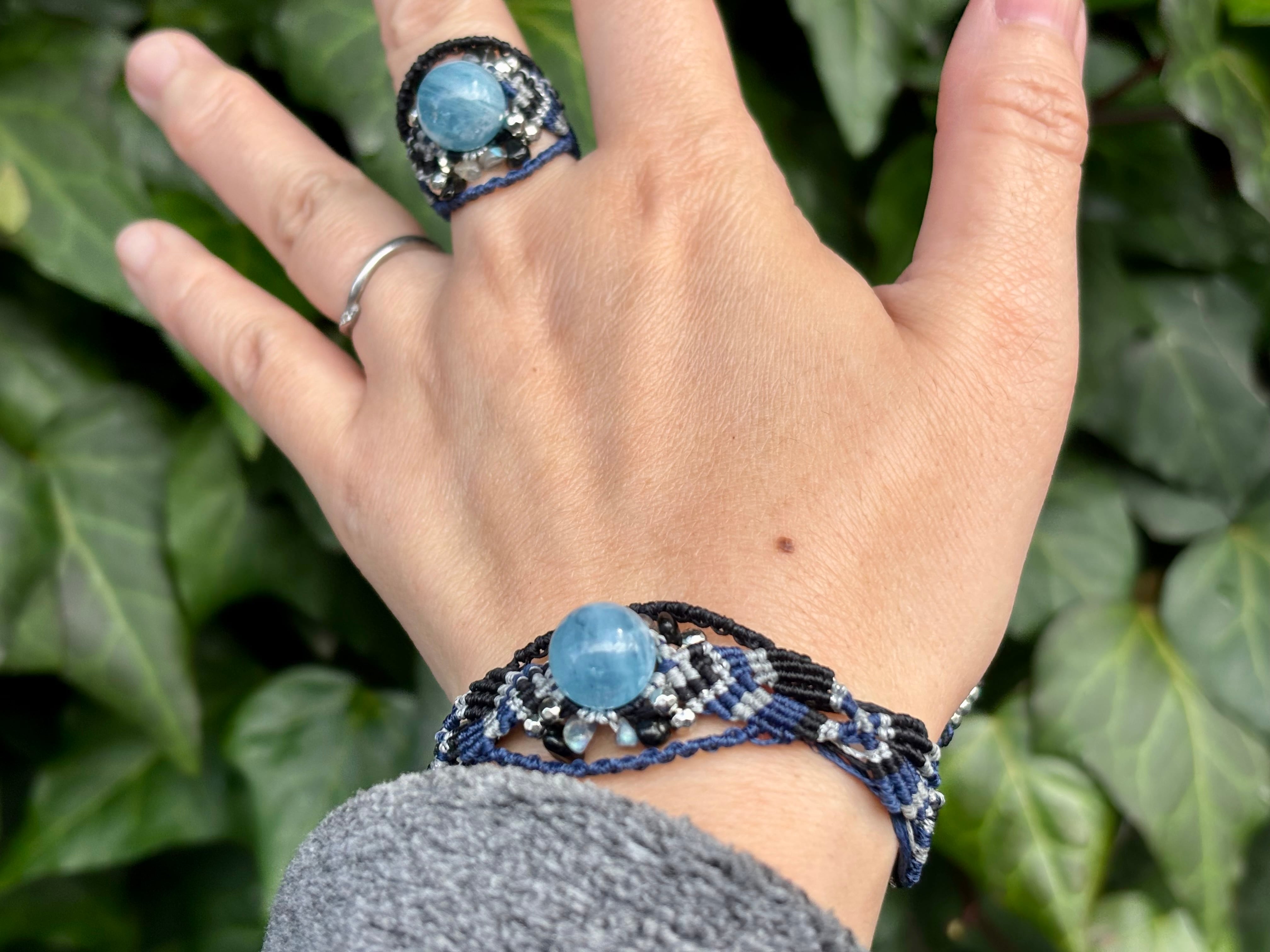#1031高評価4Aアクアマリン一点物(アクアマリン×ラブラドライト×オニキス マクラメ編みブレスレット)