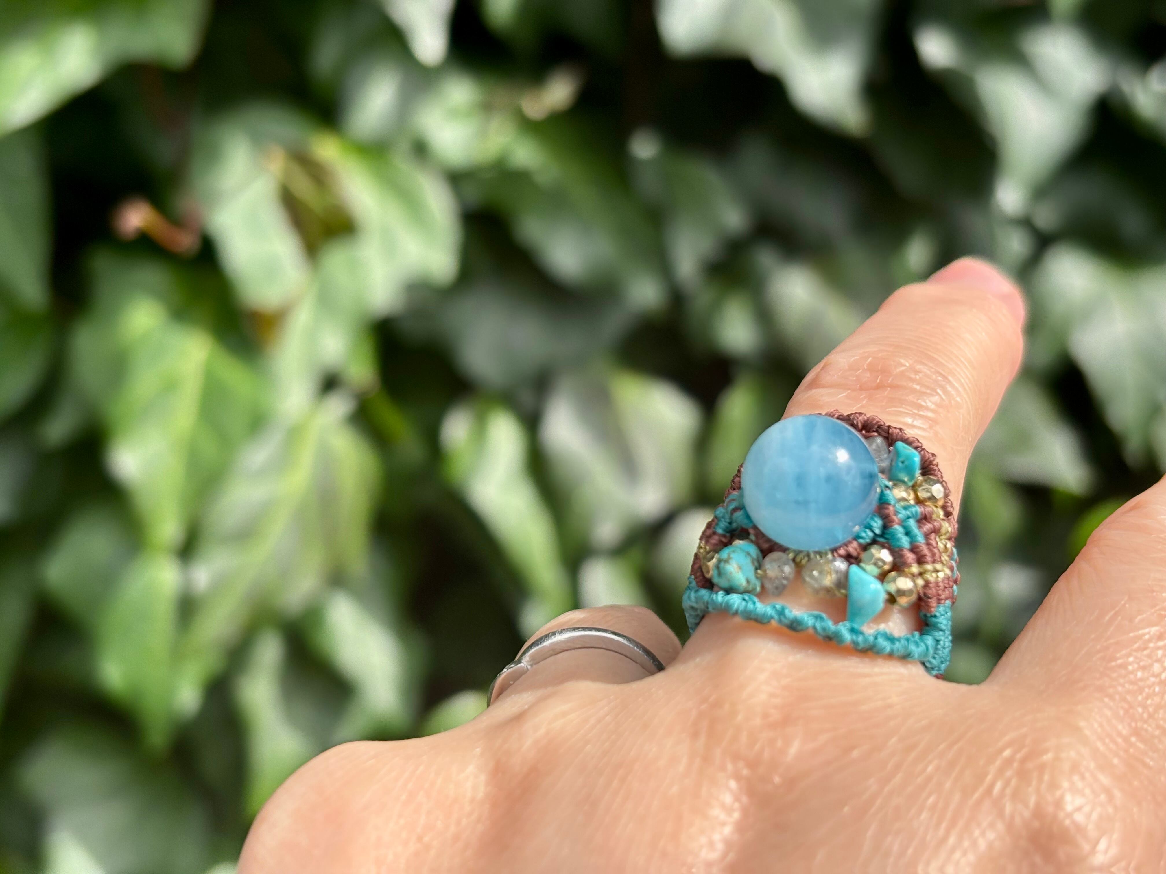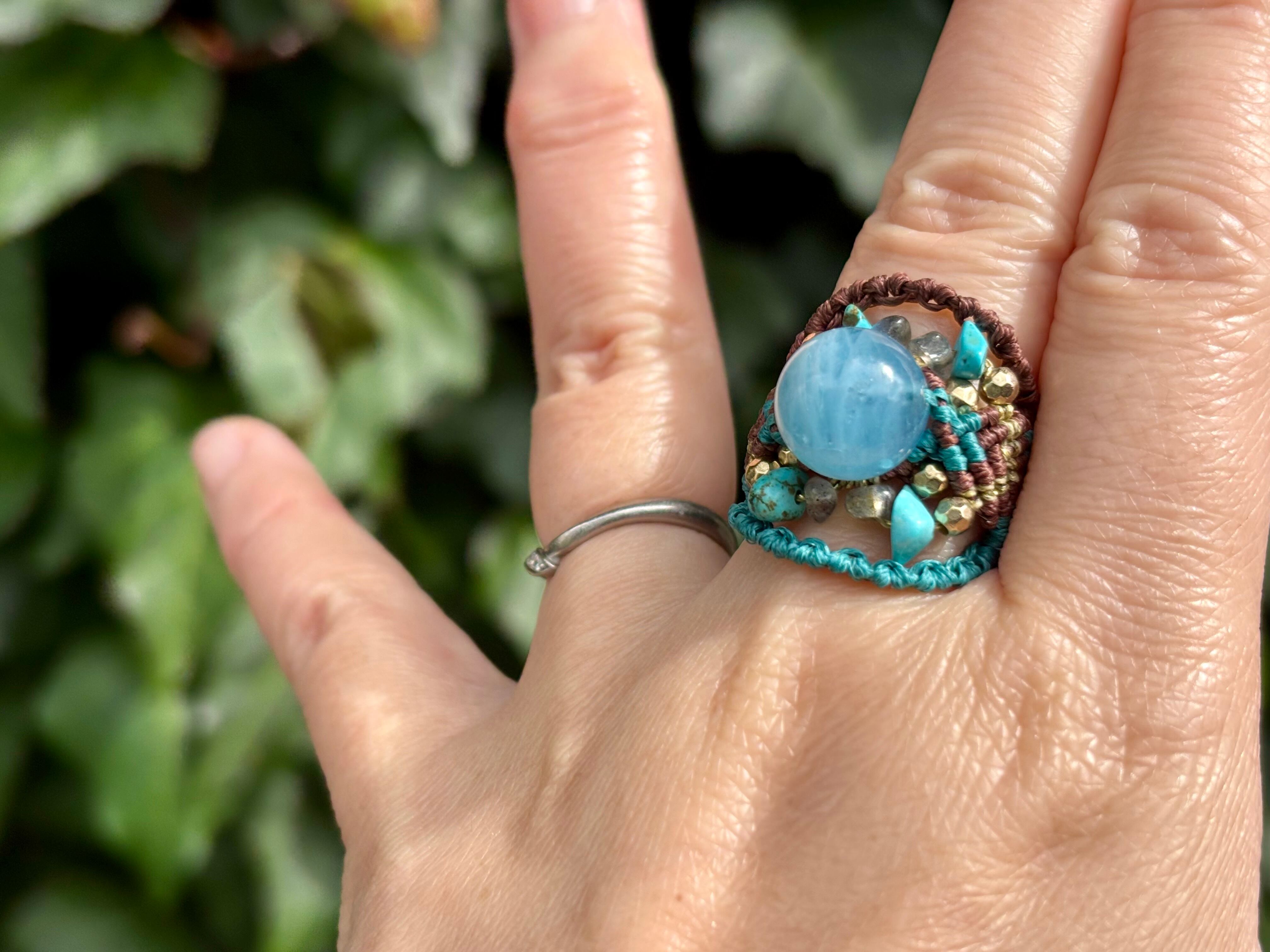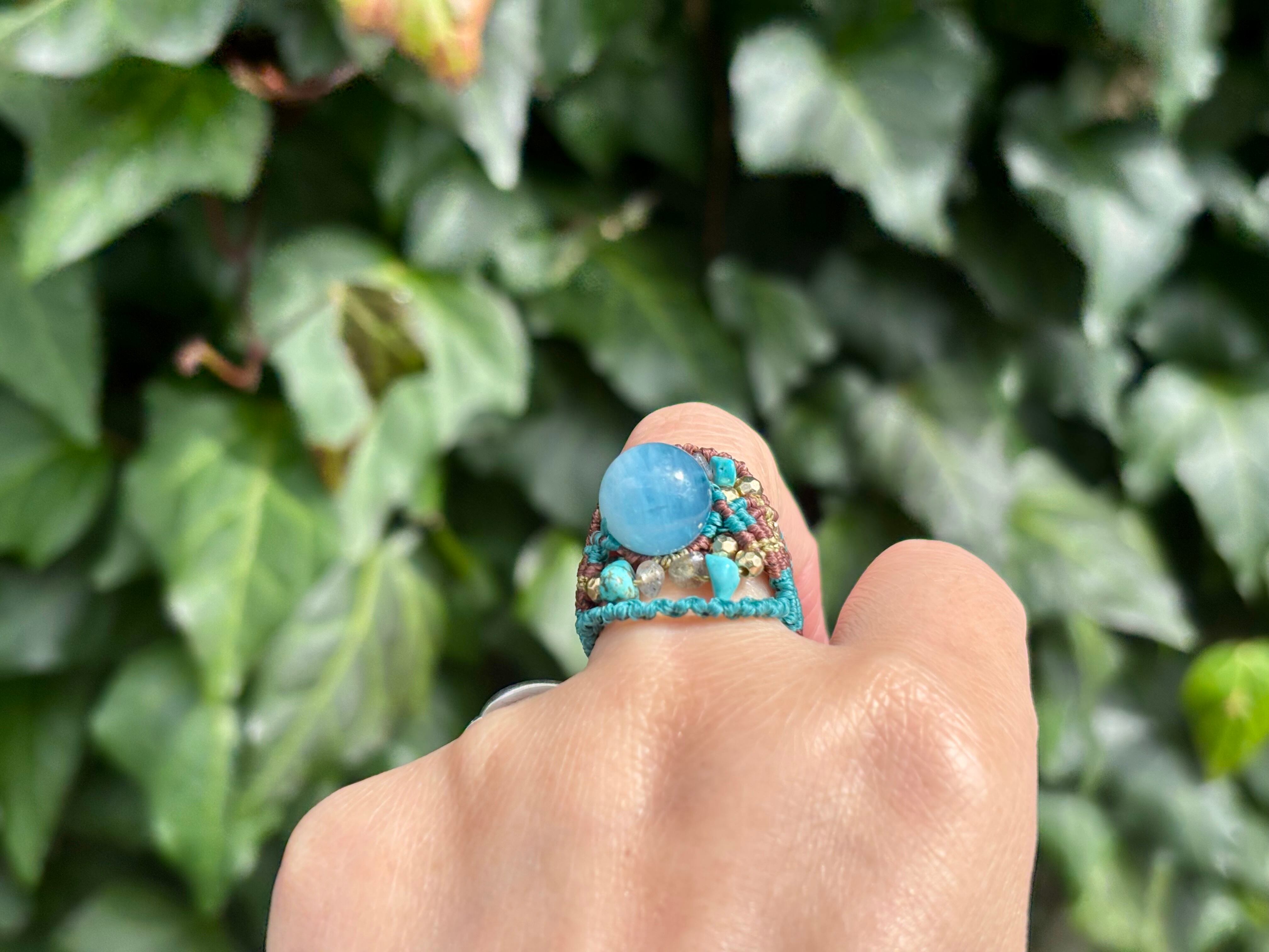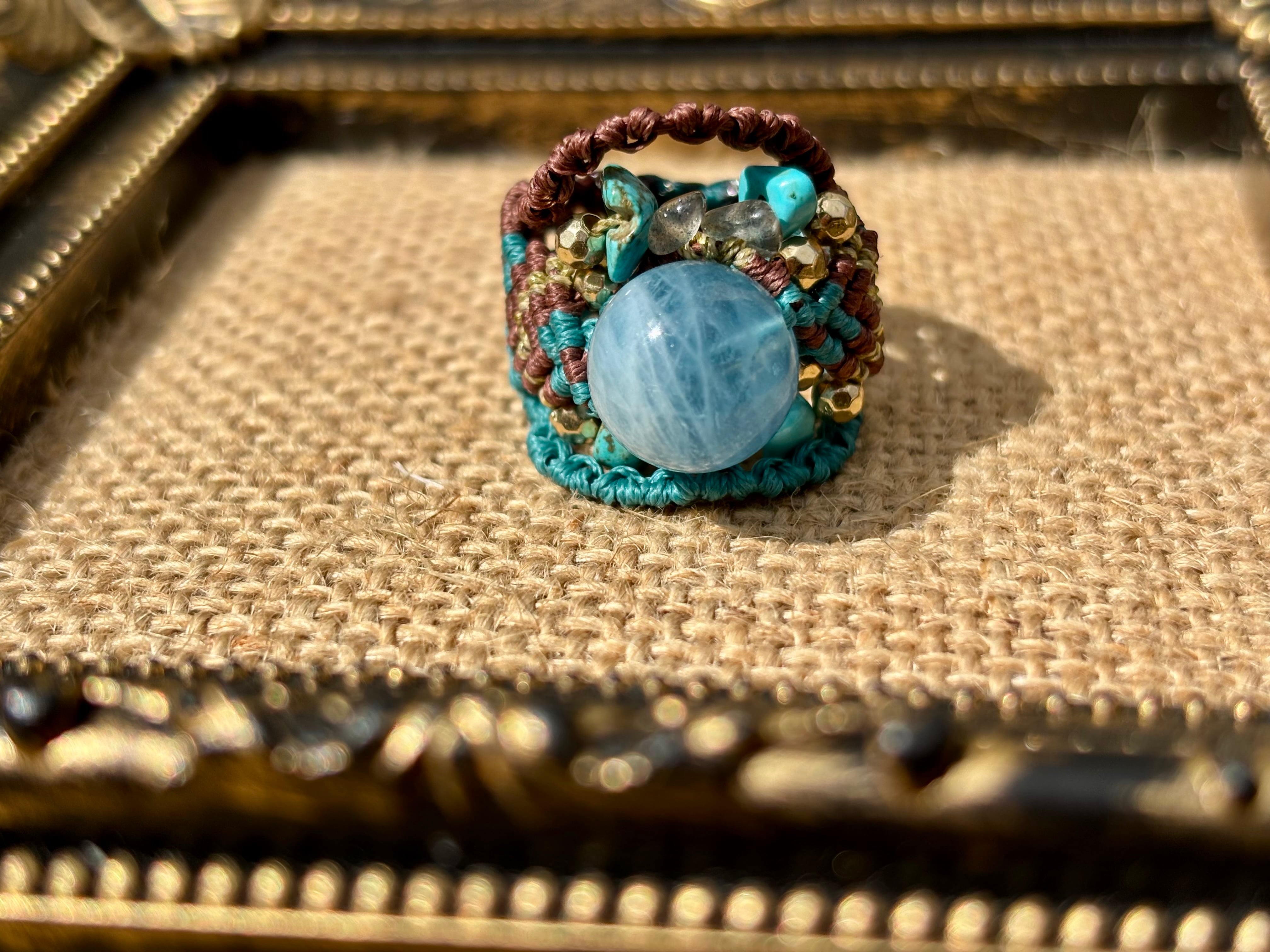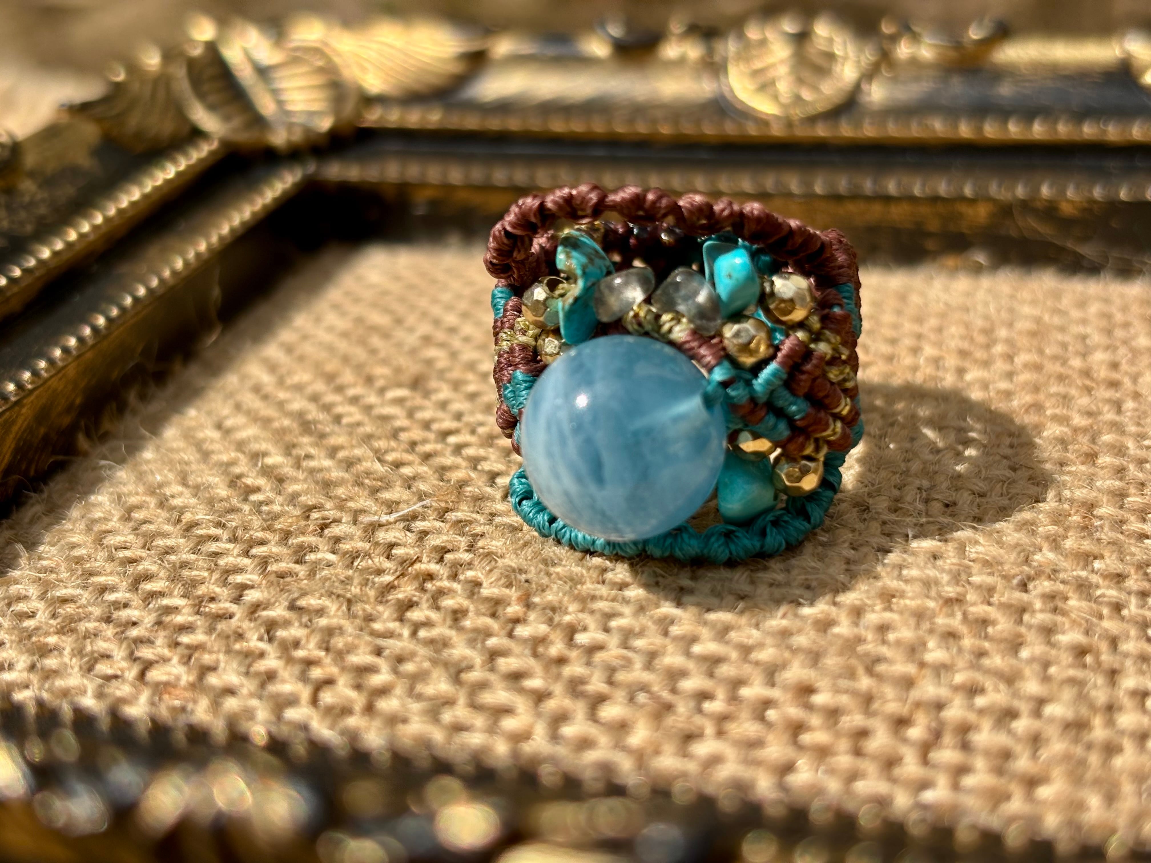 #1032高評価4Aアクアマリン一点物(アクアマリン×ラブラドライト×ターコイズ マクラメ編みリング/指輪)