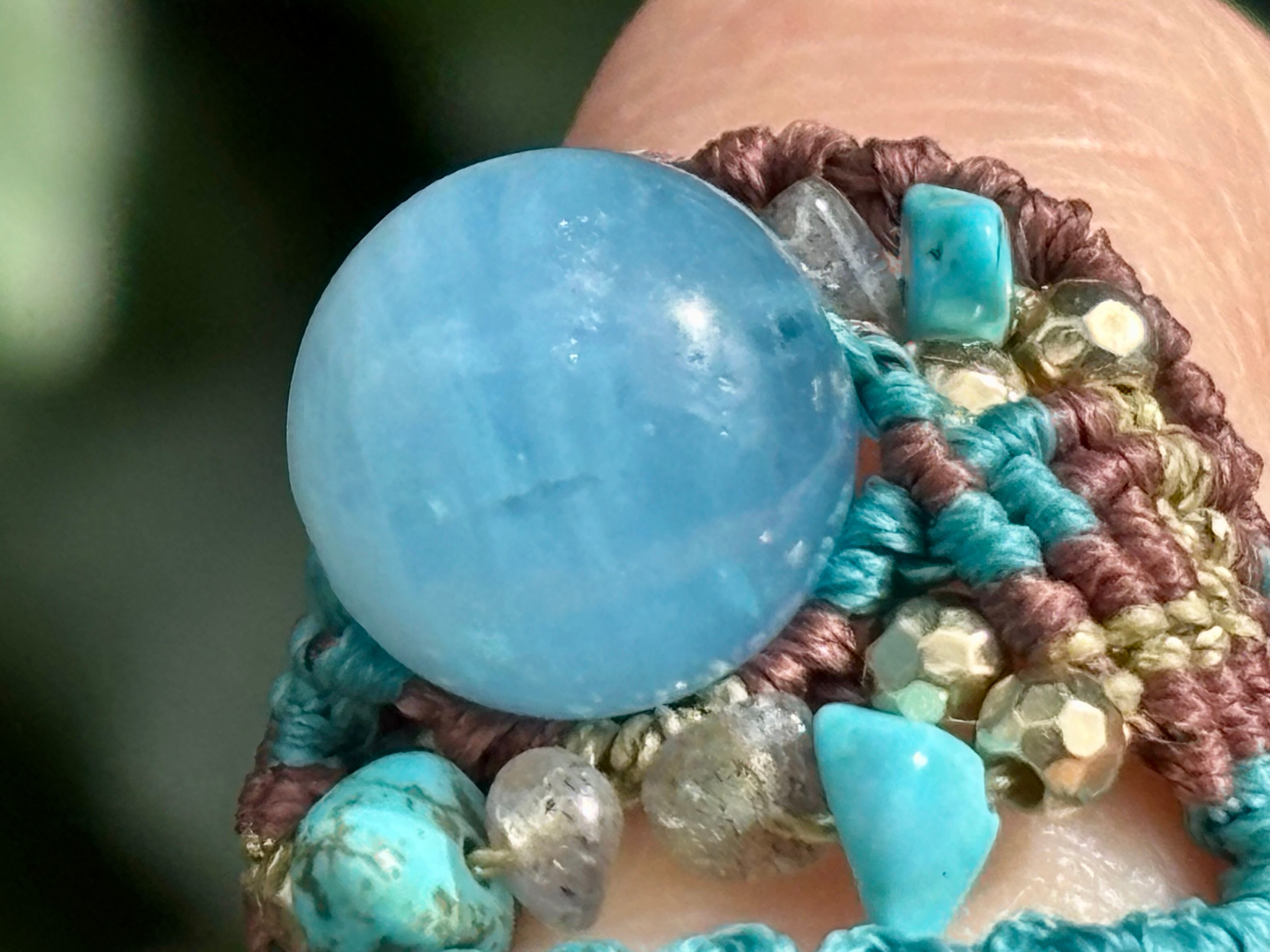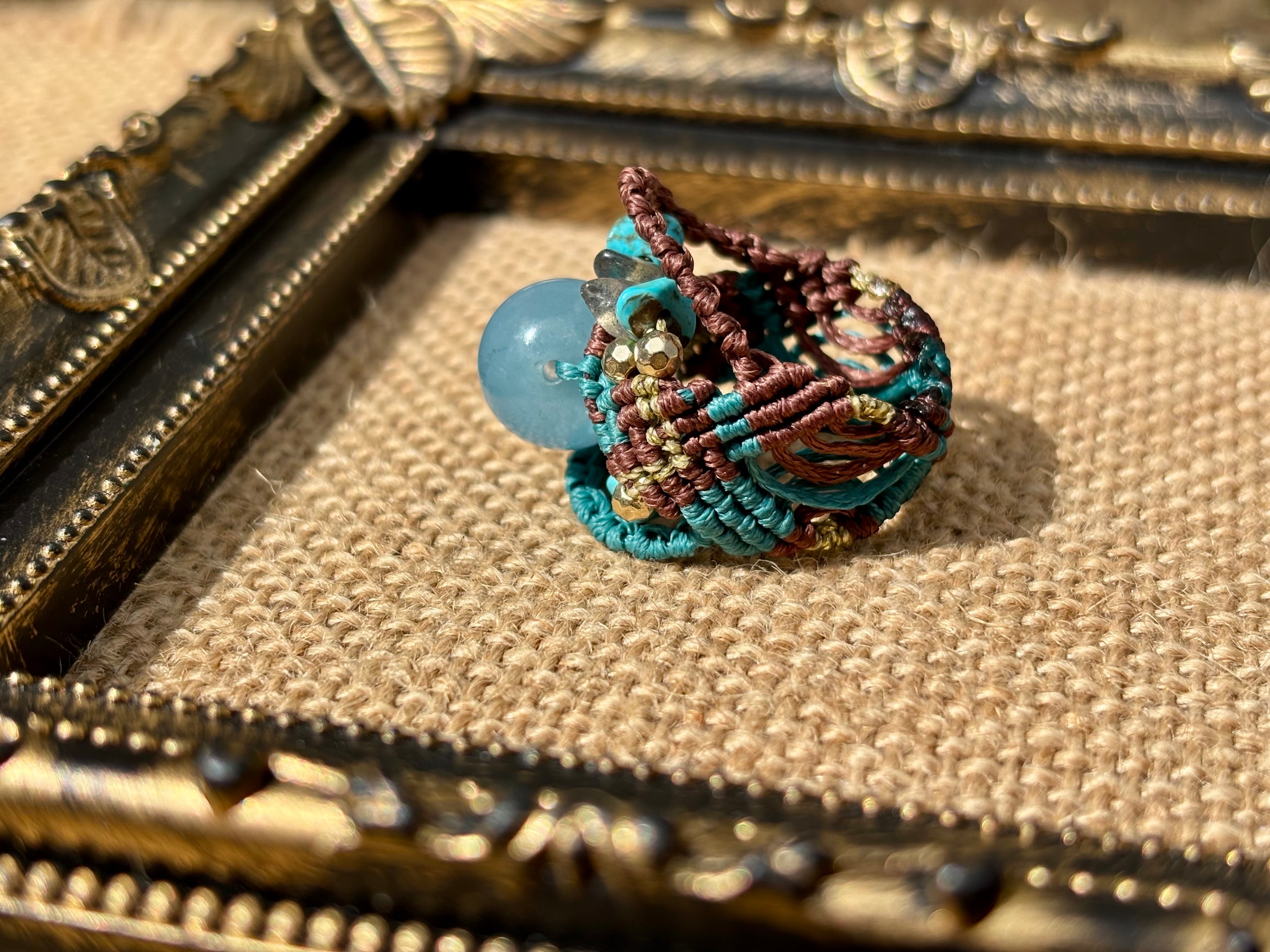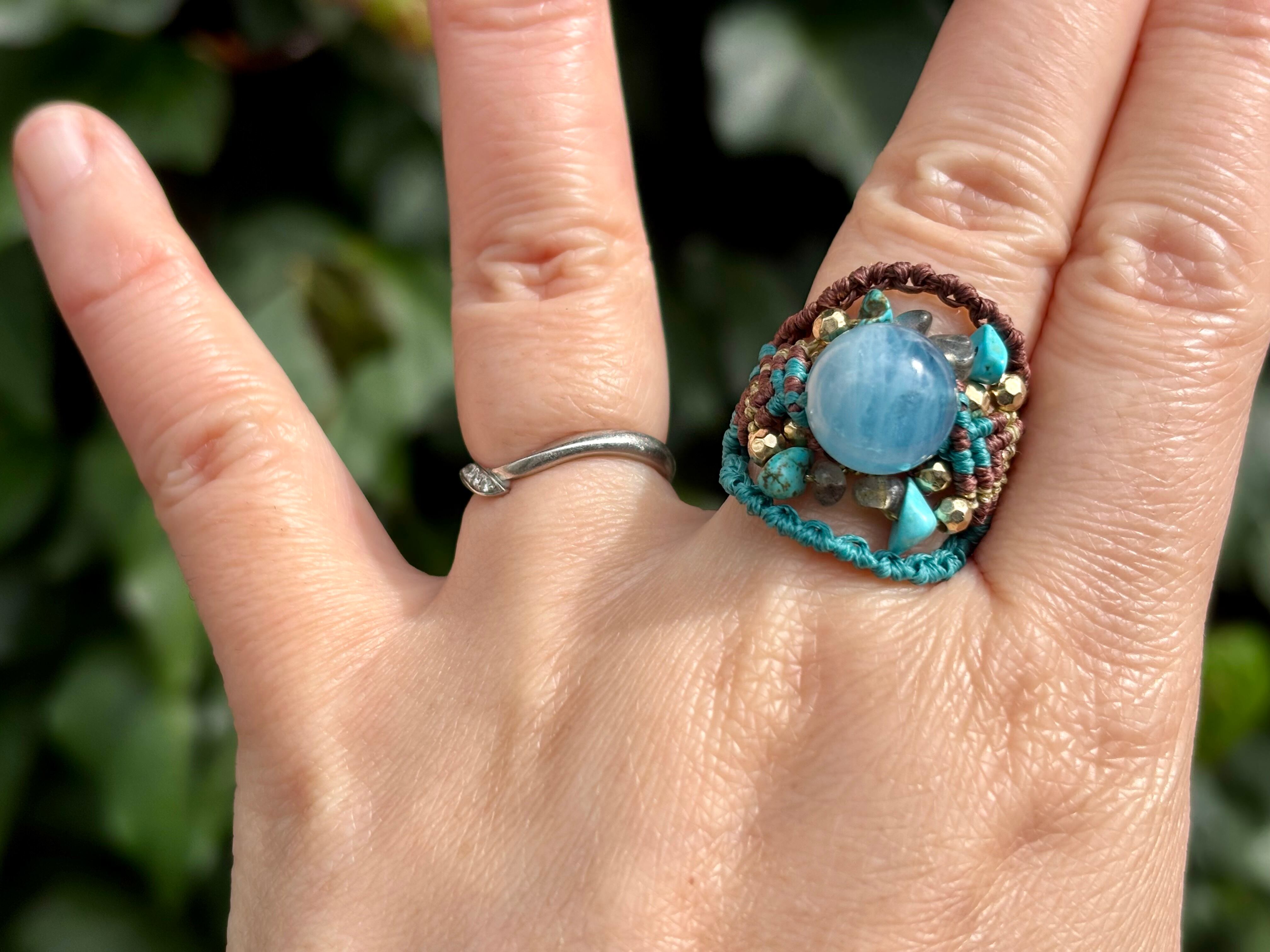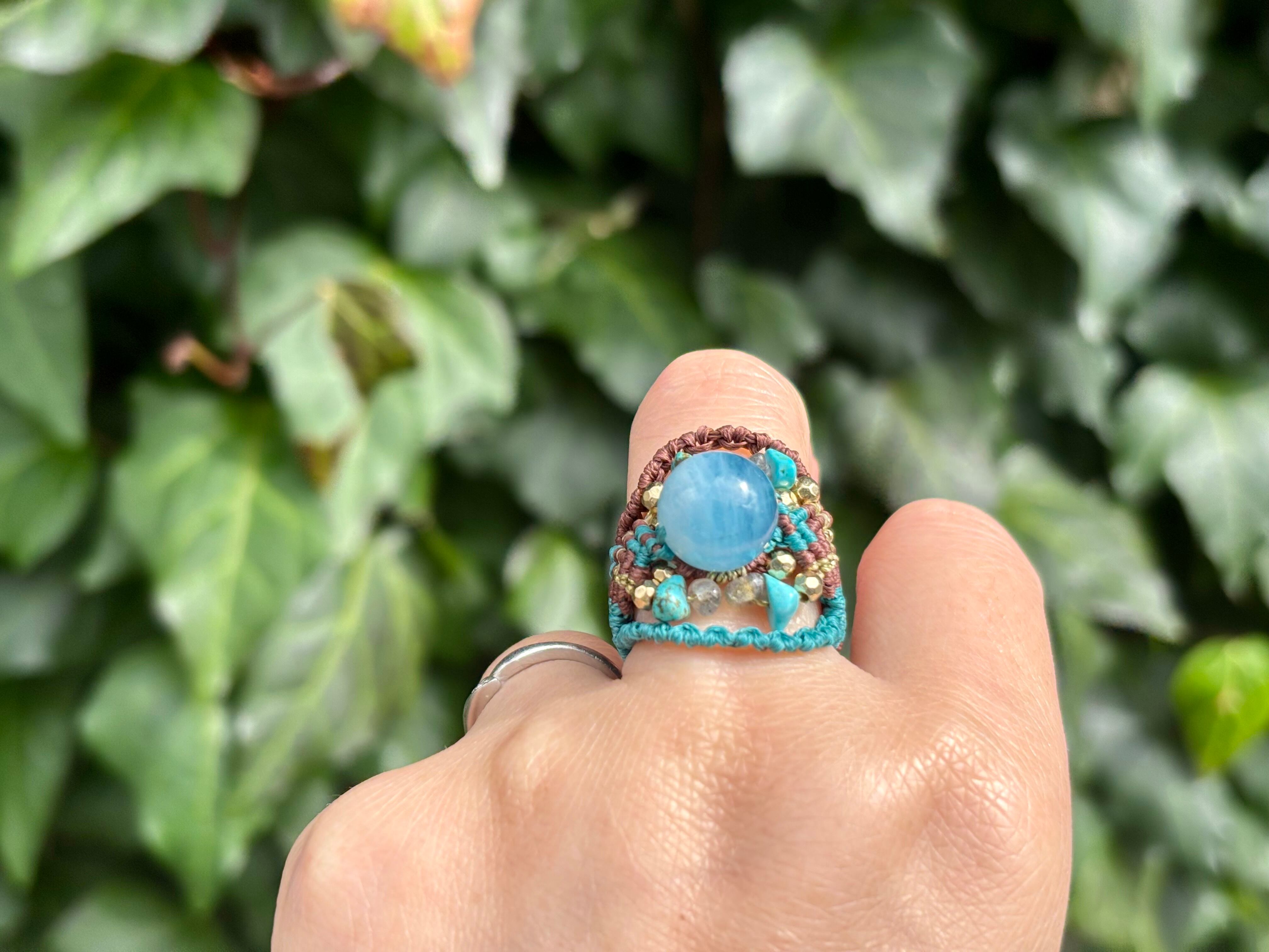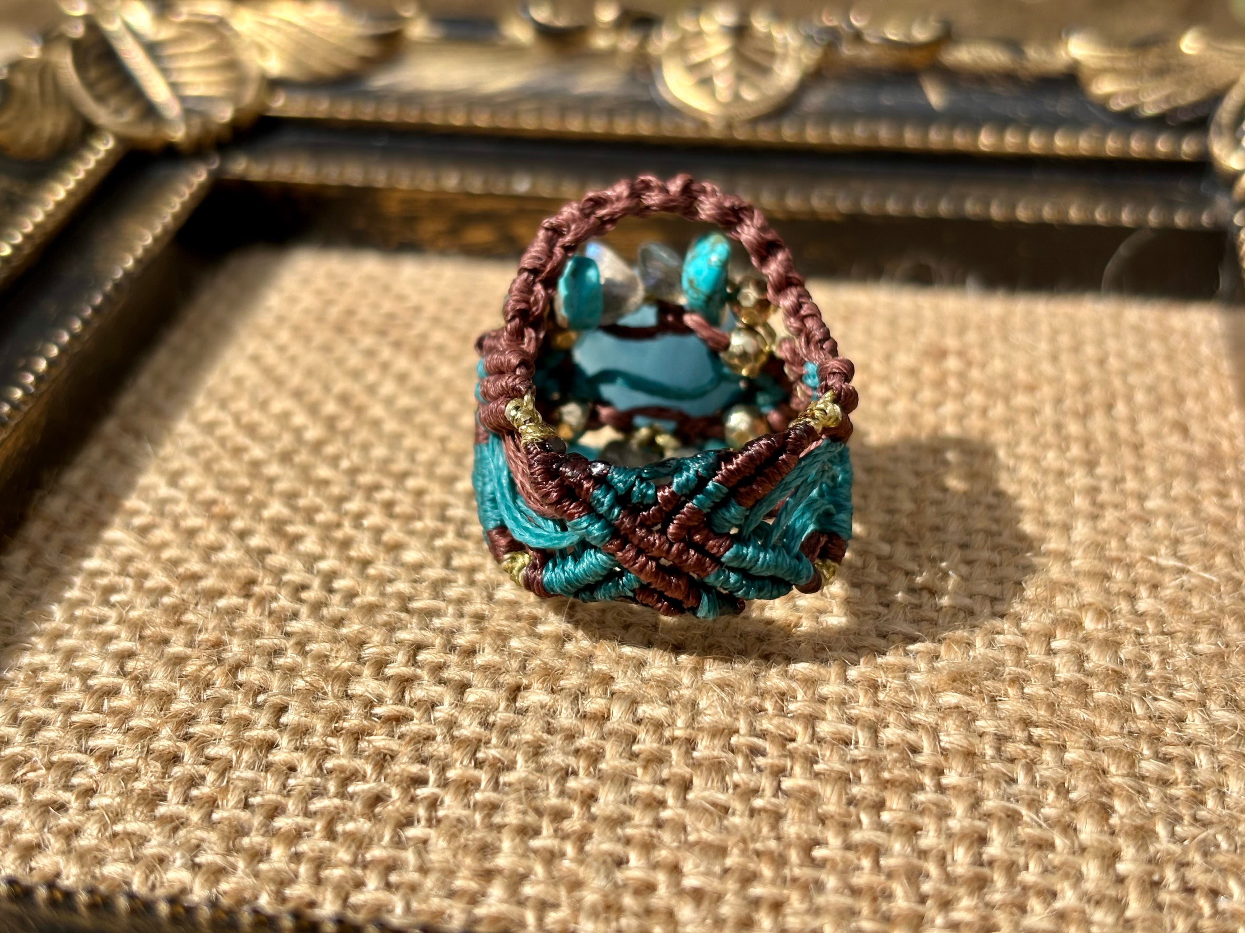 #1032高評価4Aアクアマリン一点物(アクアマリン×ラブラドライト×ターコイズ マクラメ編みリング/指輪)