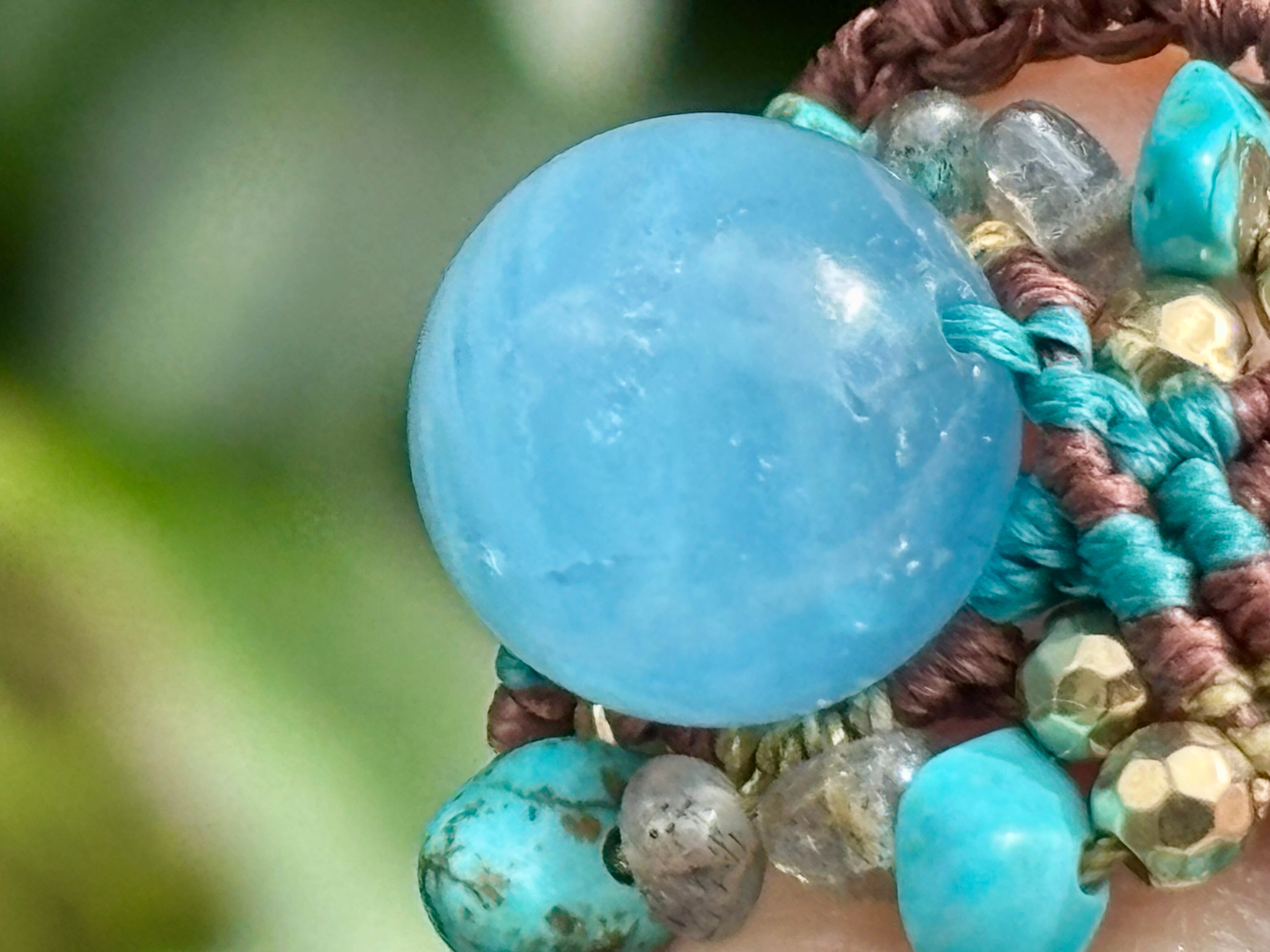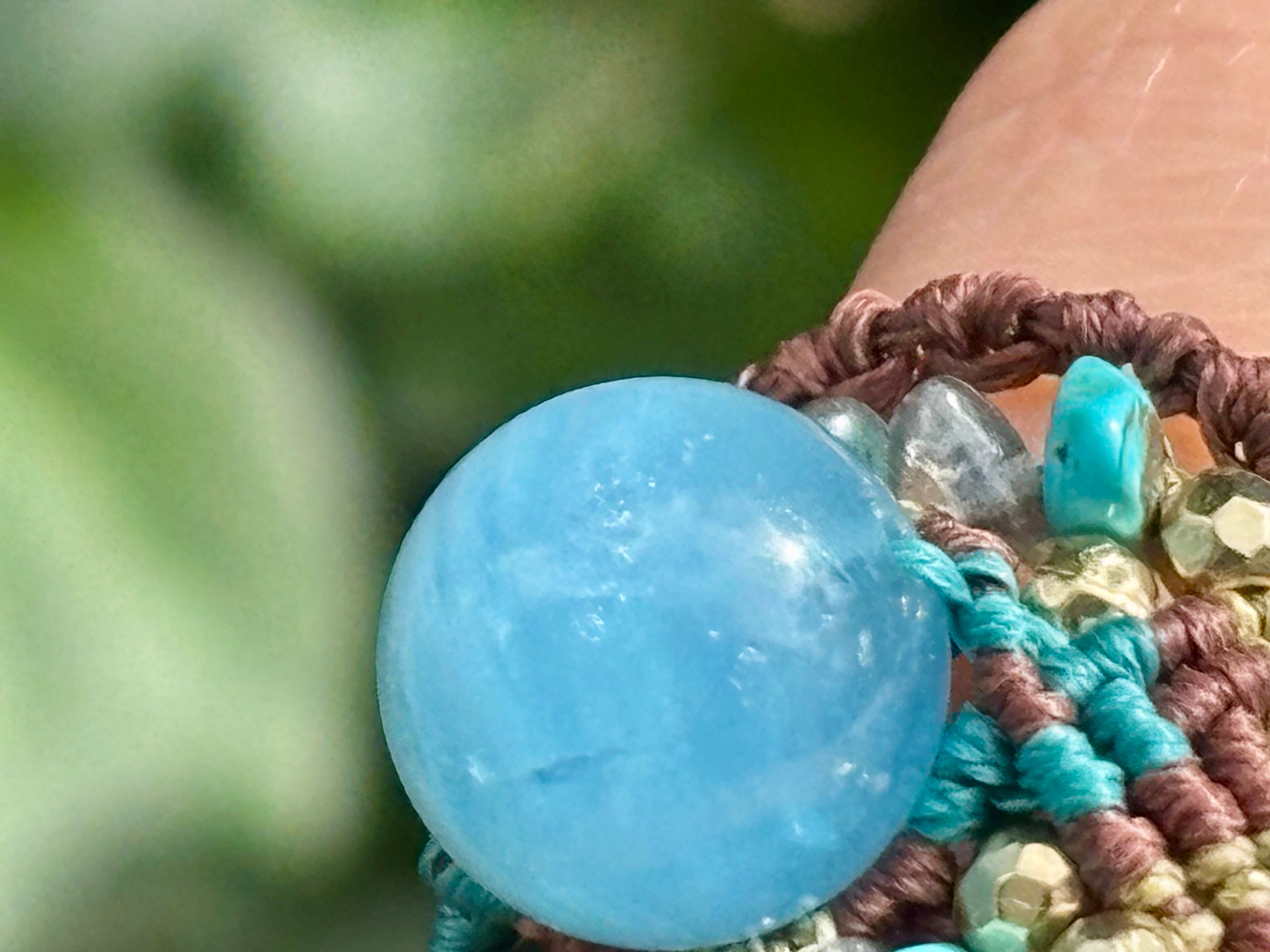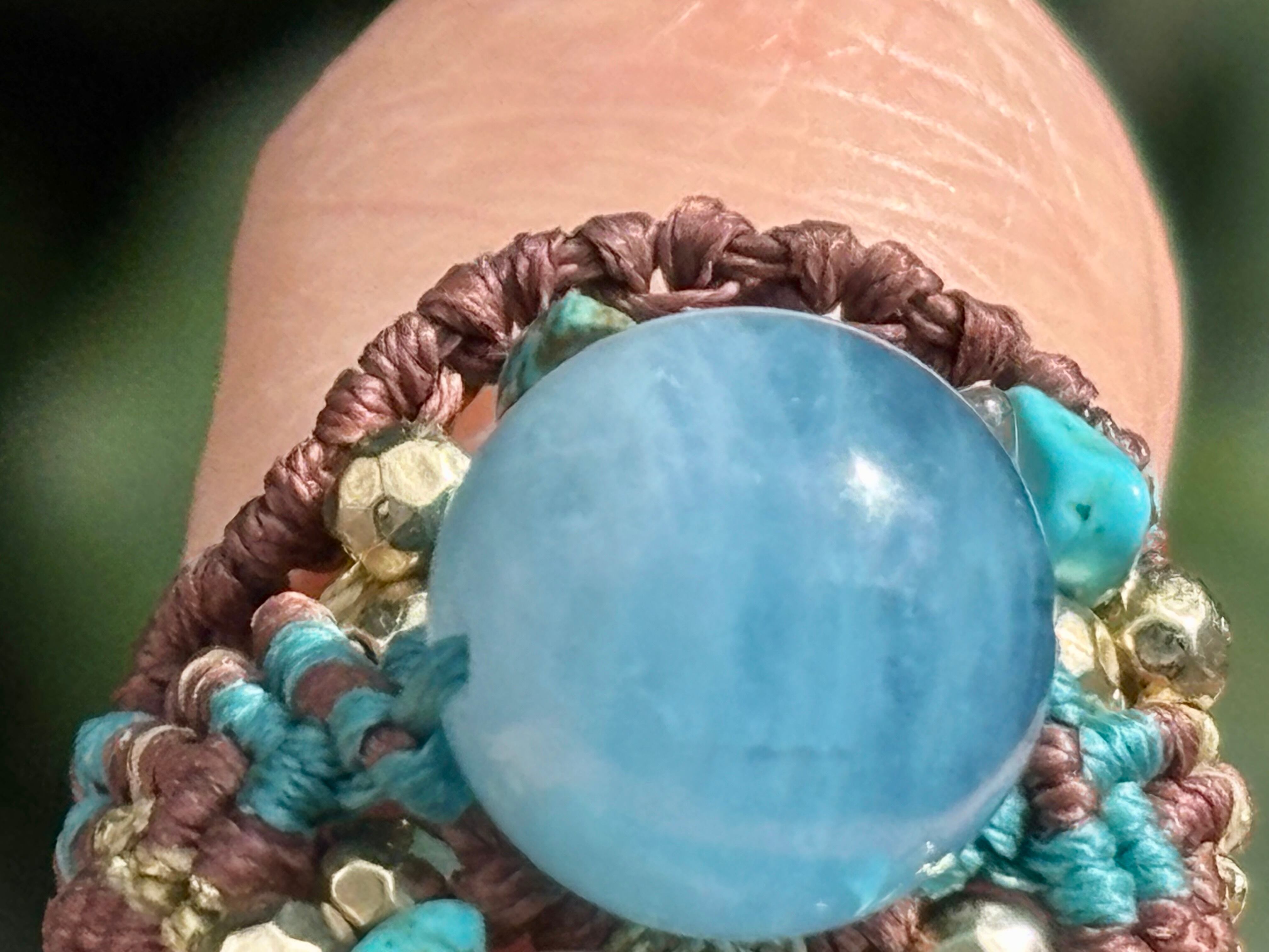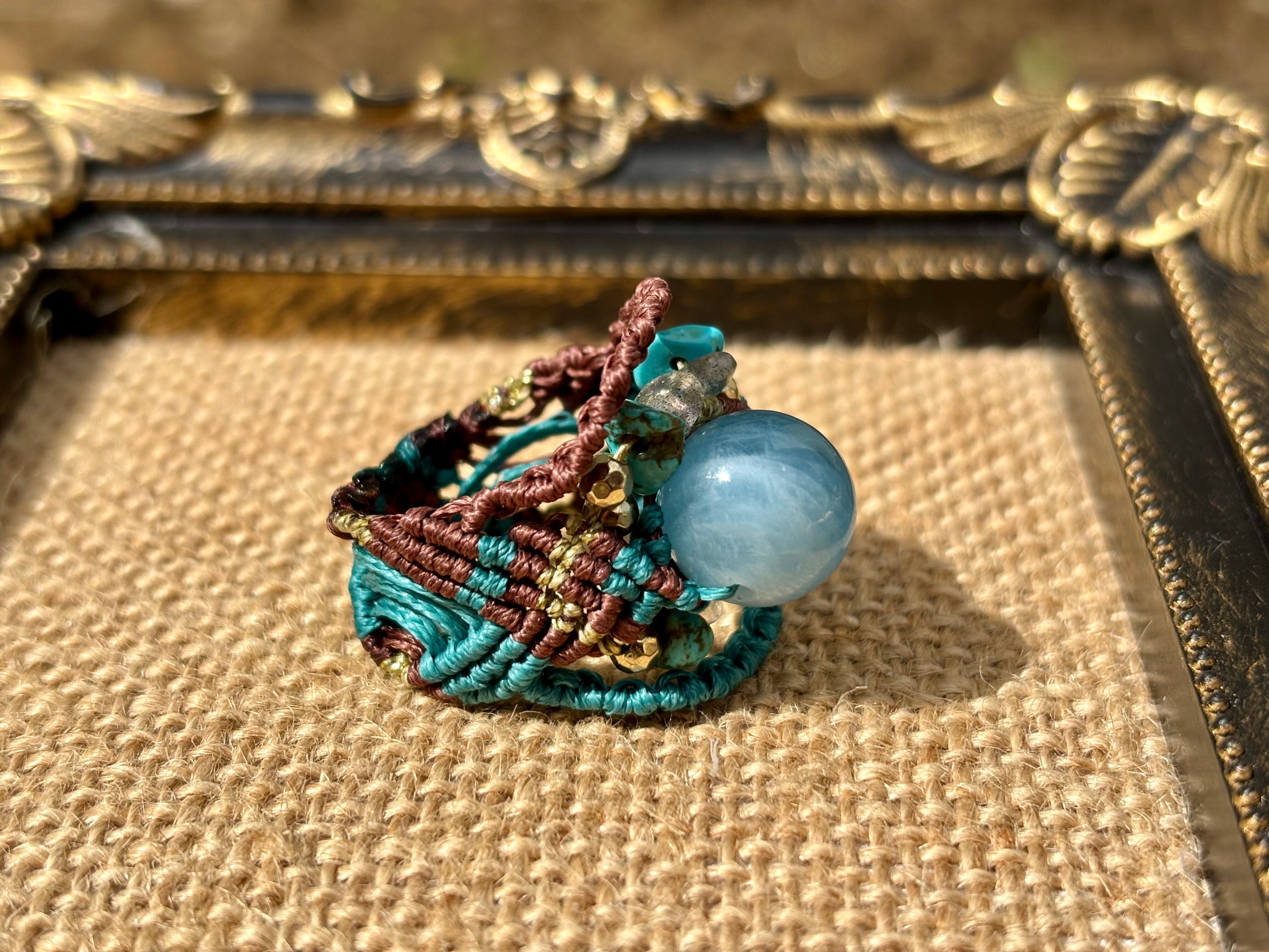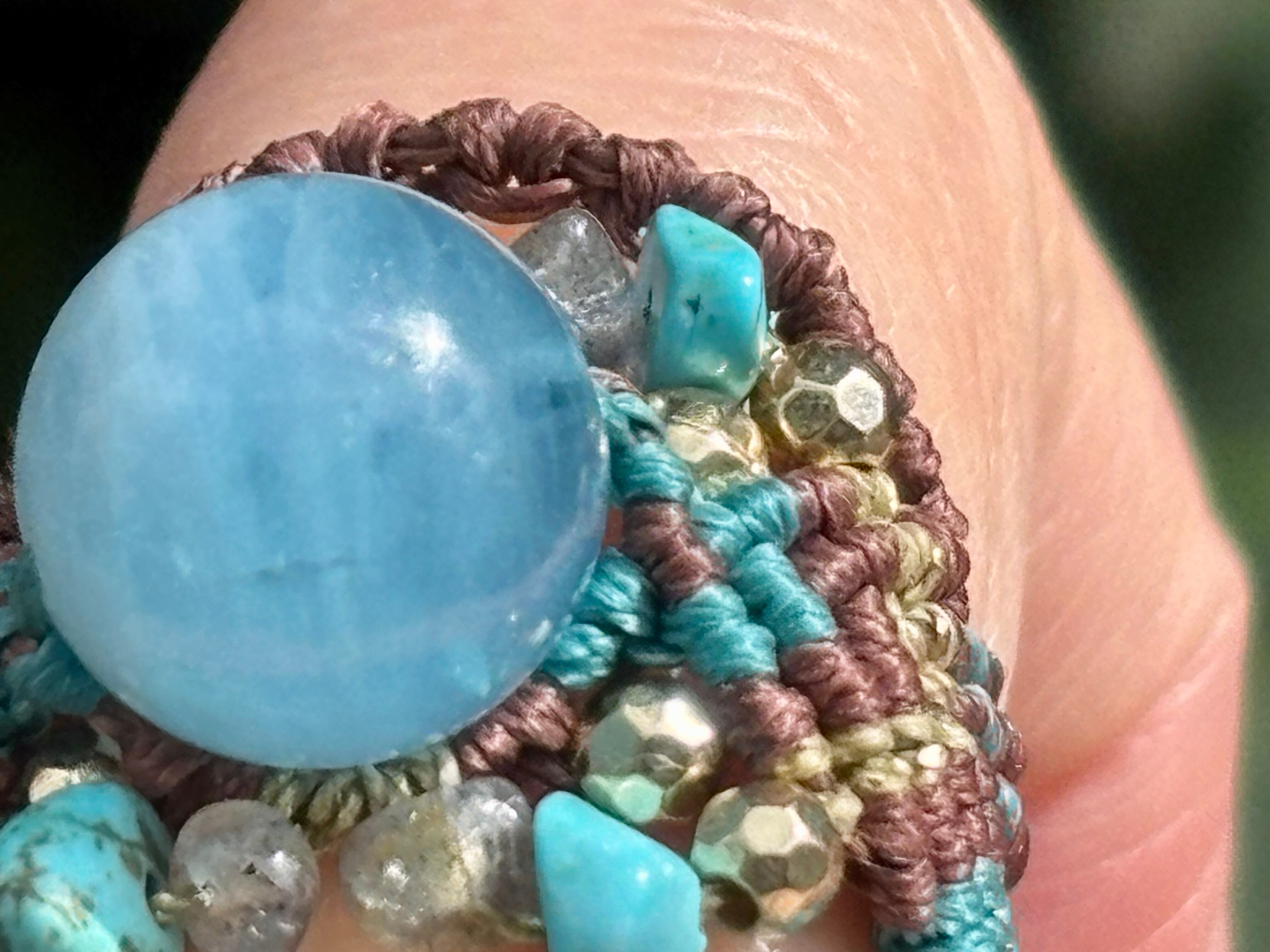 #1032高評価4Aアクアマリン一点物(アクアマリン×ラブラドライト×ターコイズ マクラメ編みリング/指輪)