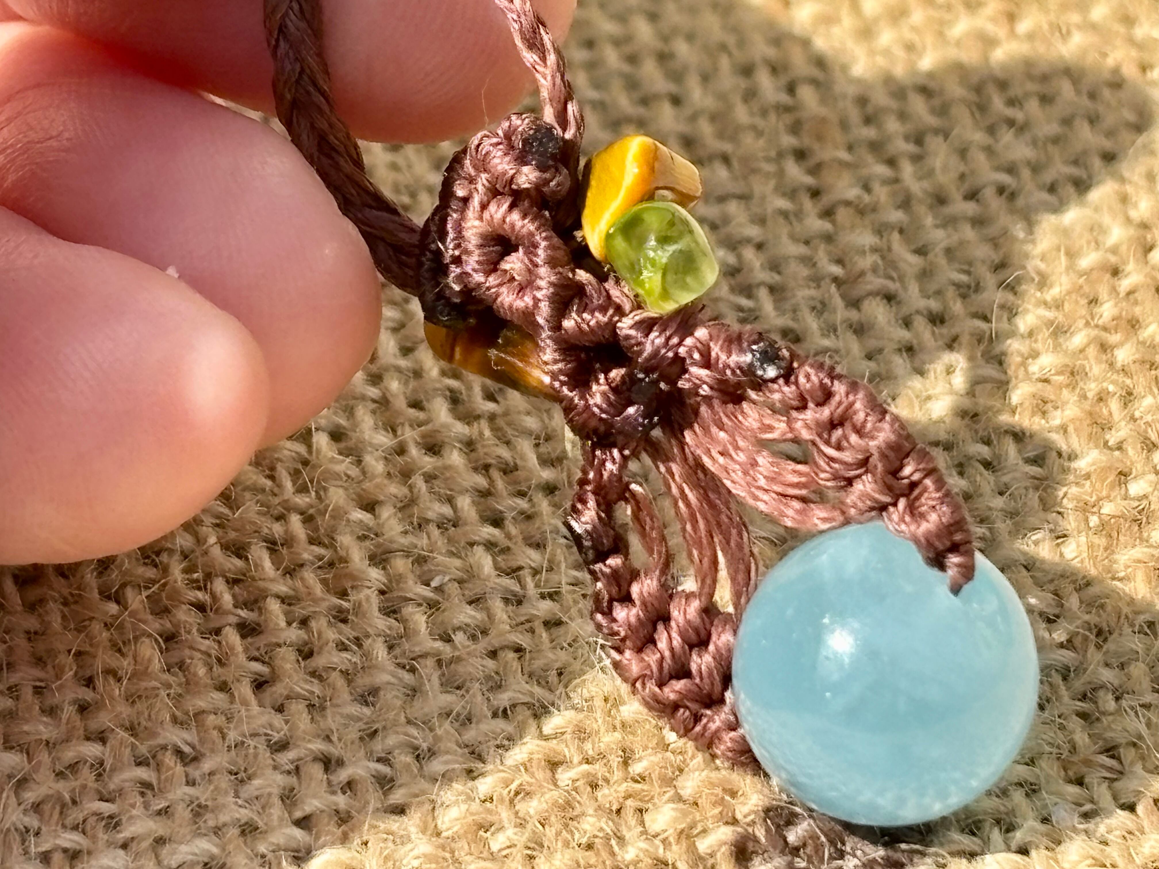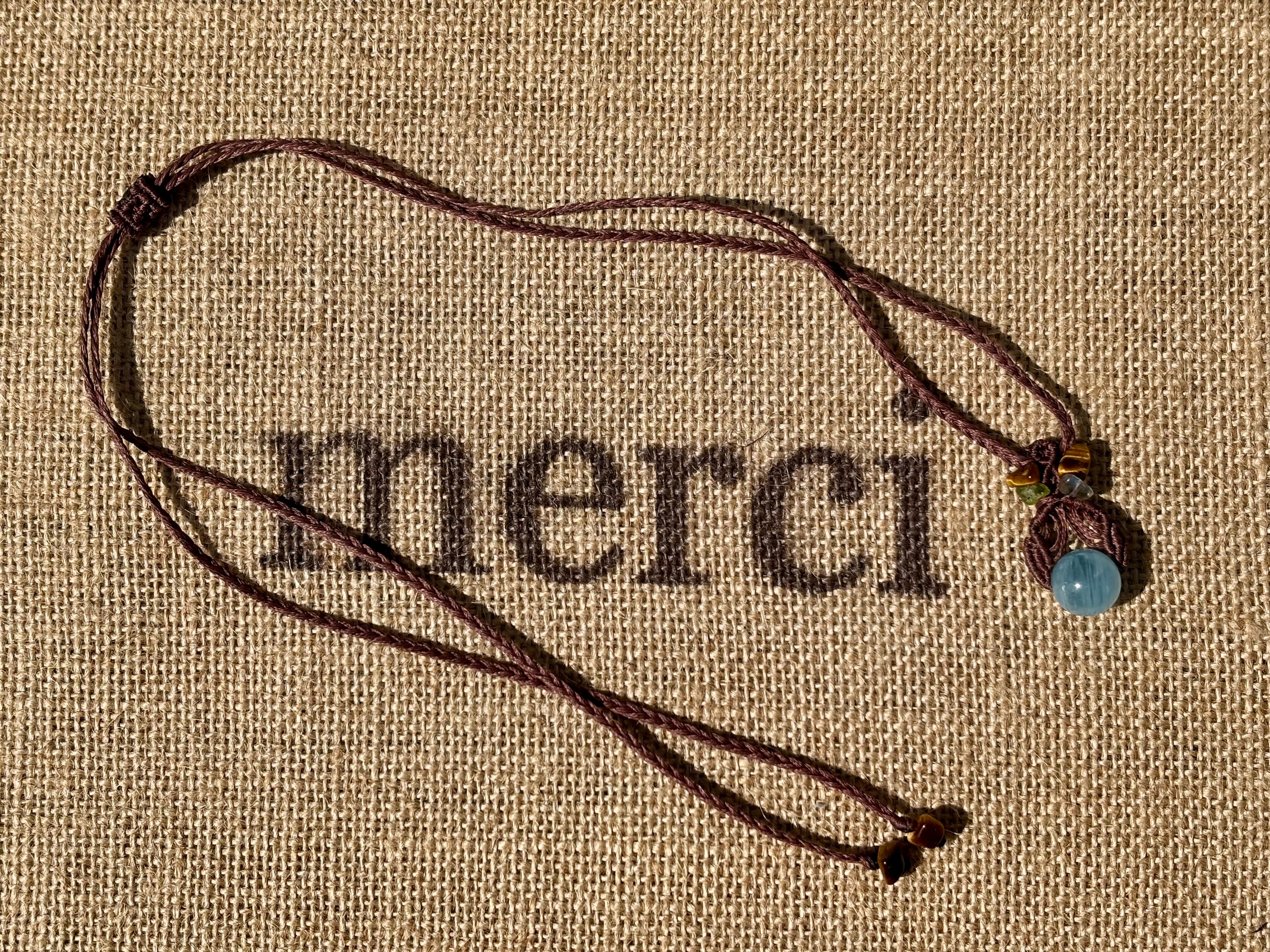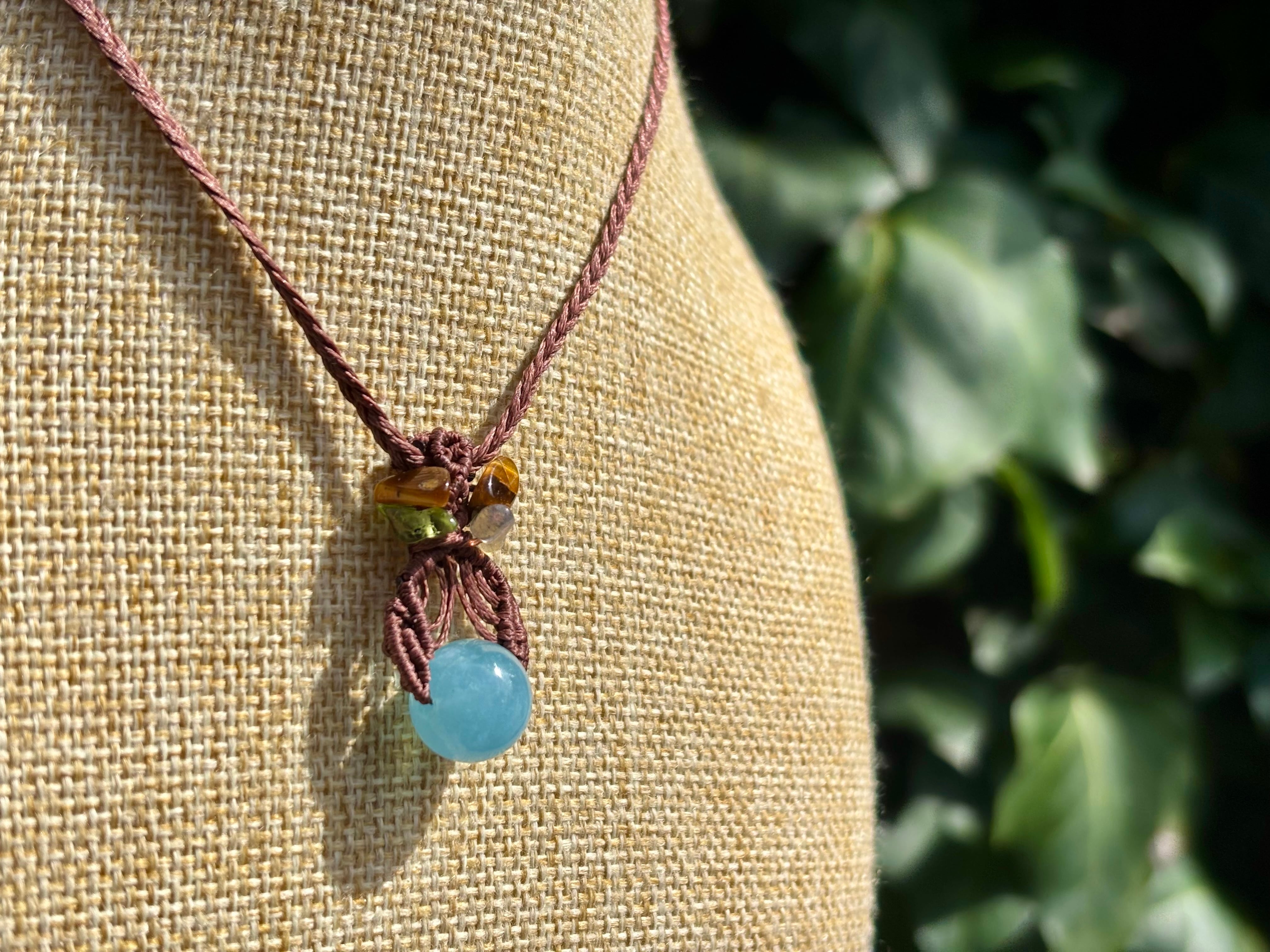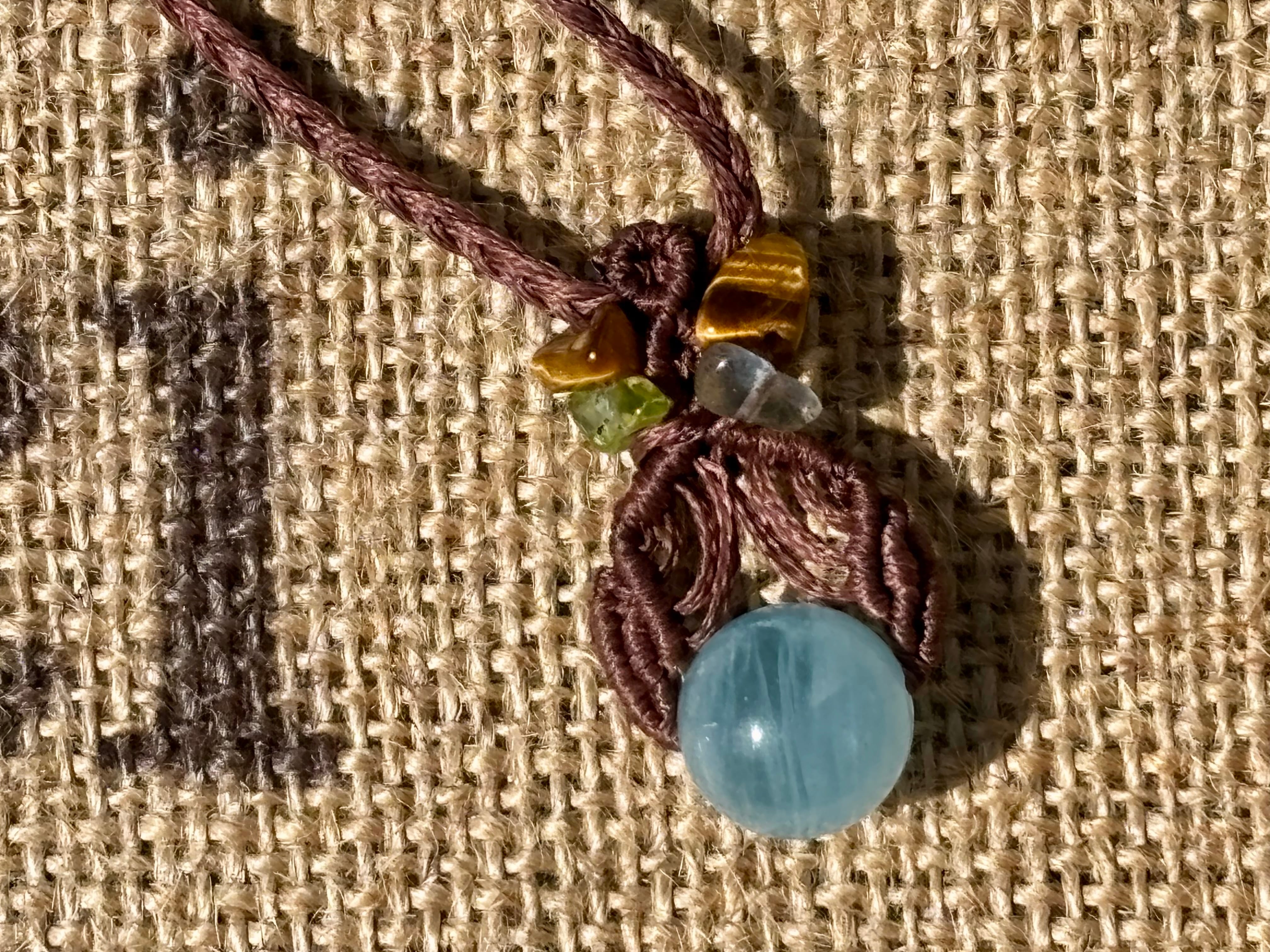 #1035高評価4Aアクアマリン一点物(アクアマリン×ペリドット×ラブラドライト×タイガーアイ マクラメ編みネックレス)