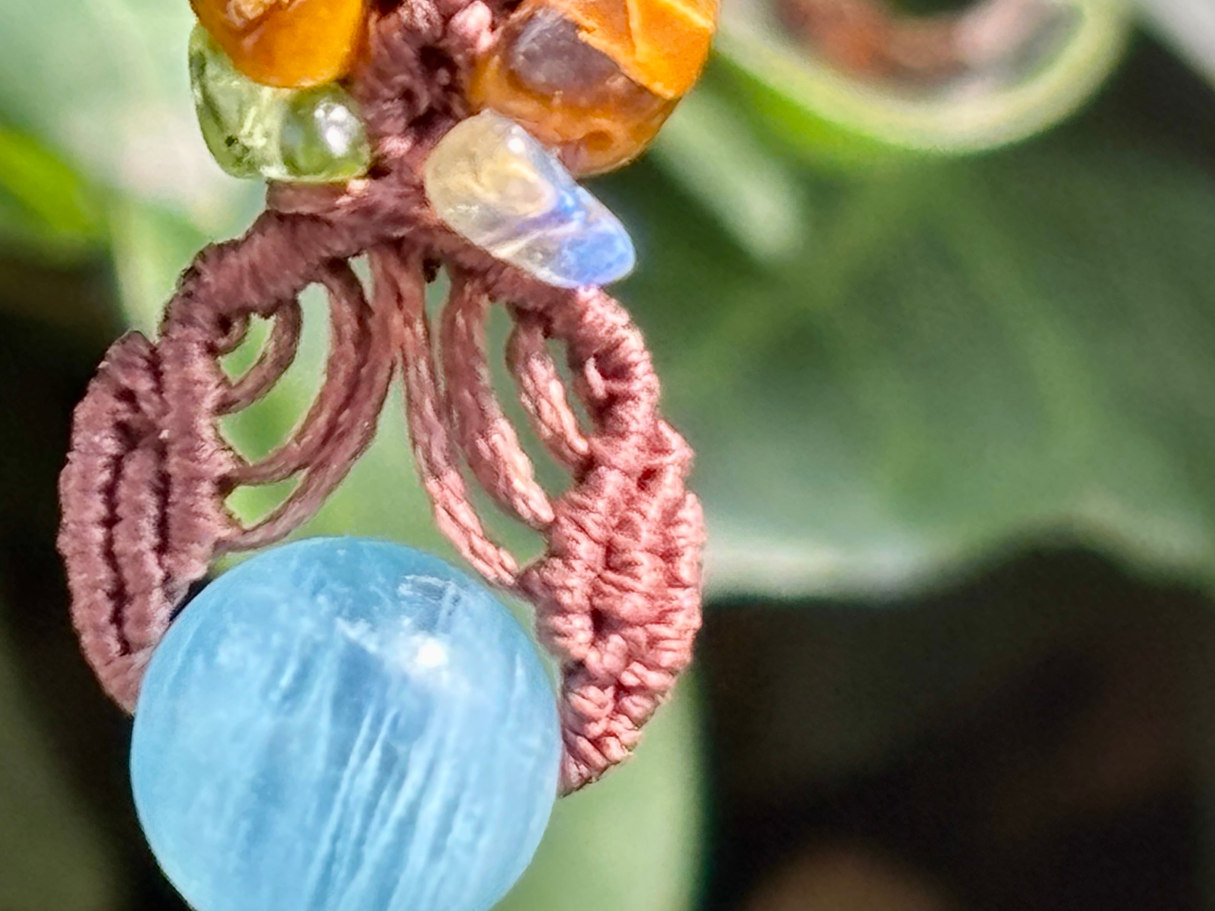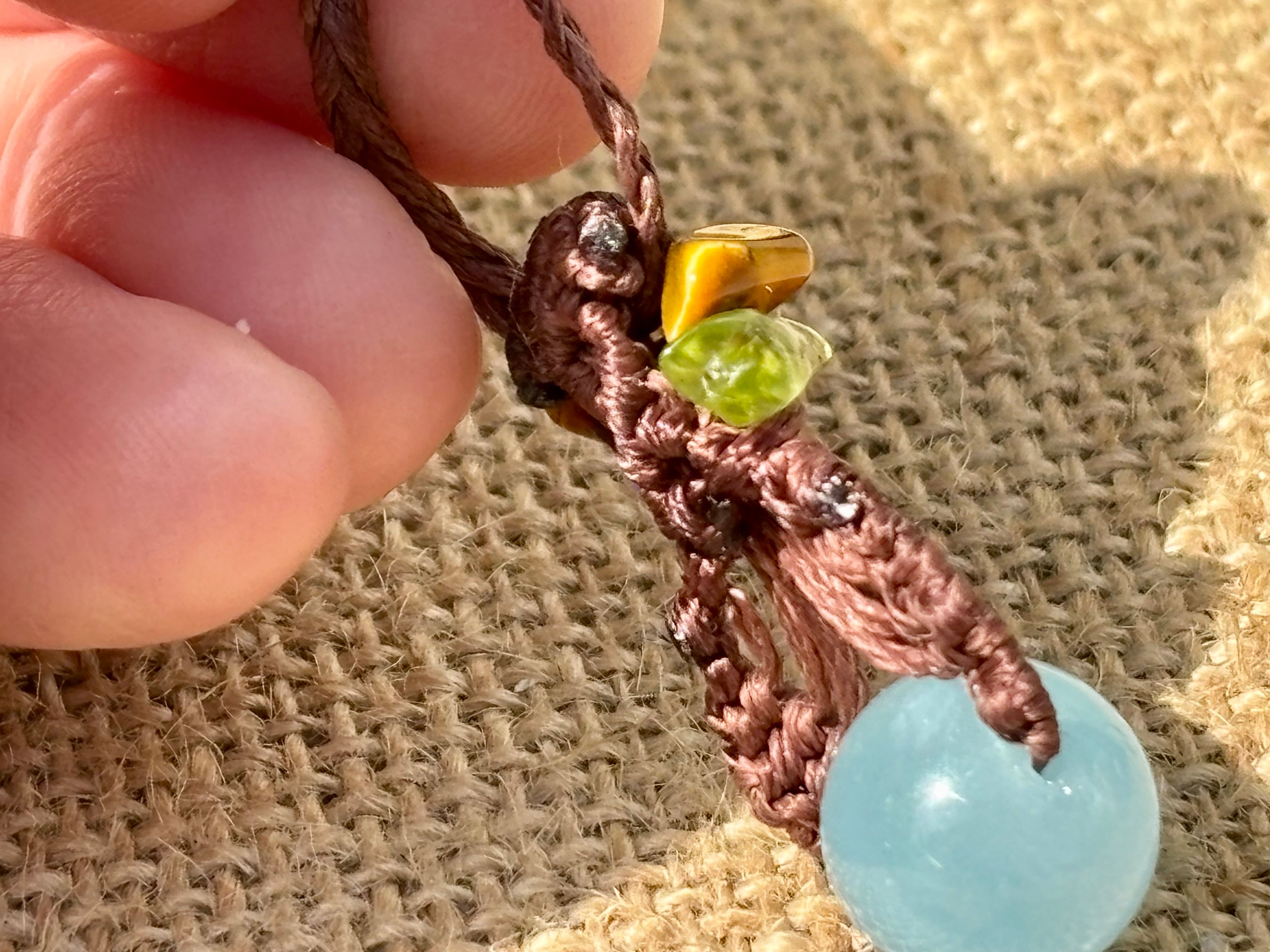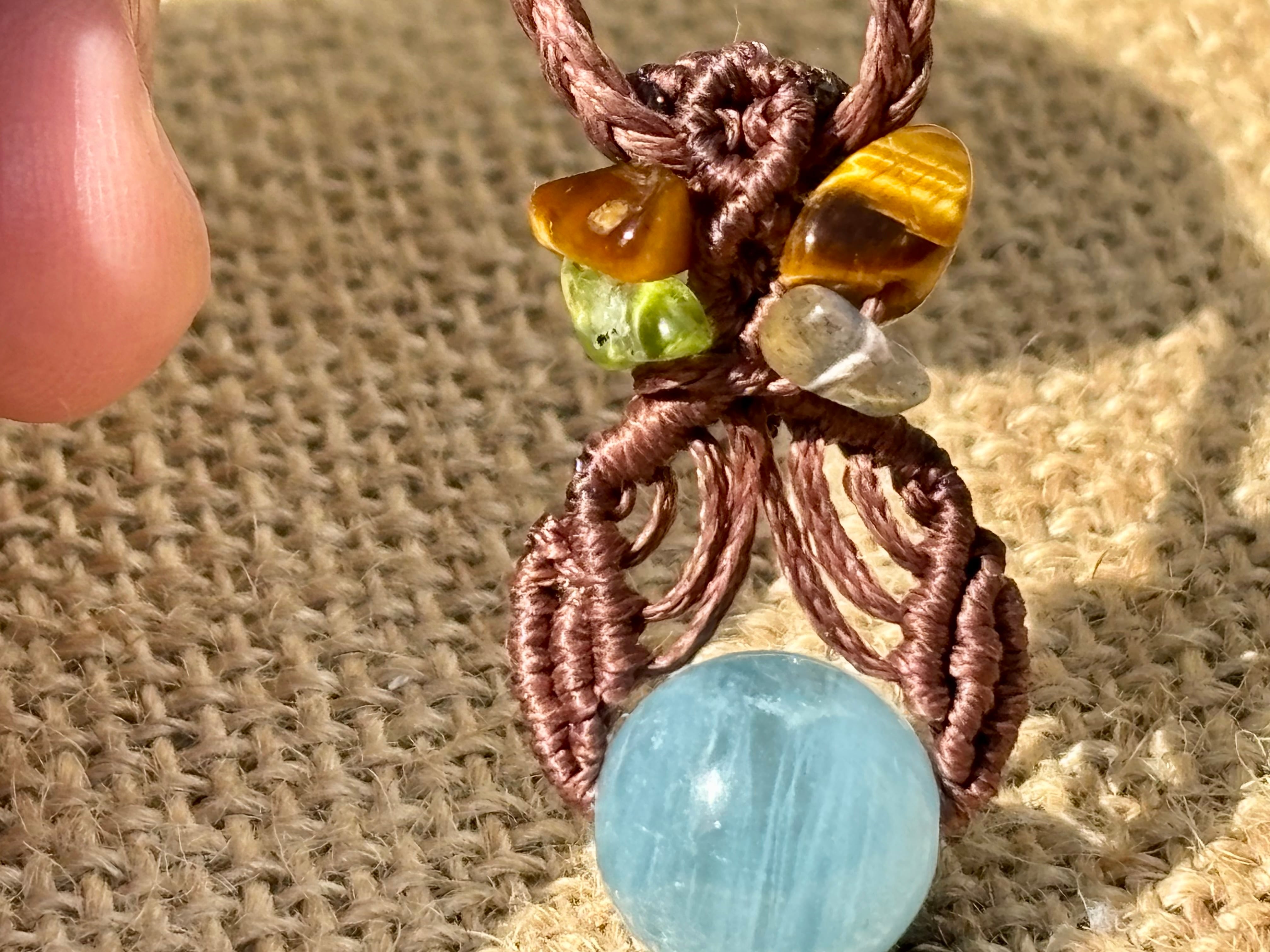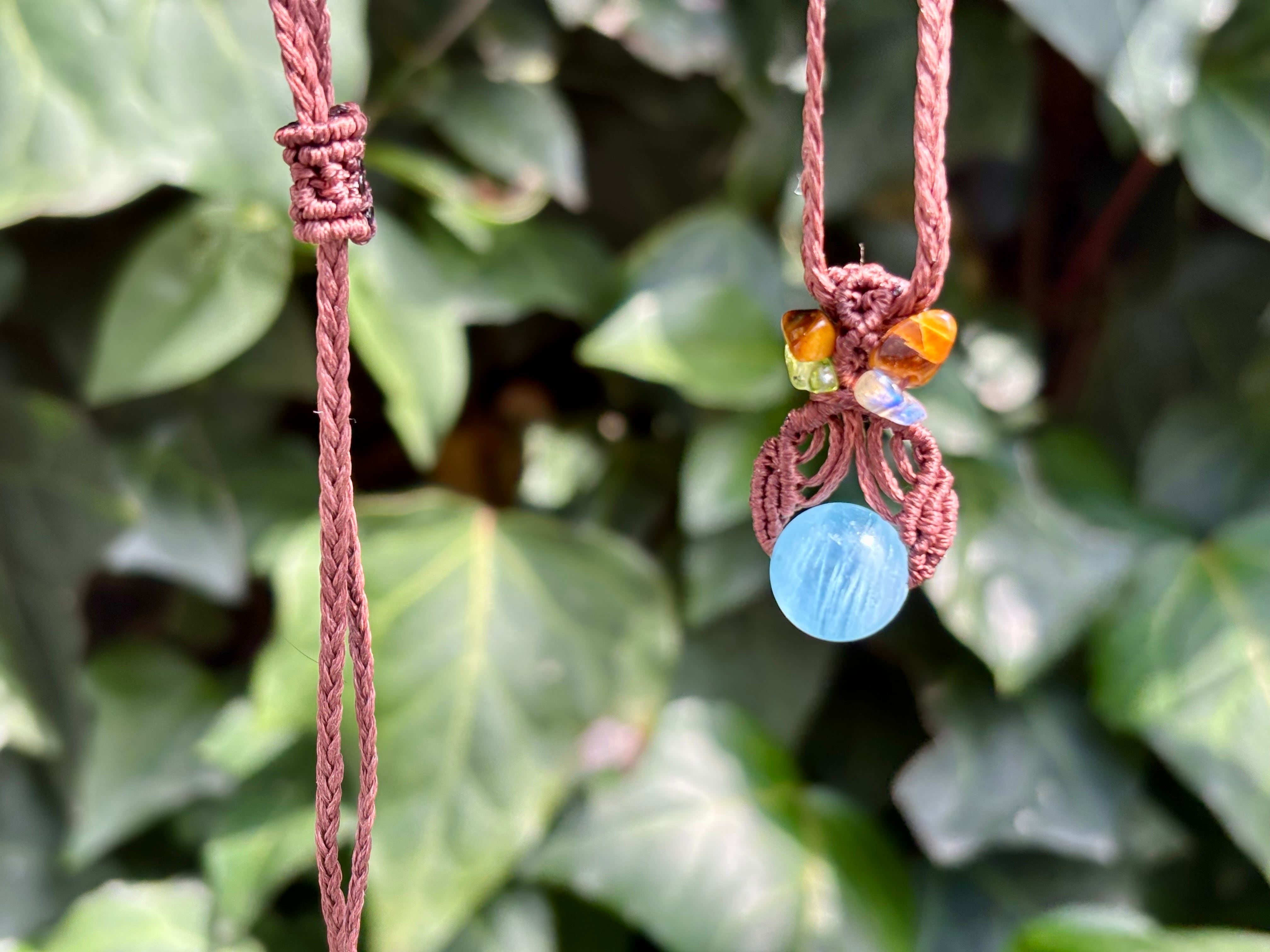 #1035高評価4Aアクアマリン一点物(アクアマリン×ペリドット×ラブラドライト×タイガーアイ マクラメ編みネックレス)