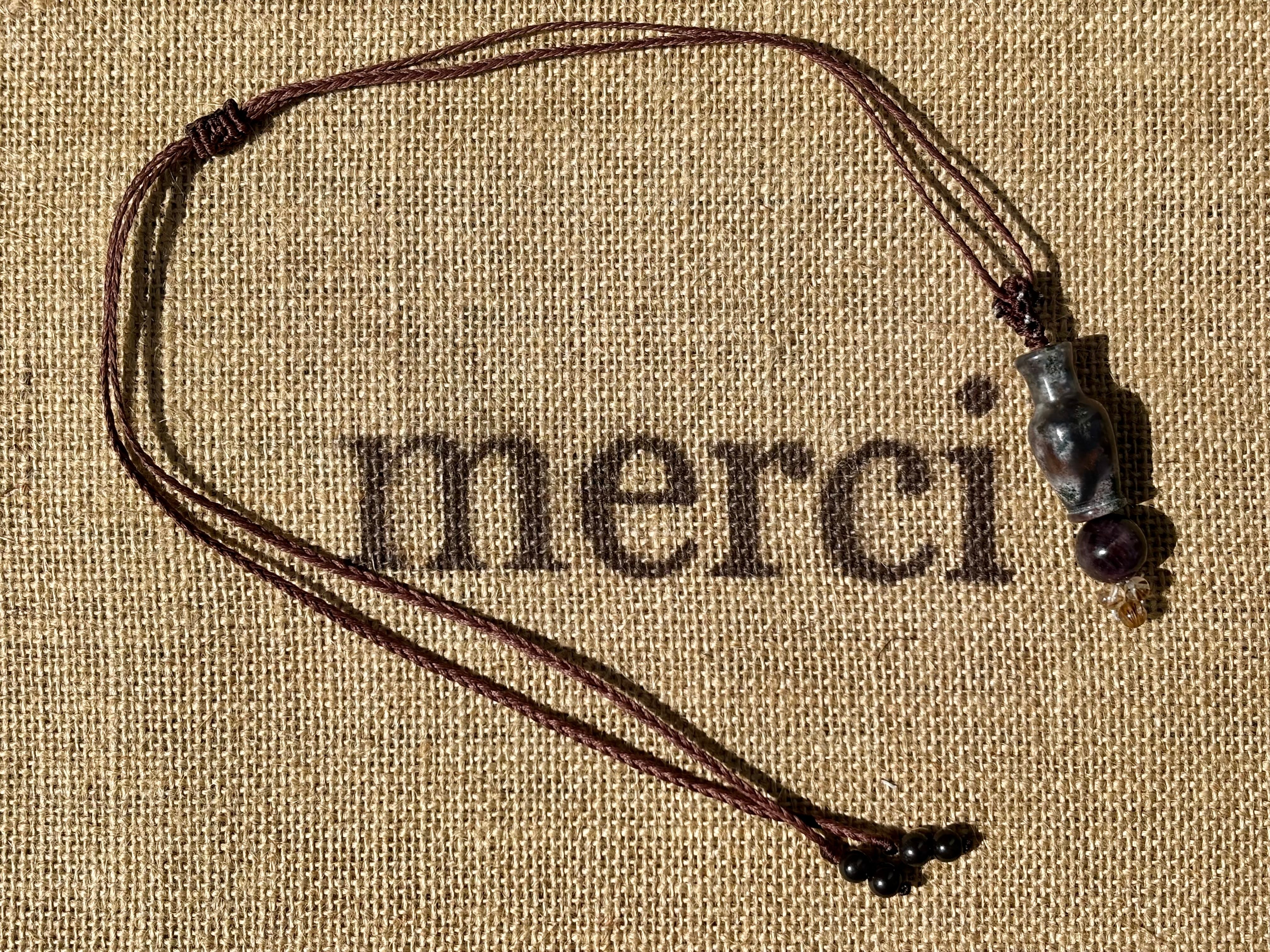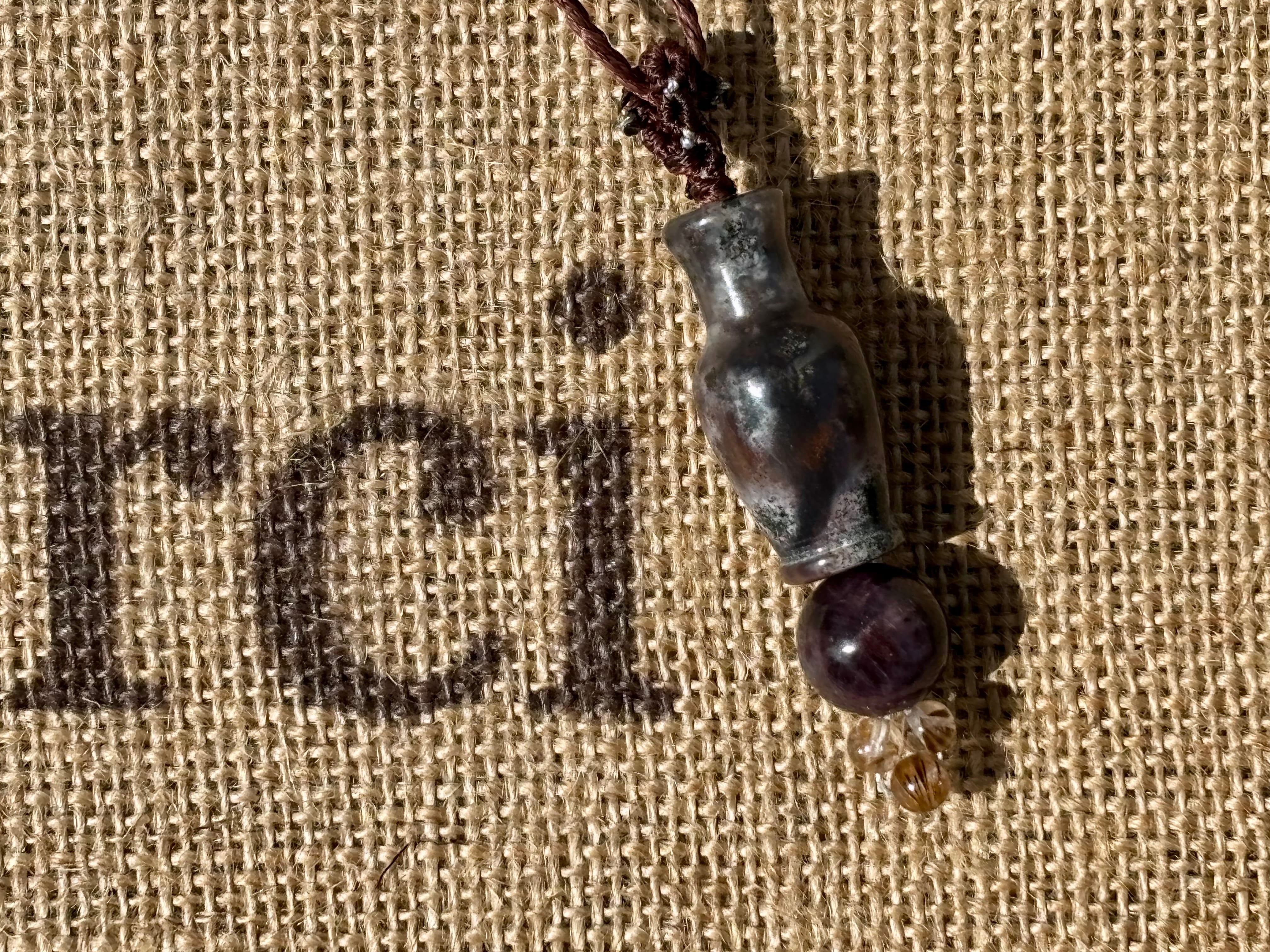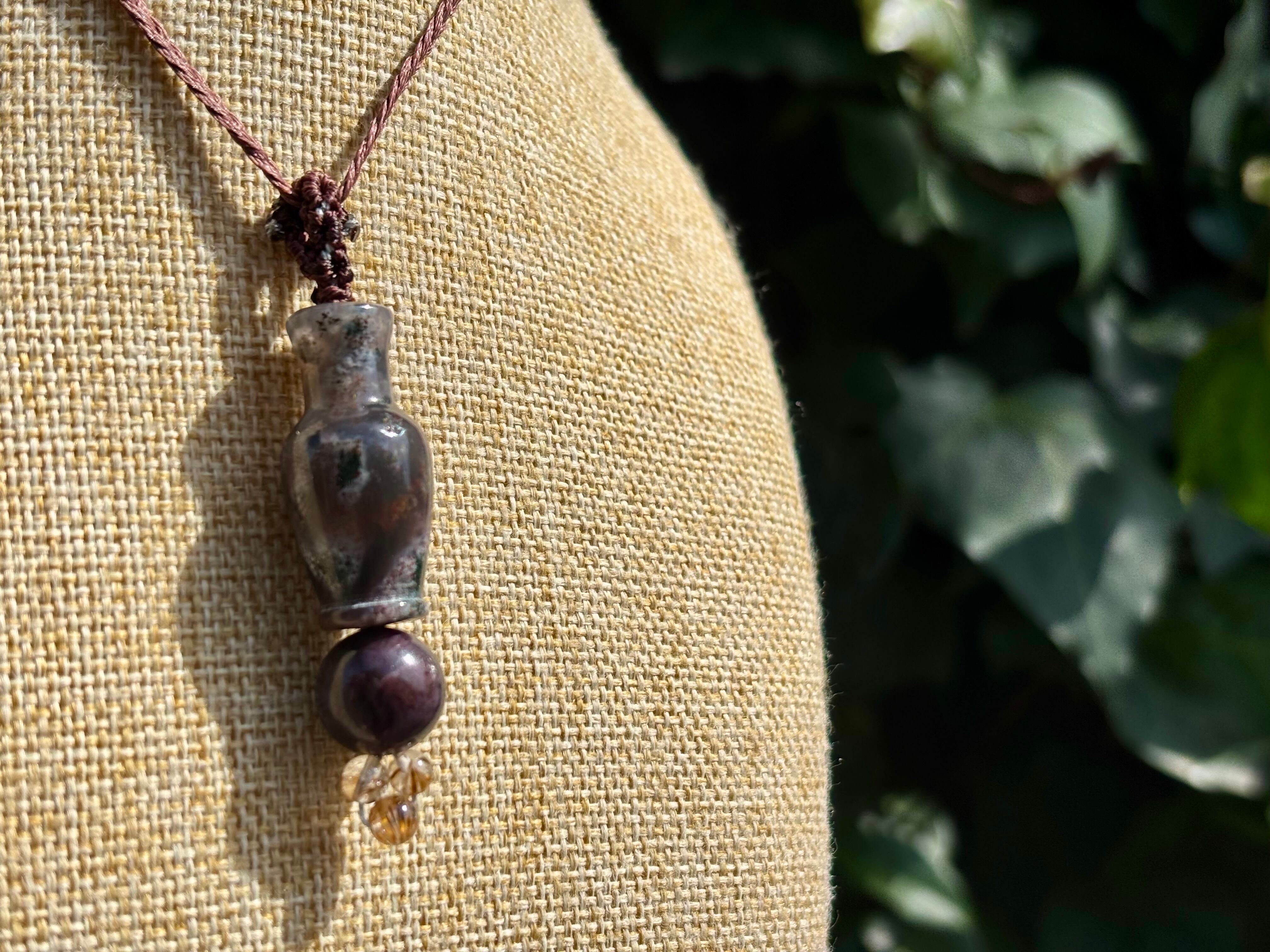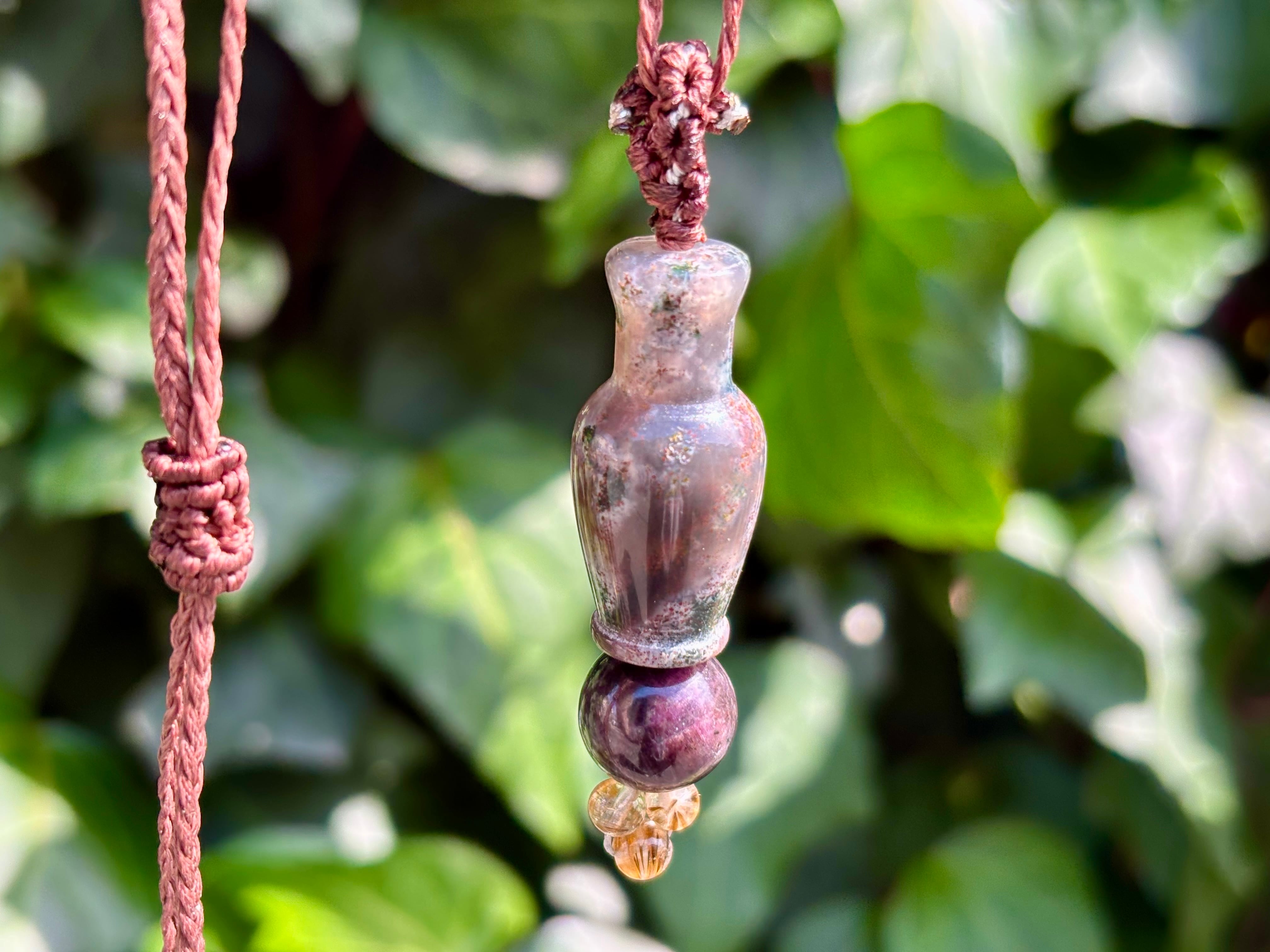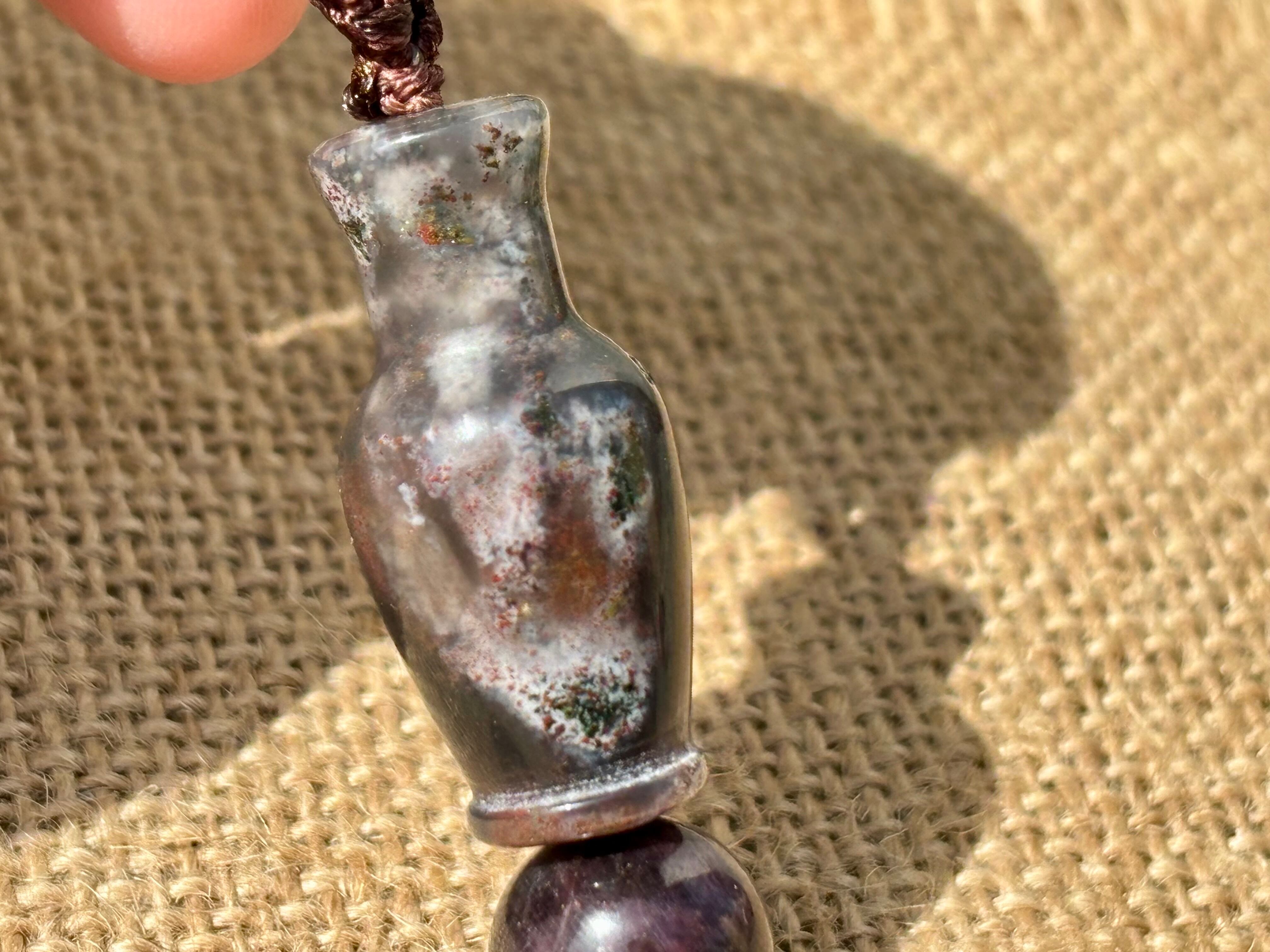 #1038モスアゲート宝瓶一点物(モスアゲート×サファイア×高品質カコクセナイト マクラメ編みネックレス)