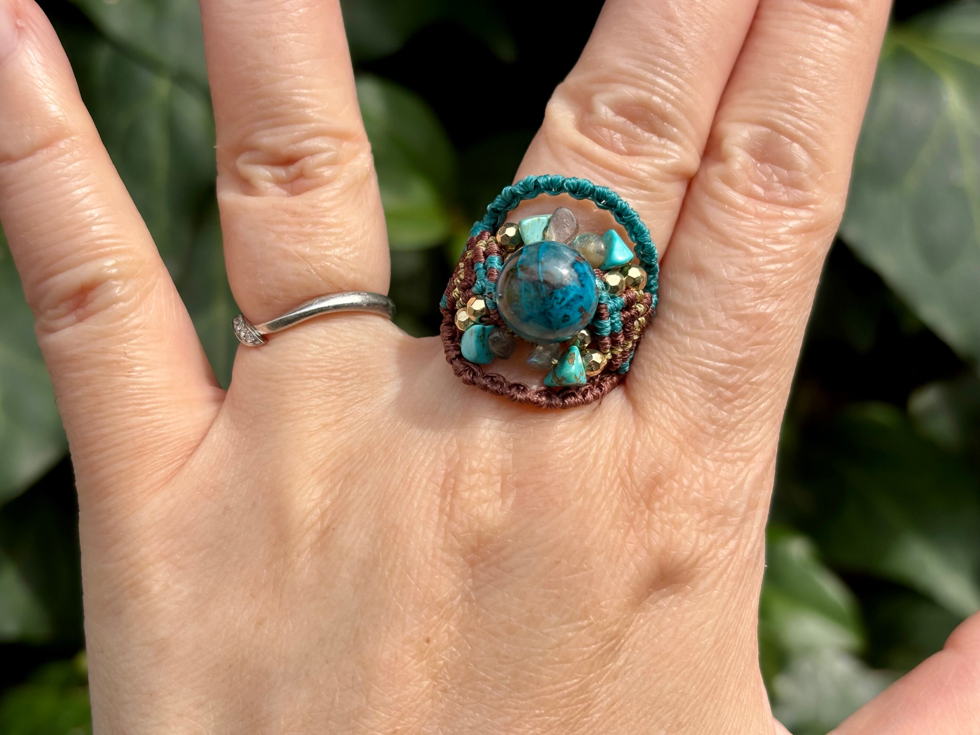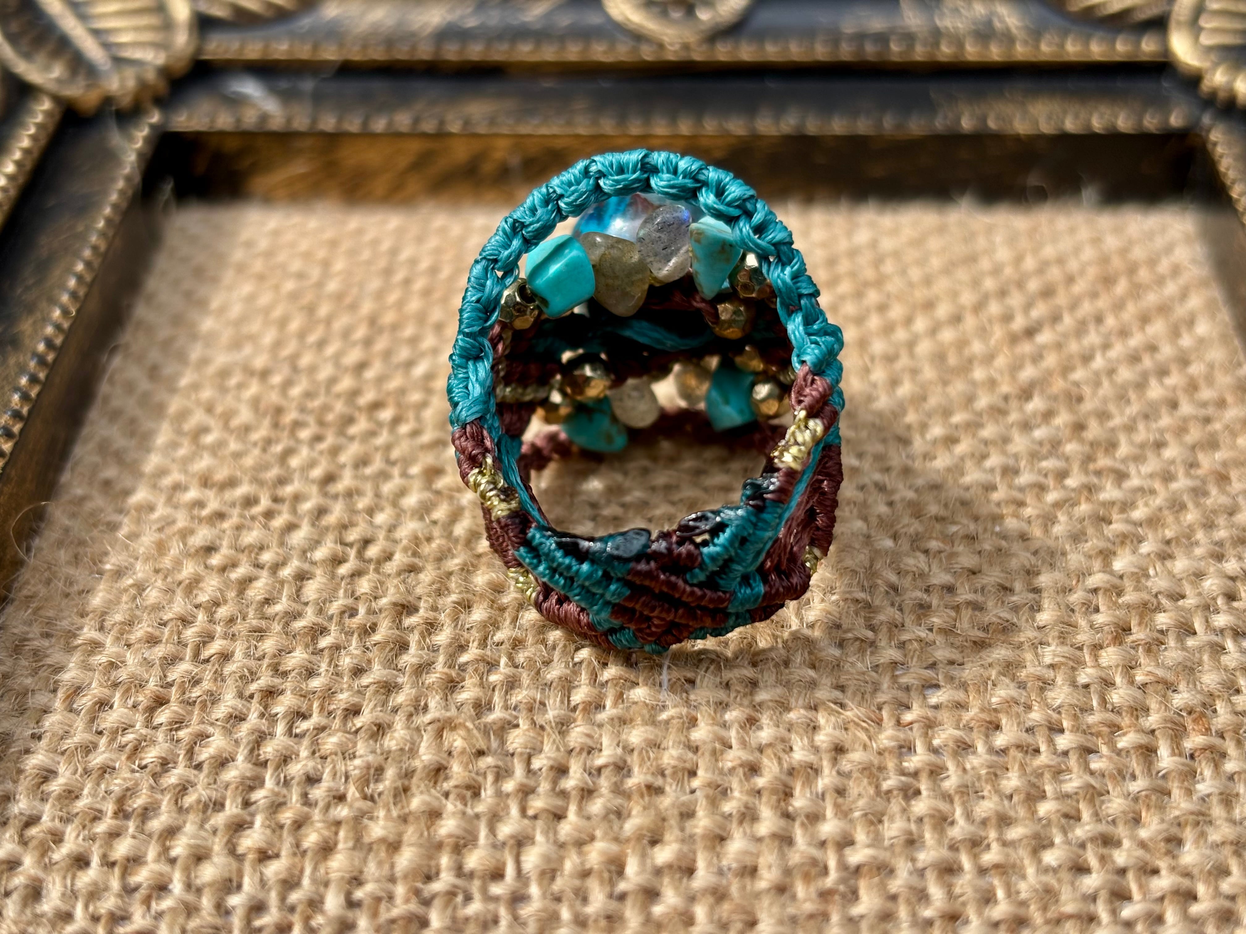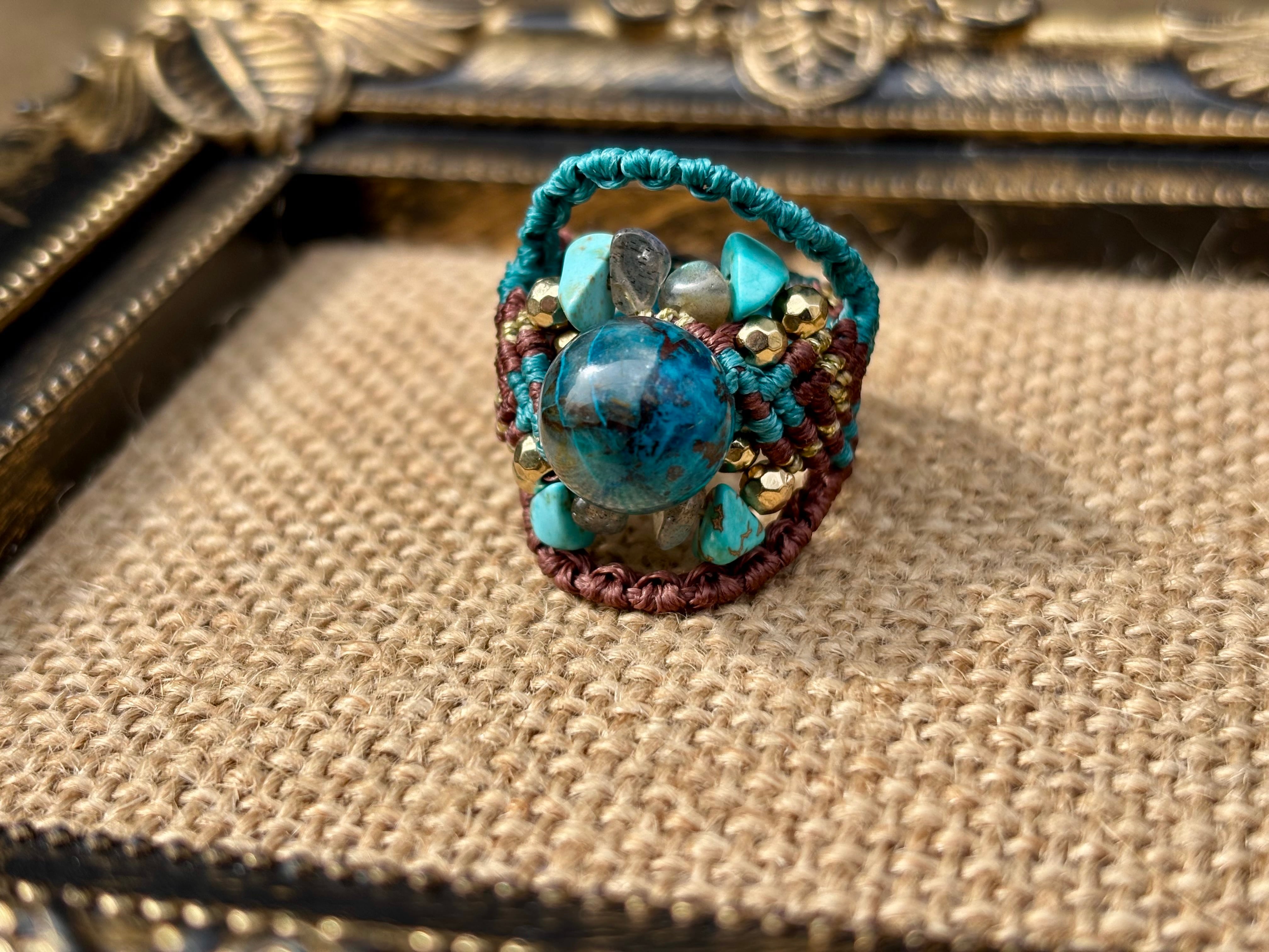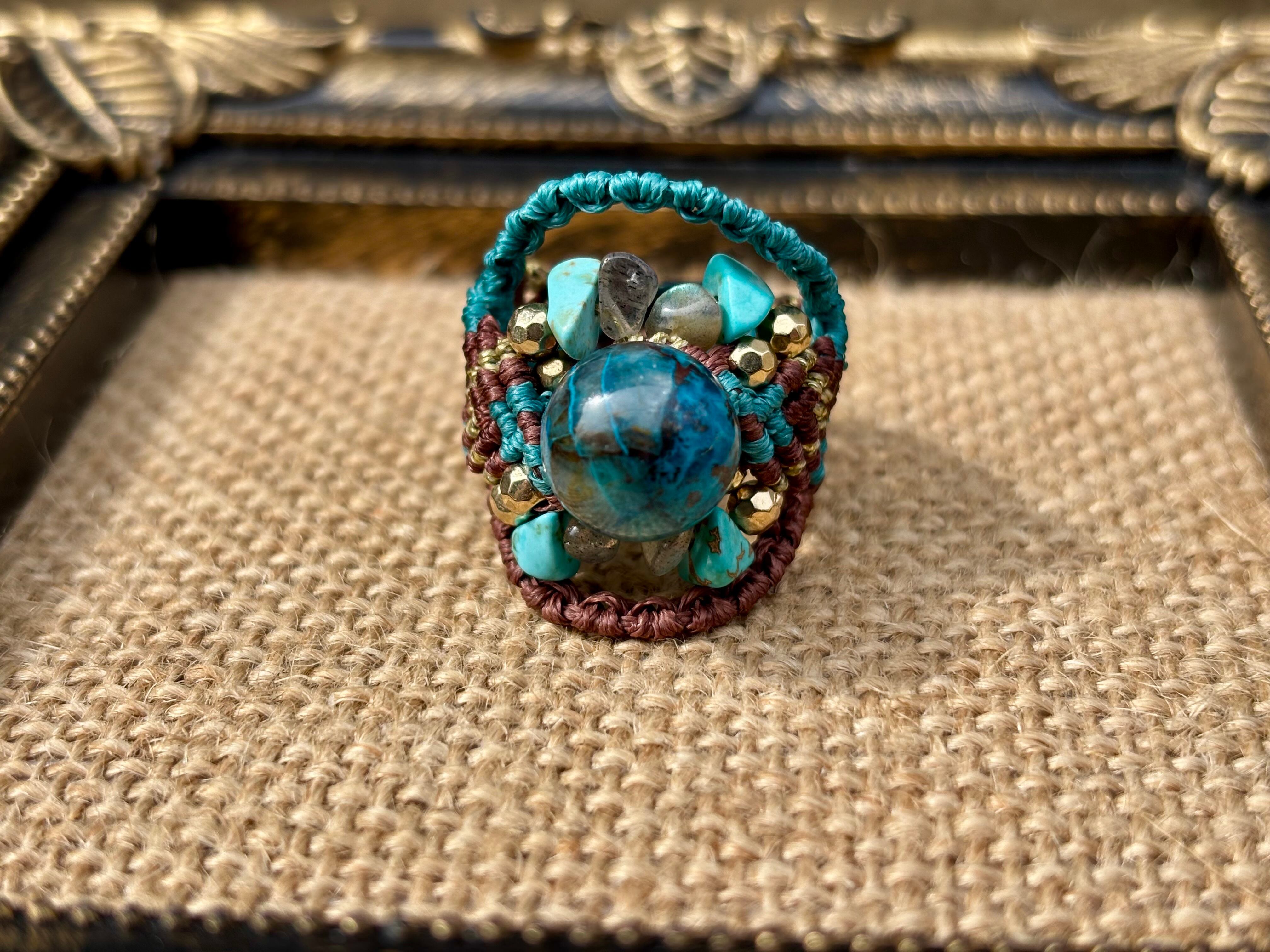 #1040高評価5Aクリソコラ一点物(クリソコラ×ラブラドライト×ターコイズ マクラメ編みリング/指輪)