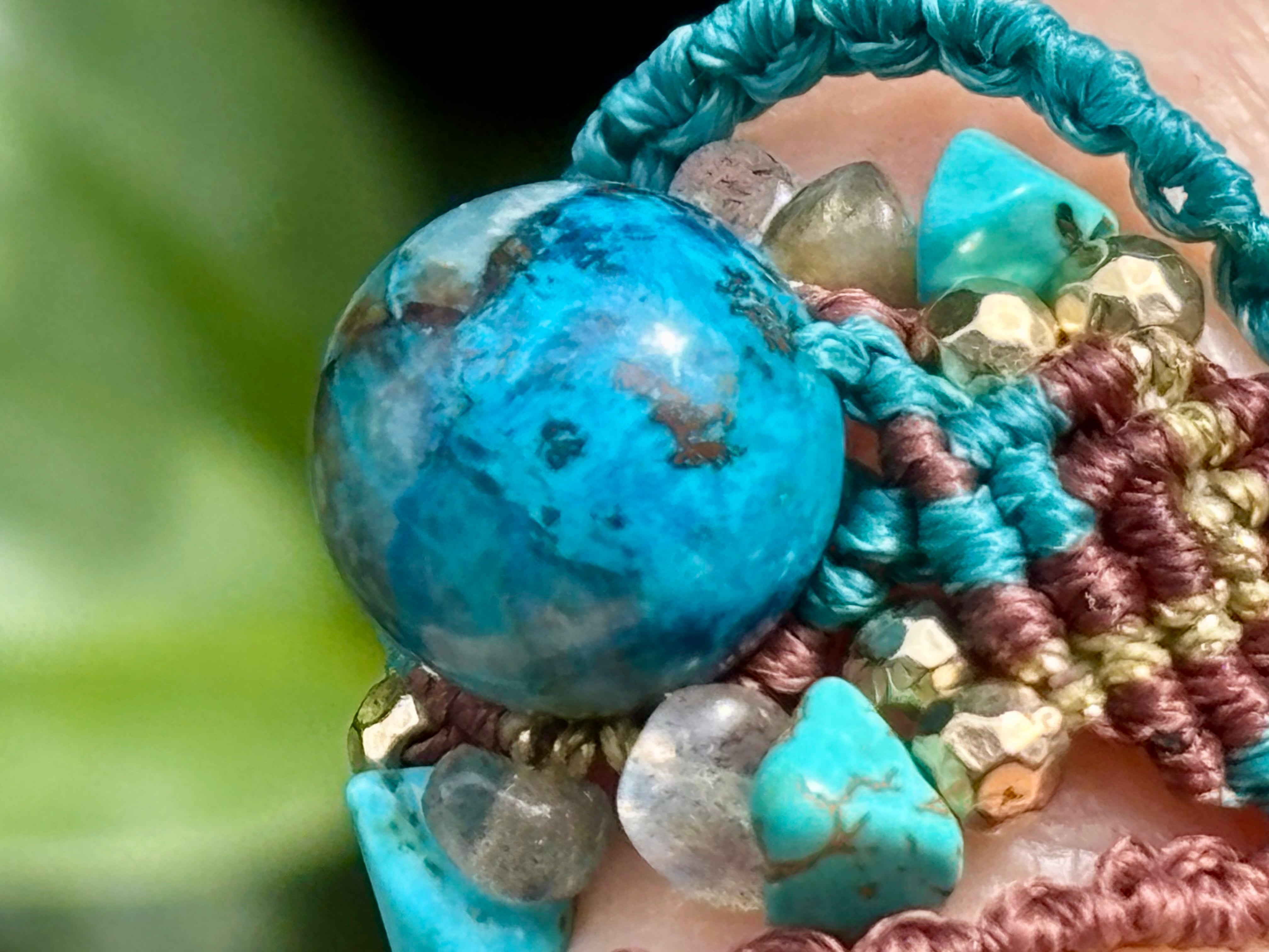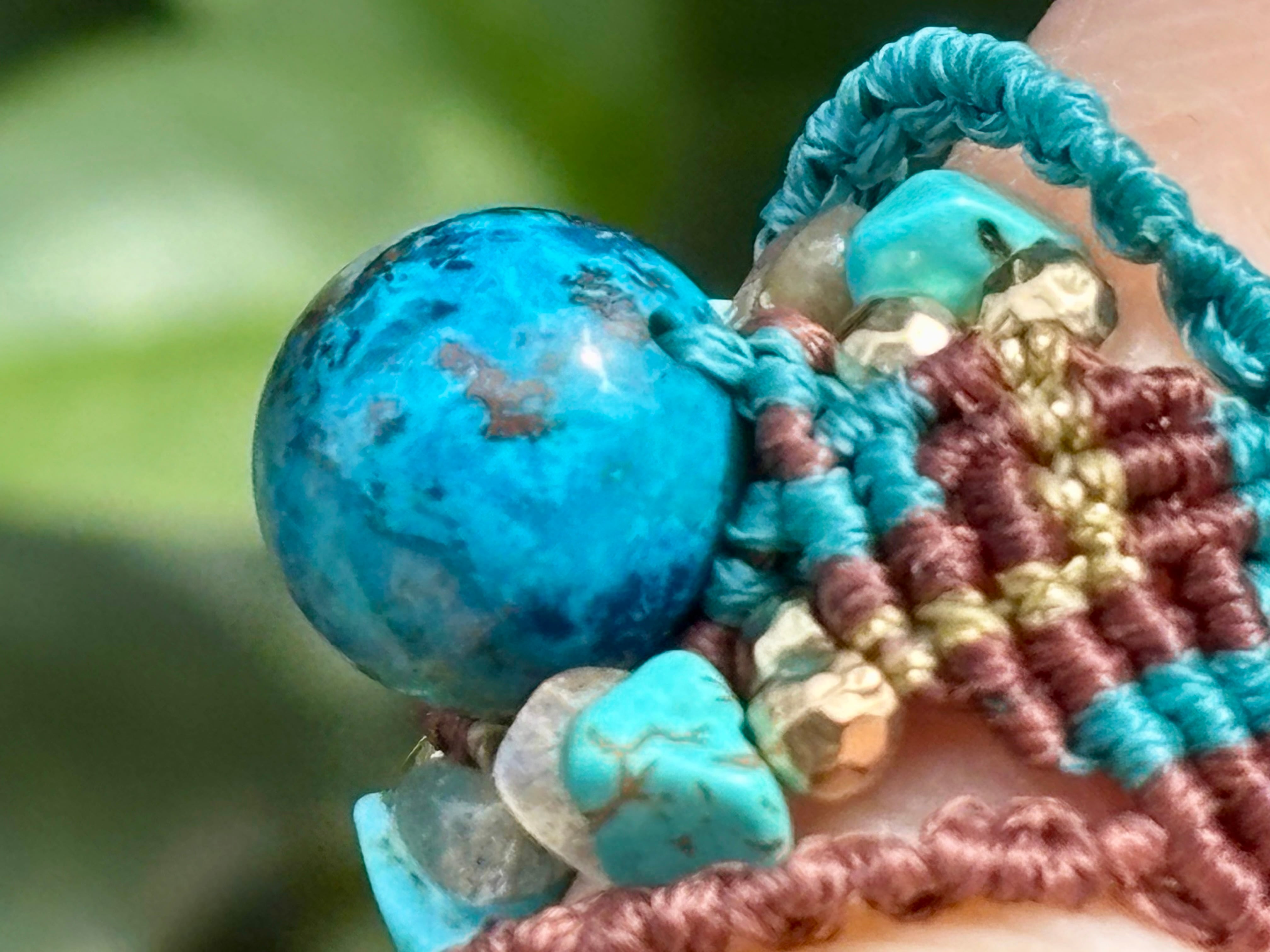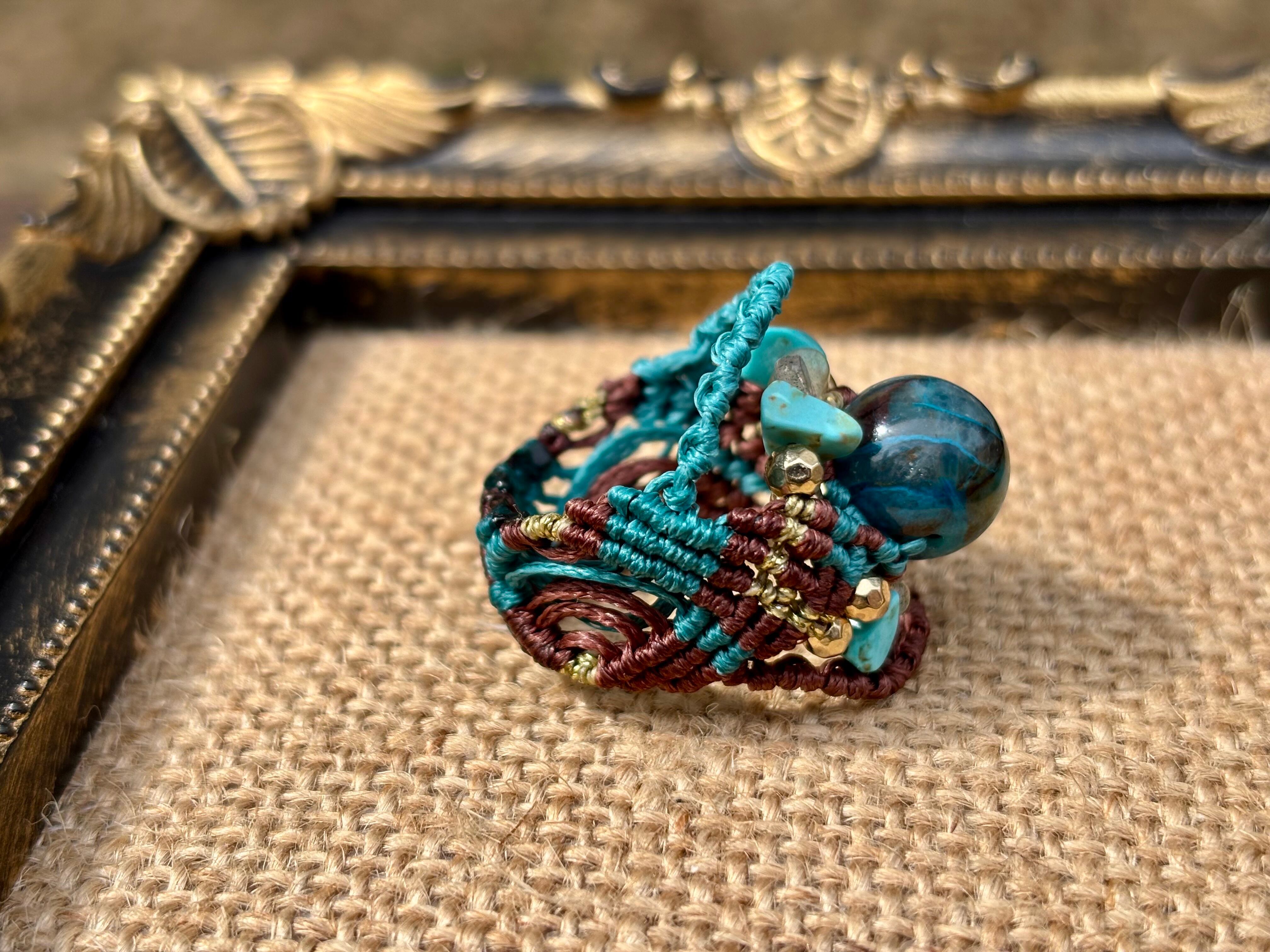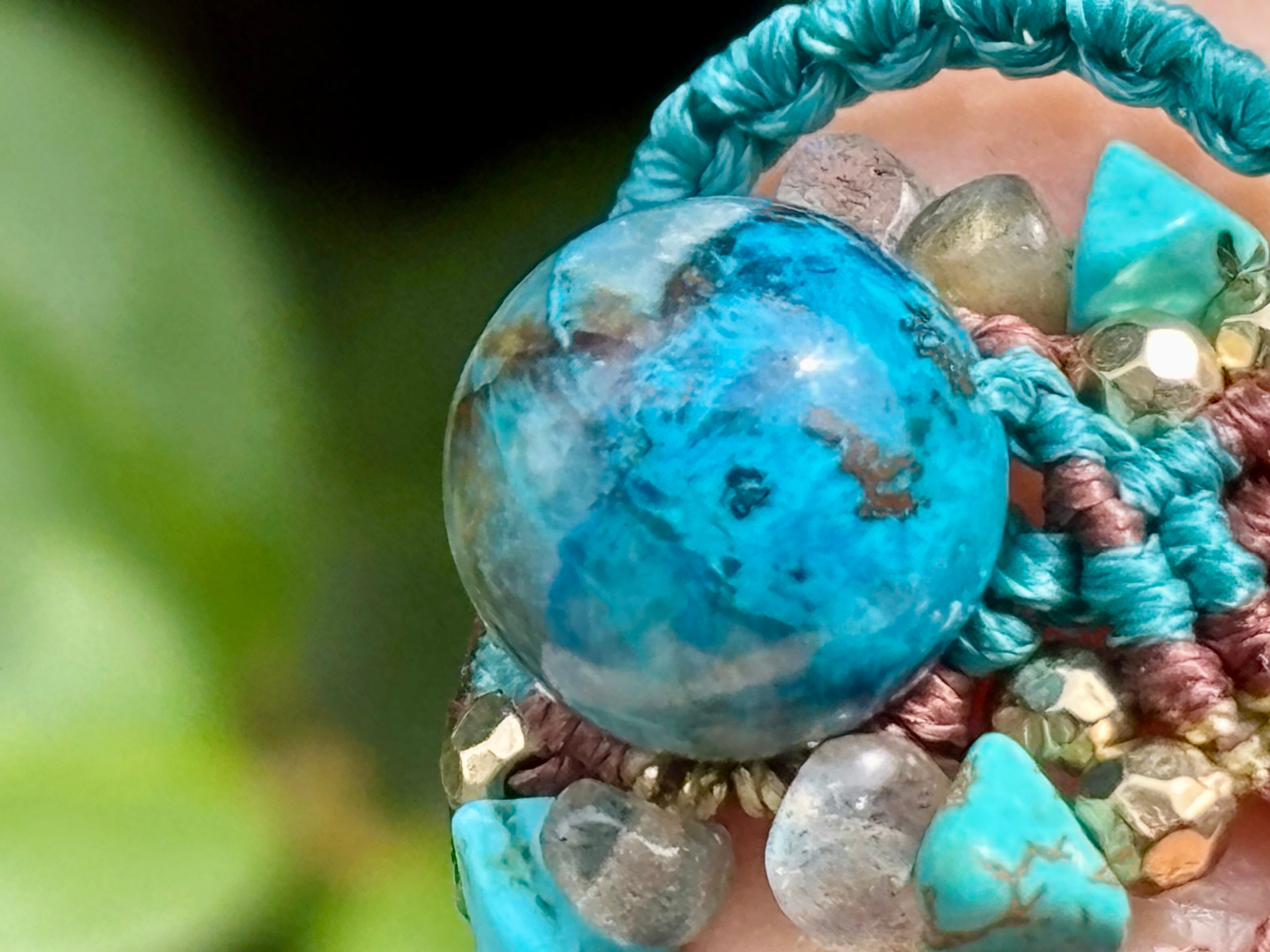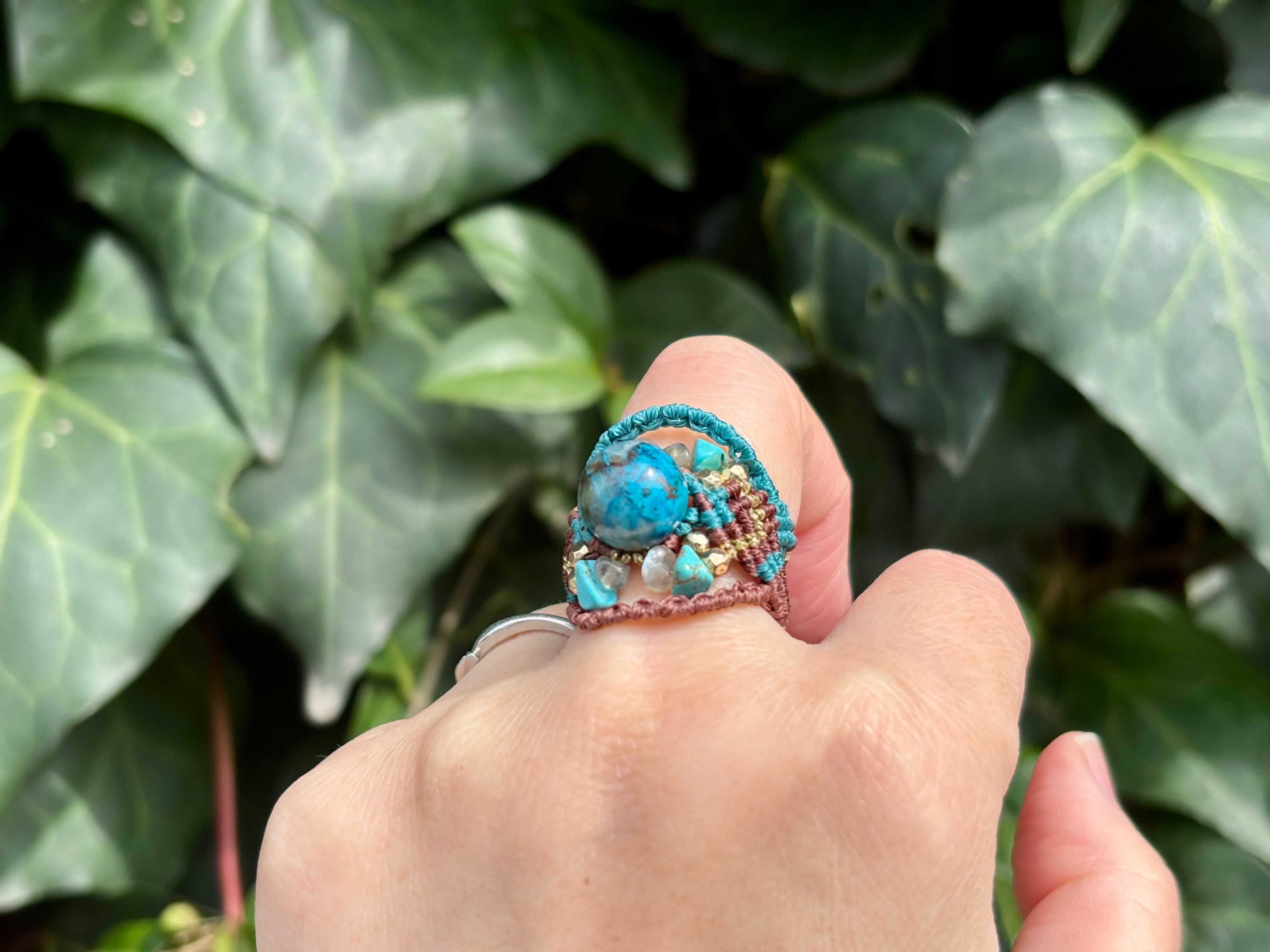 #1040高評価5Aクリソコラ一点物(クリソコラ×ラブラドライト×ターコイズ マクラメ編みリング/指輪)