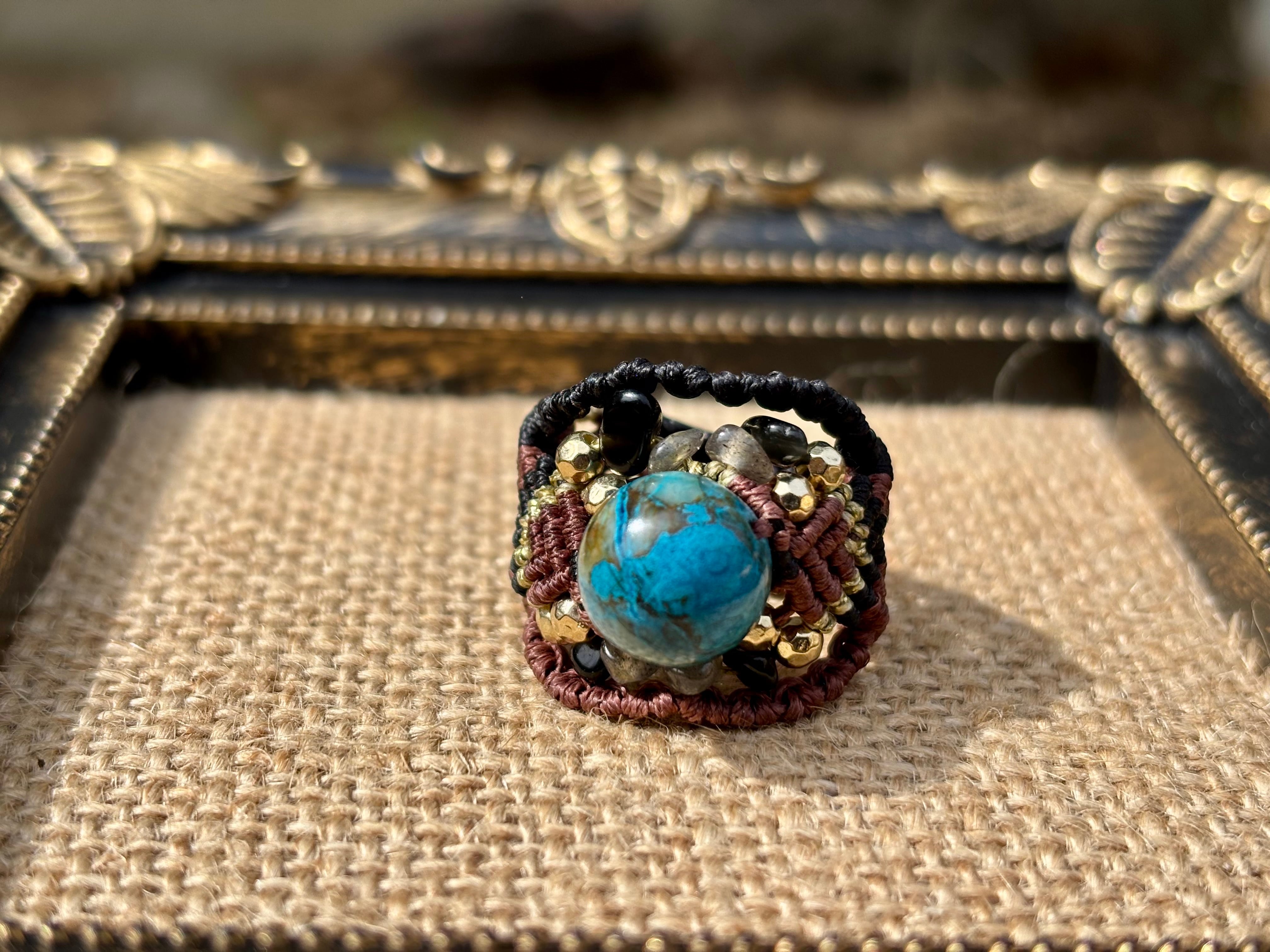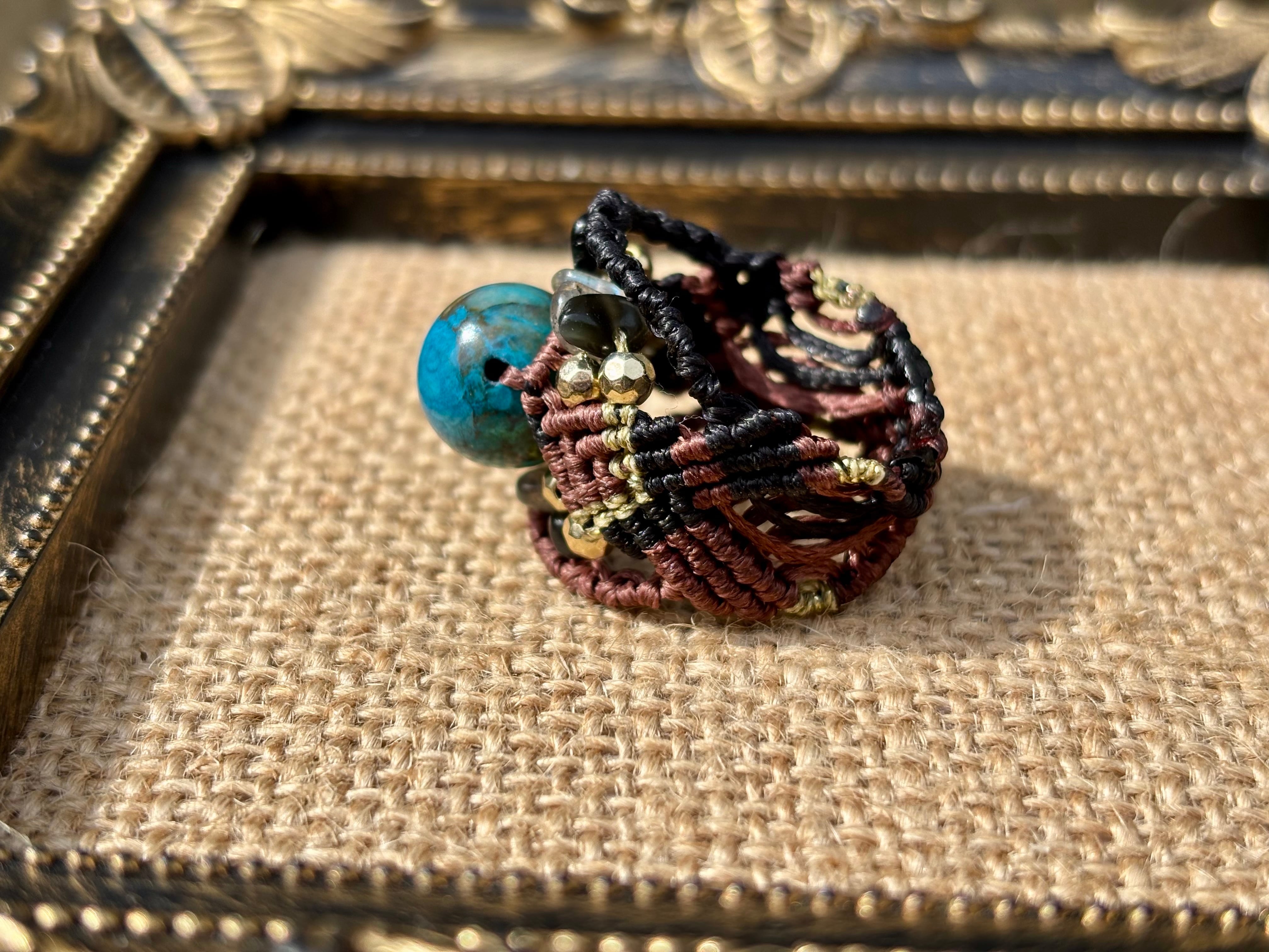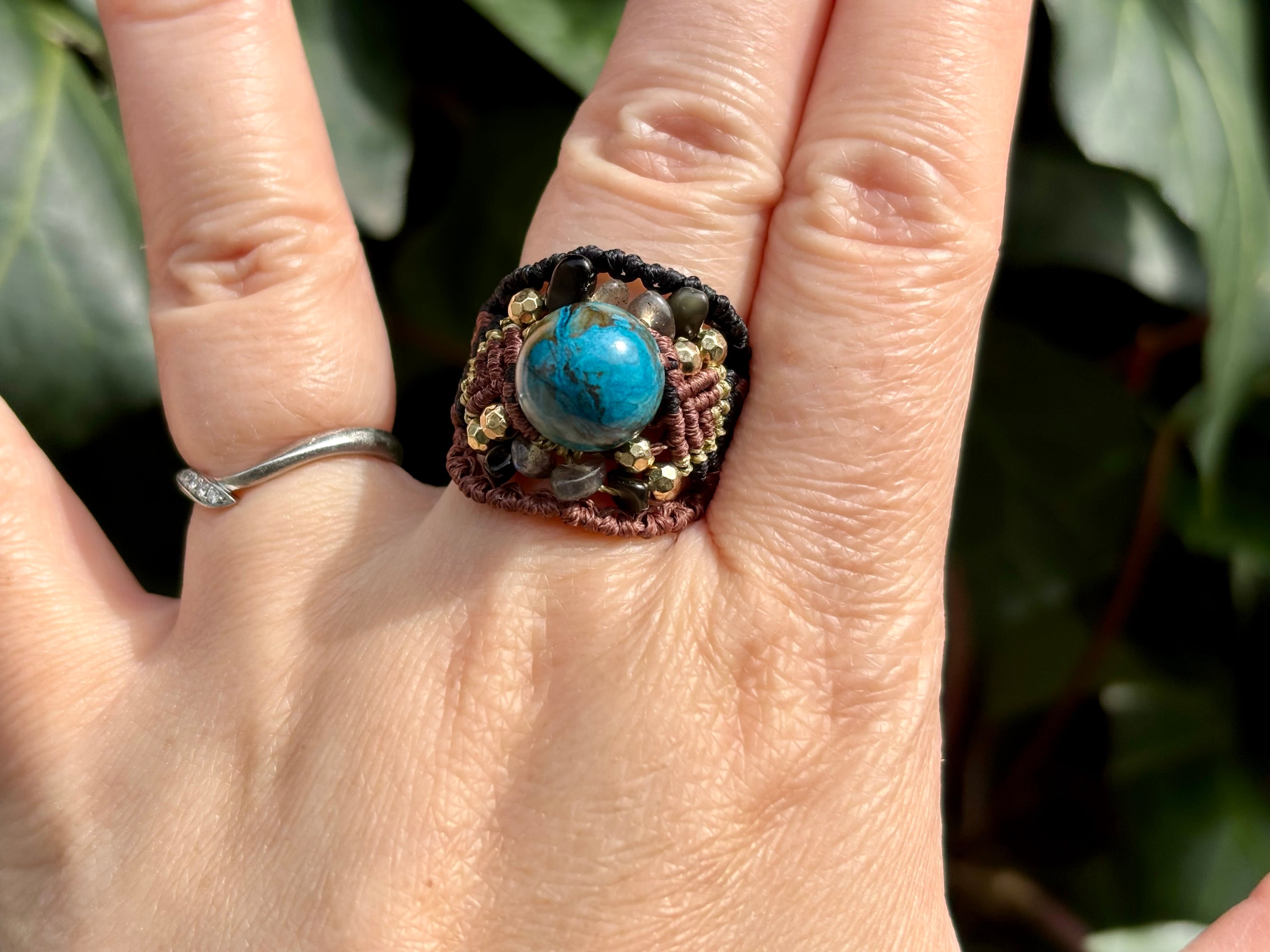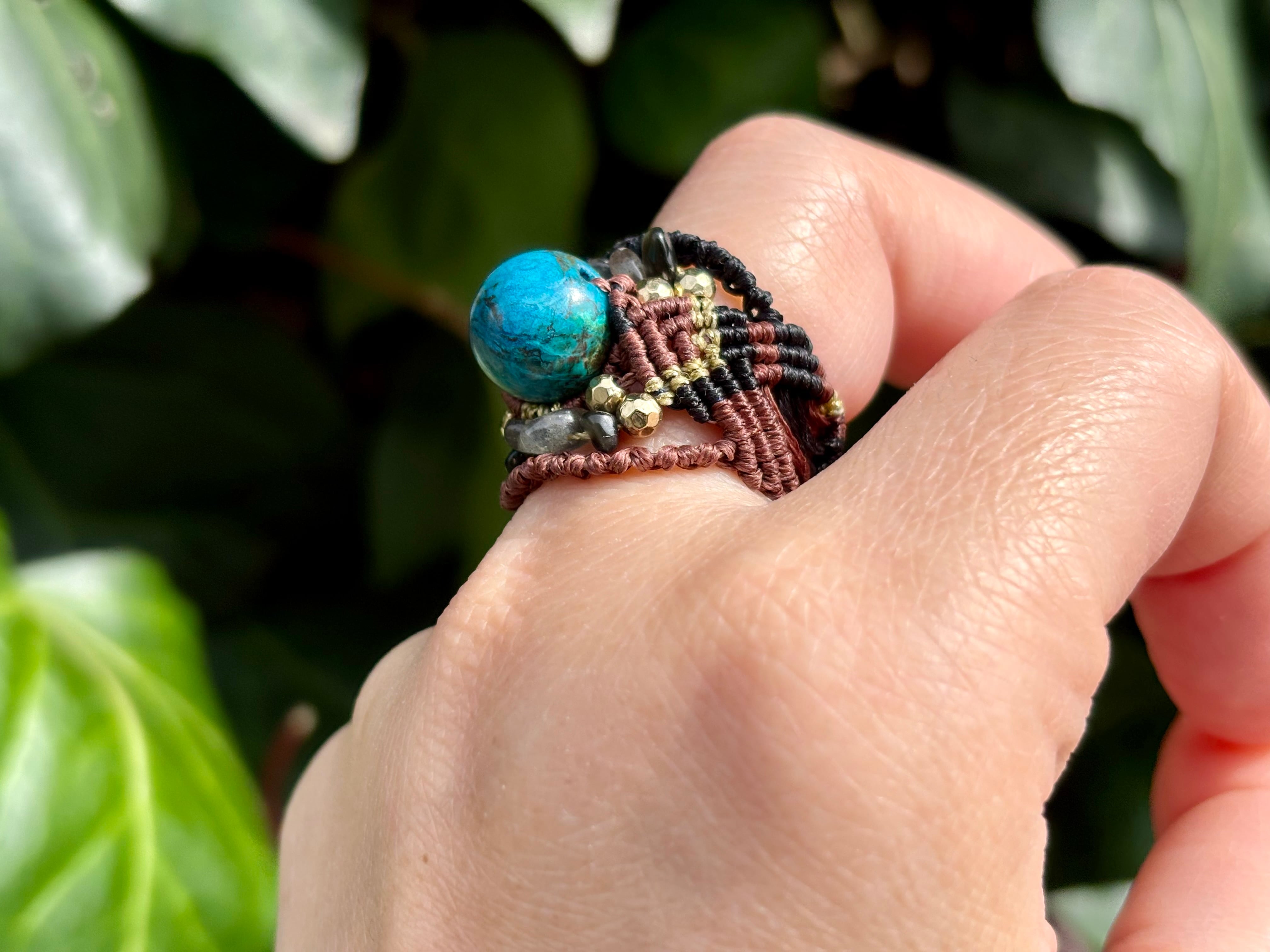 #1042高評価5Aクリソコラ一点物(クリソコラ×ラブラドライト×オニキス マクラメ編みリング/指輪)