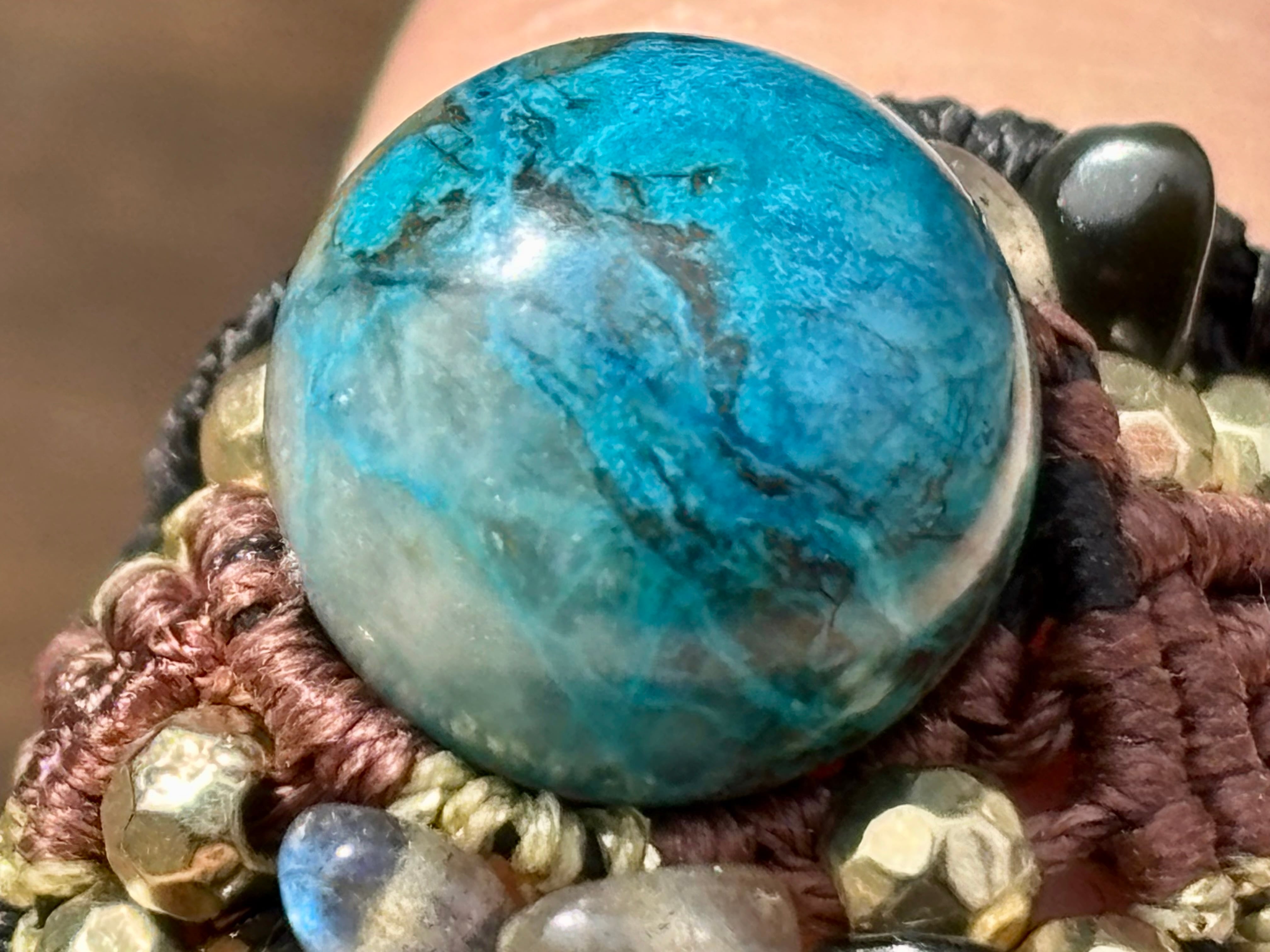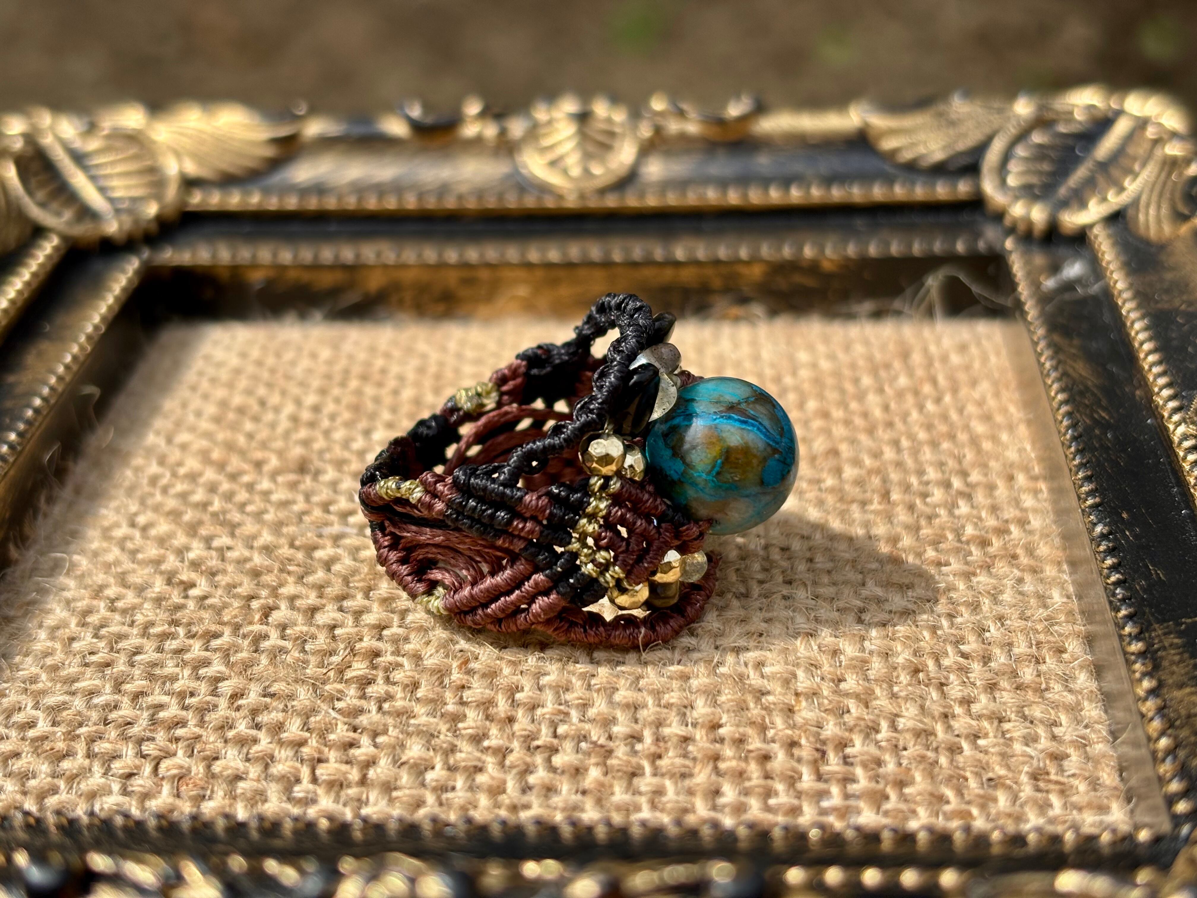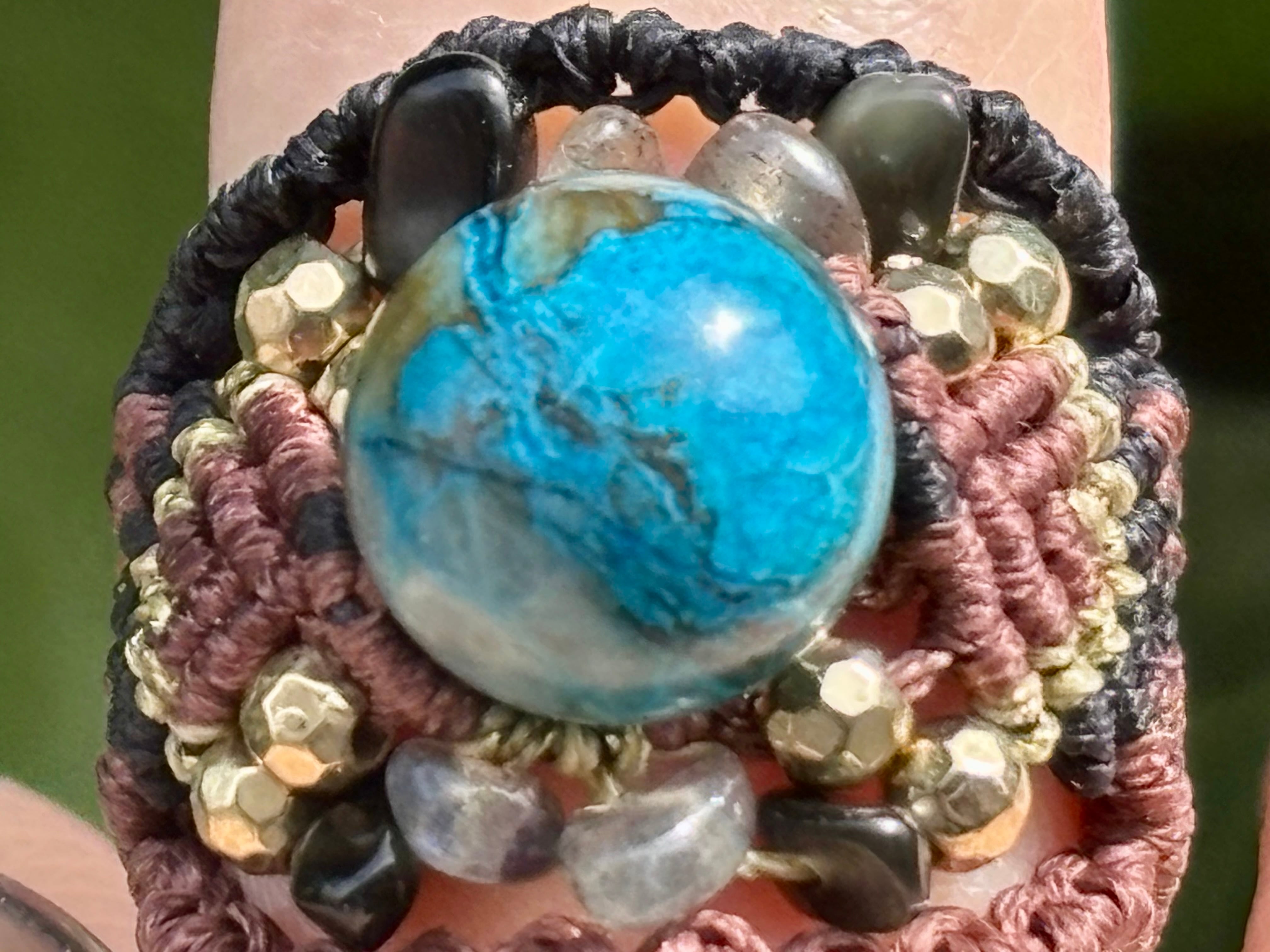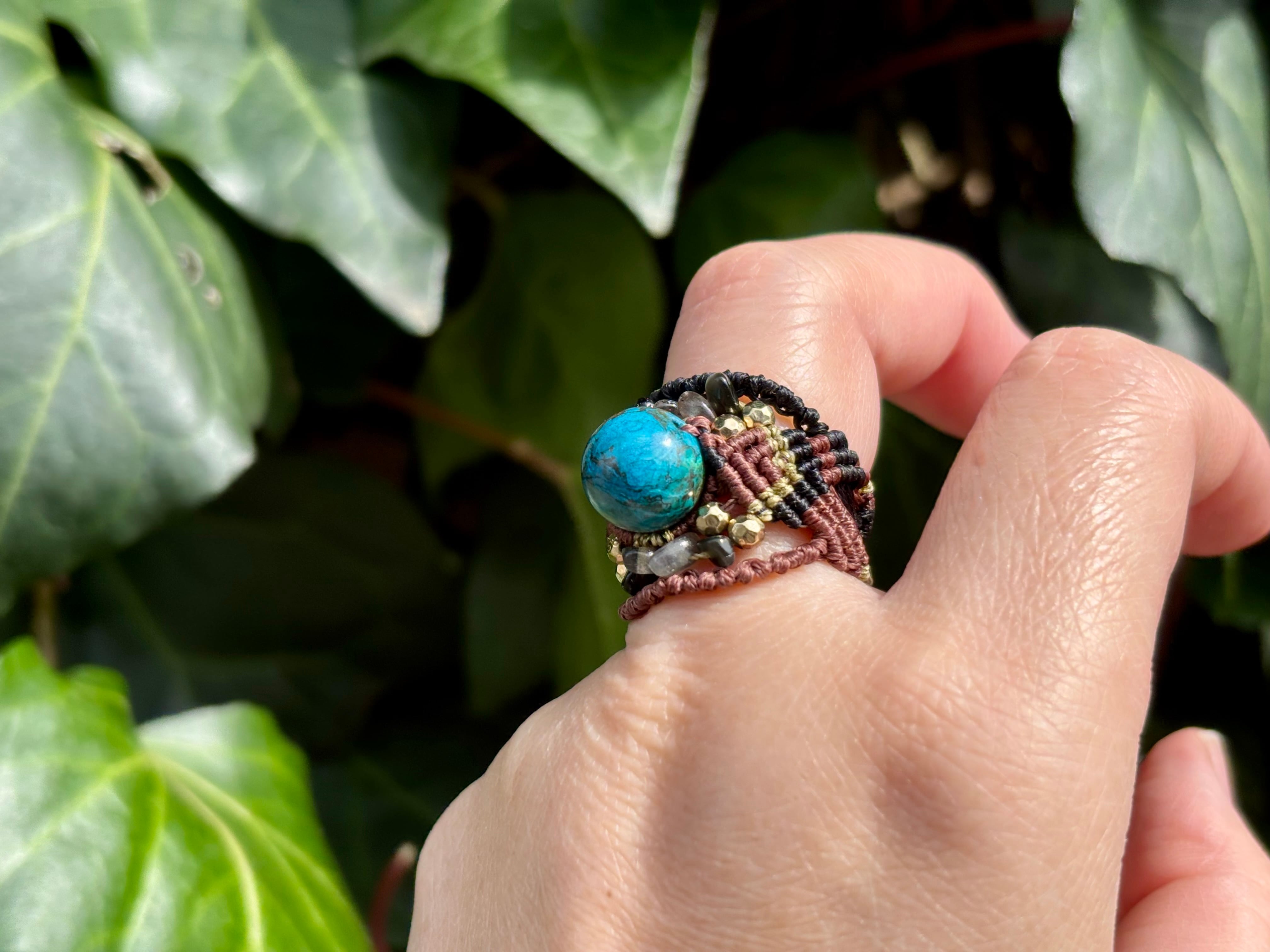 #1042高評価5Aクリソコラ一点物(クリソコラ×ラブラドライト×オニキス マクラメ編みリング/指輪)