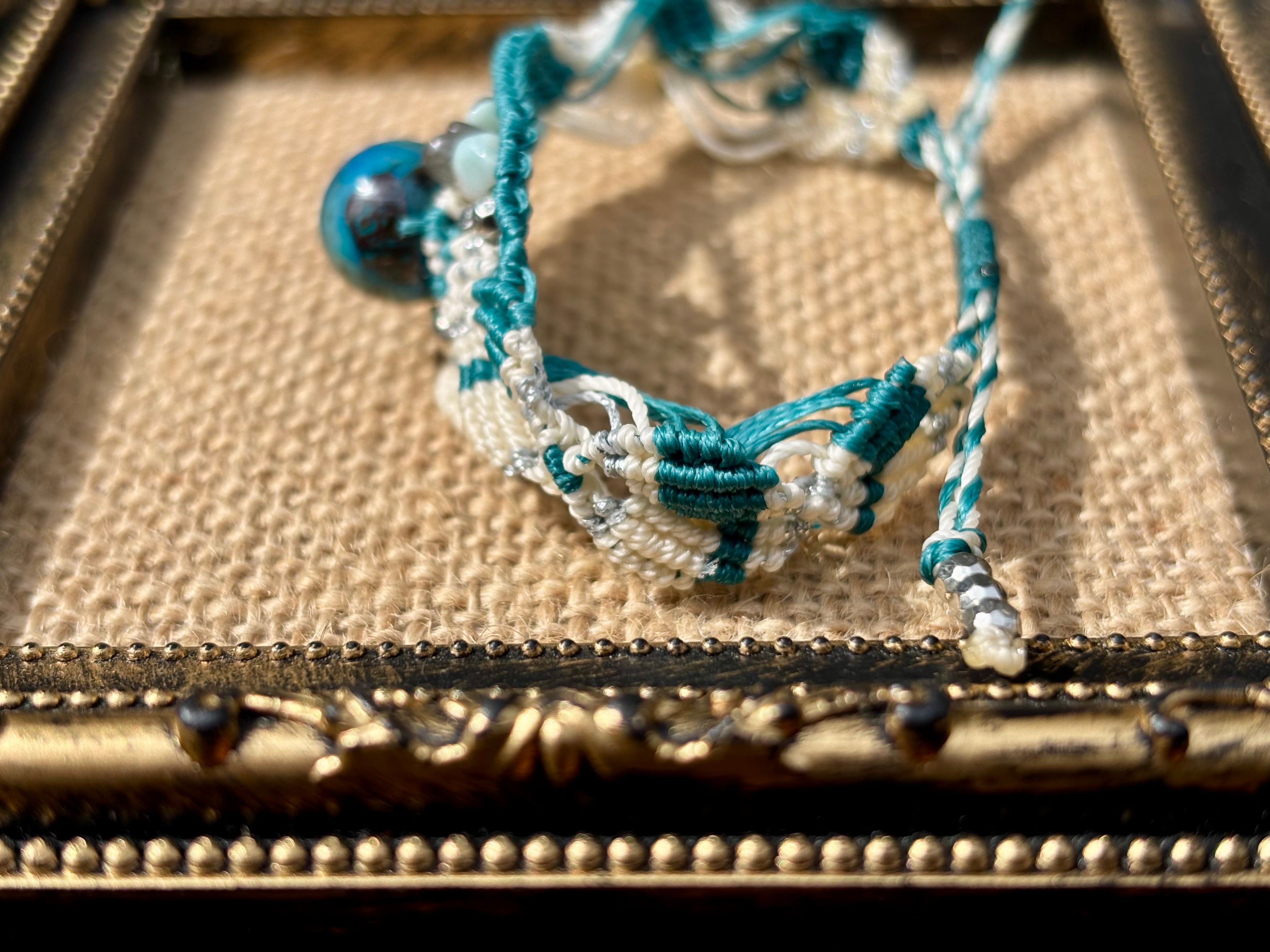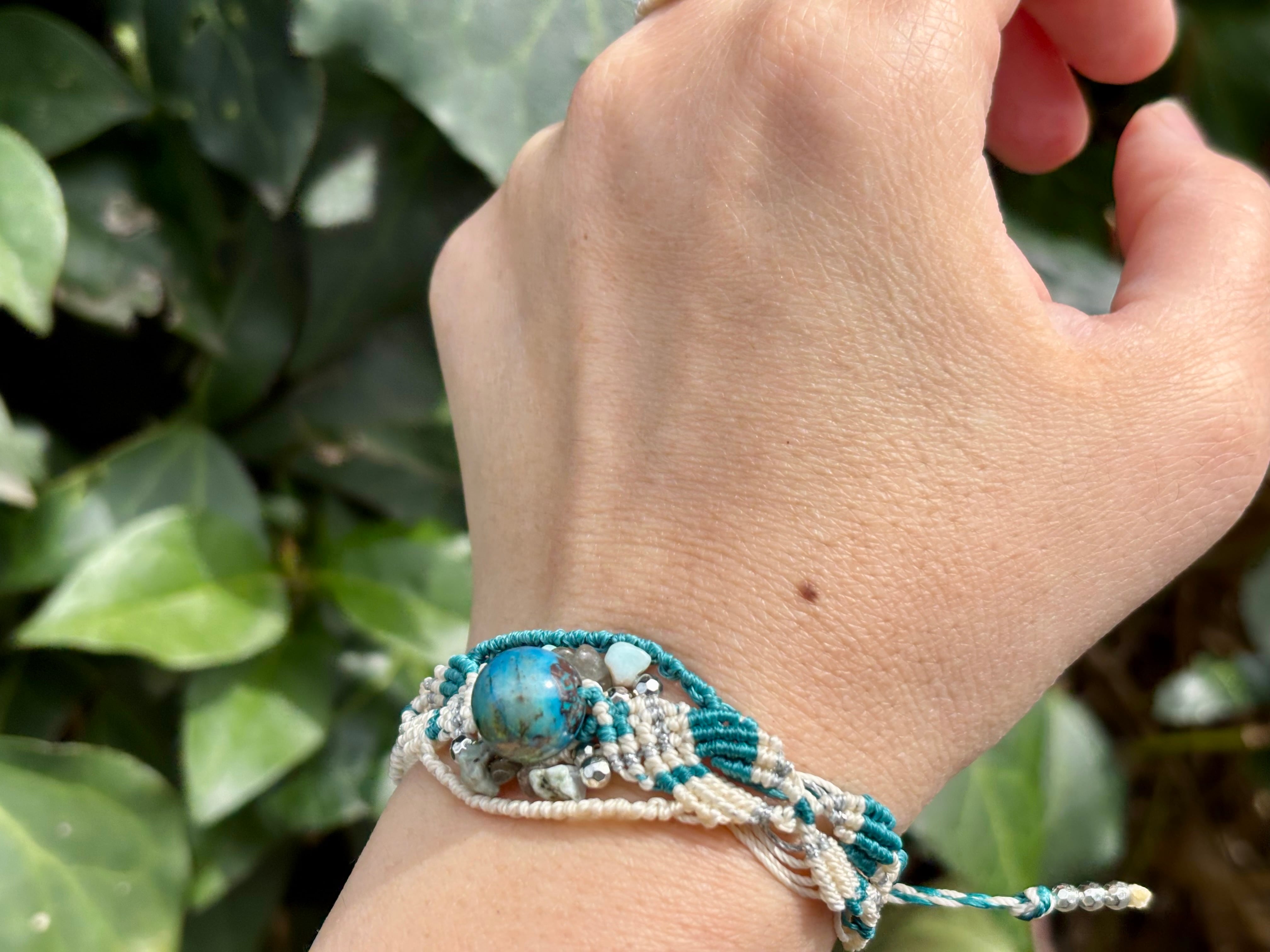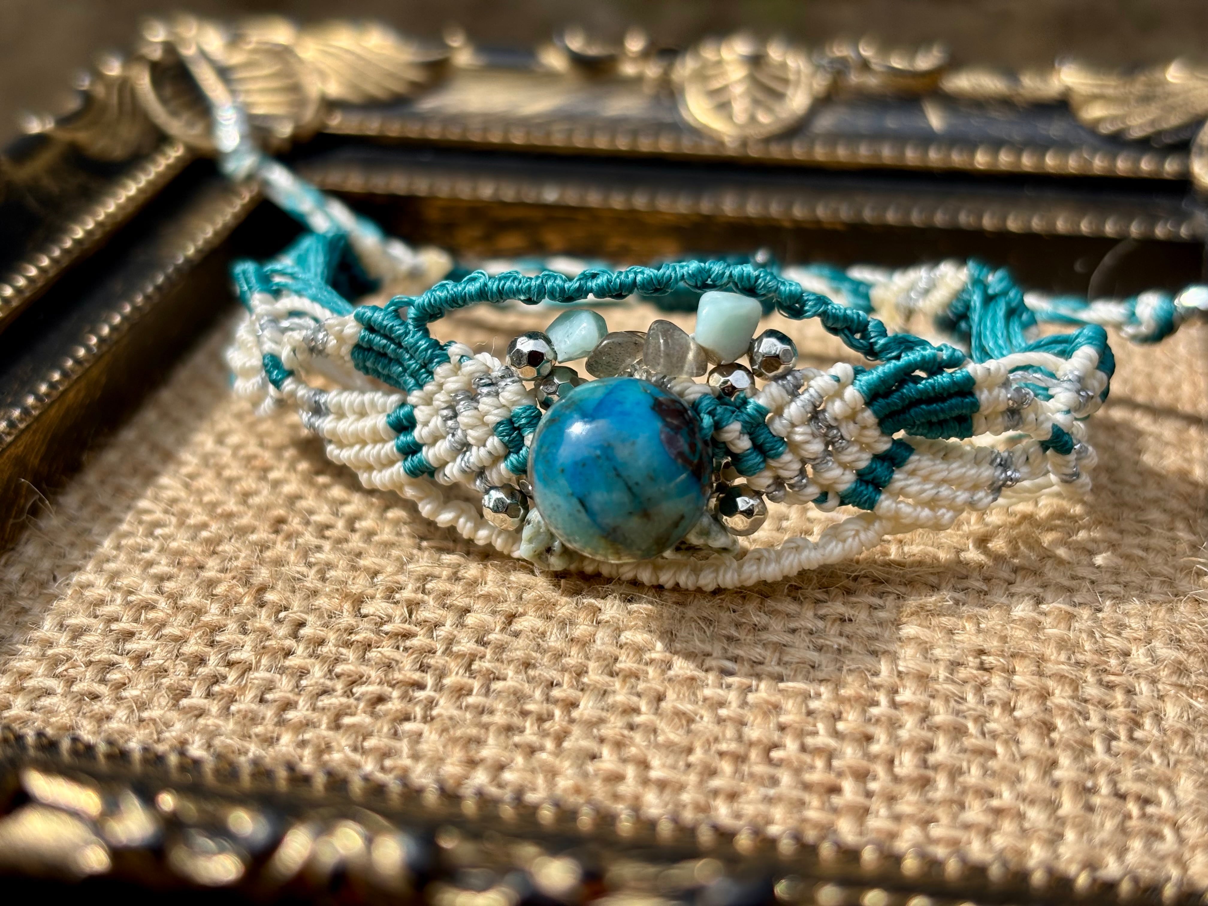 #1045高評価5Aクリソコラ一点物(クリソコラ×ラブラドライト×ラリマー マクラメ編みブレスレット)