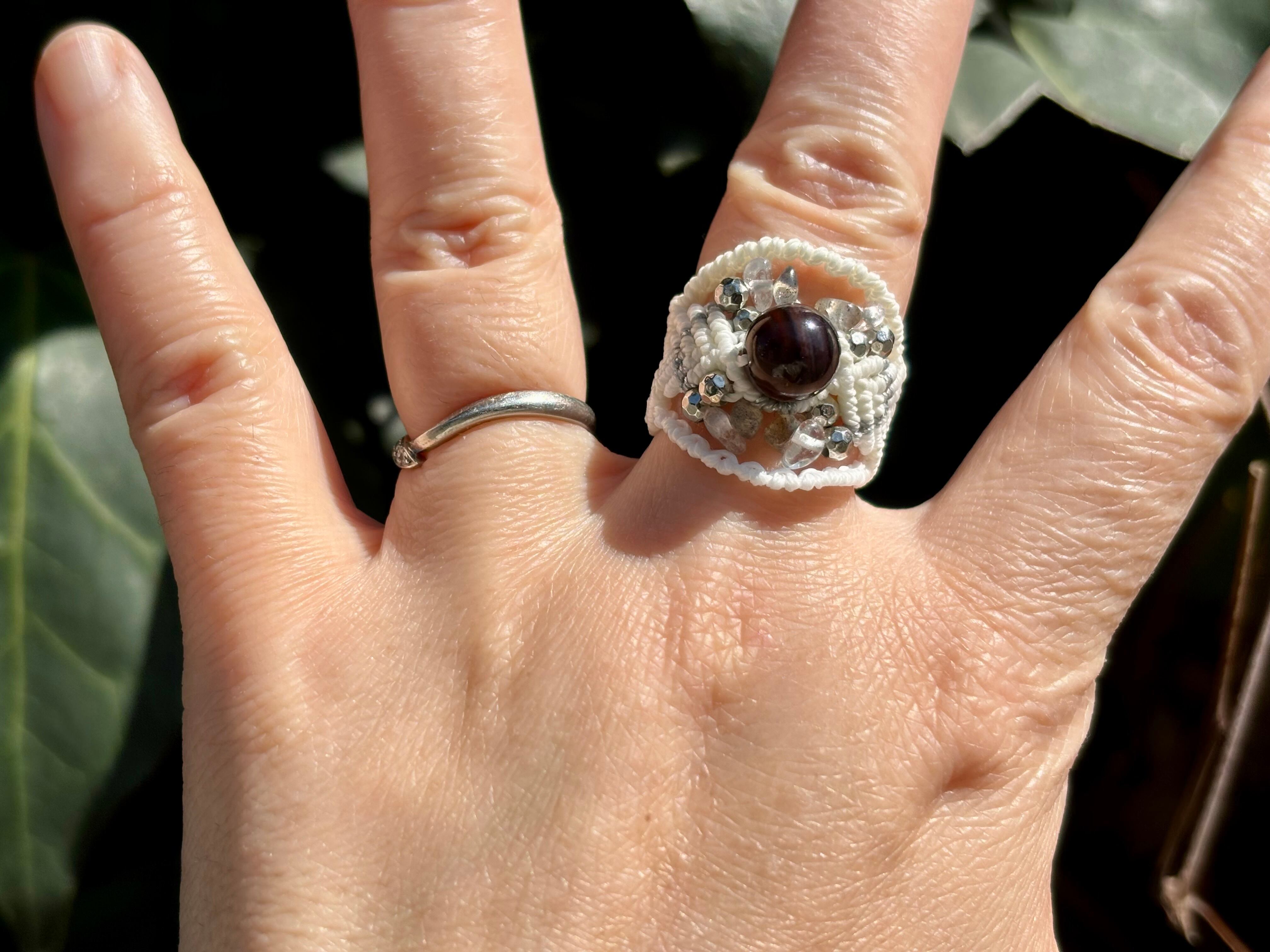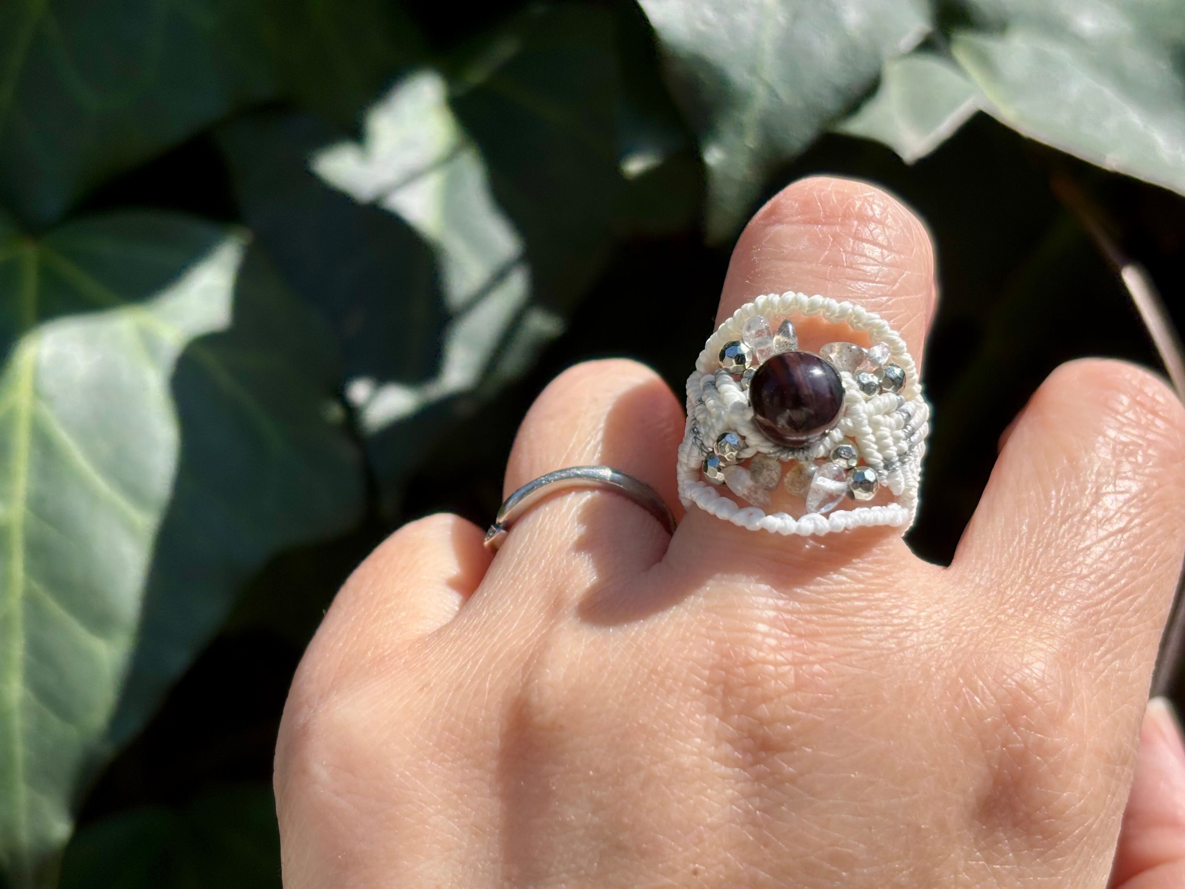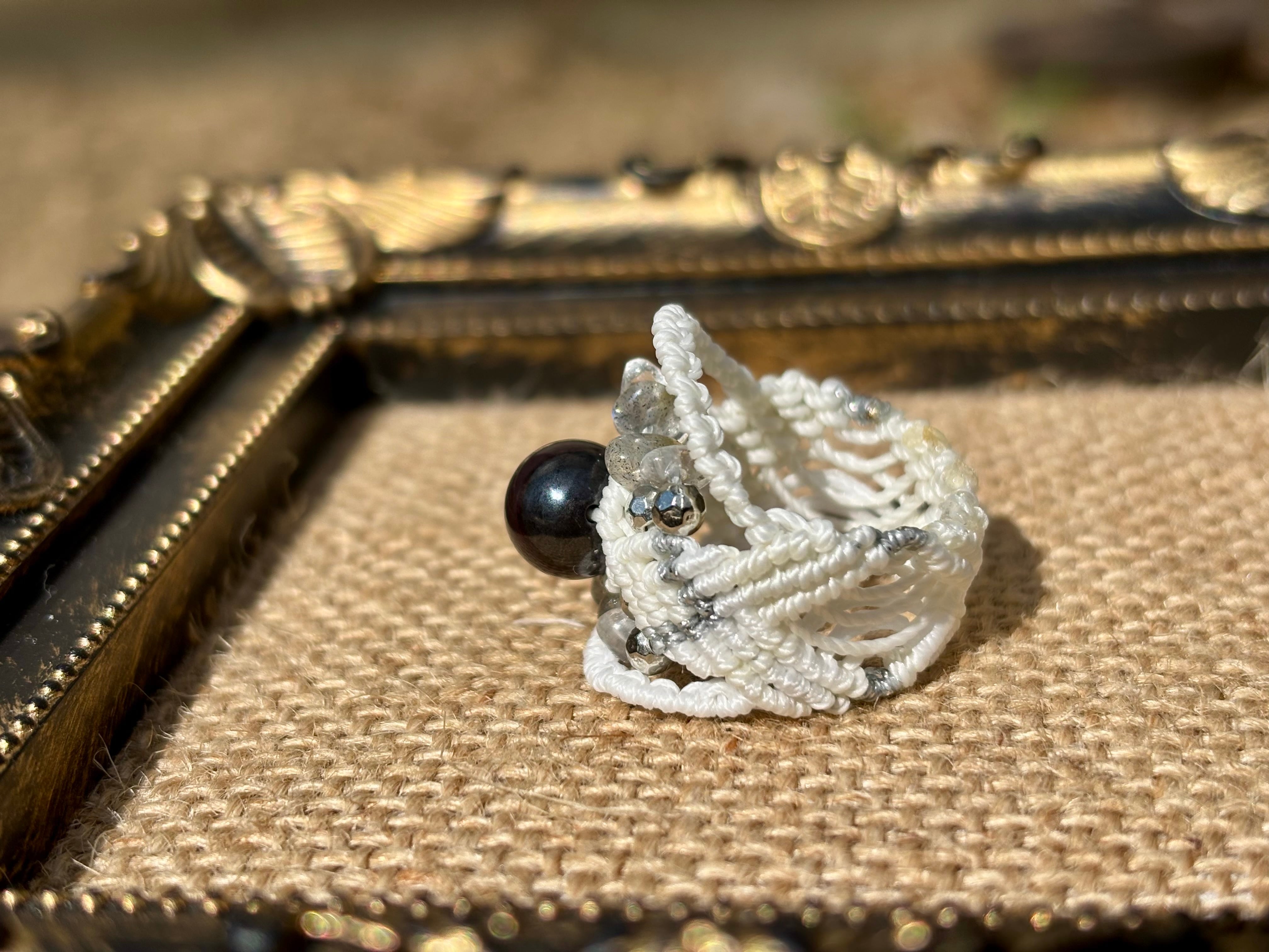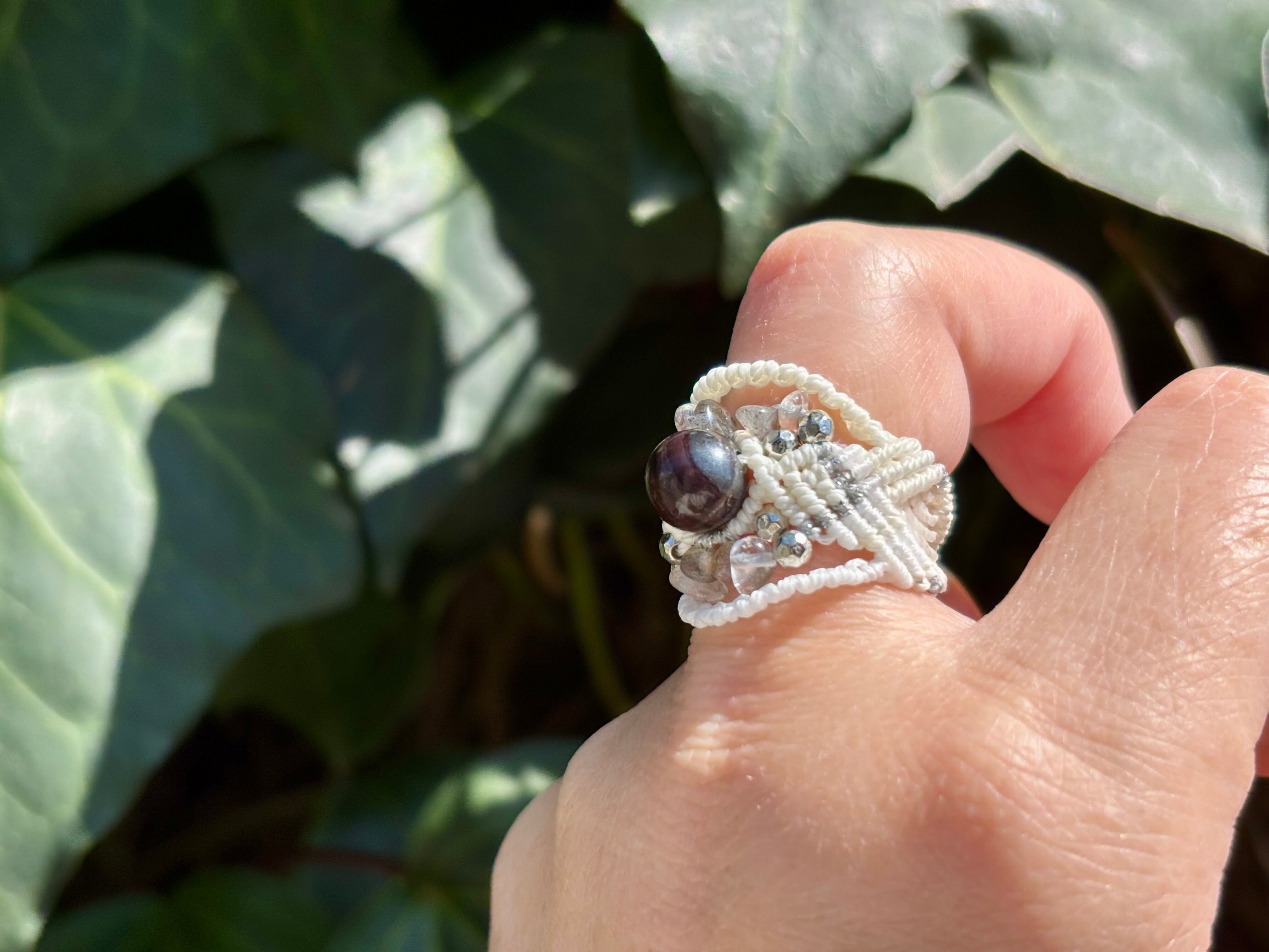 #1049ブラックスギライト一点物(ブラックスギライト×ラブラドライト×水晶 マクラメ編みリング/指輪)