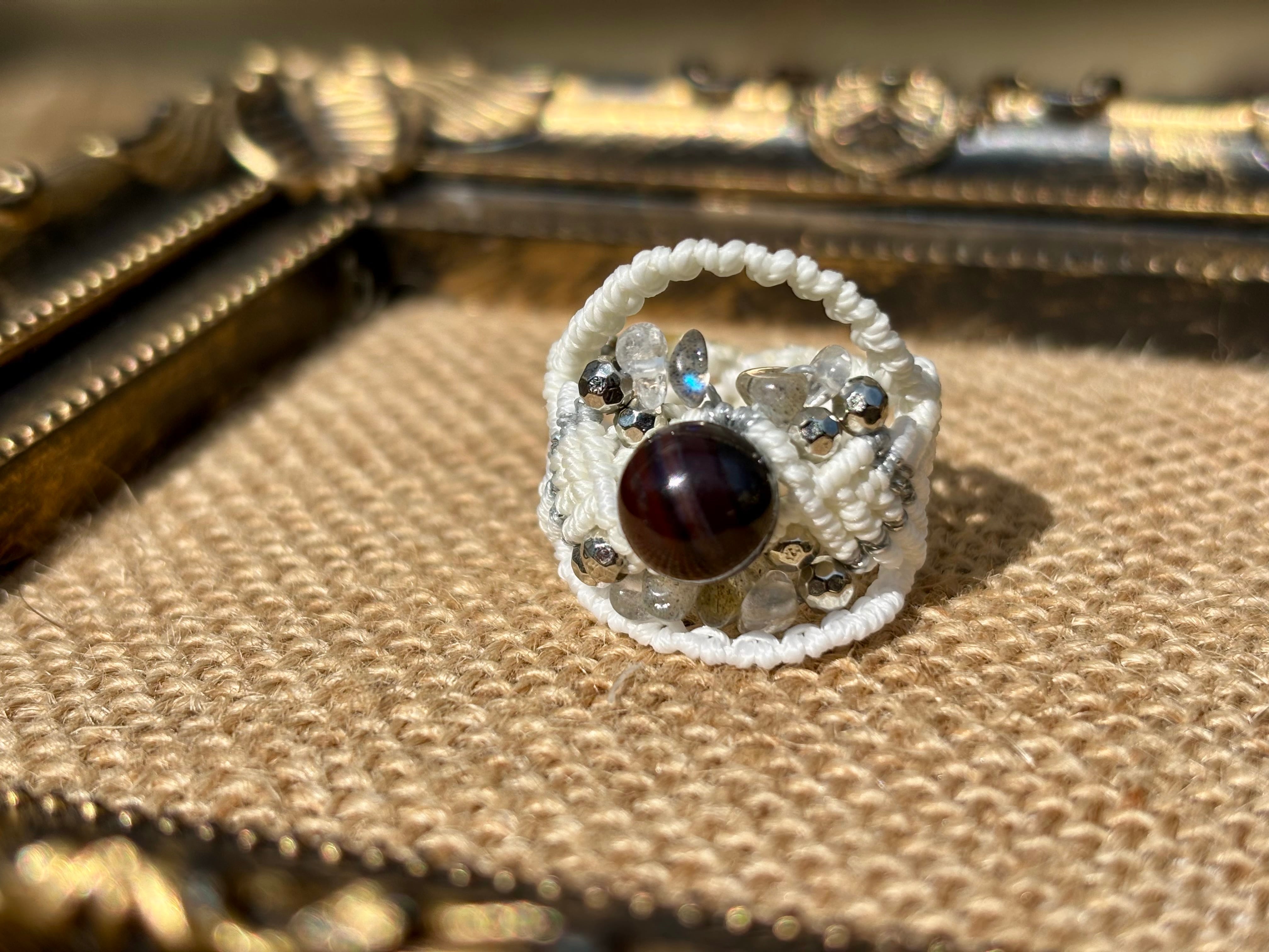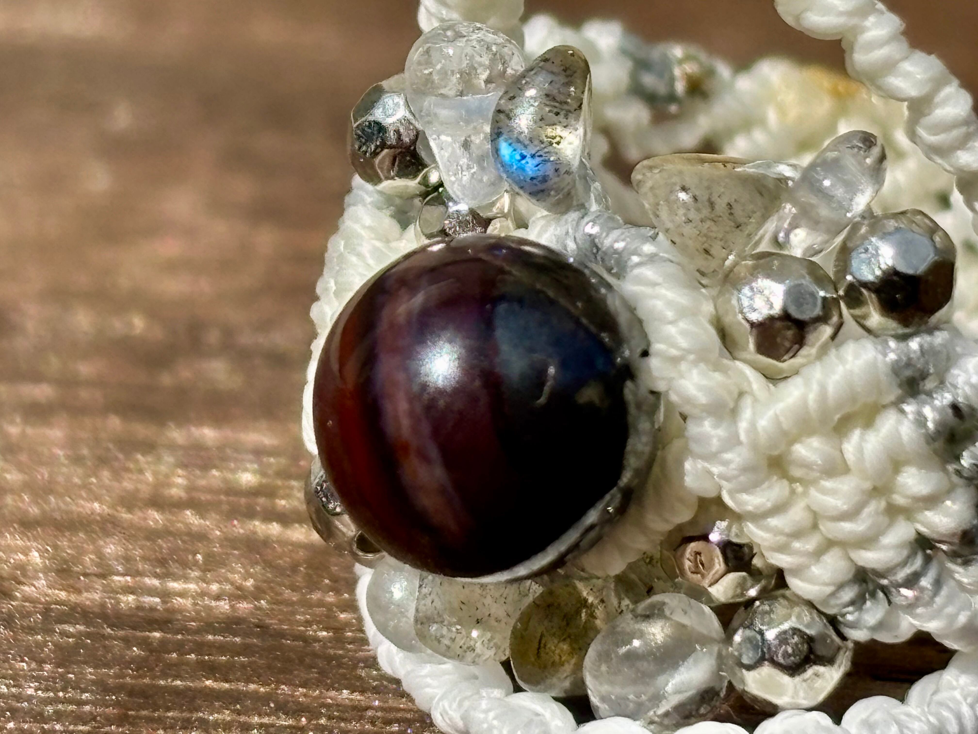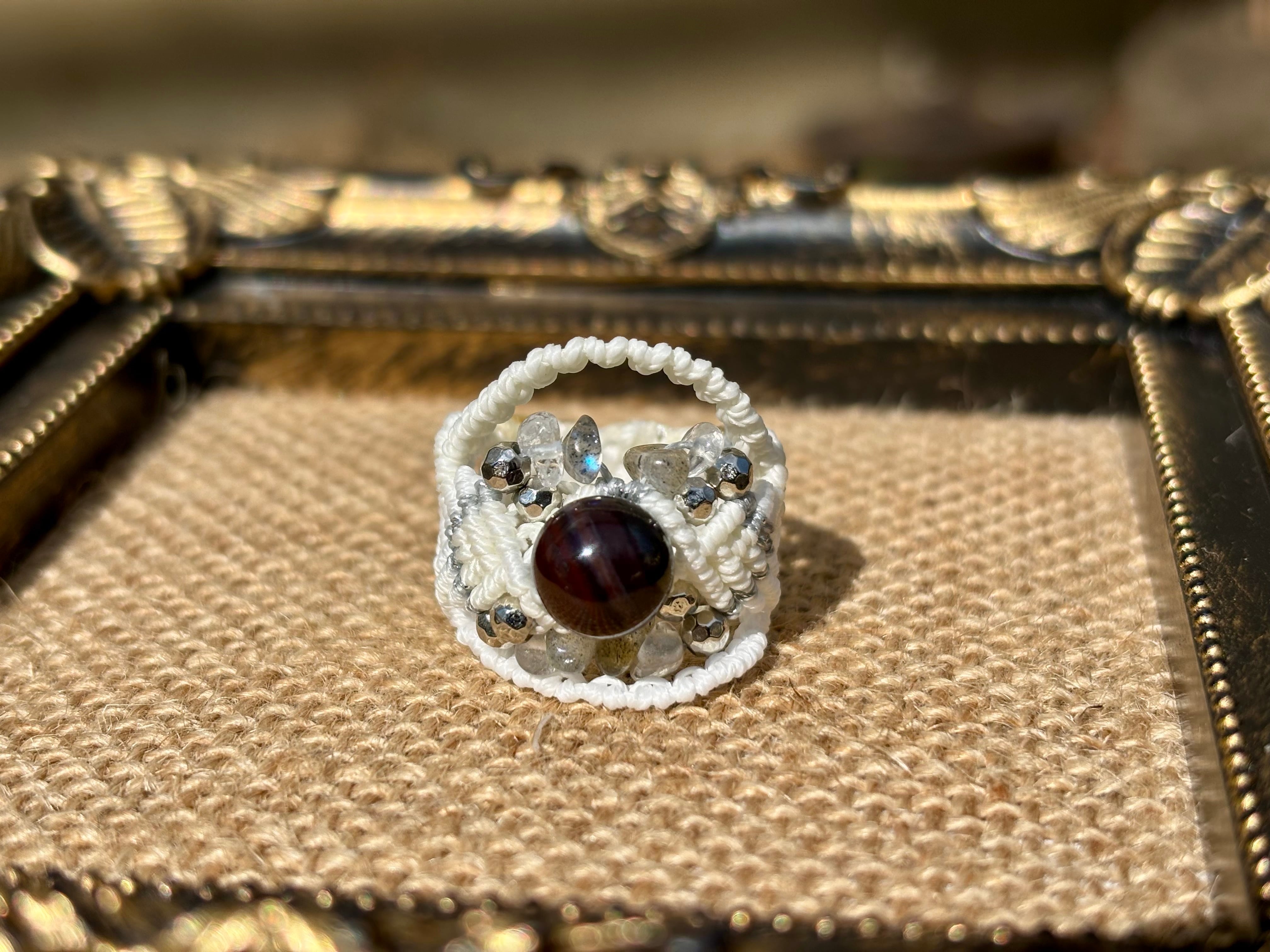 #1049ブラックスギライト一点物(ブラックスギライト×ラブラドライト×水晶 マクラメ編みリング/指輪)