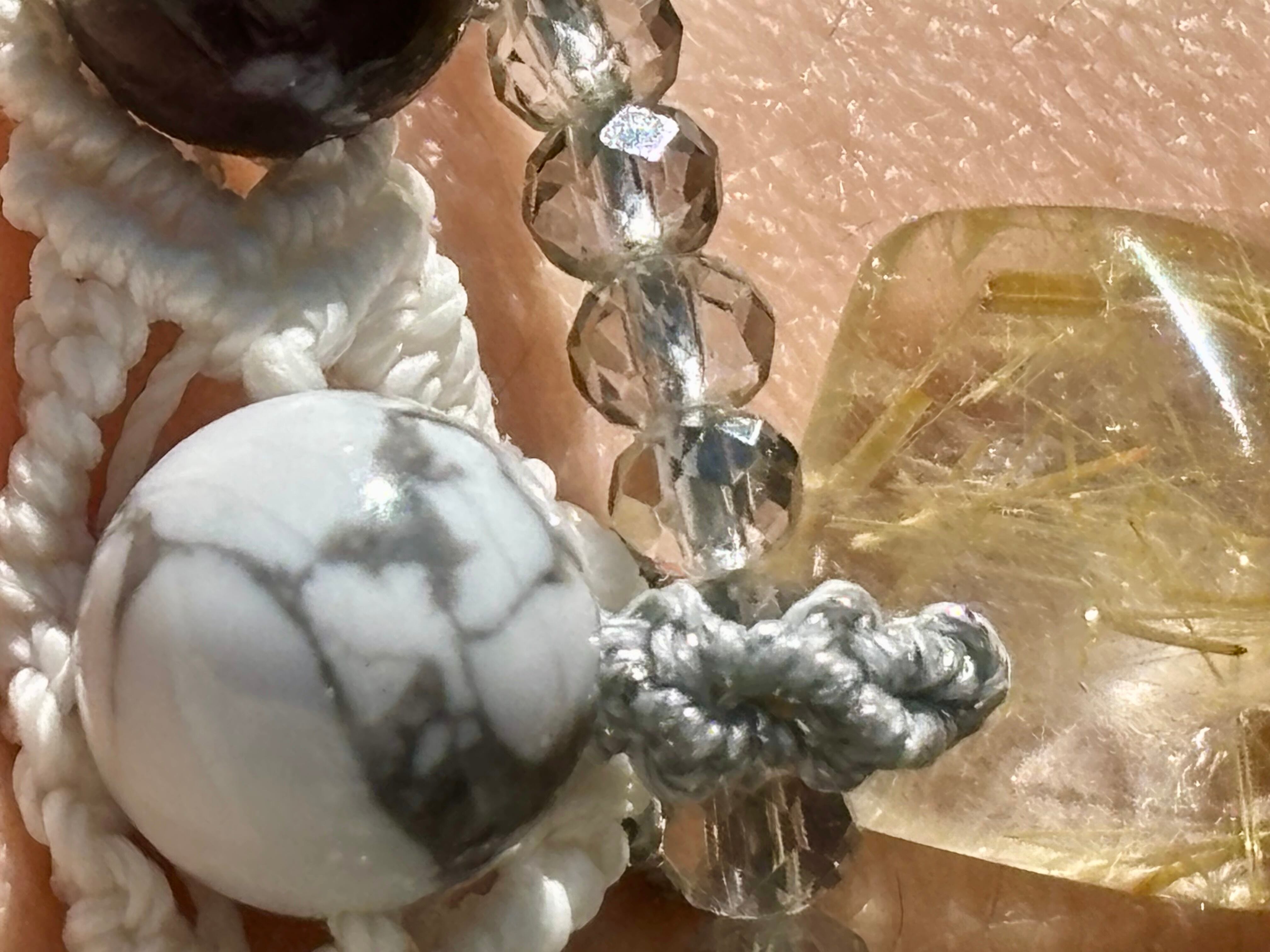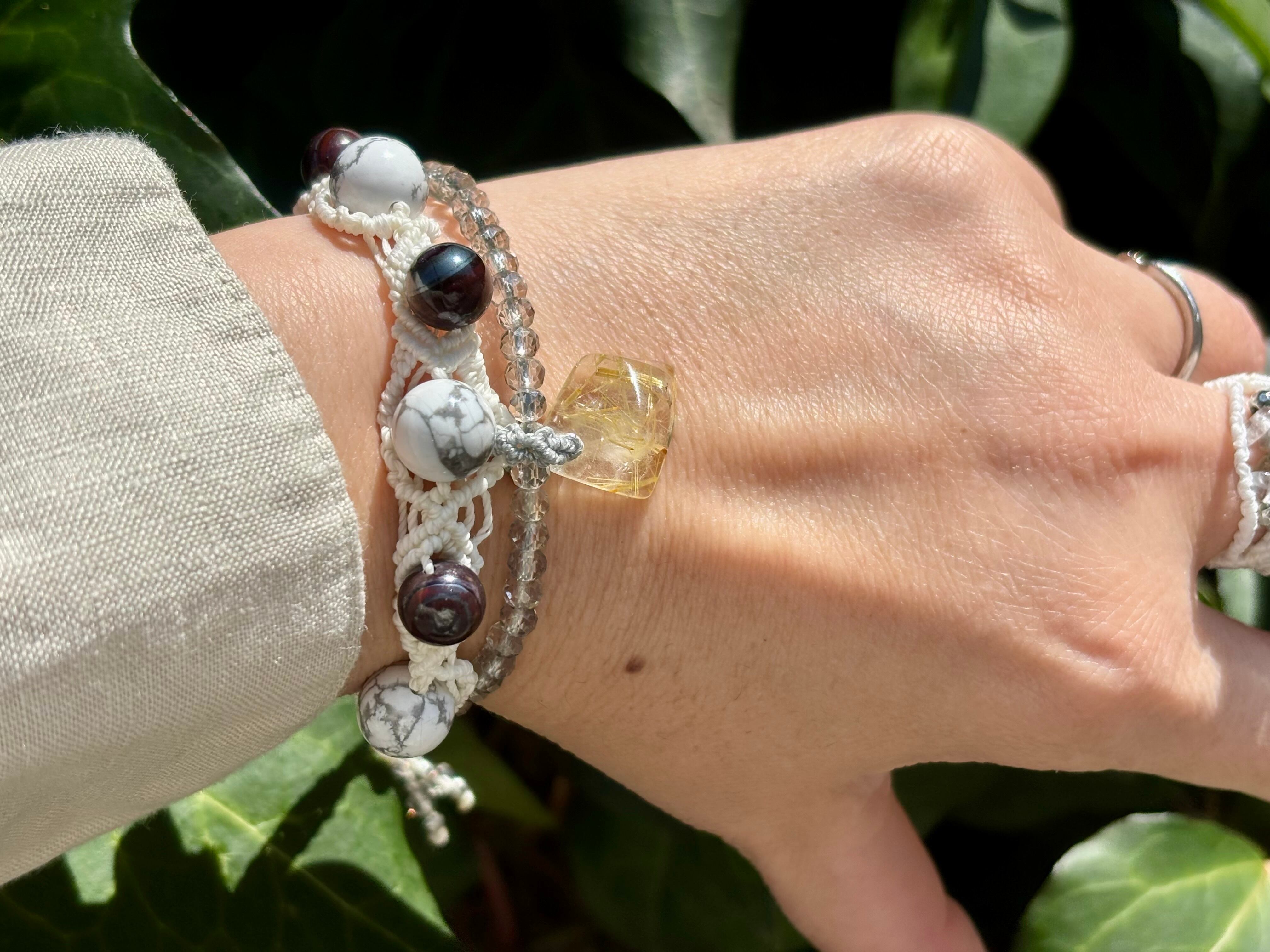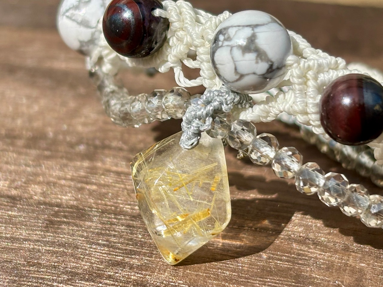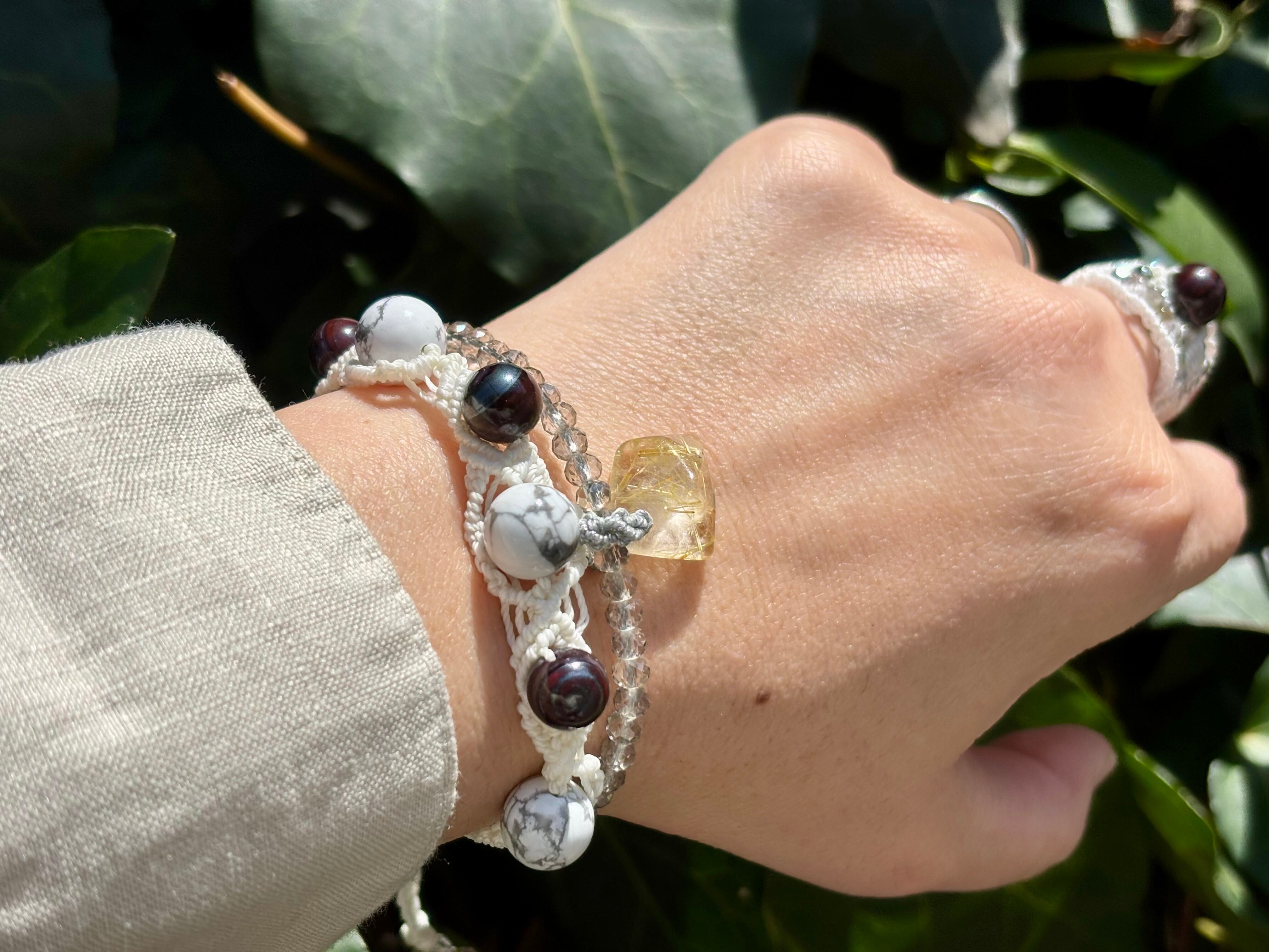 #1050ブラックスギライト一点物(ブラックスギライト×ルチルクォーツ×ハウライト マクラメ編みブレスレット)