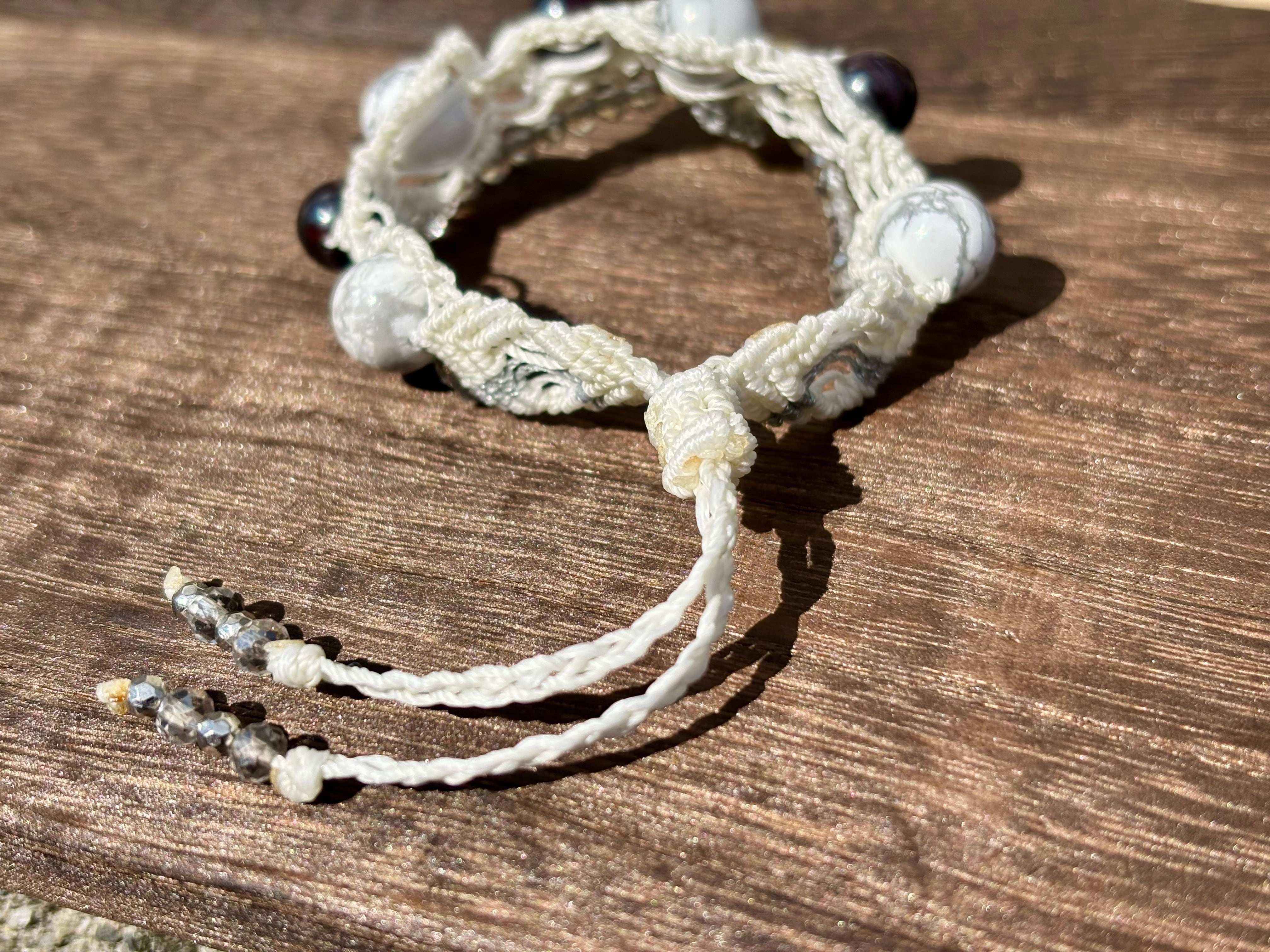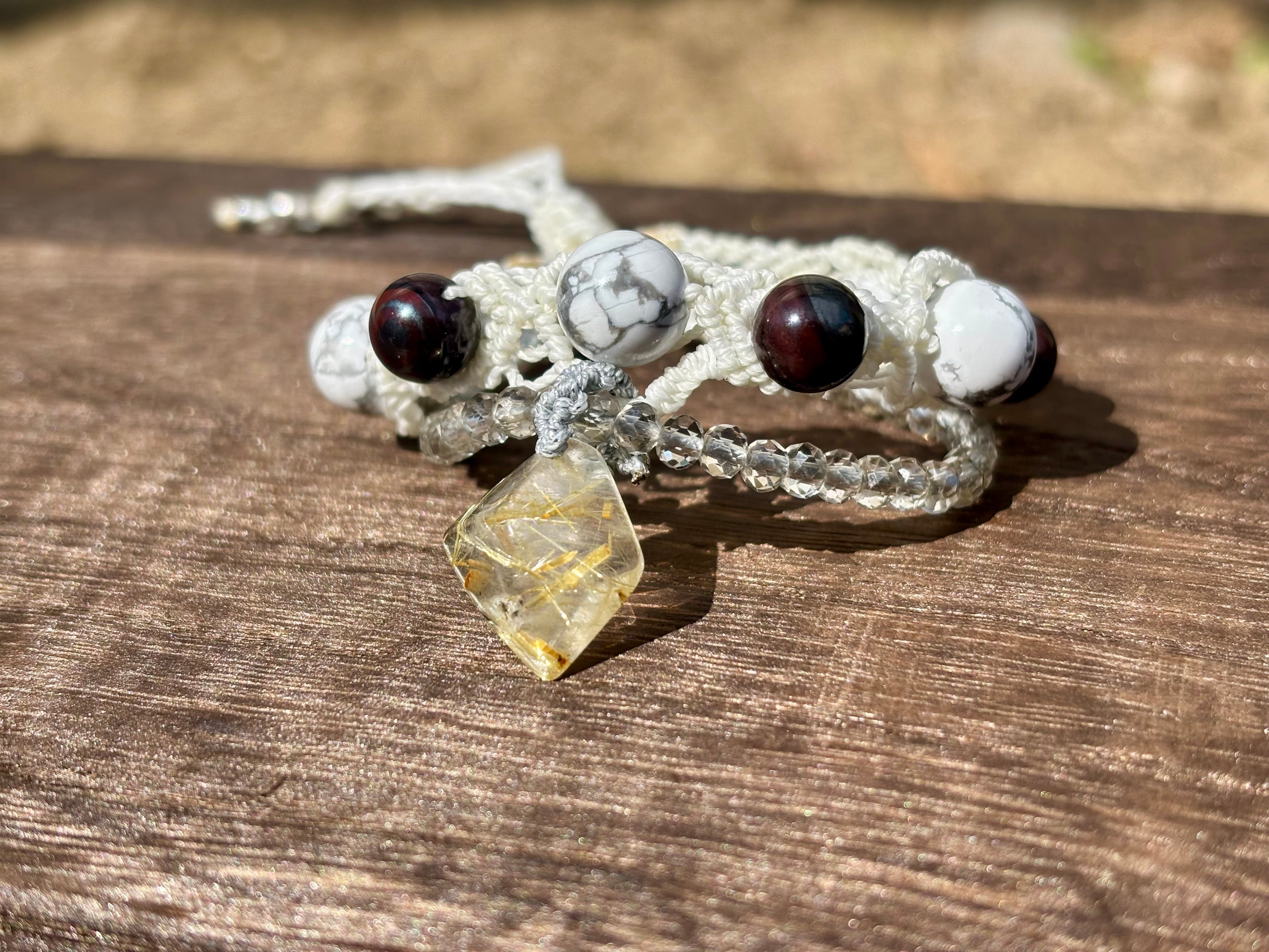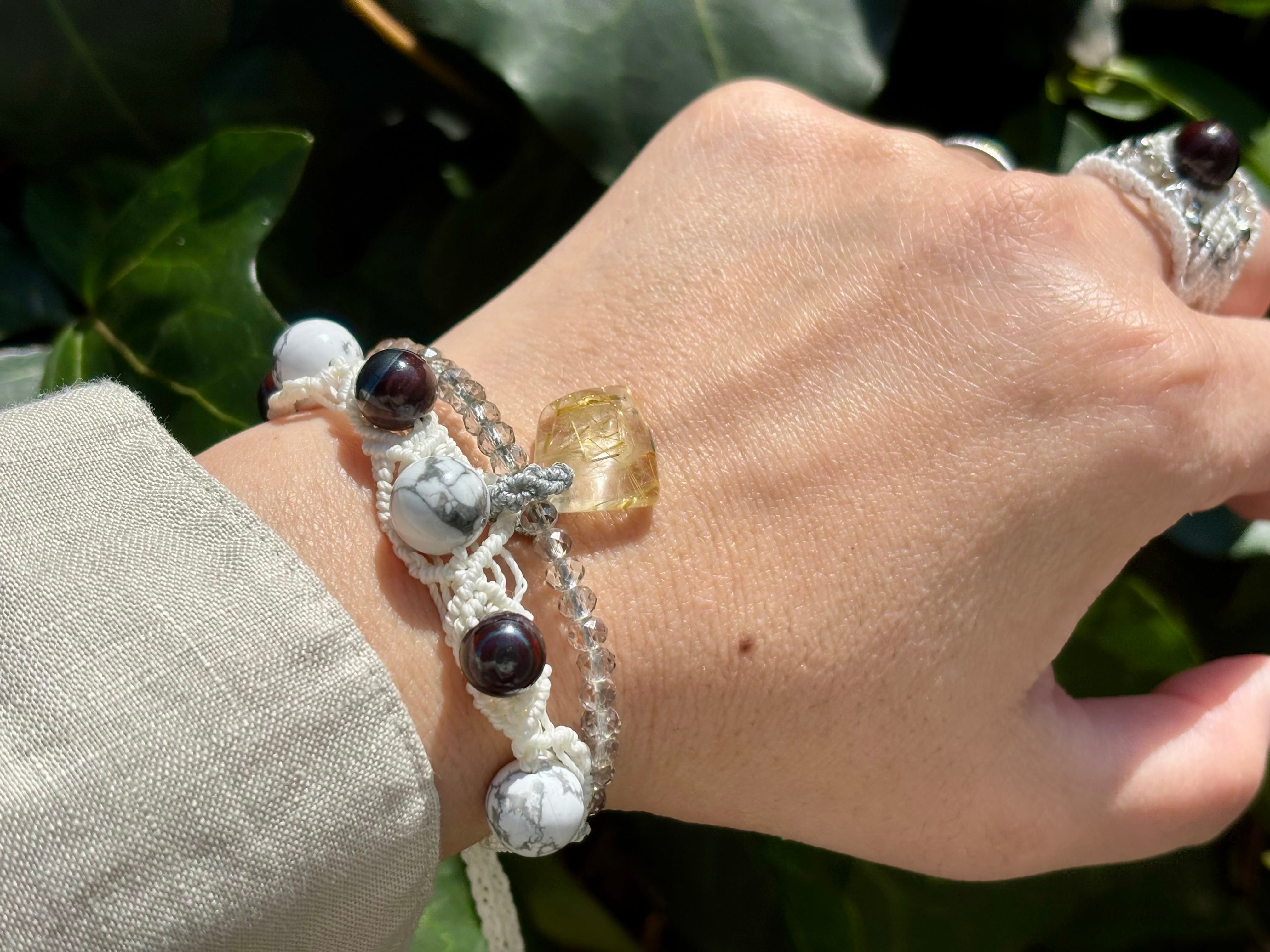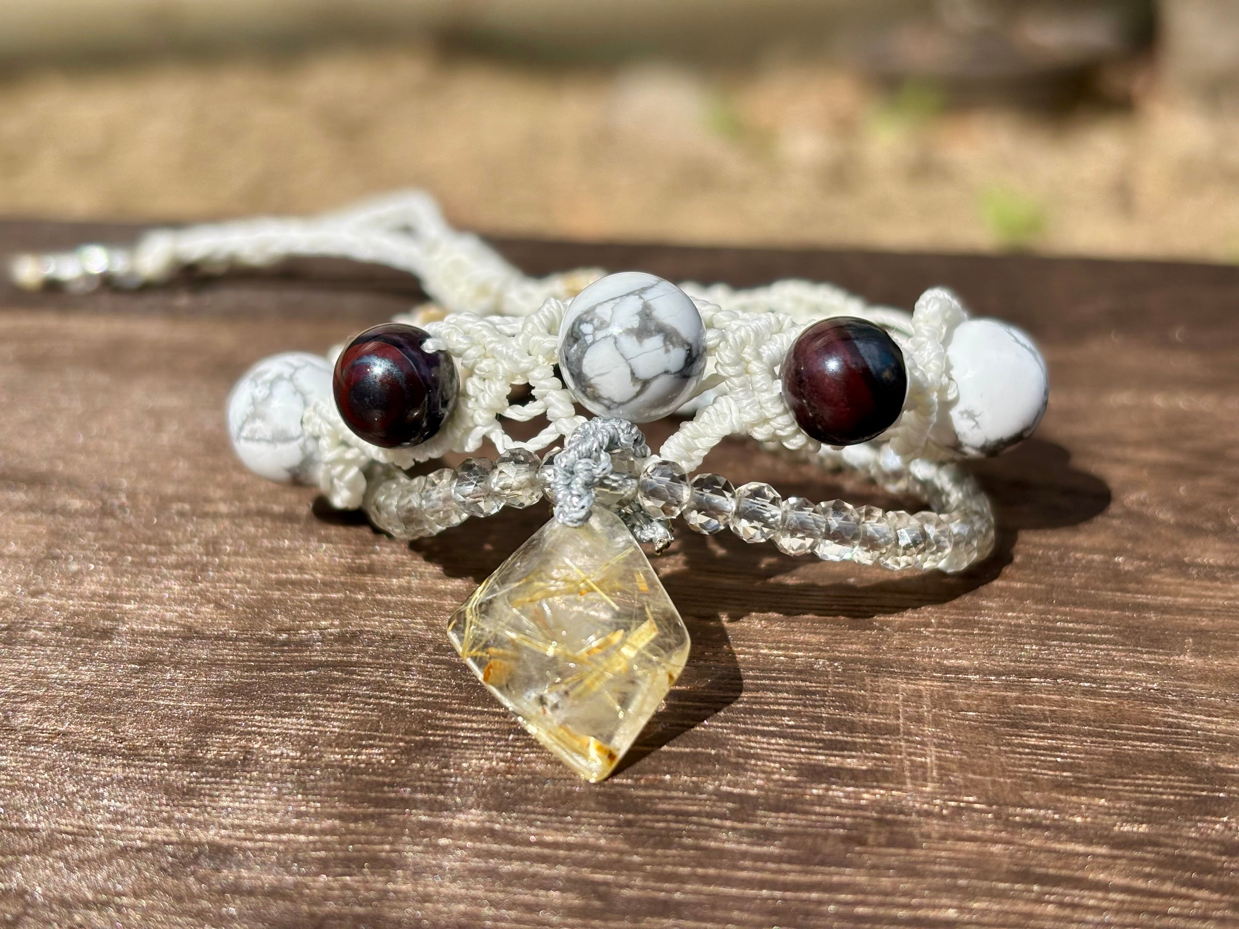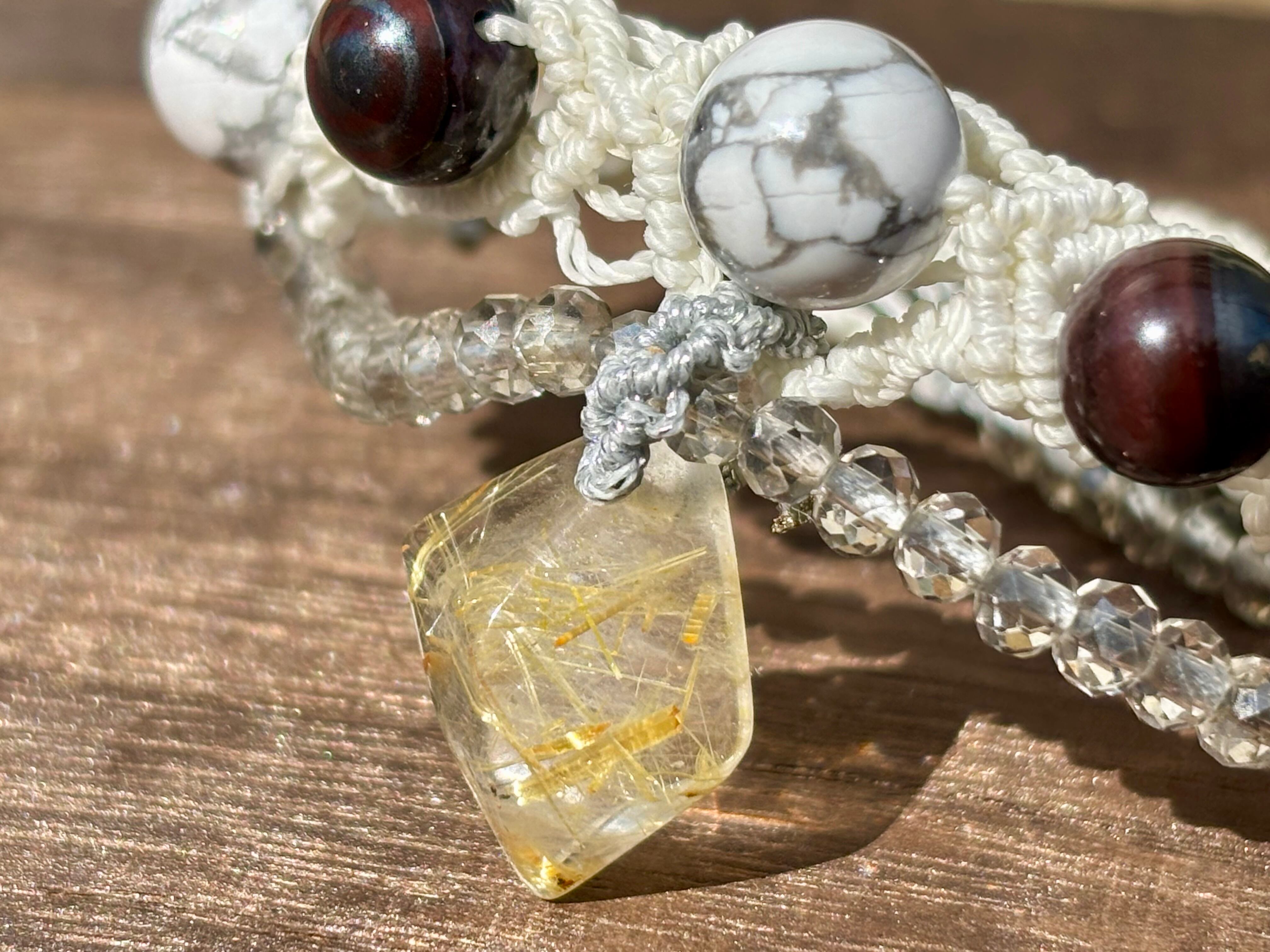 #1050ブラックスギライト一点物(ブラックスギライト×ルチルクォーツ×ハウライト マクラメ編みブレスレット)