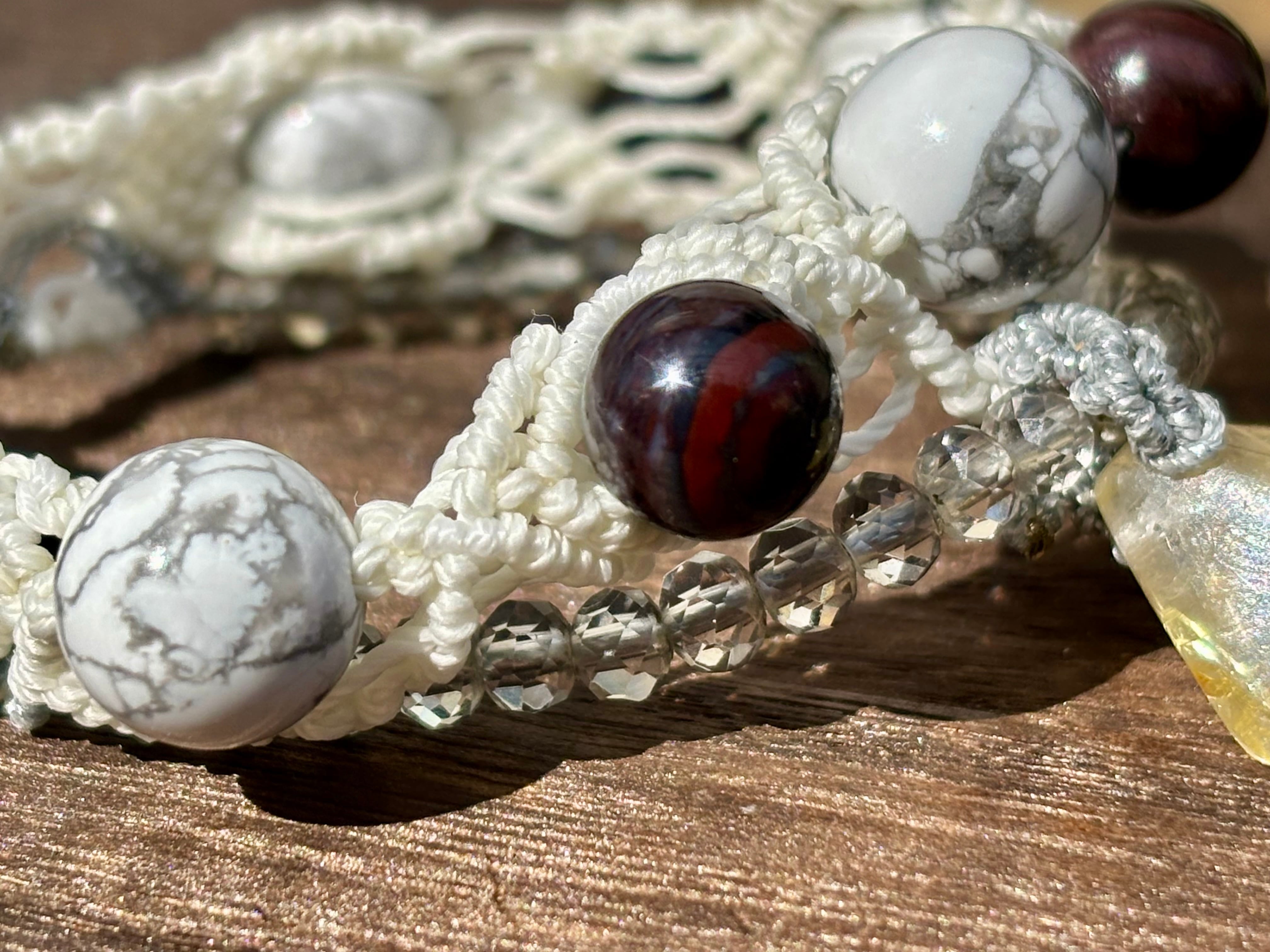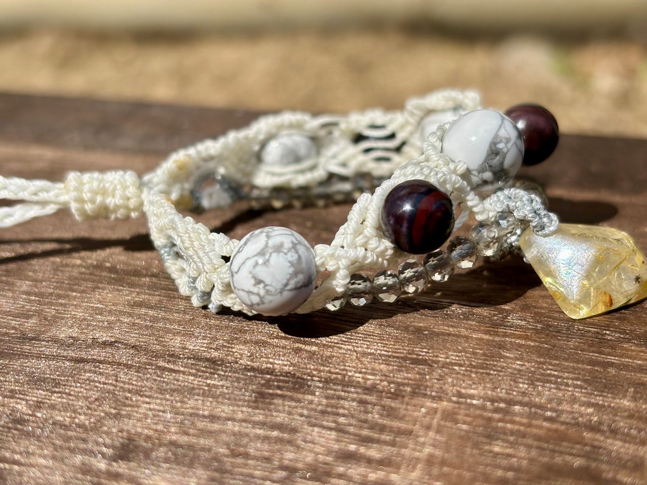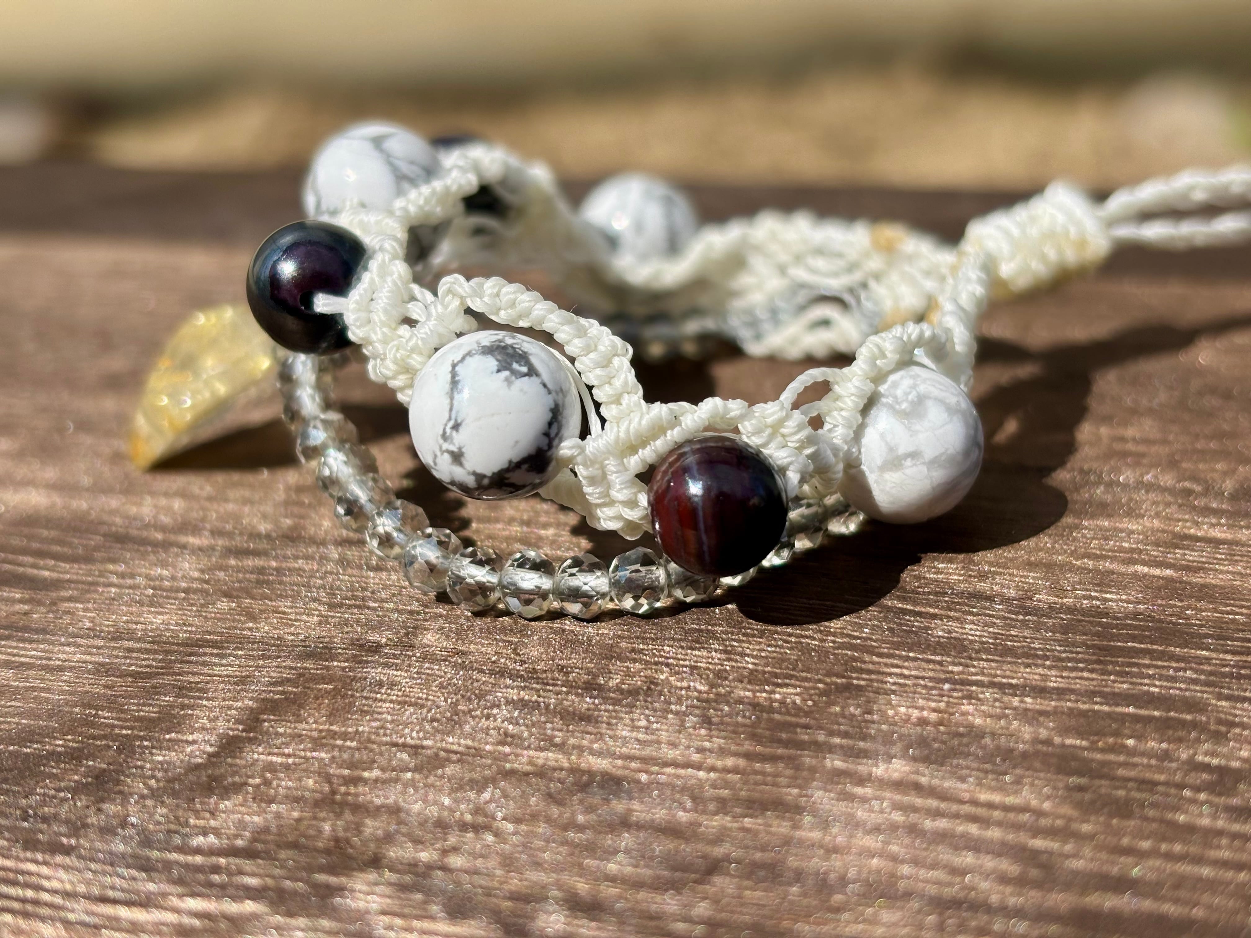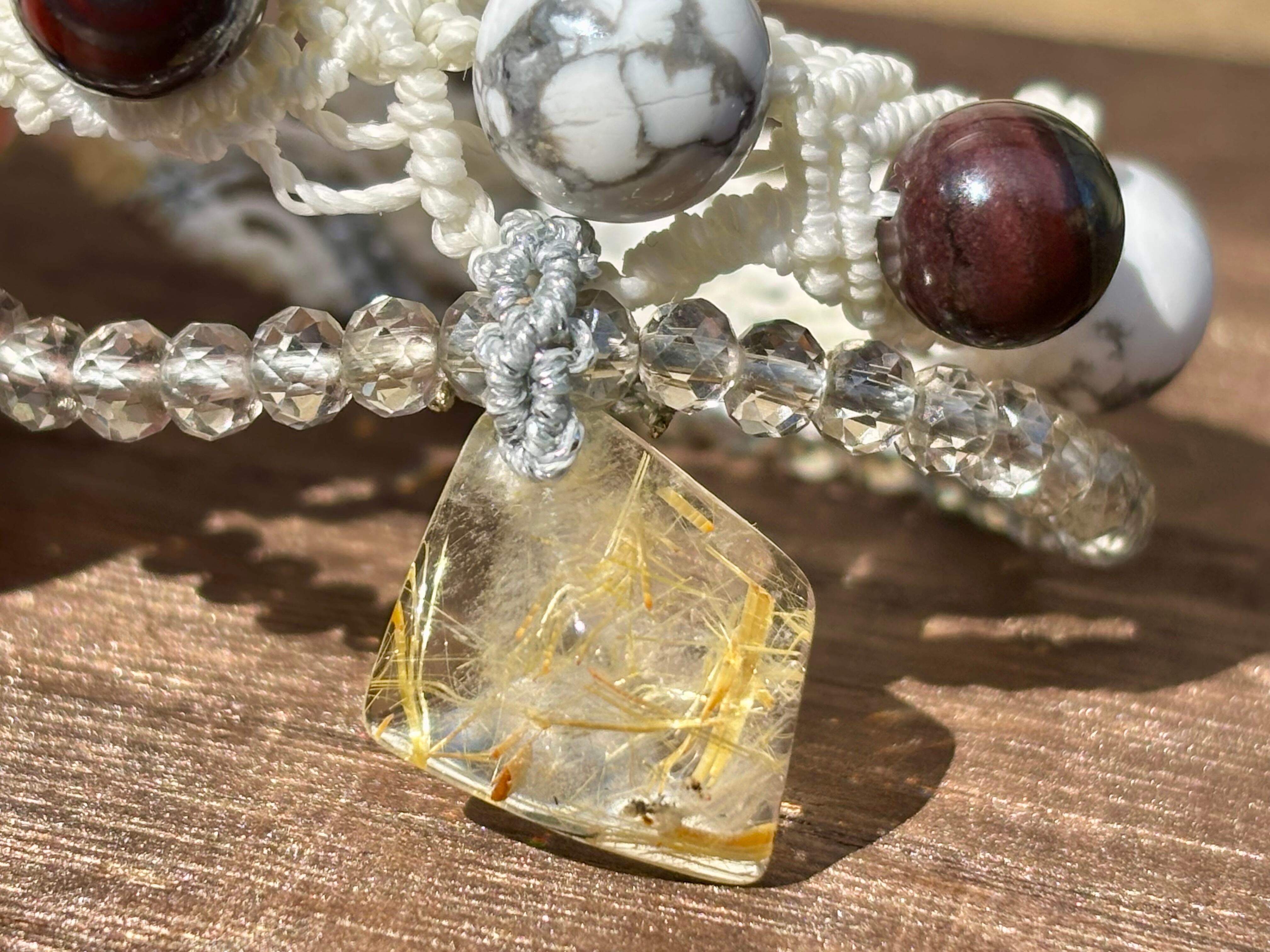 #1050ブラックスギライト一点物(ブラックスギライト×ルチルクォーツ×ハウライト マクラメ編みブレスレット)