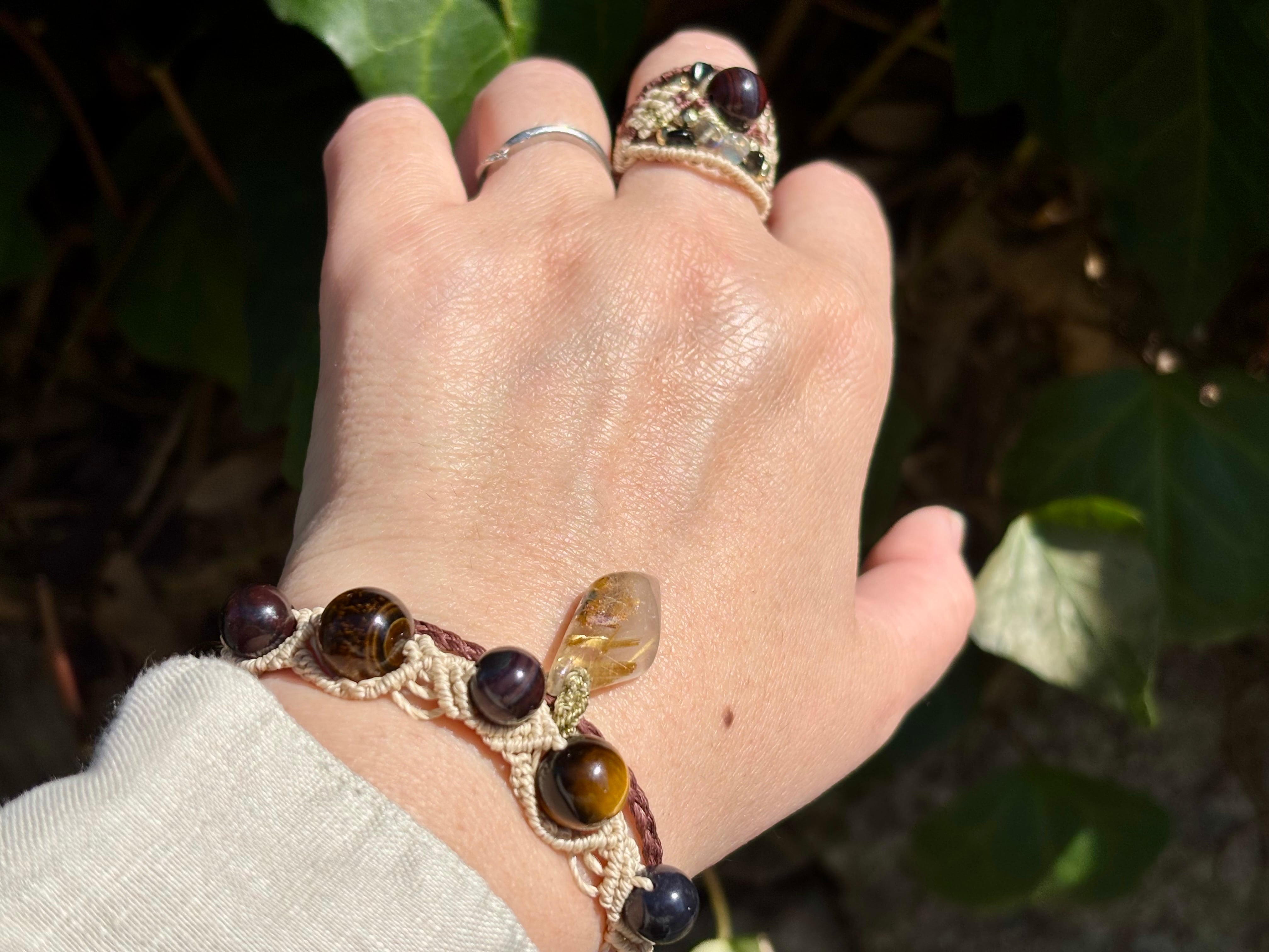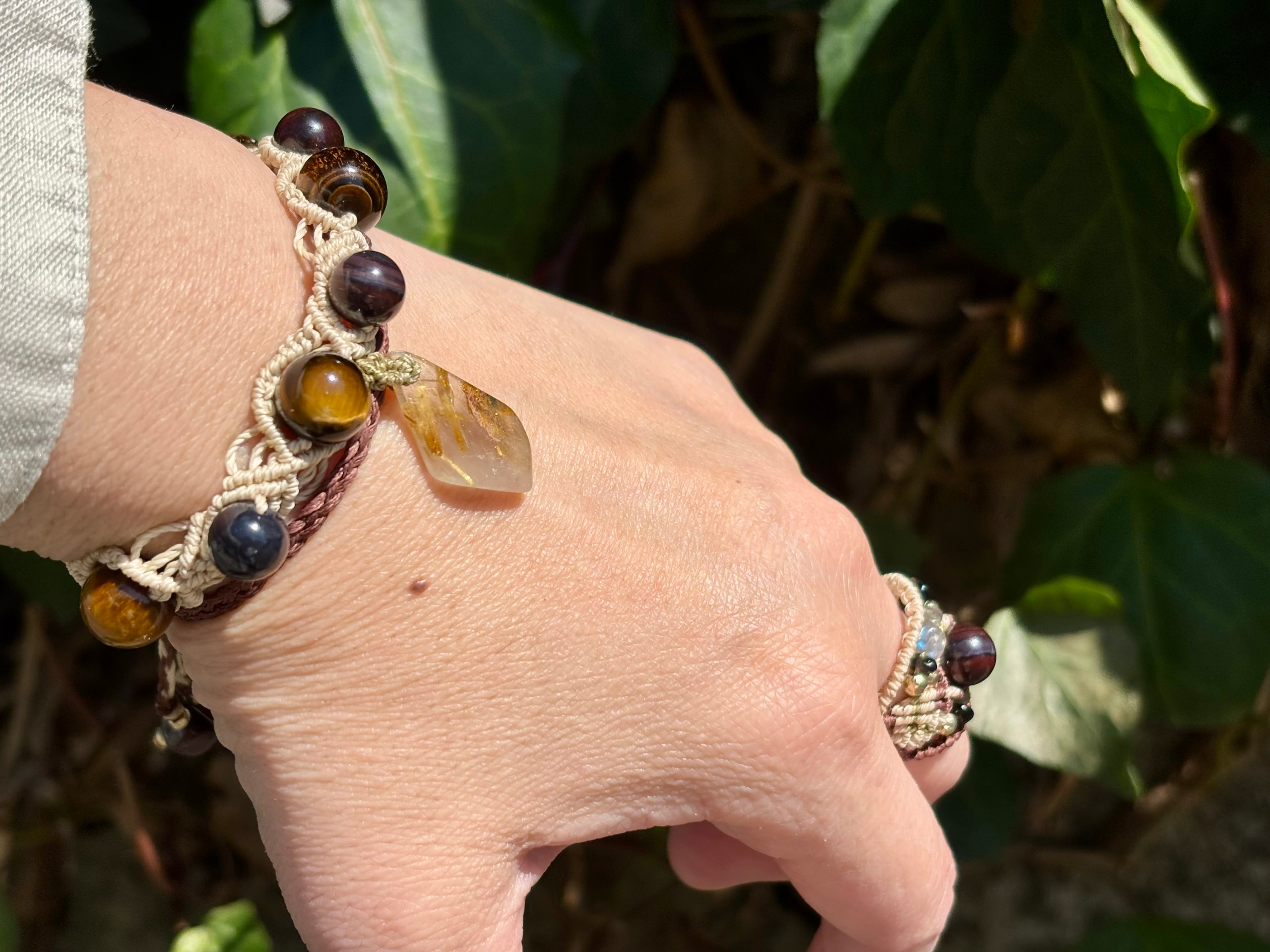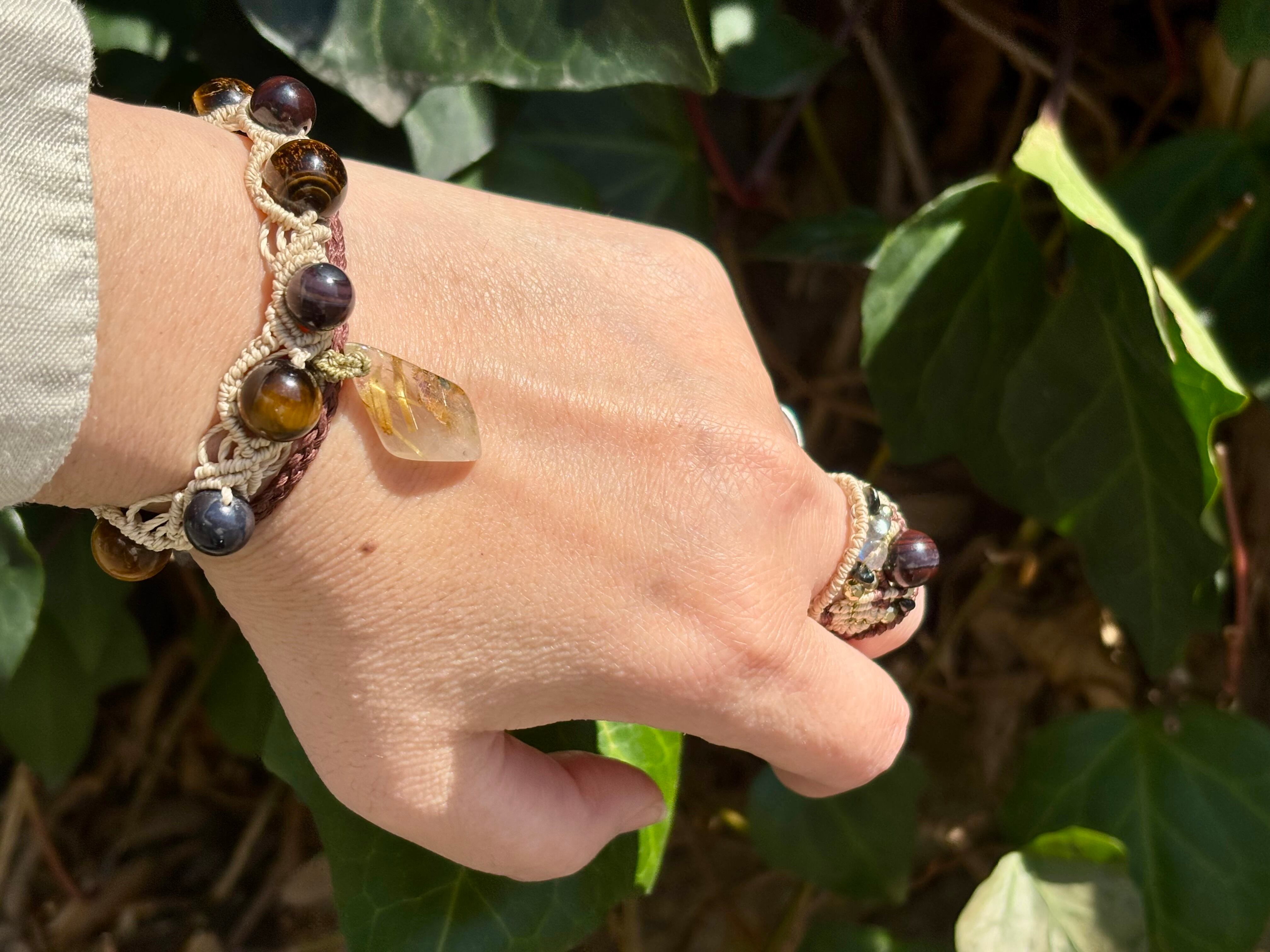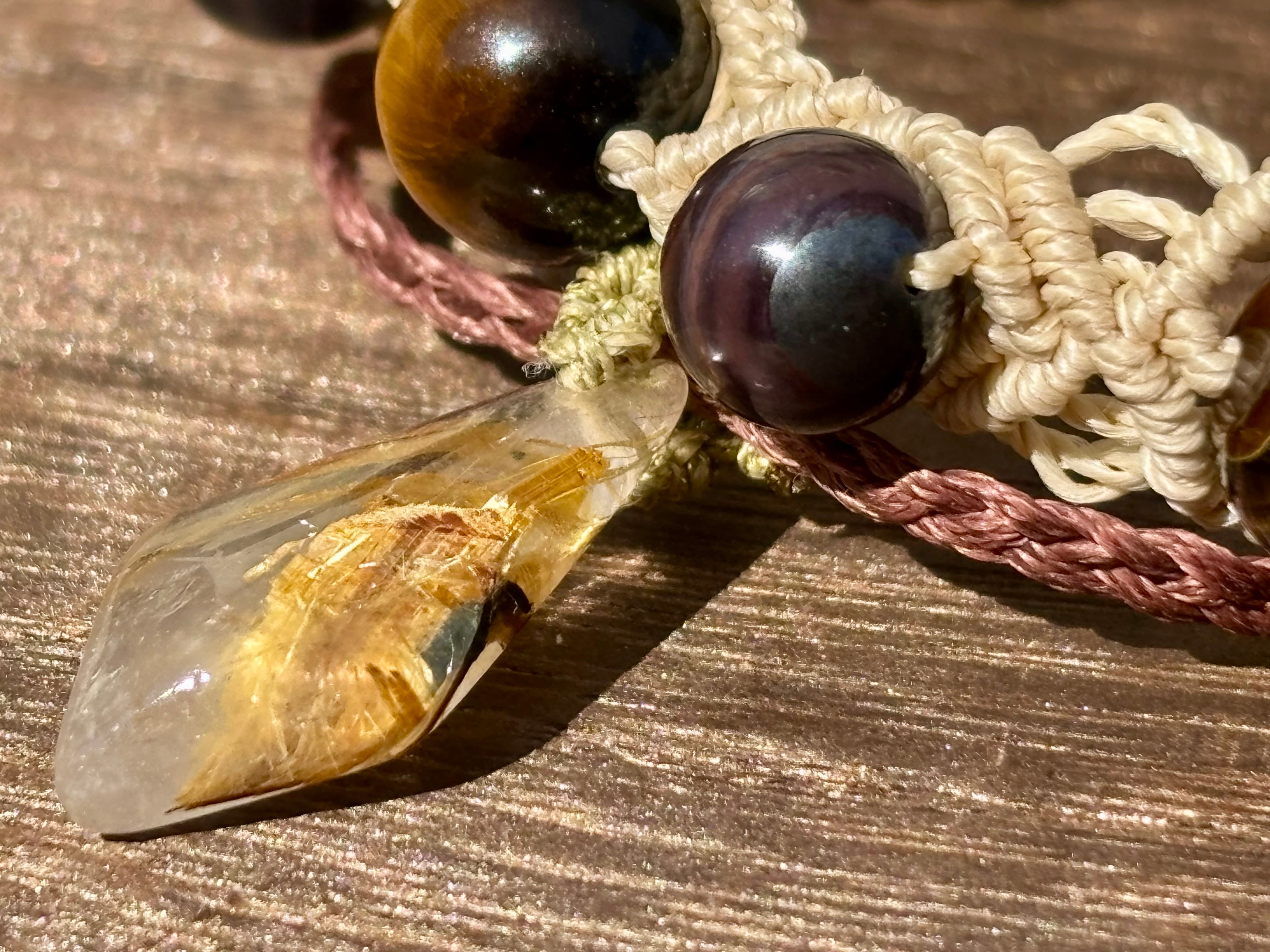 #1052ブラックスギライト一点物(ブラックスギライト×ルチルクォーツ× タイガーアイ マクラメ編みブレスレット)