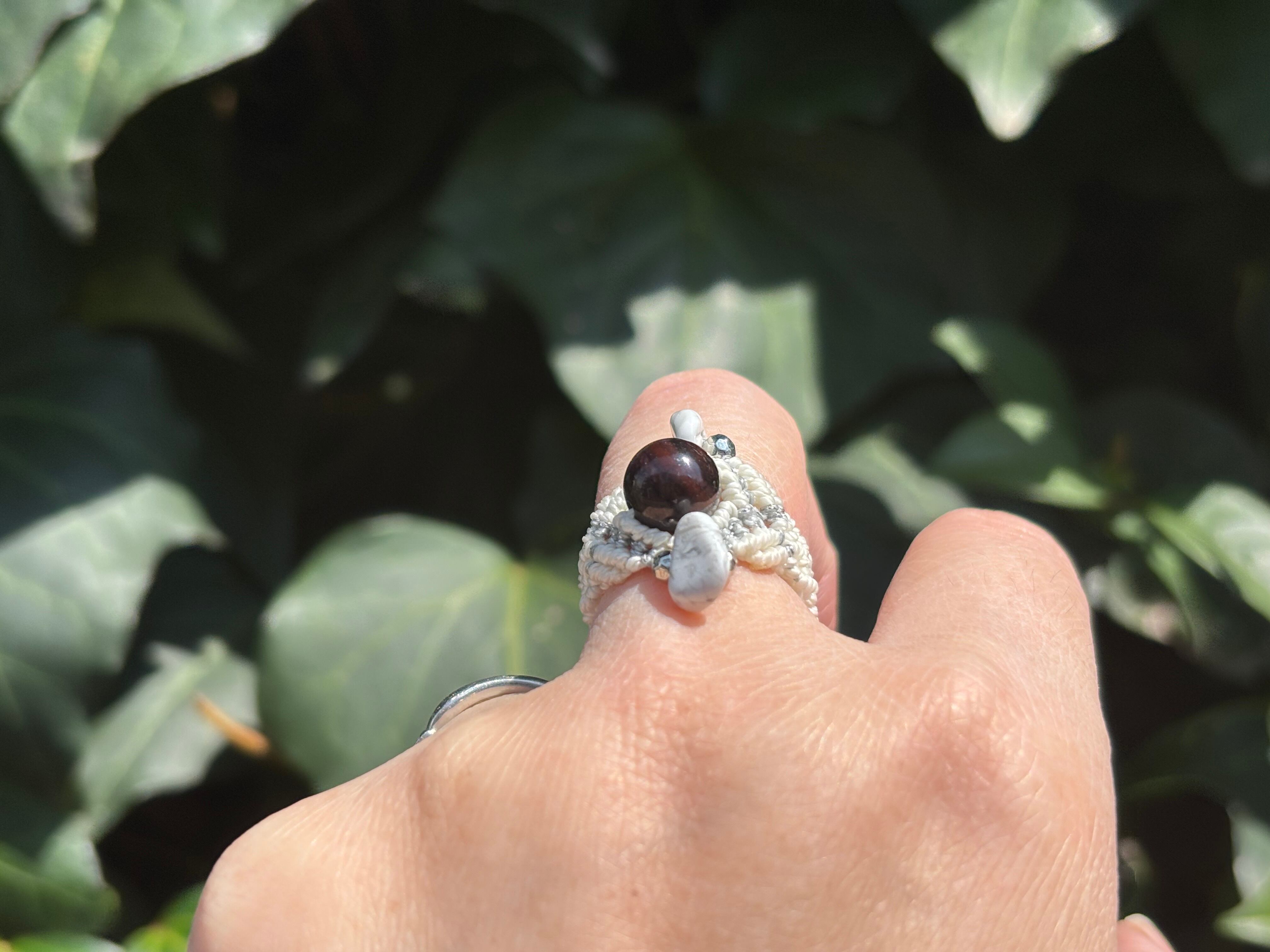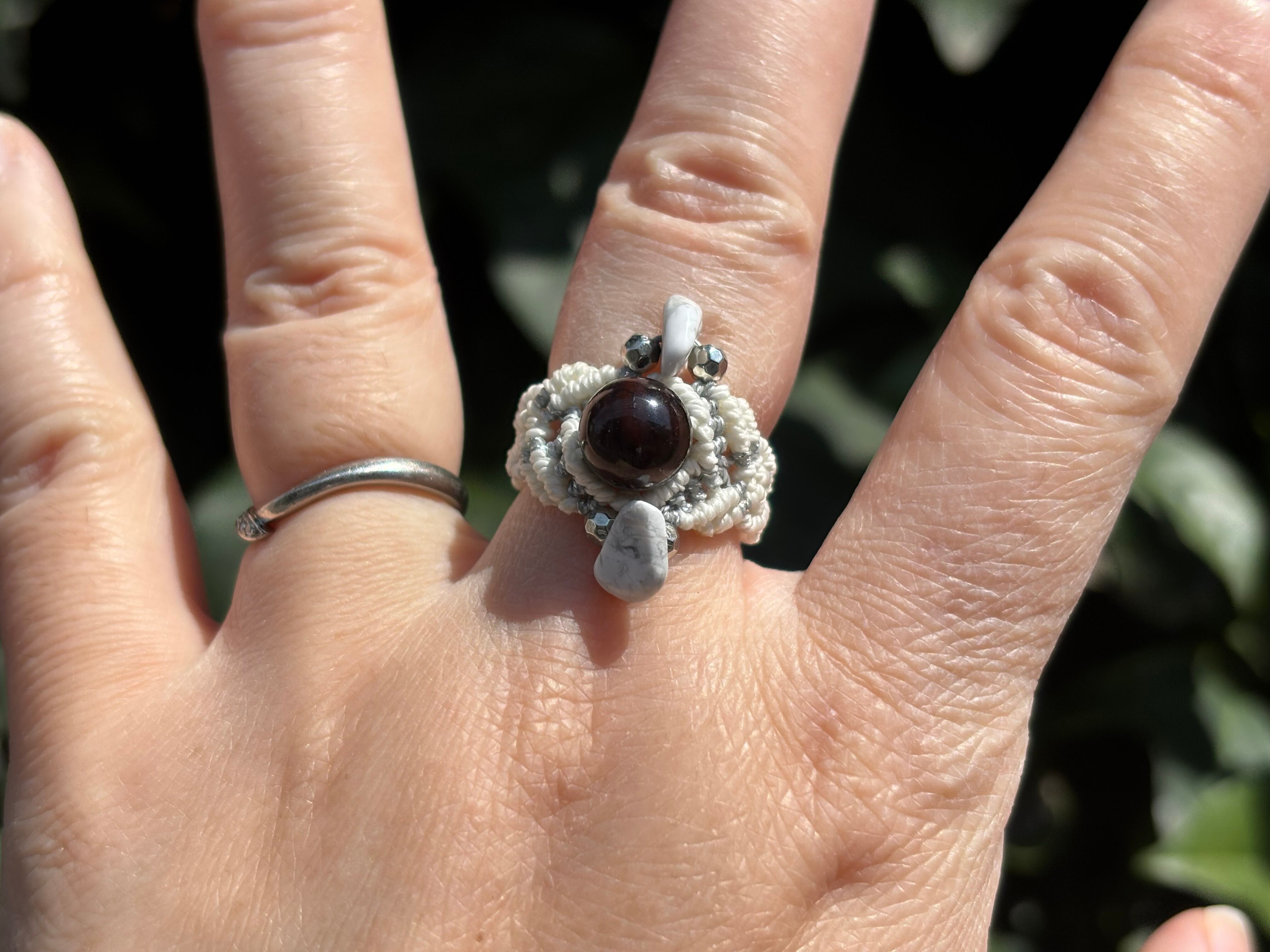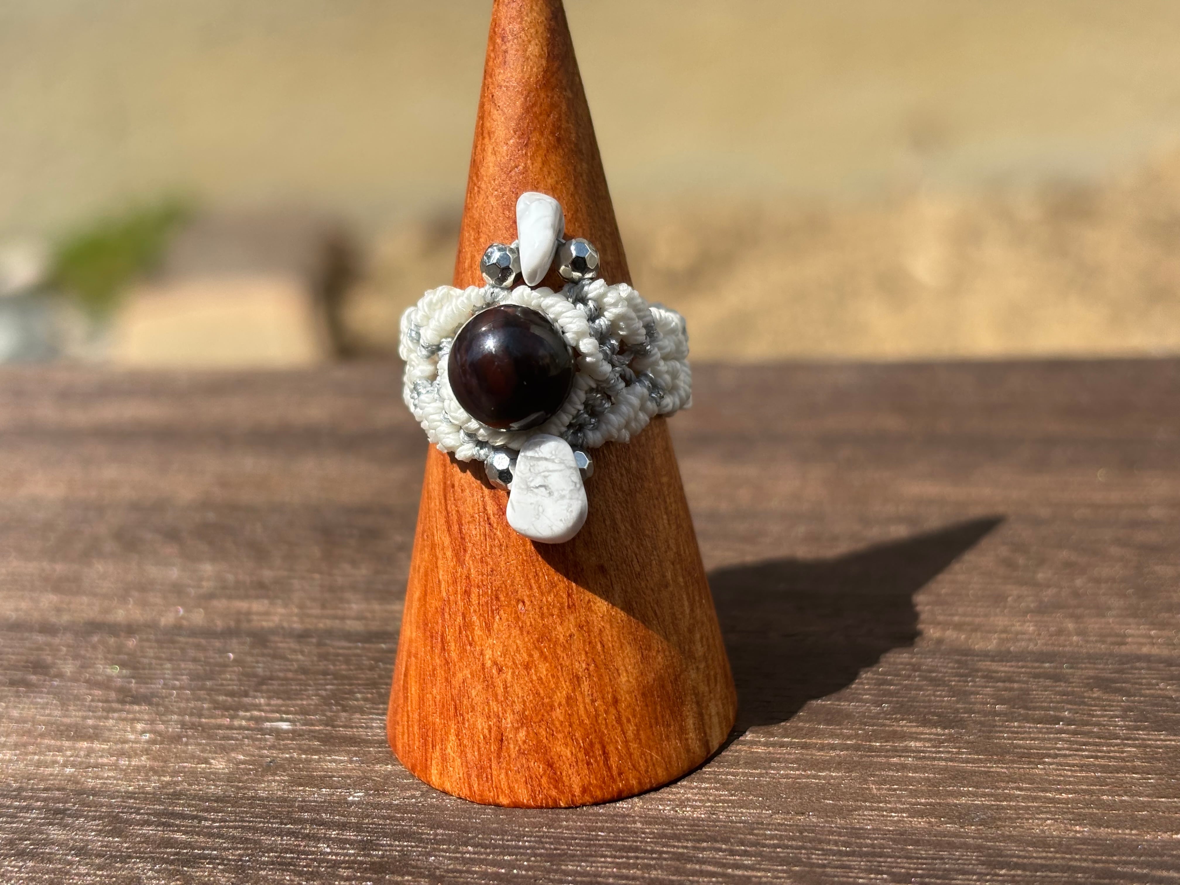 #1058ブラックスギライト一点物(ブラックスギライト×タイガーアイ マクラメ編みリング/指輪)