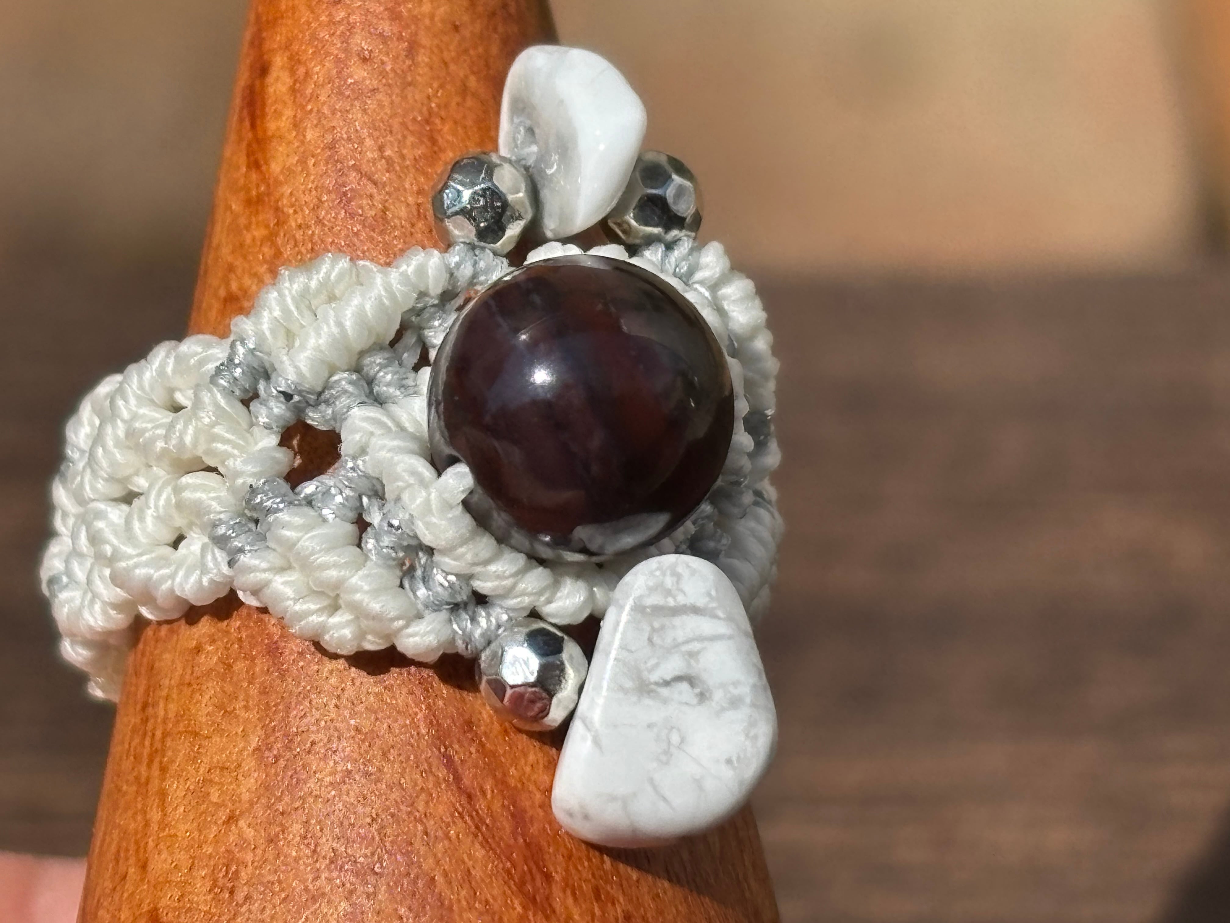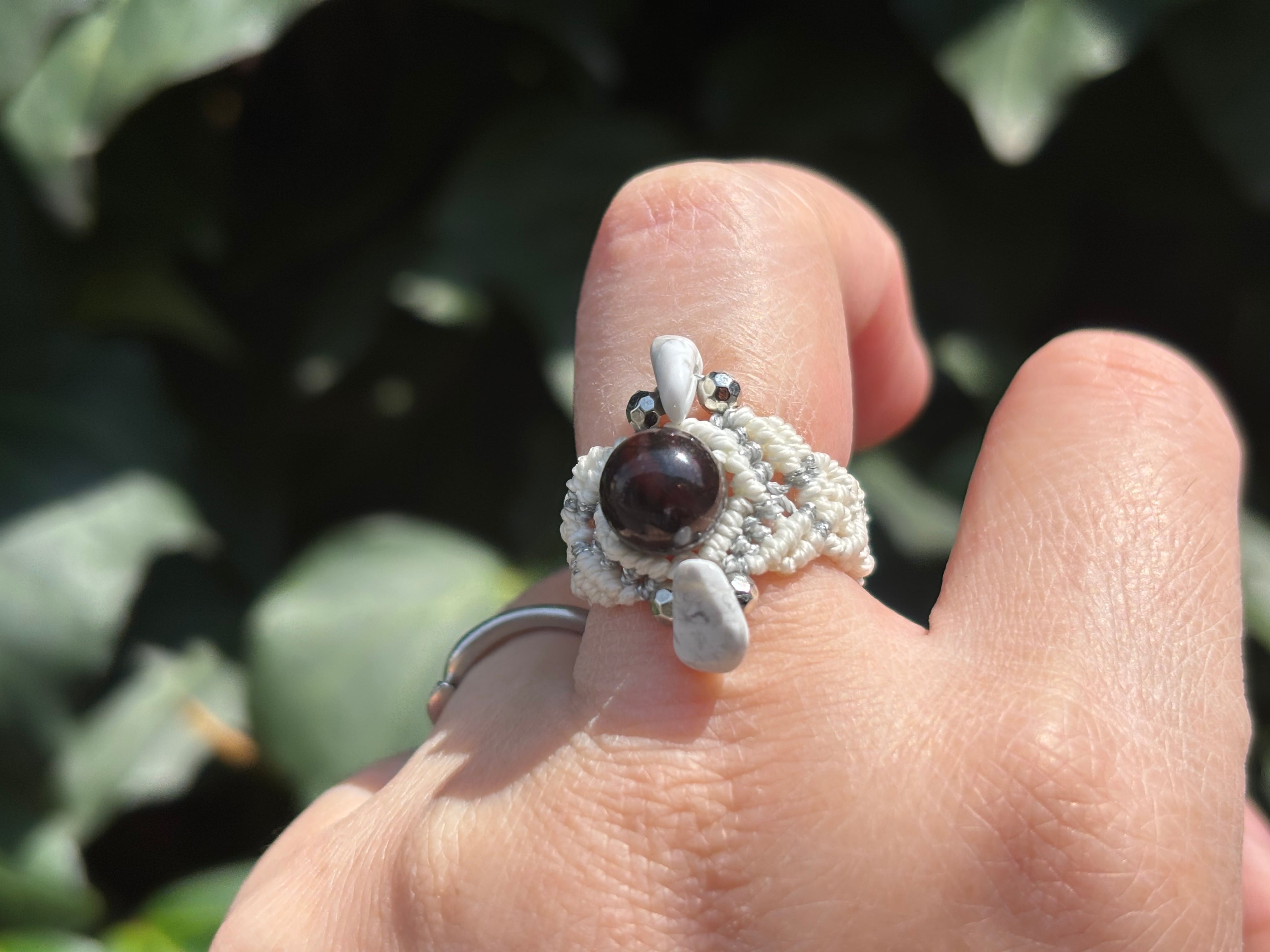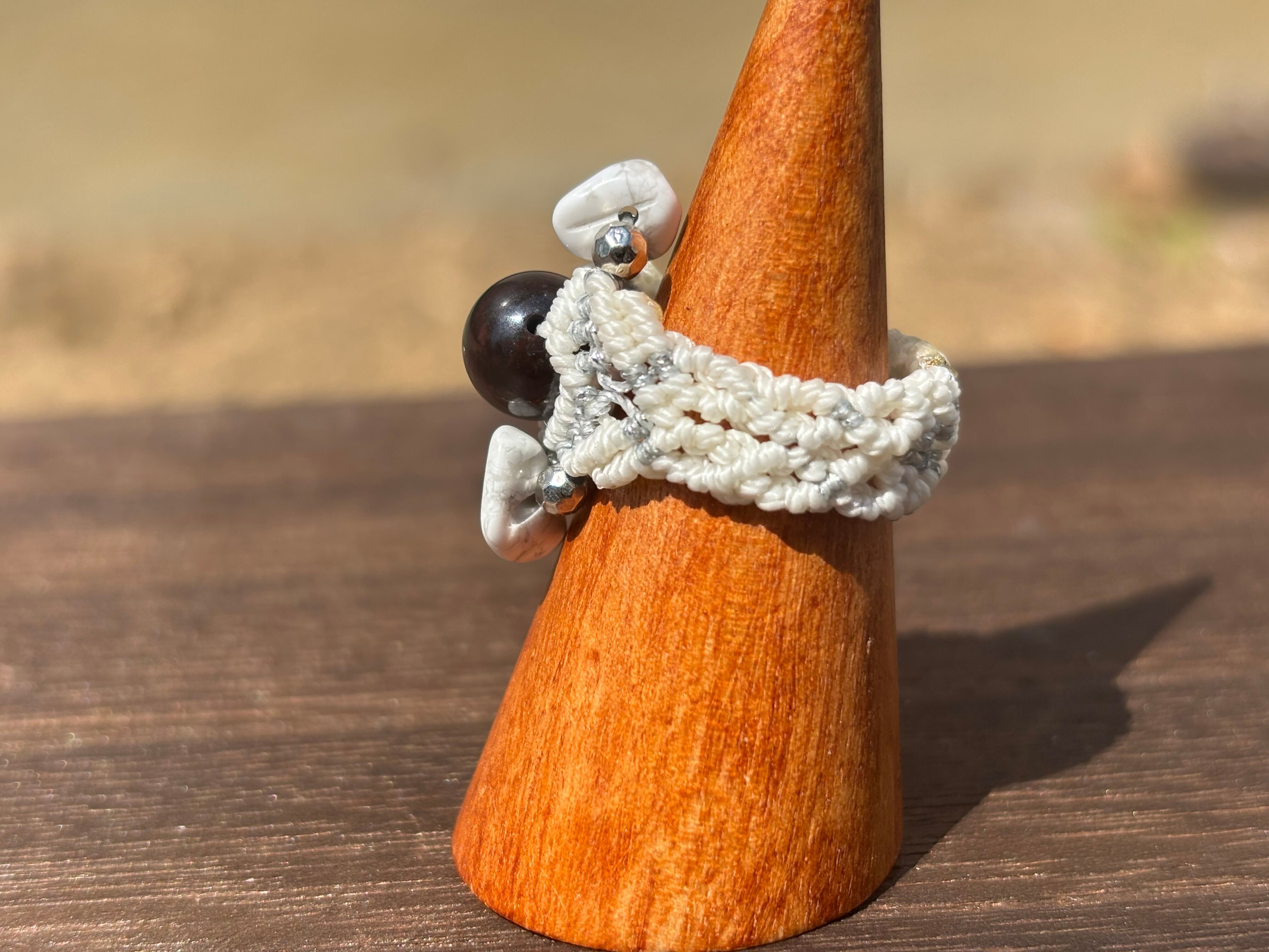 #1058ブラックスギライト一点物(ブラックスギライト×タイガーアイ マクラメ編みリング/指輪)