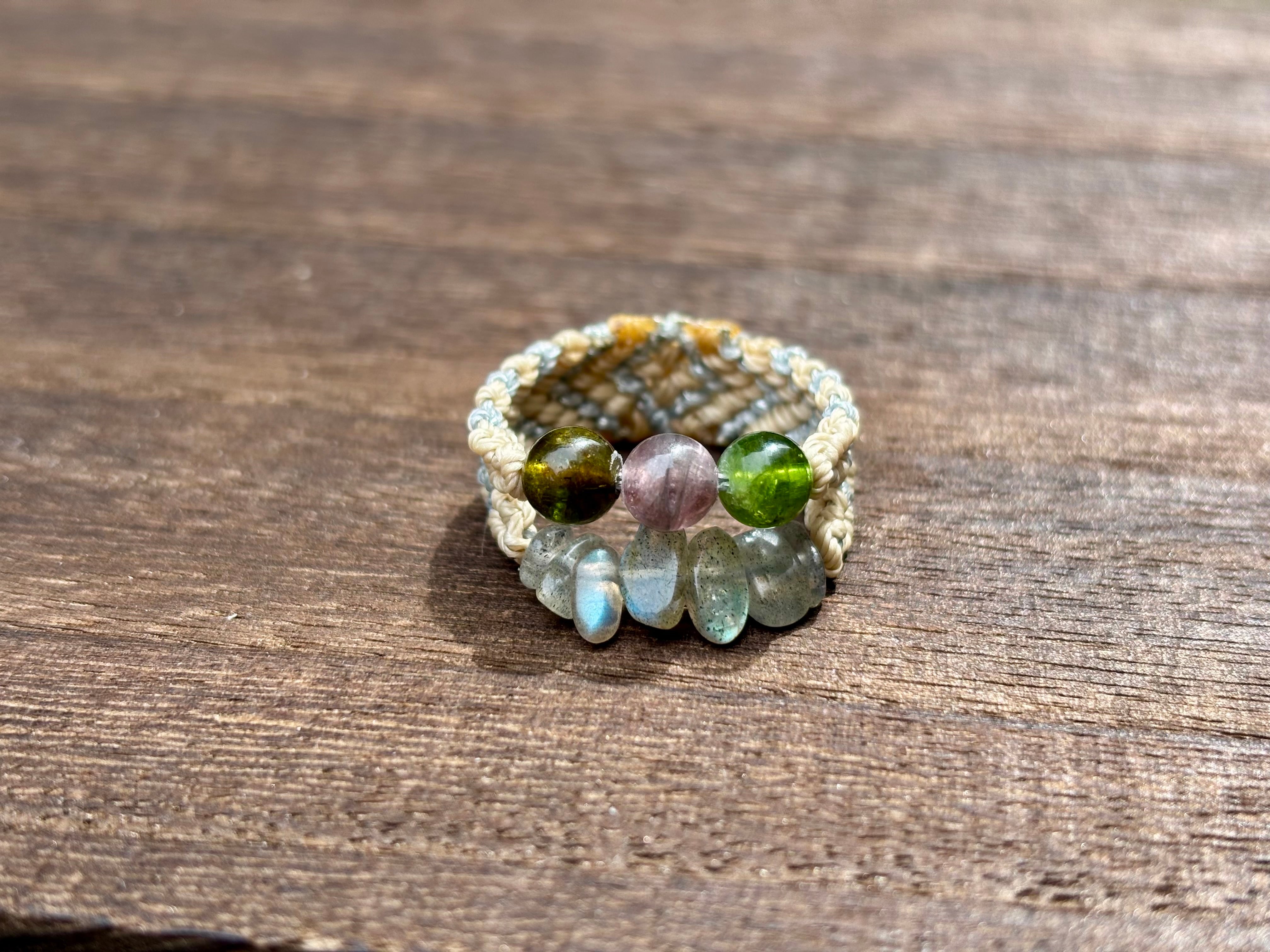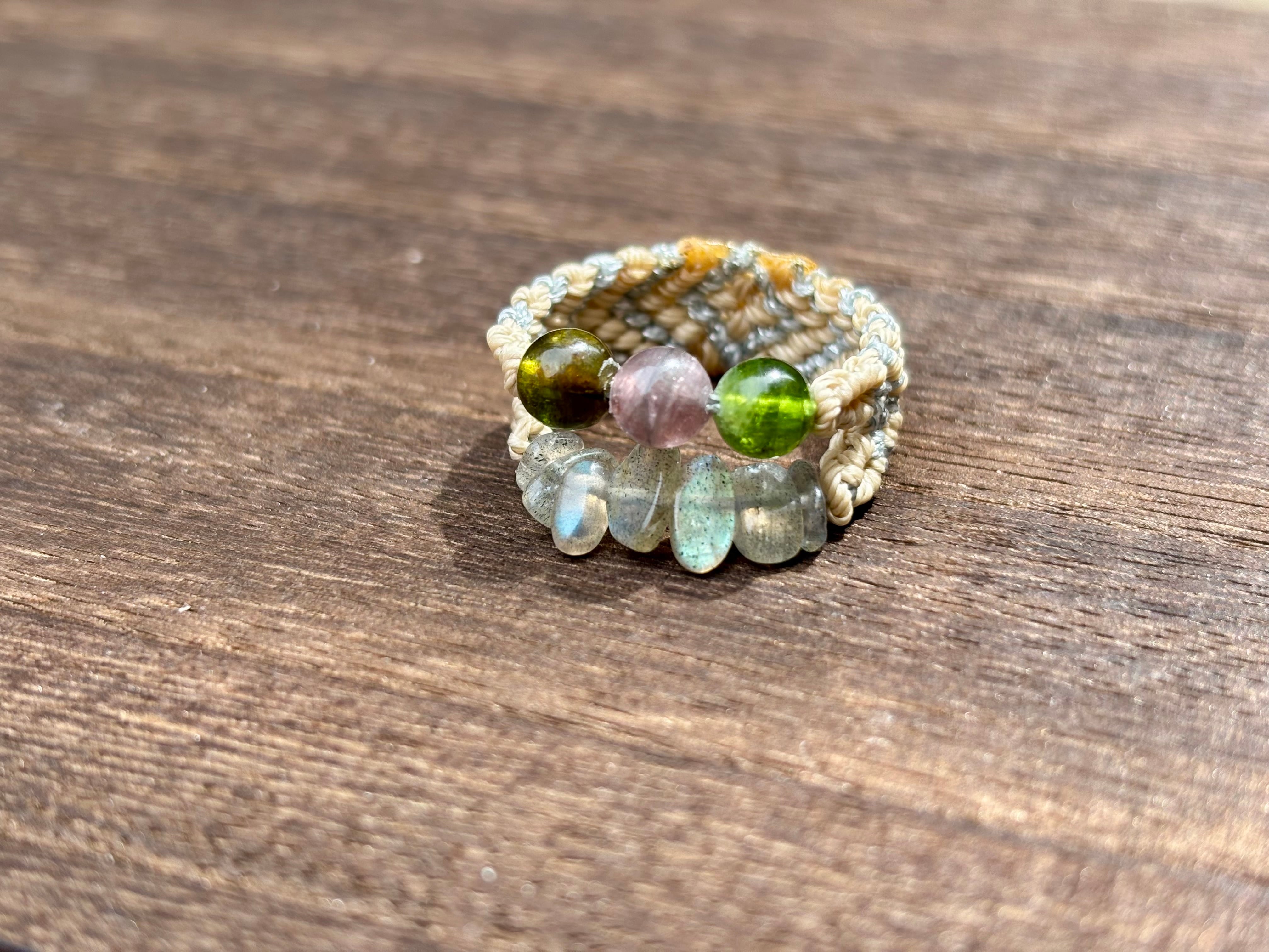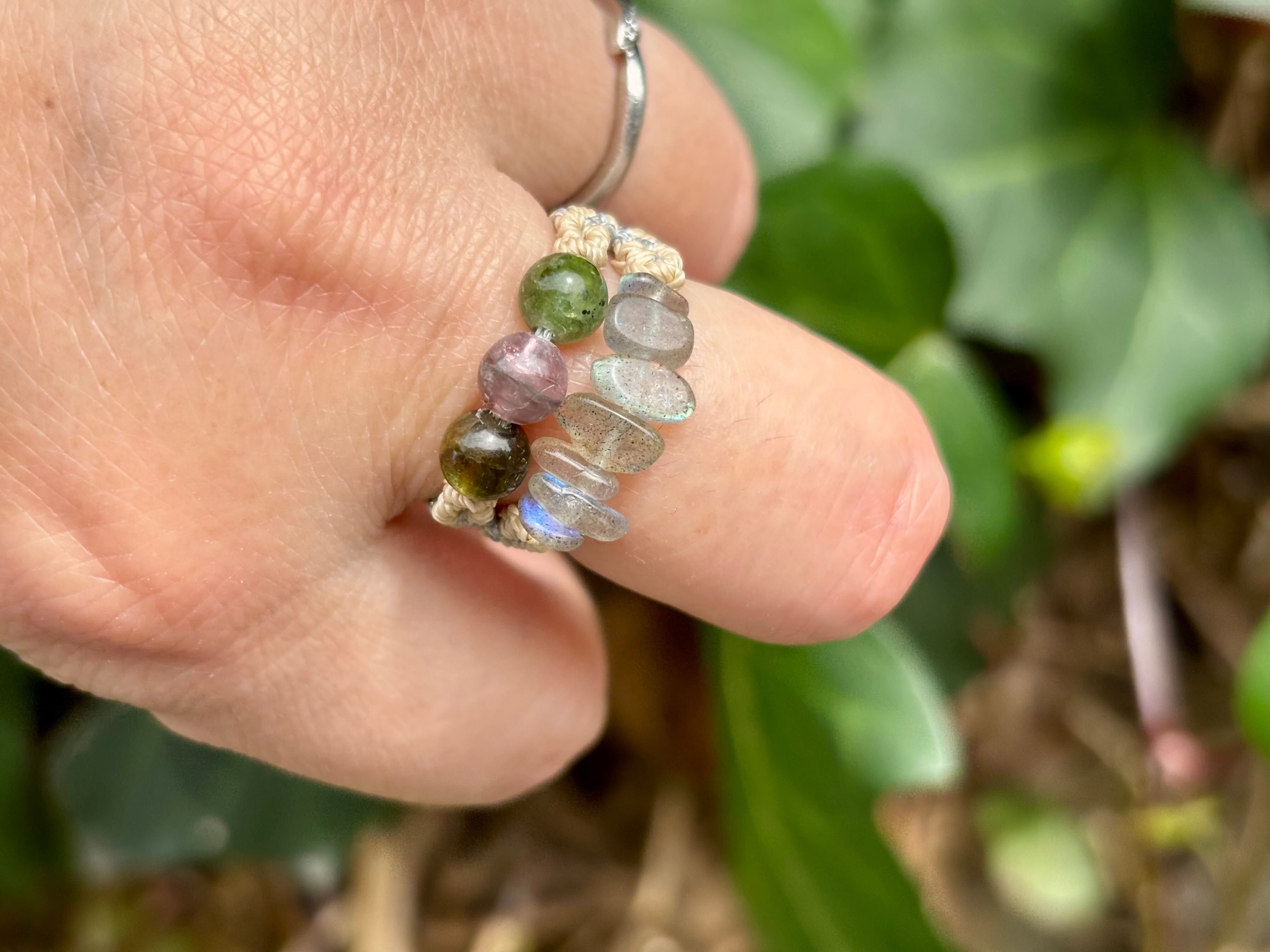 #1088高品質トルマリン5A!2連リング一点物(トルマリン×ラブラドライト マクラメ編み二連リング/指輪)