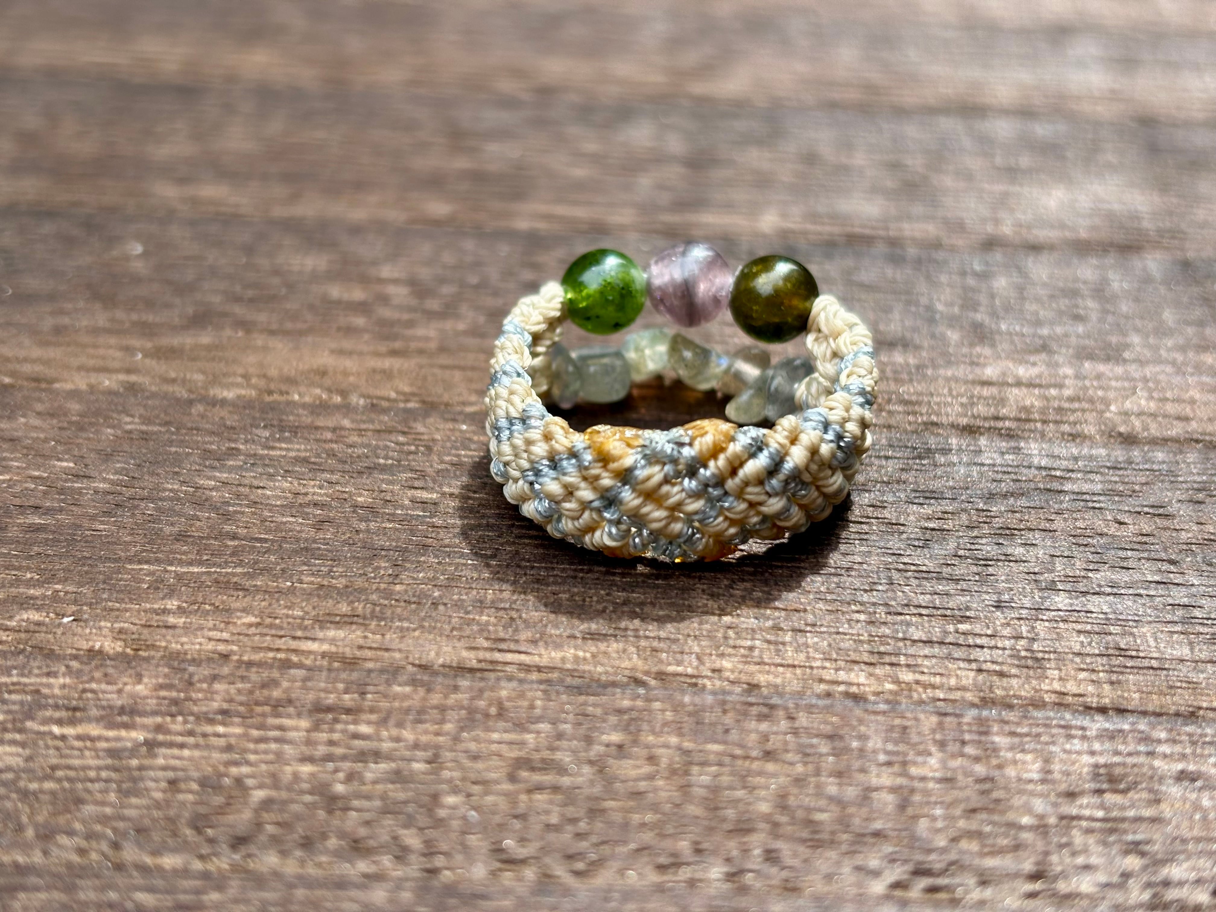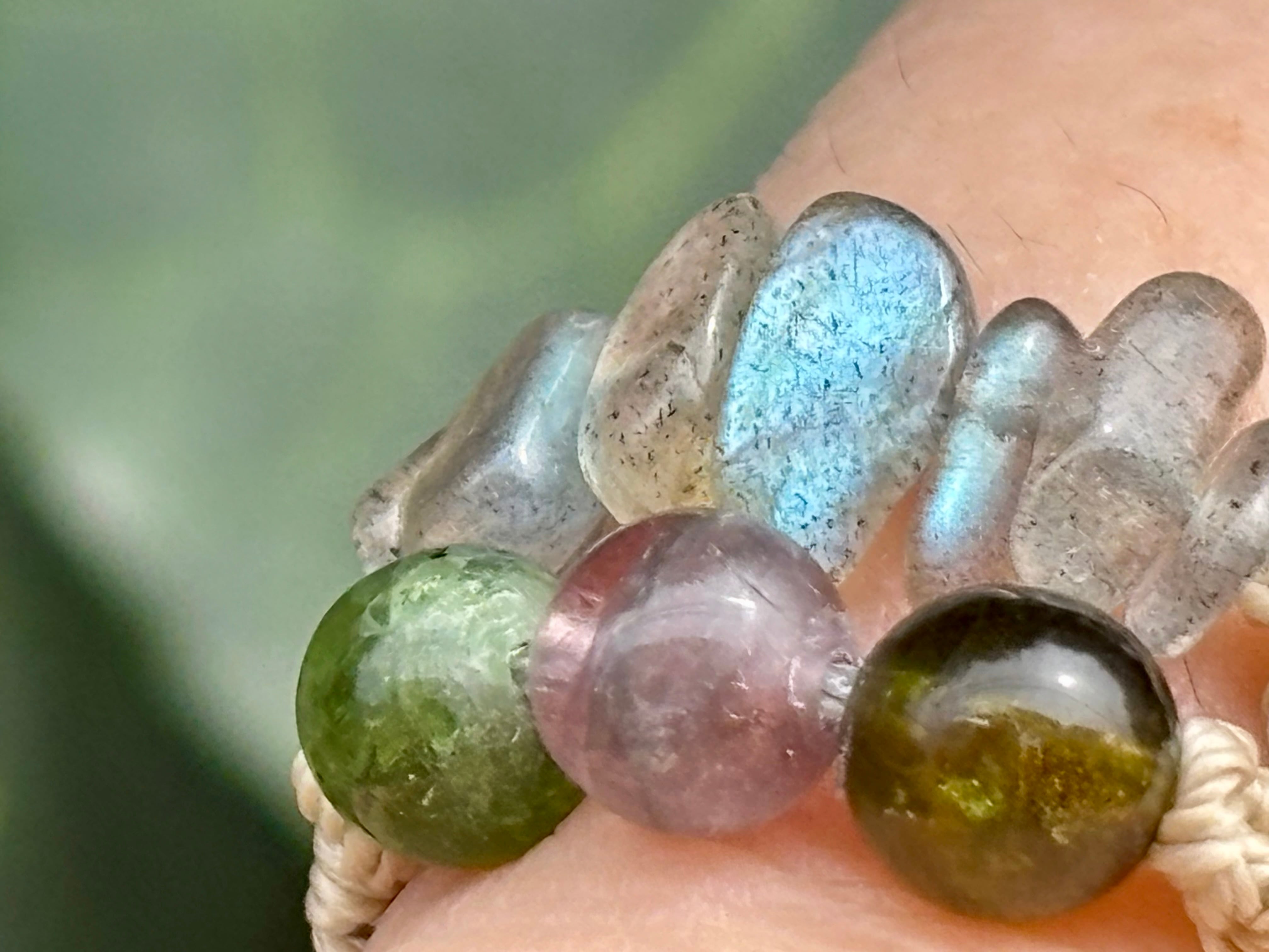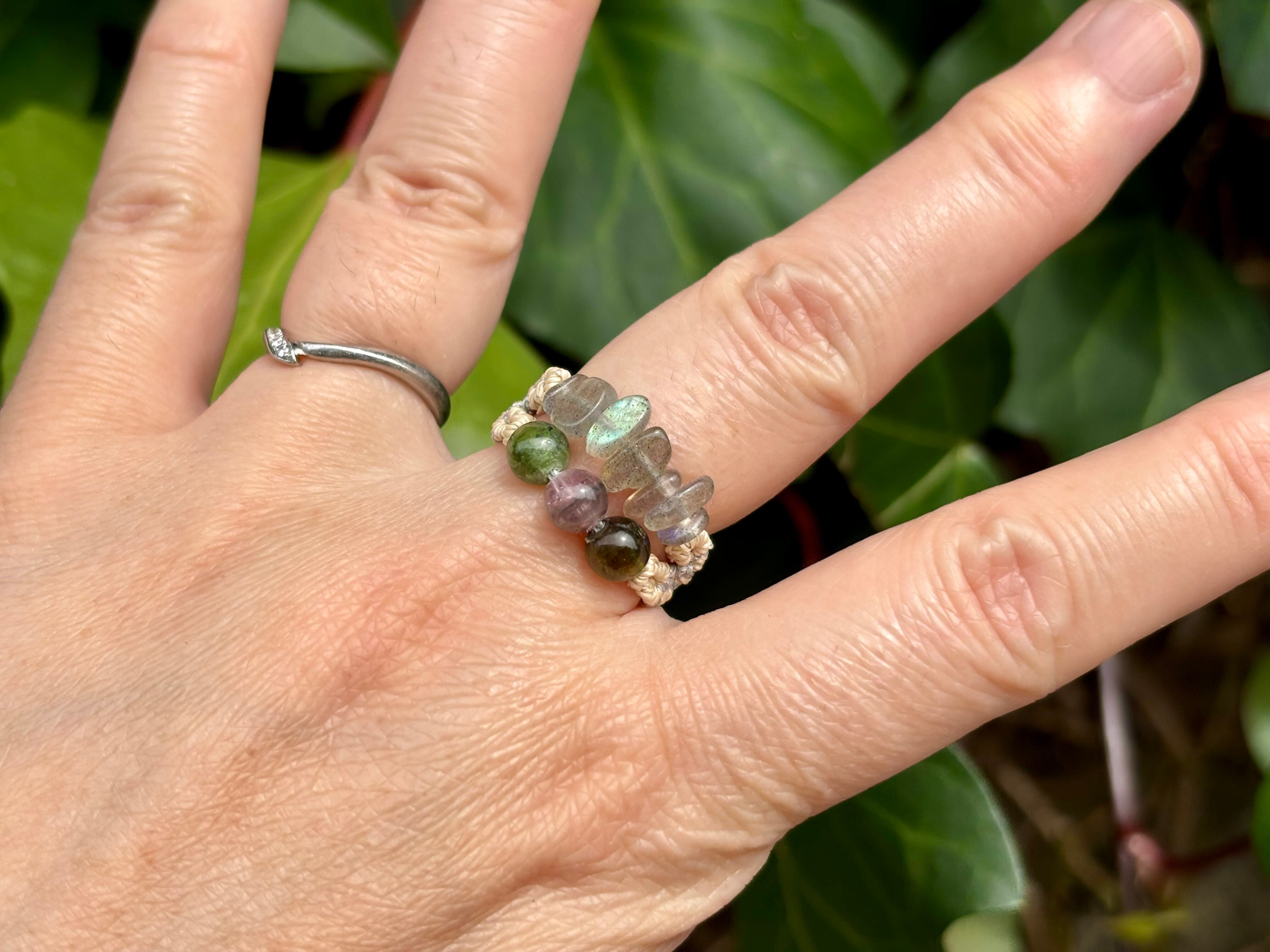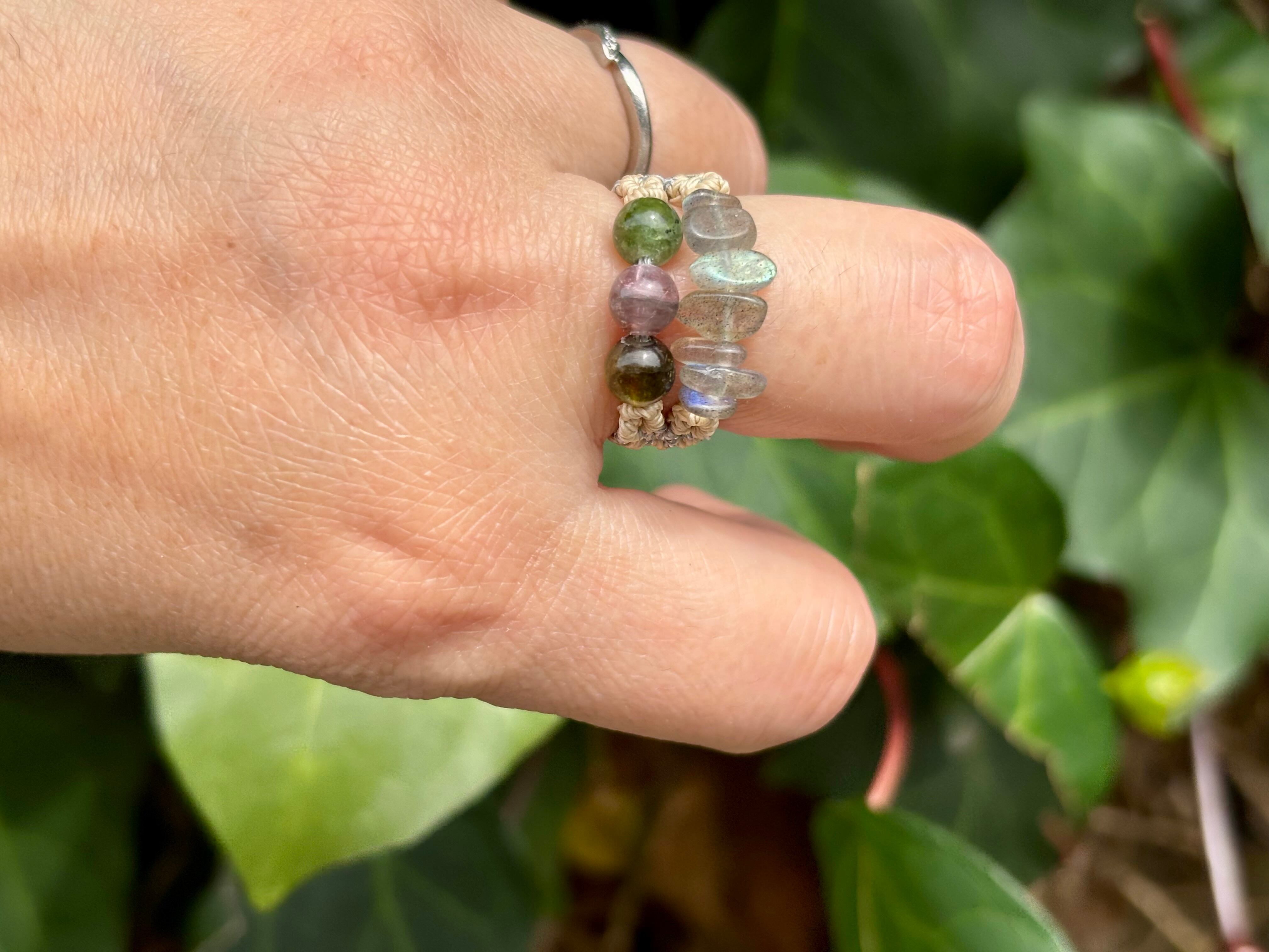#1088高品質トルマリン5A!2連リング一点物(トルマリン×ラブラドライト マクラメ編み二連リング/指輪)