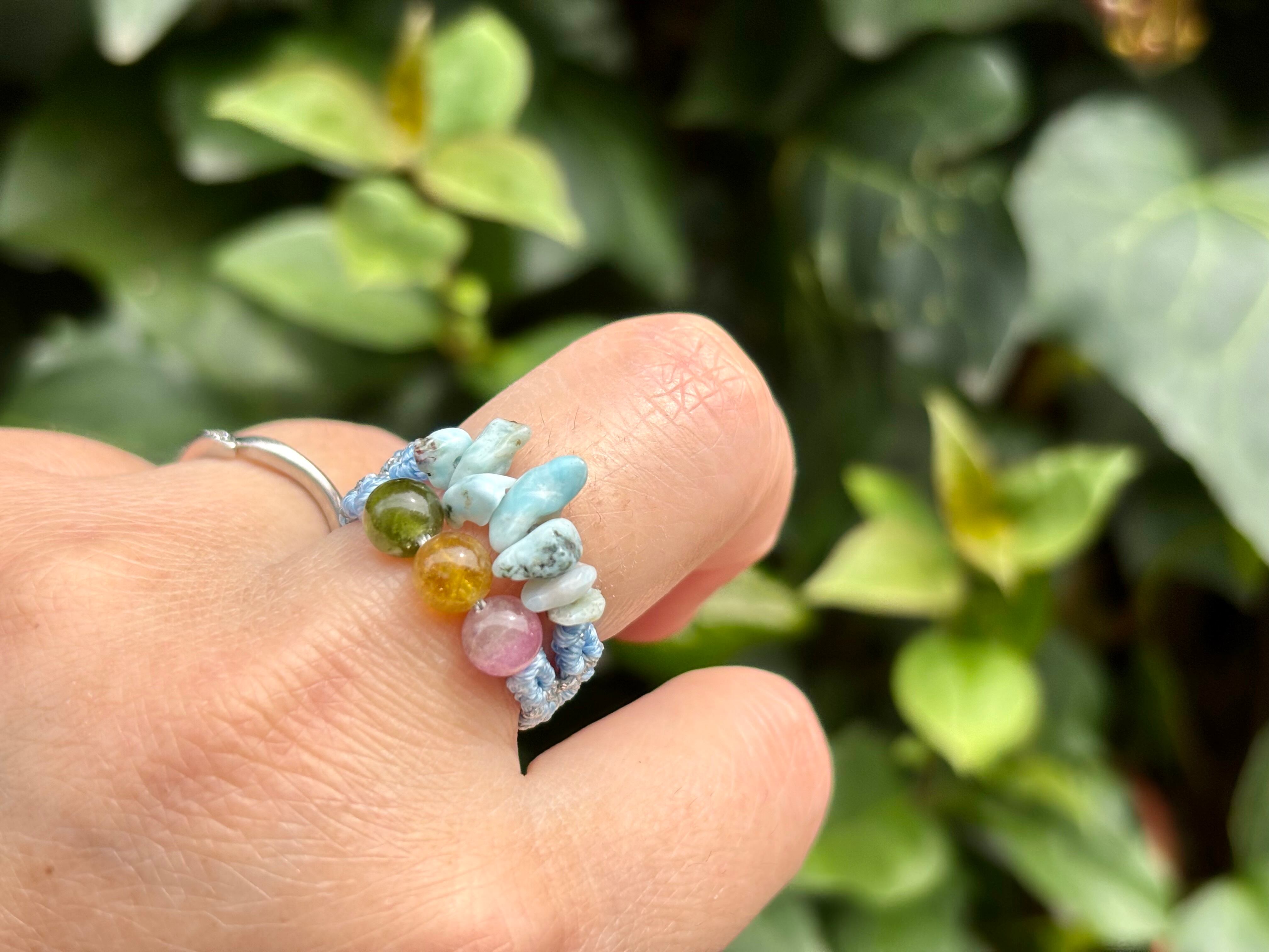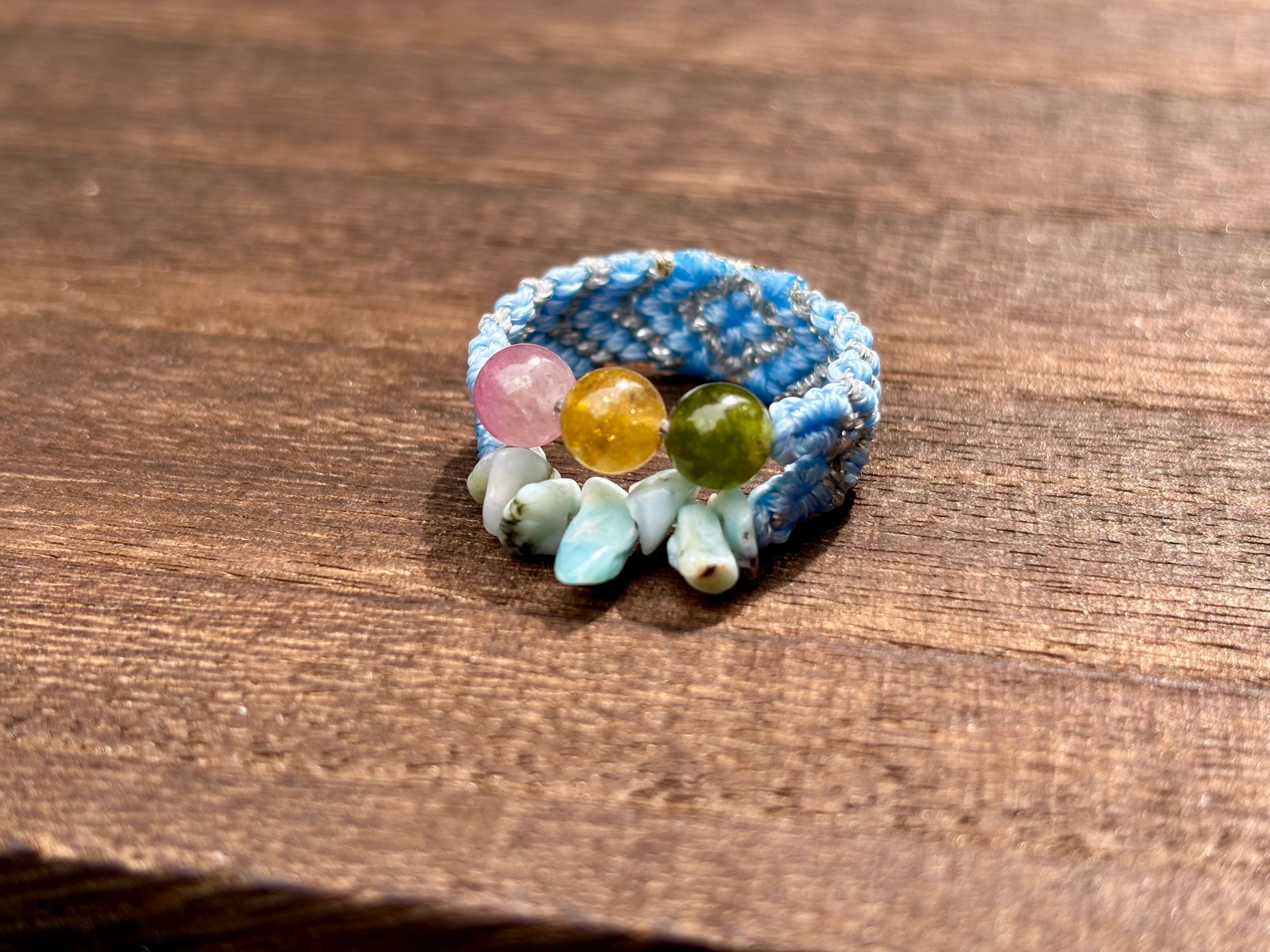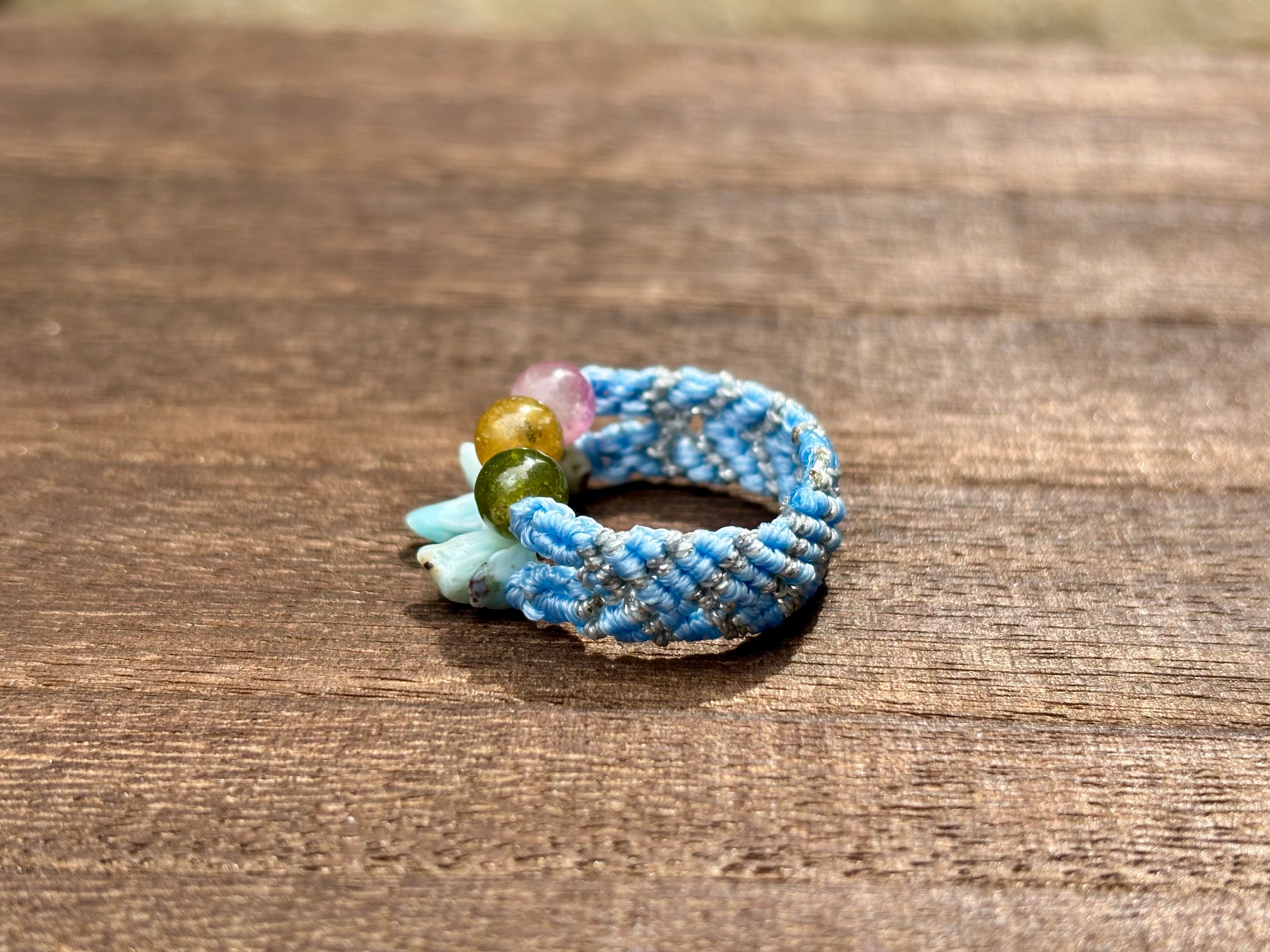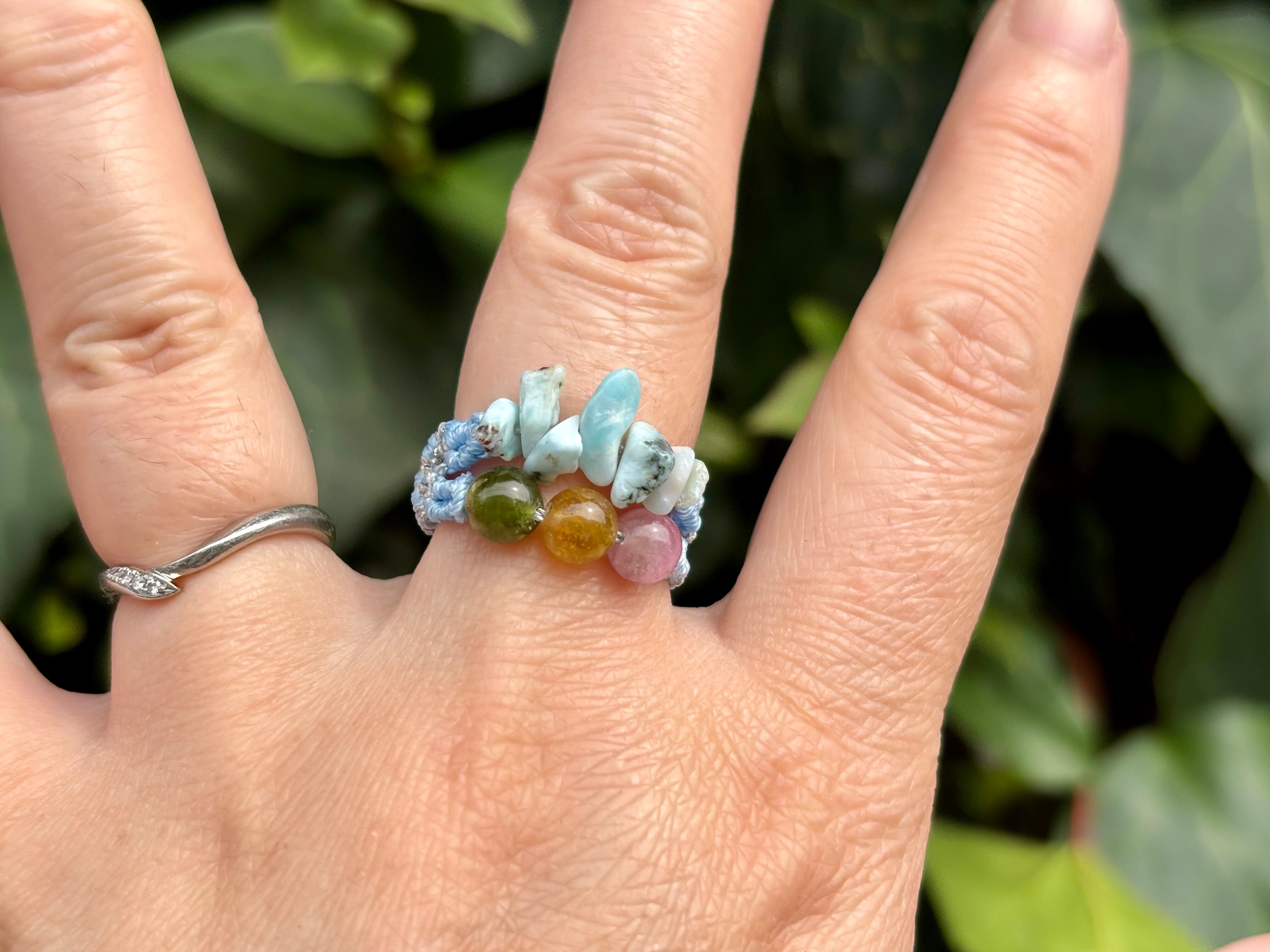 #1089高品質トルマリン5A!2連リング一点物(トルマリン×ラリマー マクラメ編み二連リング/指輪)