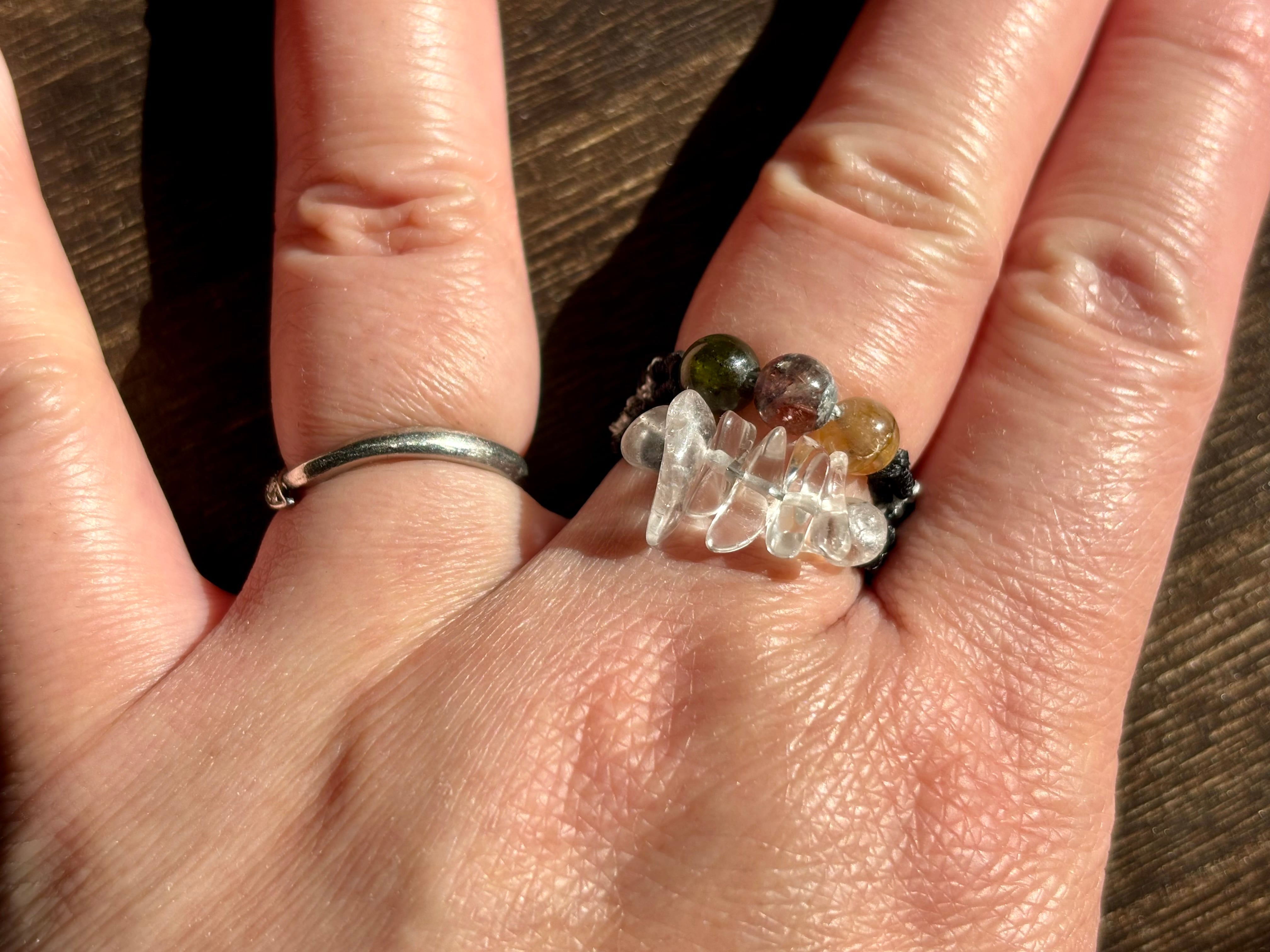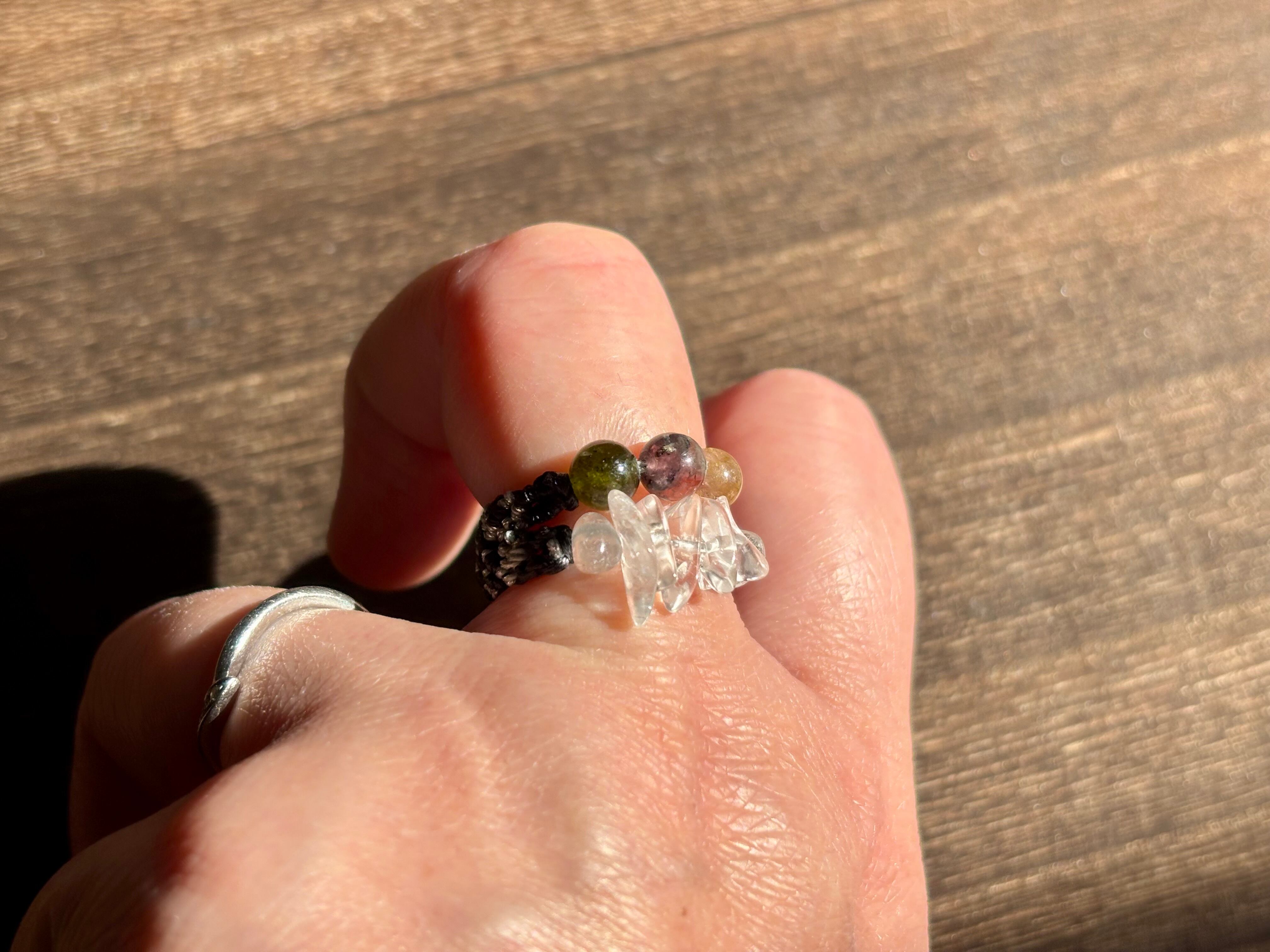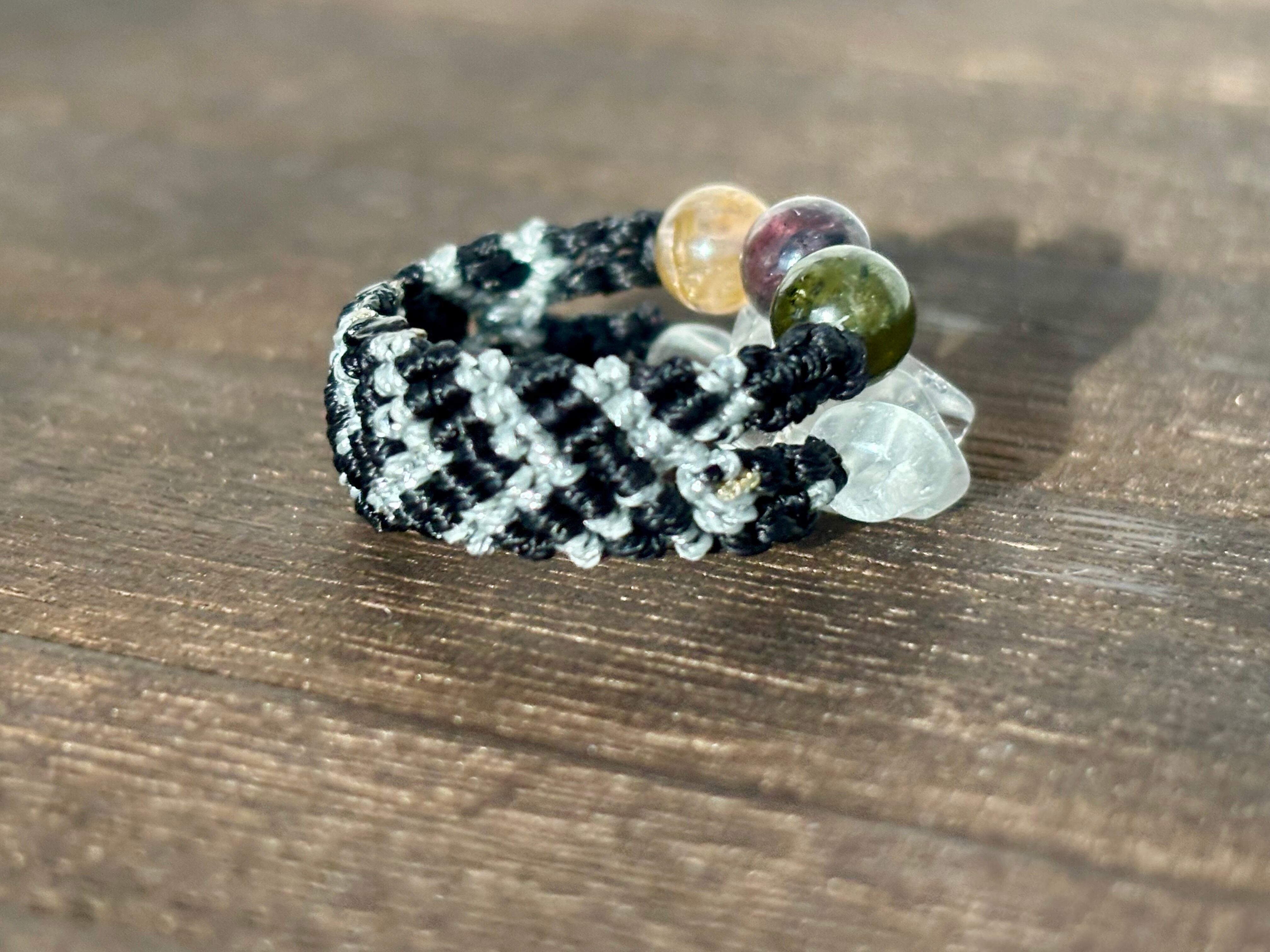 #1093高品質トルマリン5A!2連リング一点物(トルマリン×水晶 マクラメ編み二連リング/指輪)