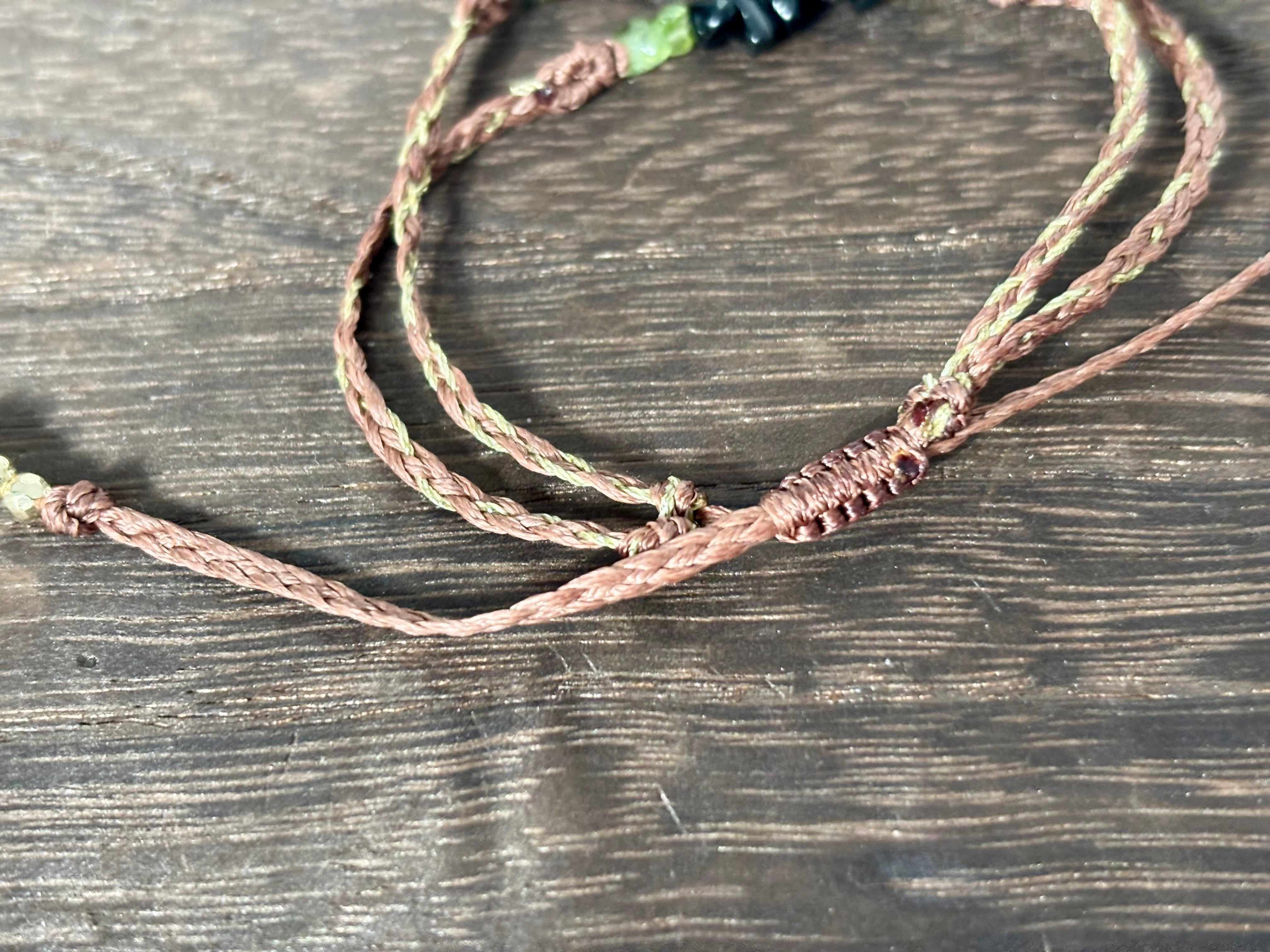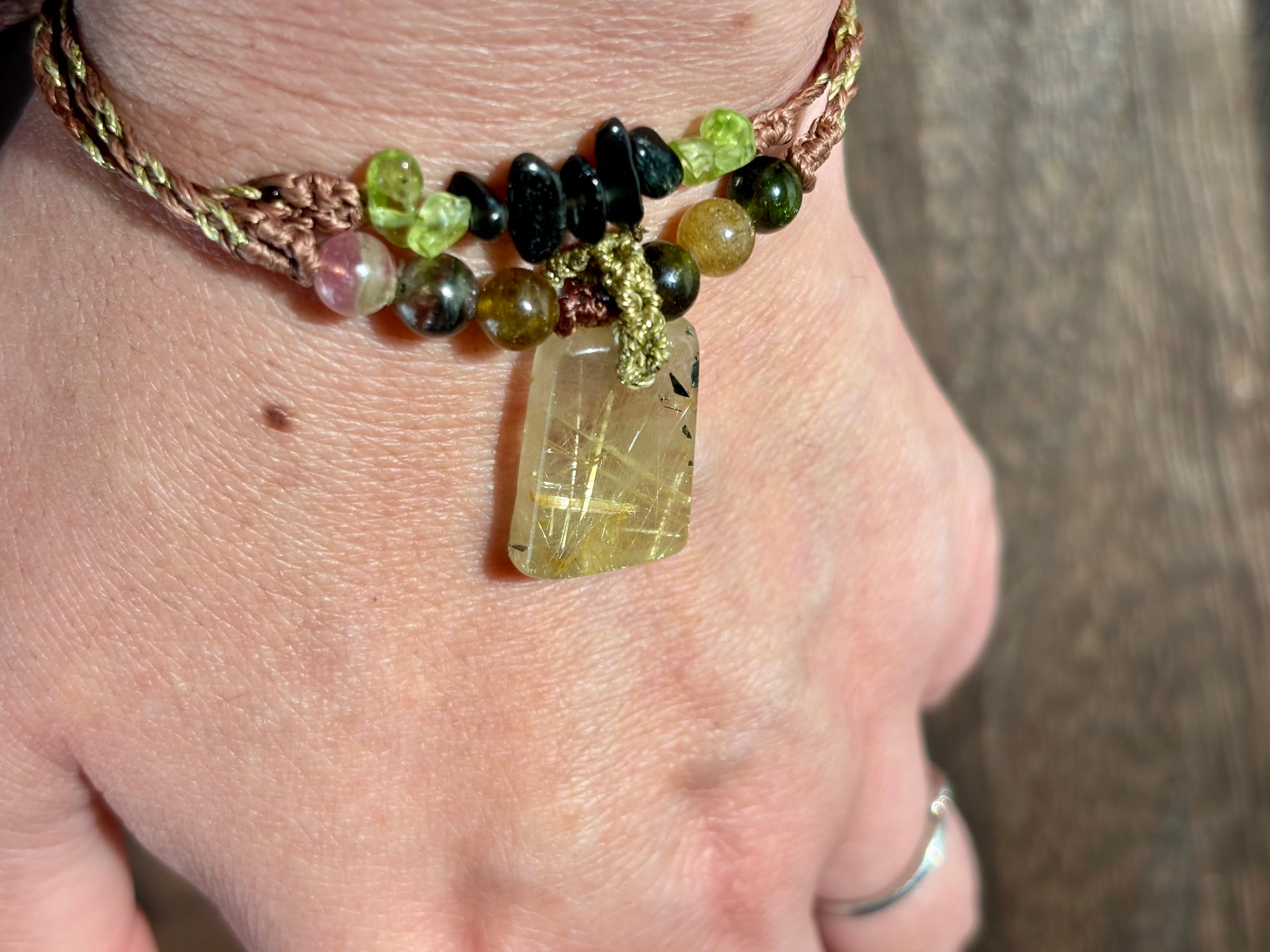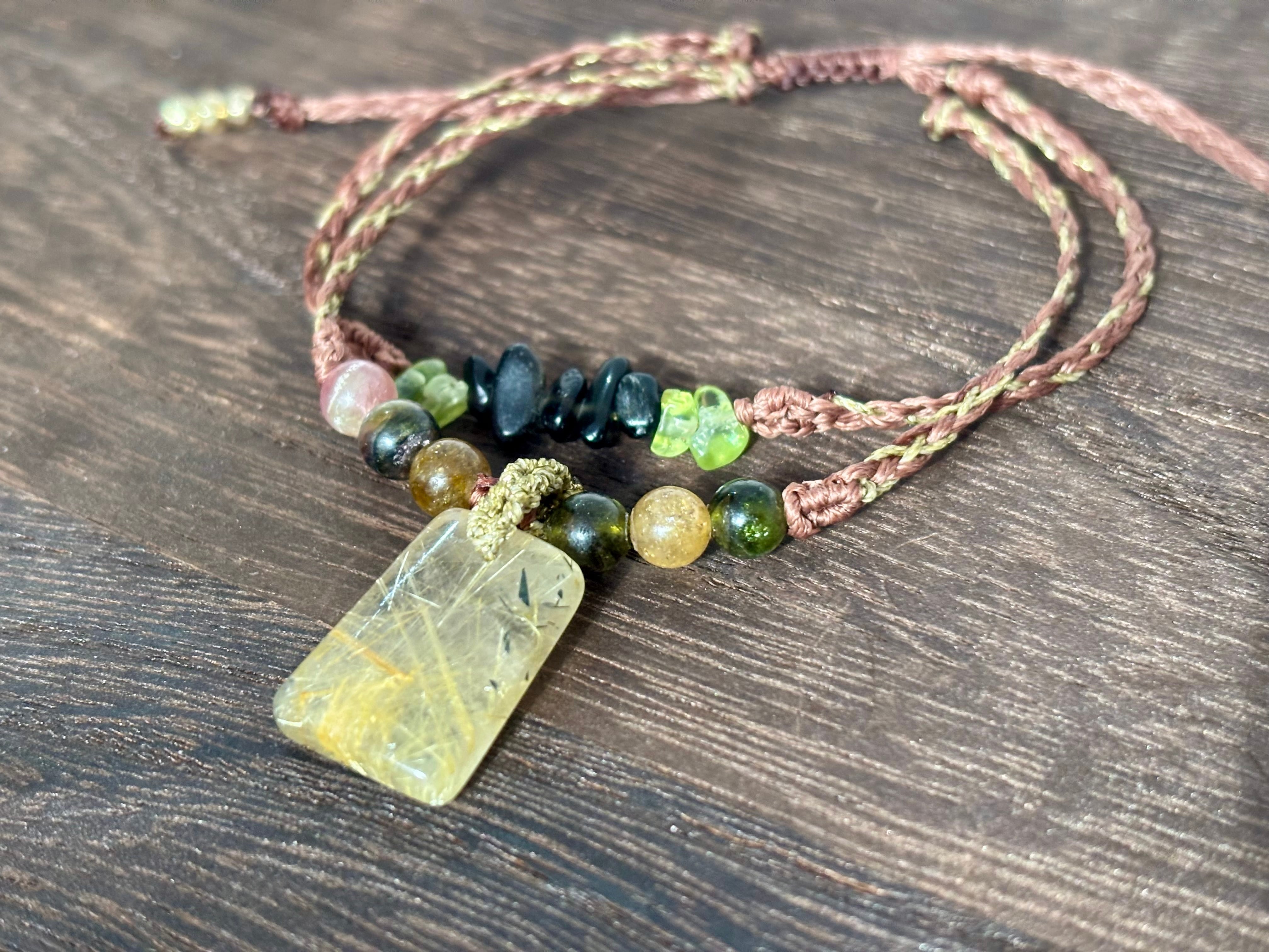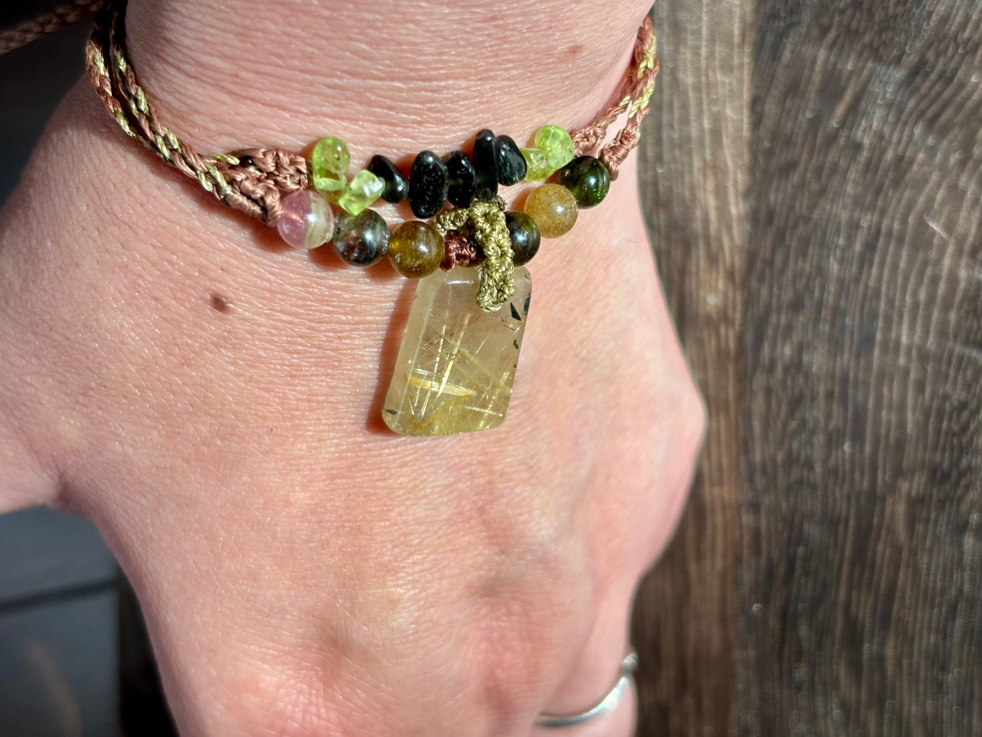 #1095高品質トルマリン&ルチル‼︎一点物(トルマリン×ルチルクォーツ×オニキス×ペリドット マクラメ編み二連ブレスレット)