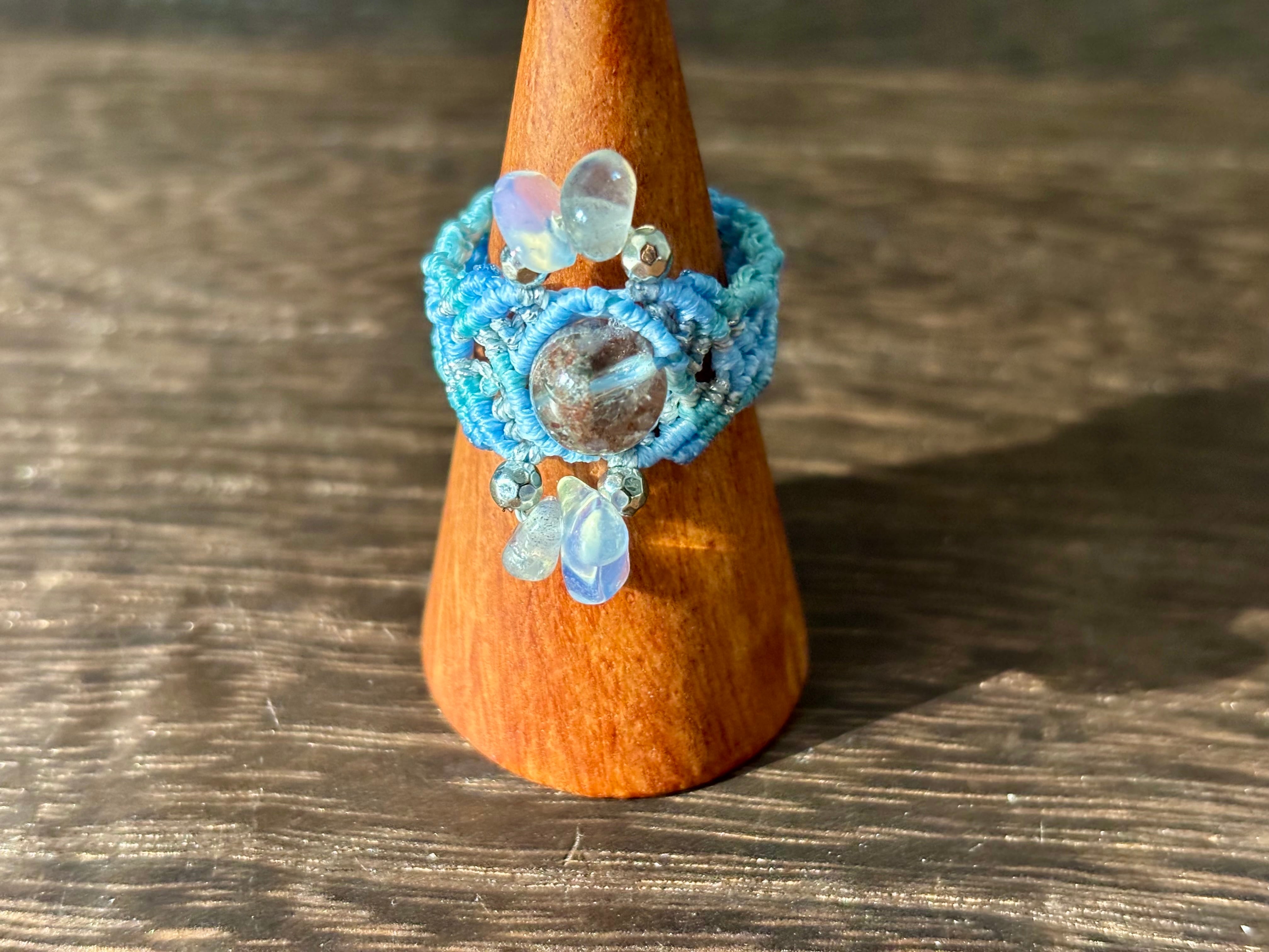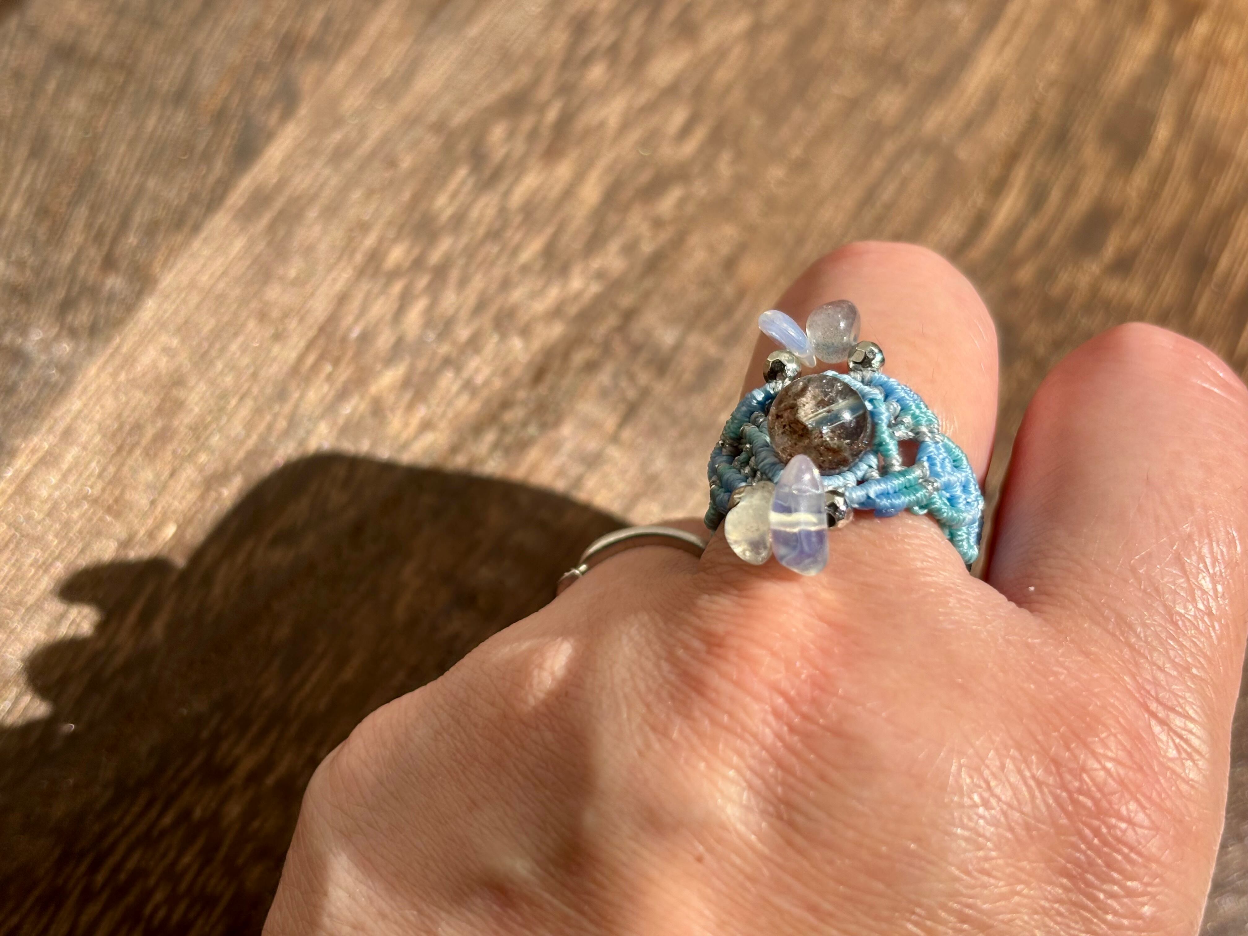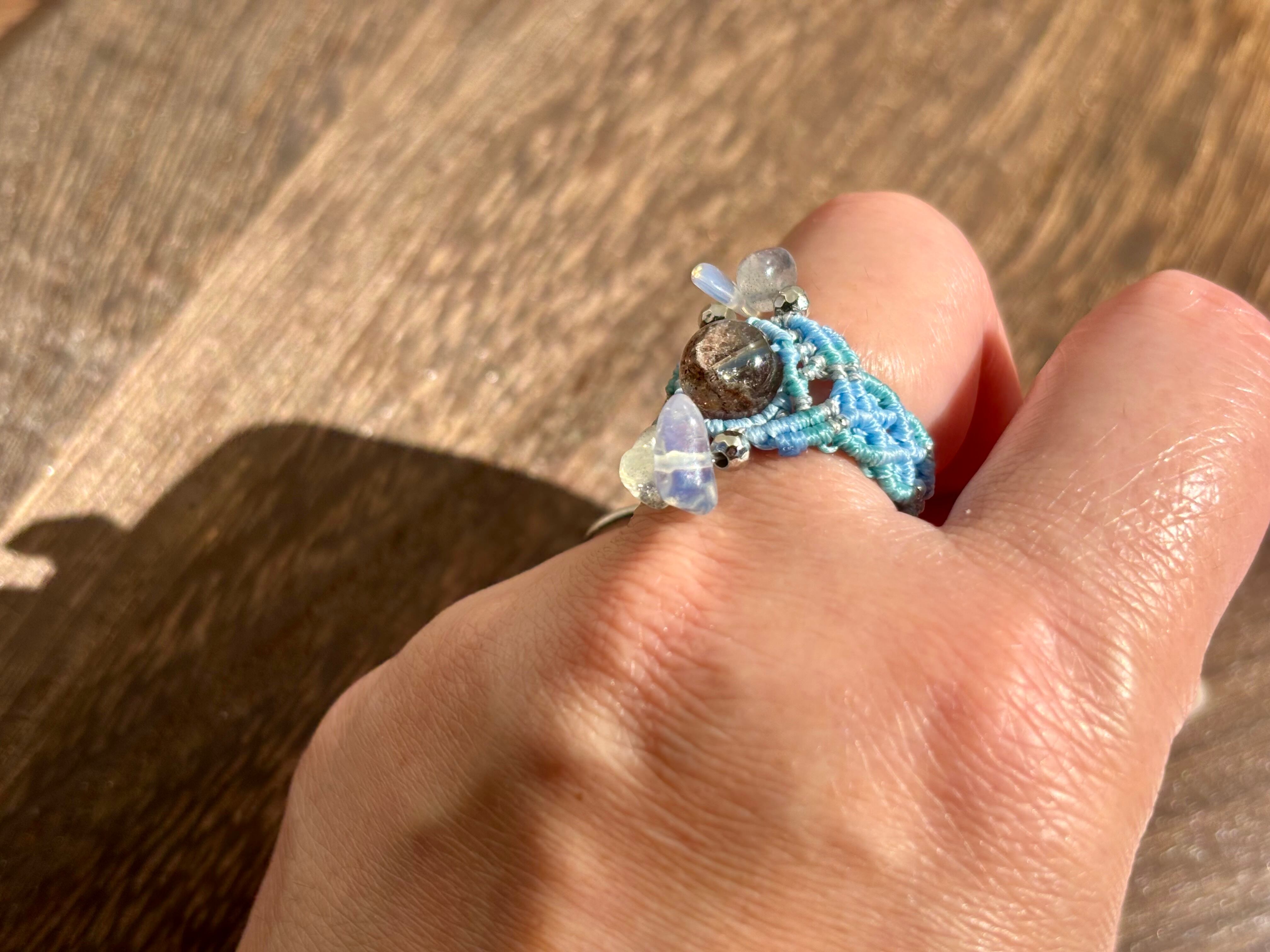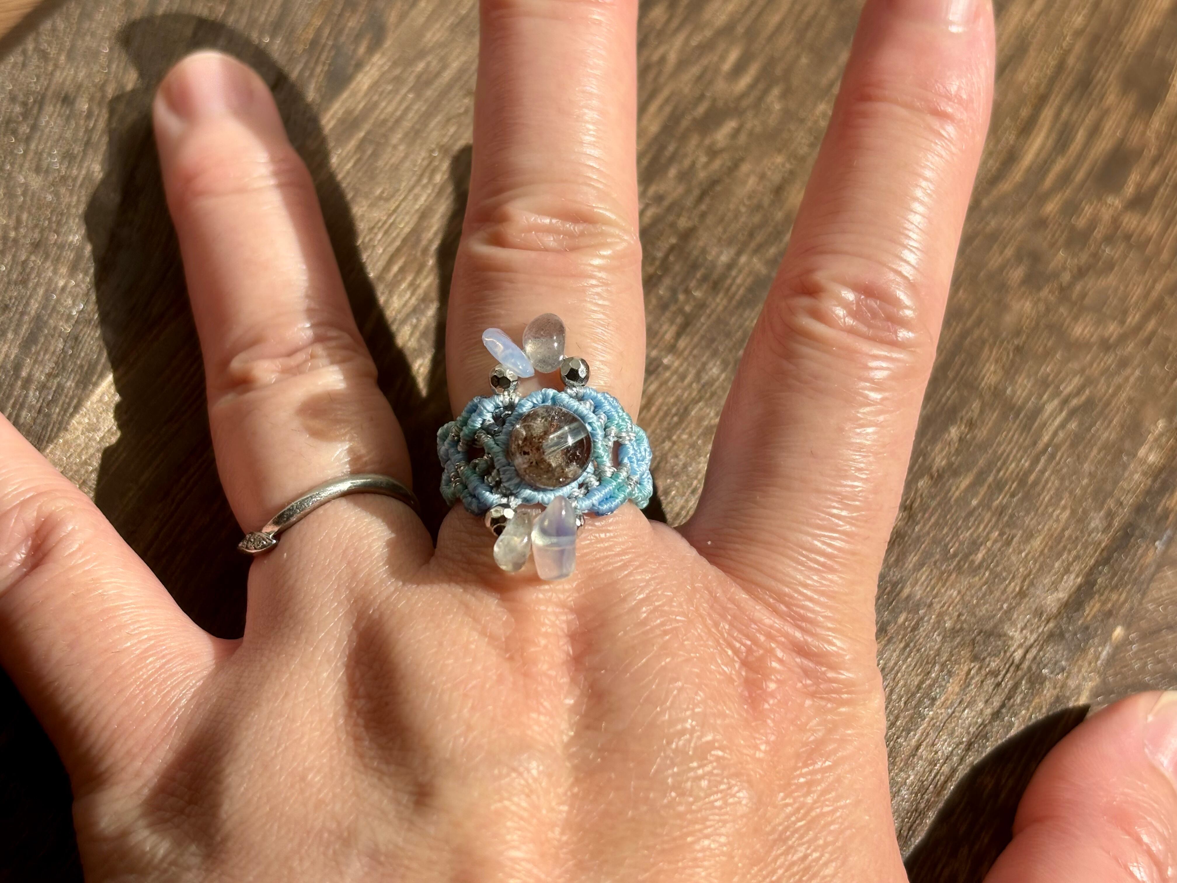 #1105高透明!!ガーデンクォーツ一点物(ガーデンクォーツ×ラブラドライト×瑪瑙(オーロラ加工) マクラメ編みリング/指輪)