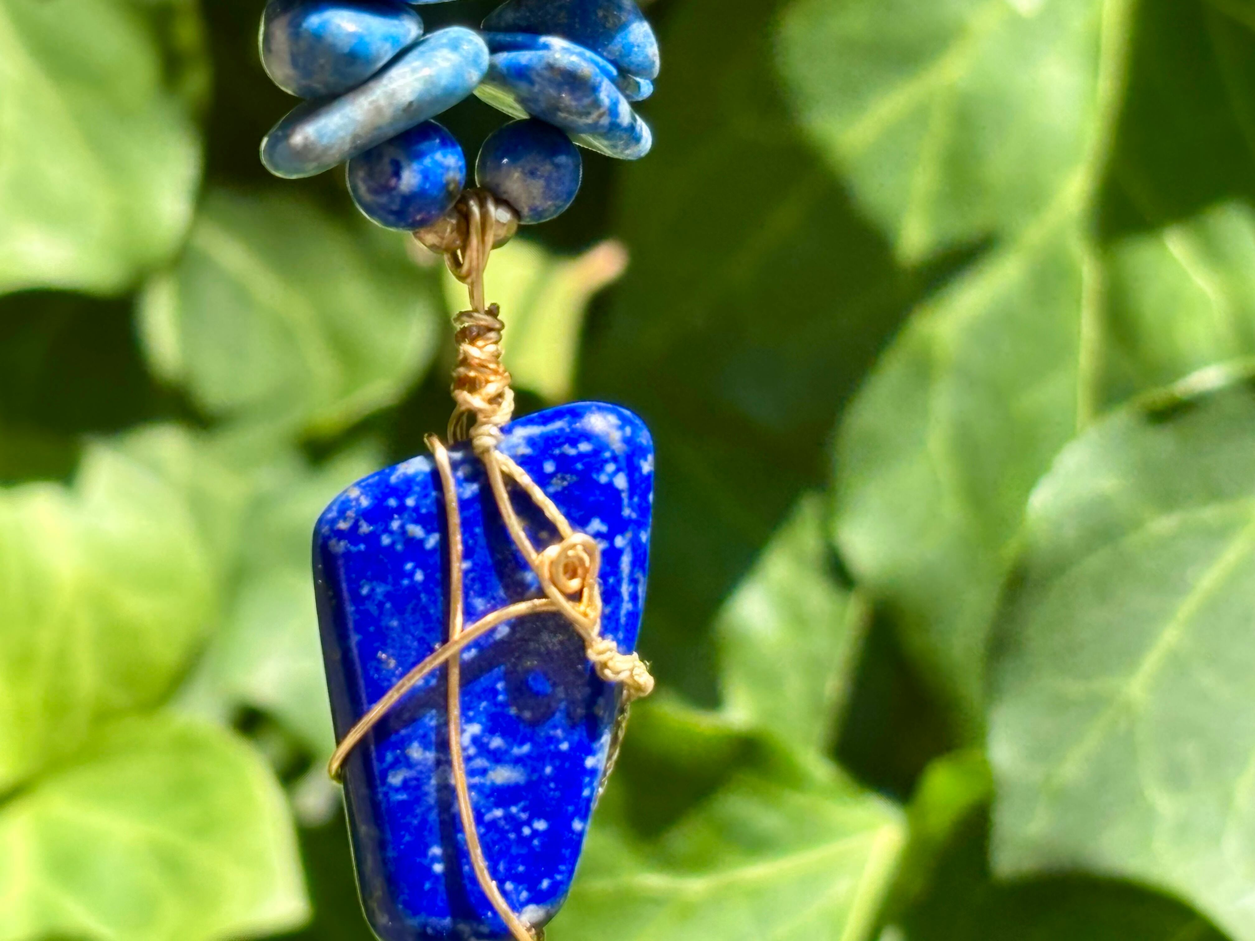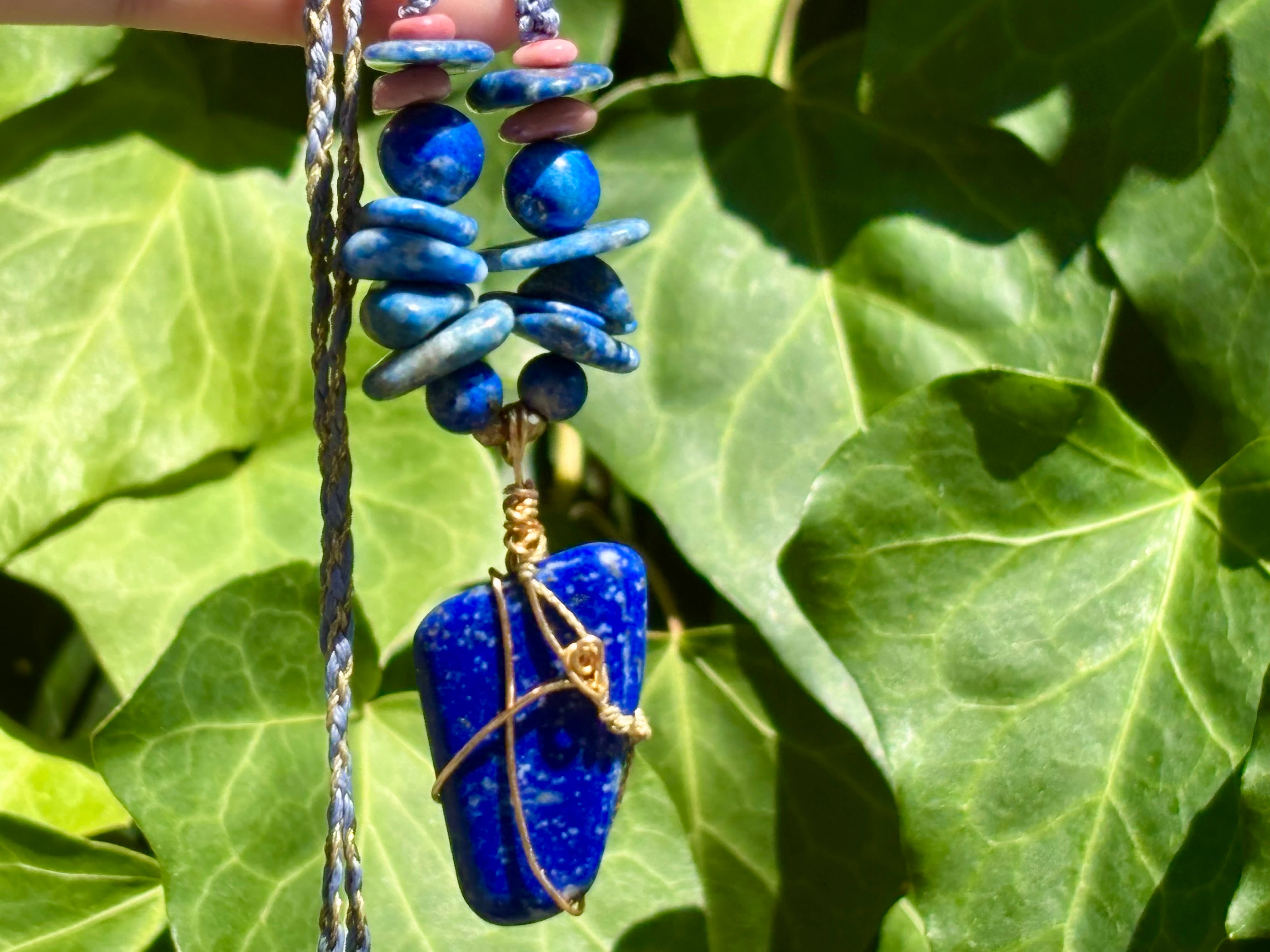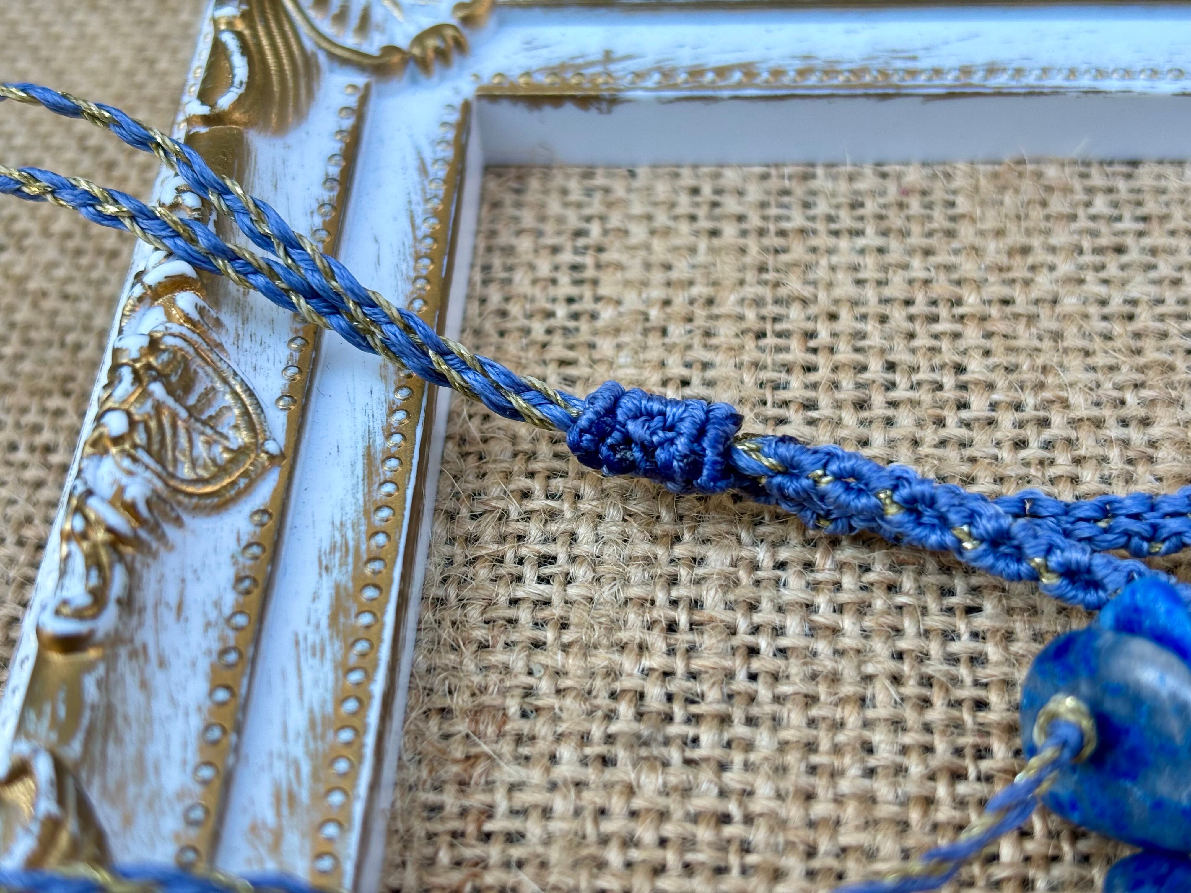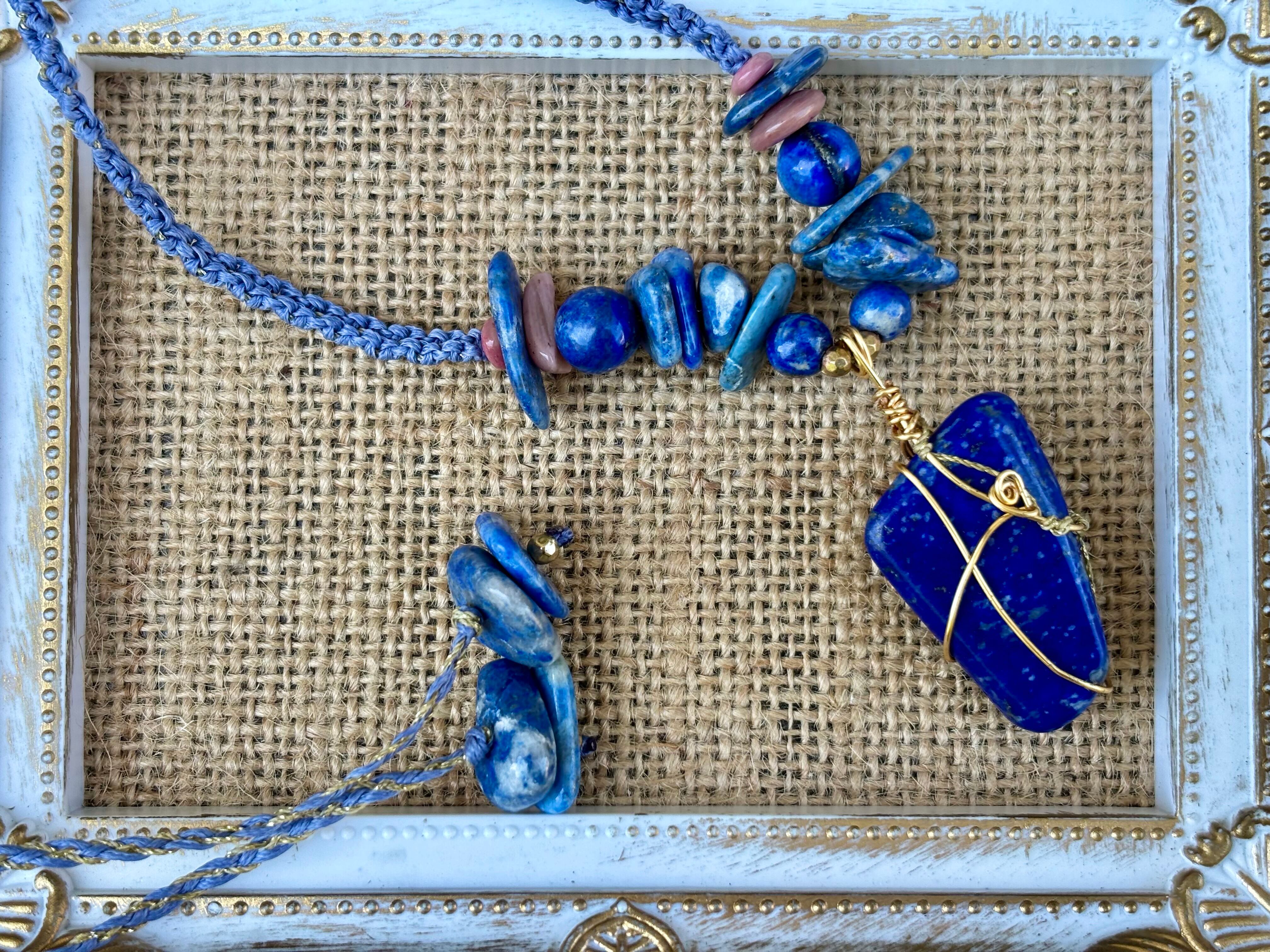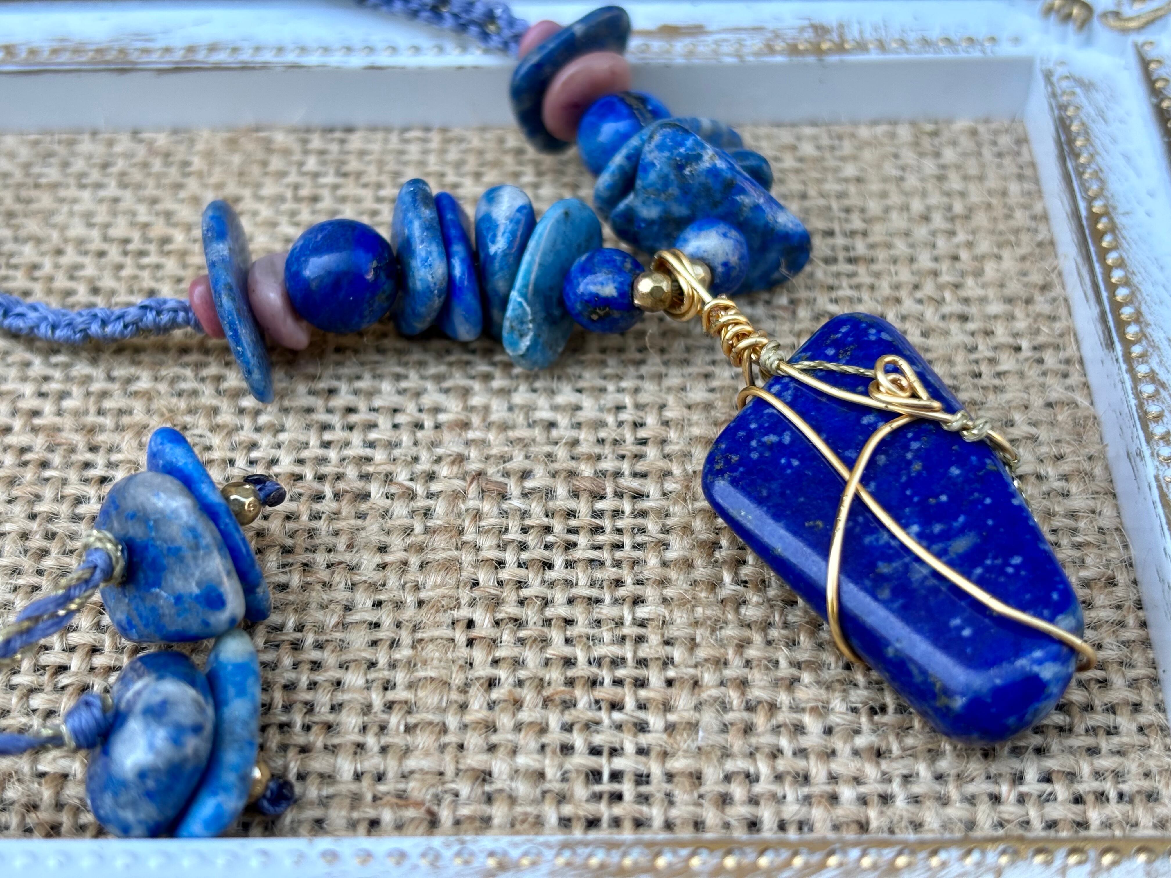 ラピスラズリとロードナイトの美しい輝きを、マクラメ編みでお届けする一点物ネックレス。古代エジプトから愛されるラピスラズリの深い青と、精神を安定させる力を持つロードナイトが、編み上げられた独特のデザインで輝きます。
