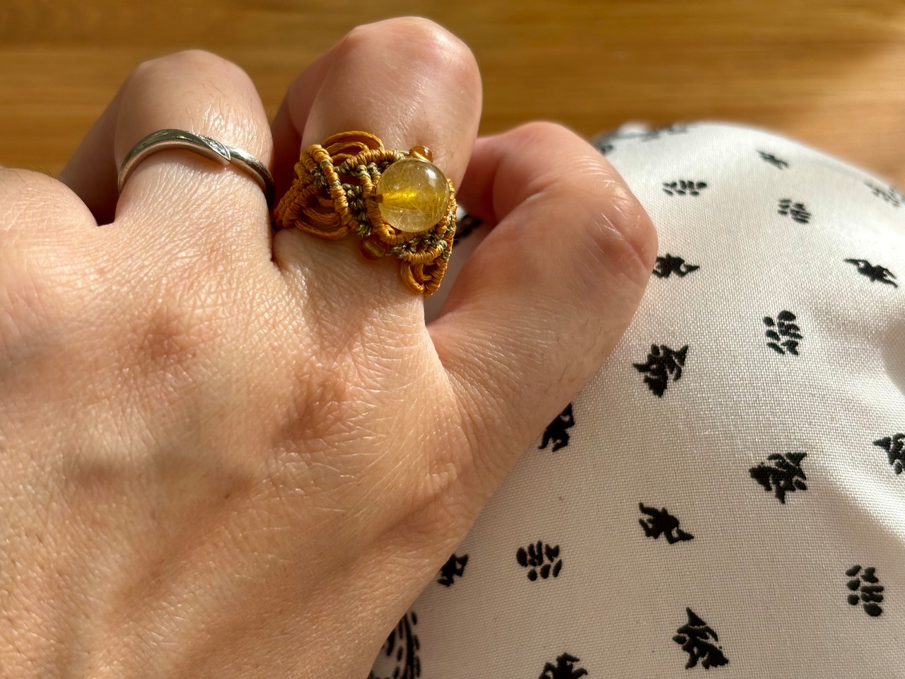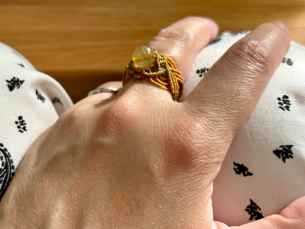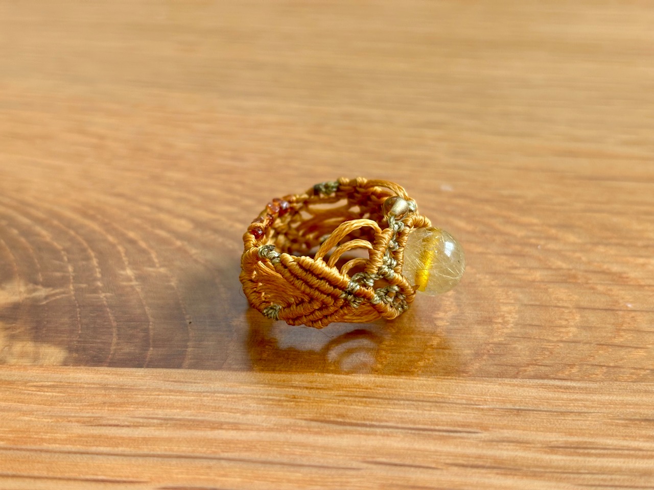 美しいルチルクォーツとシトリンを使用したマクラメ編みリングです。この特別な組み合わせは、あなたのスタイルに独自の輝きを与え、日常に温かいエネルギーをもたらします。