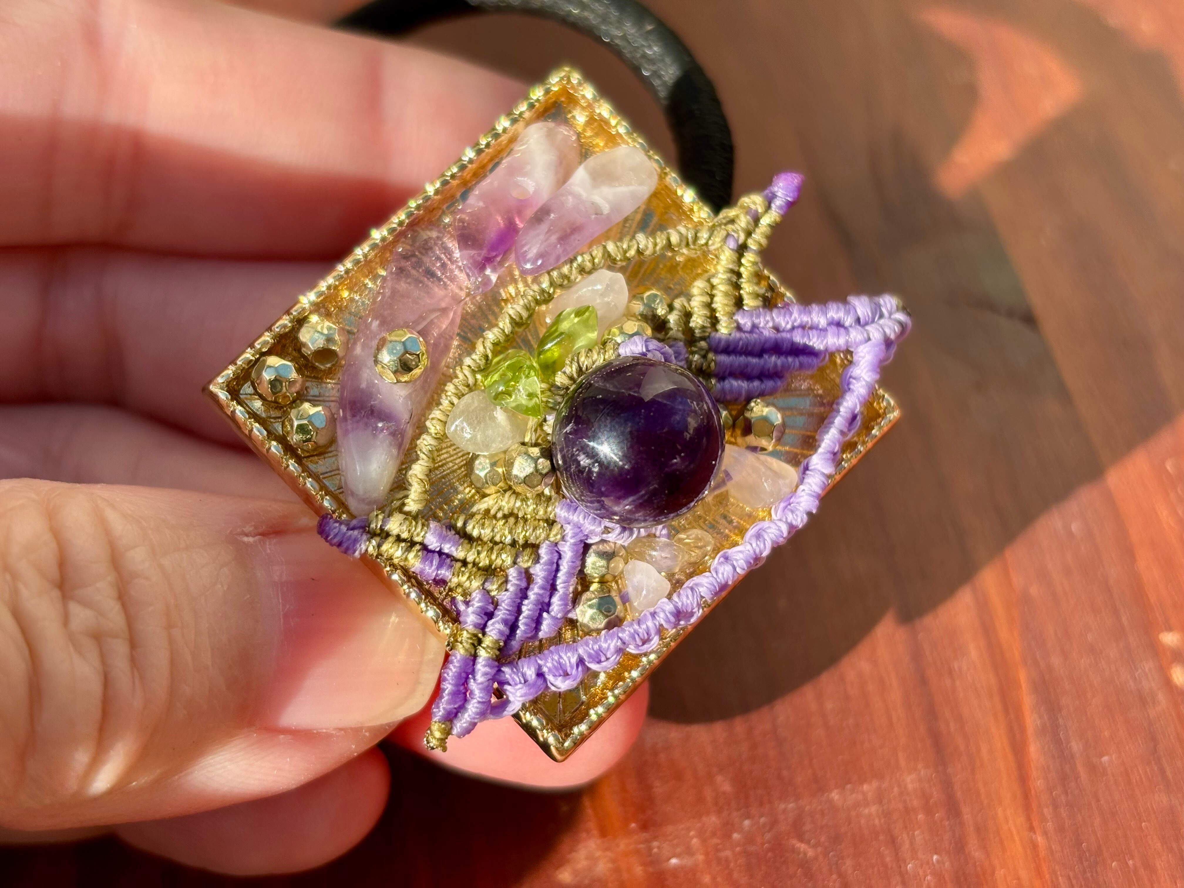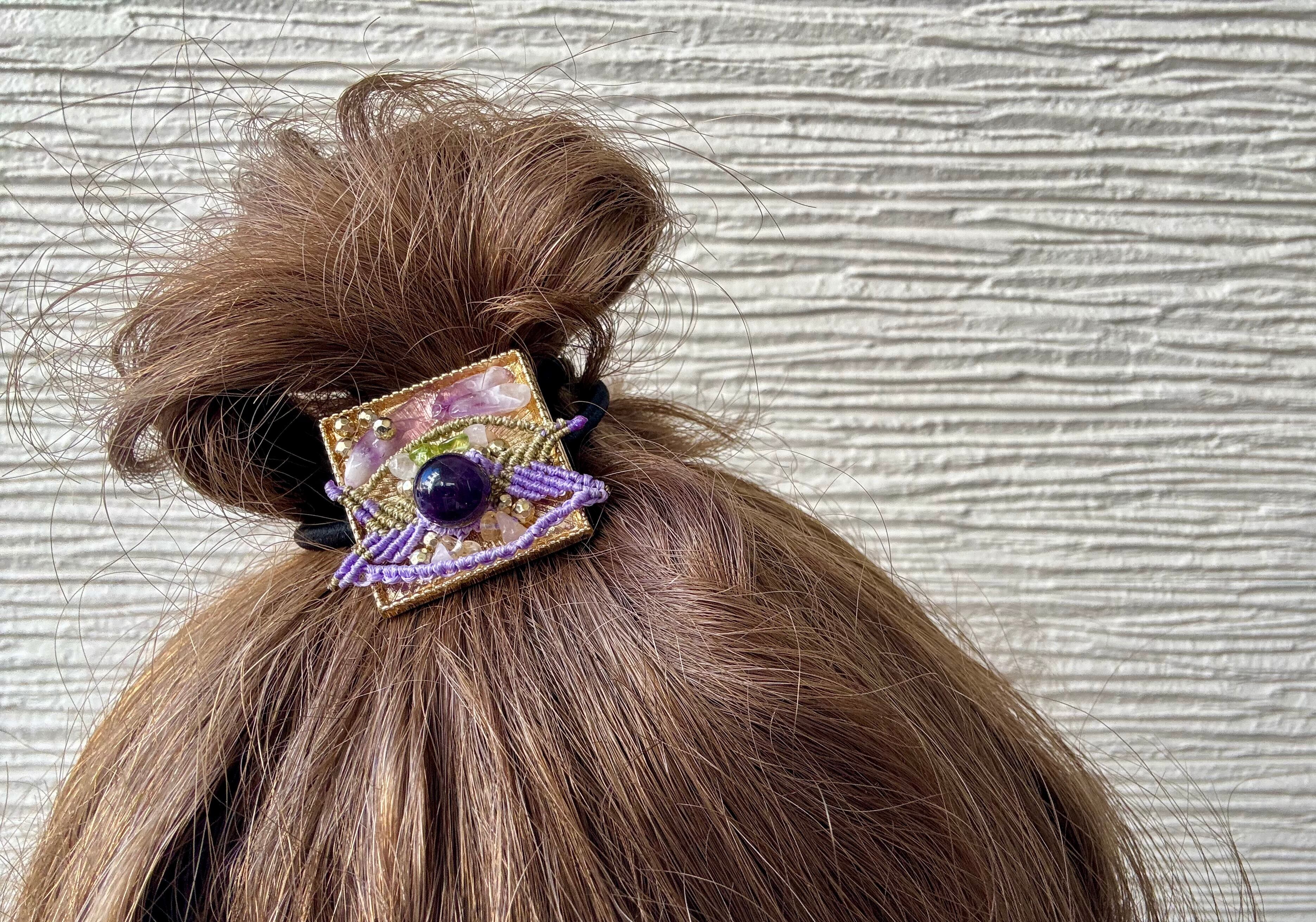 このAyuttaya 一点物マクラメ編みヘアゴムは、アメジスト、ペリドット、ローズクォーツ、シトリンといった貴重な宝石を贅沢に使用した、美しい一点物ヘアアクセサリーです。