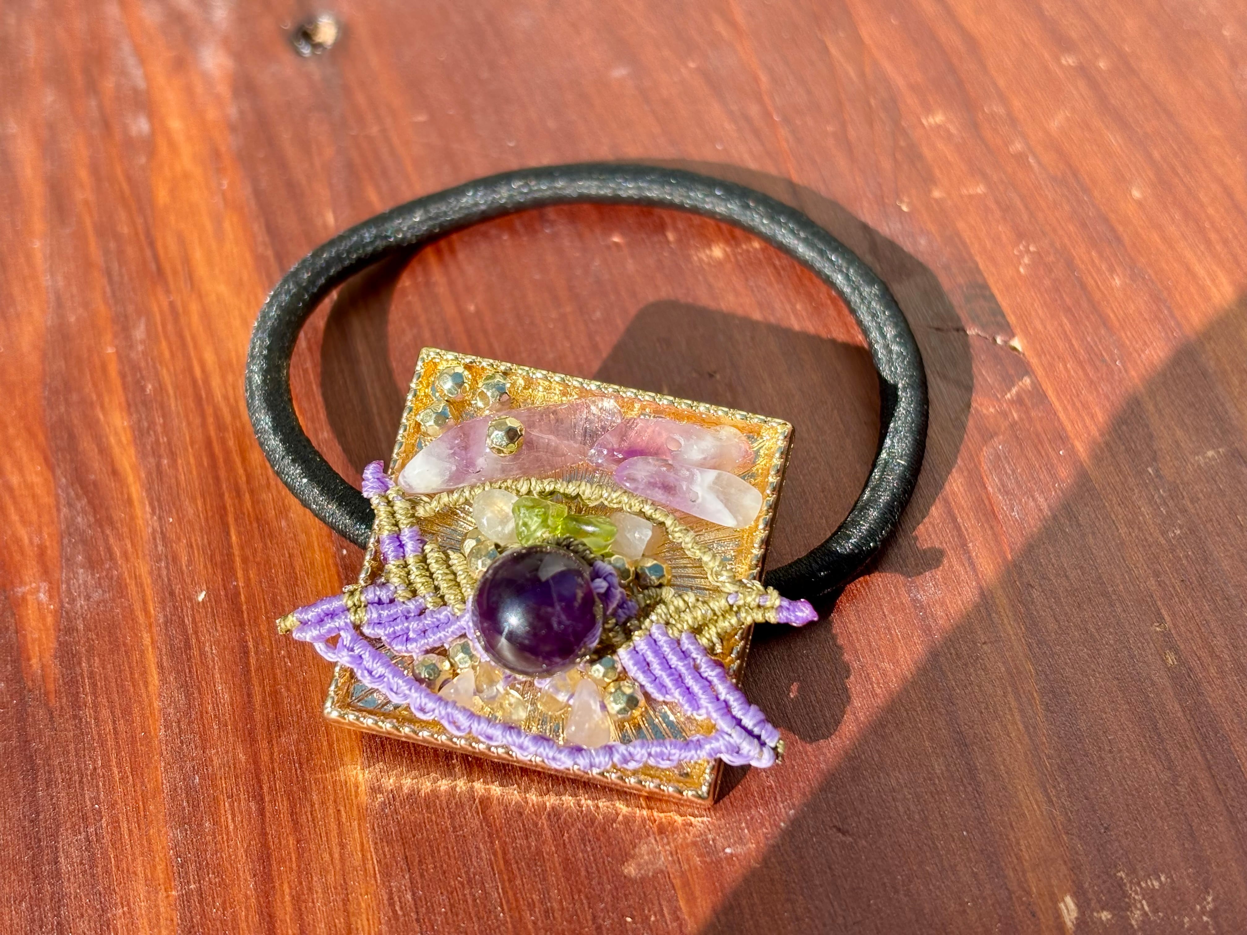 #474 World Heritage Ayuttaya 一点物 (アメジスト×ペリドット×ローズクォーツ×シトリン マクラメ編みヘアゴム)