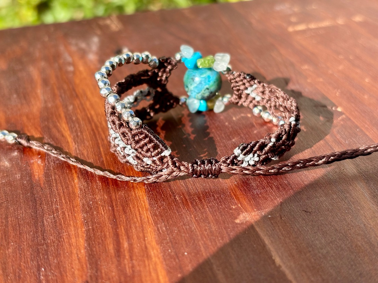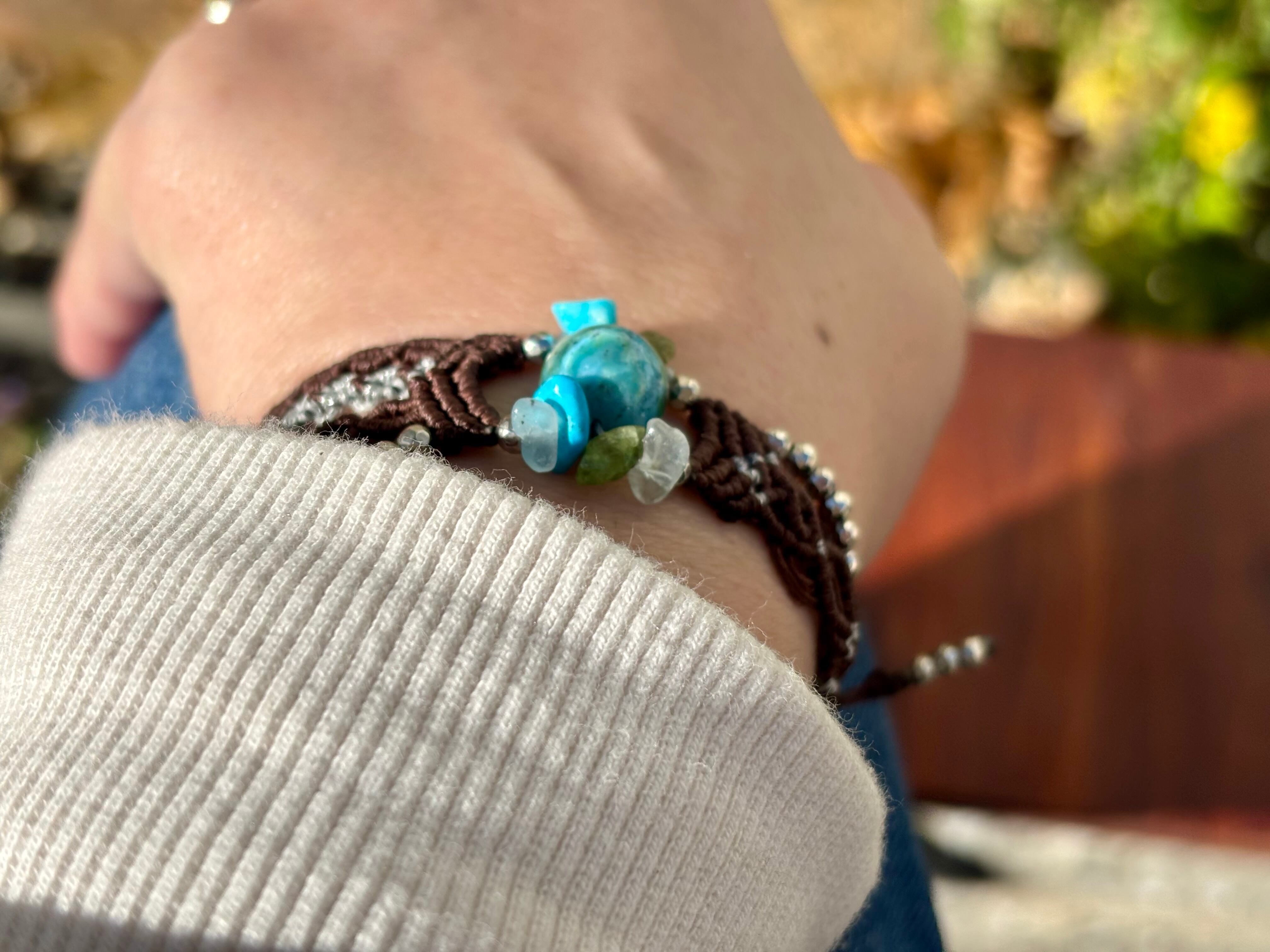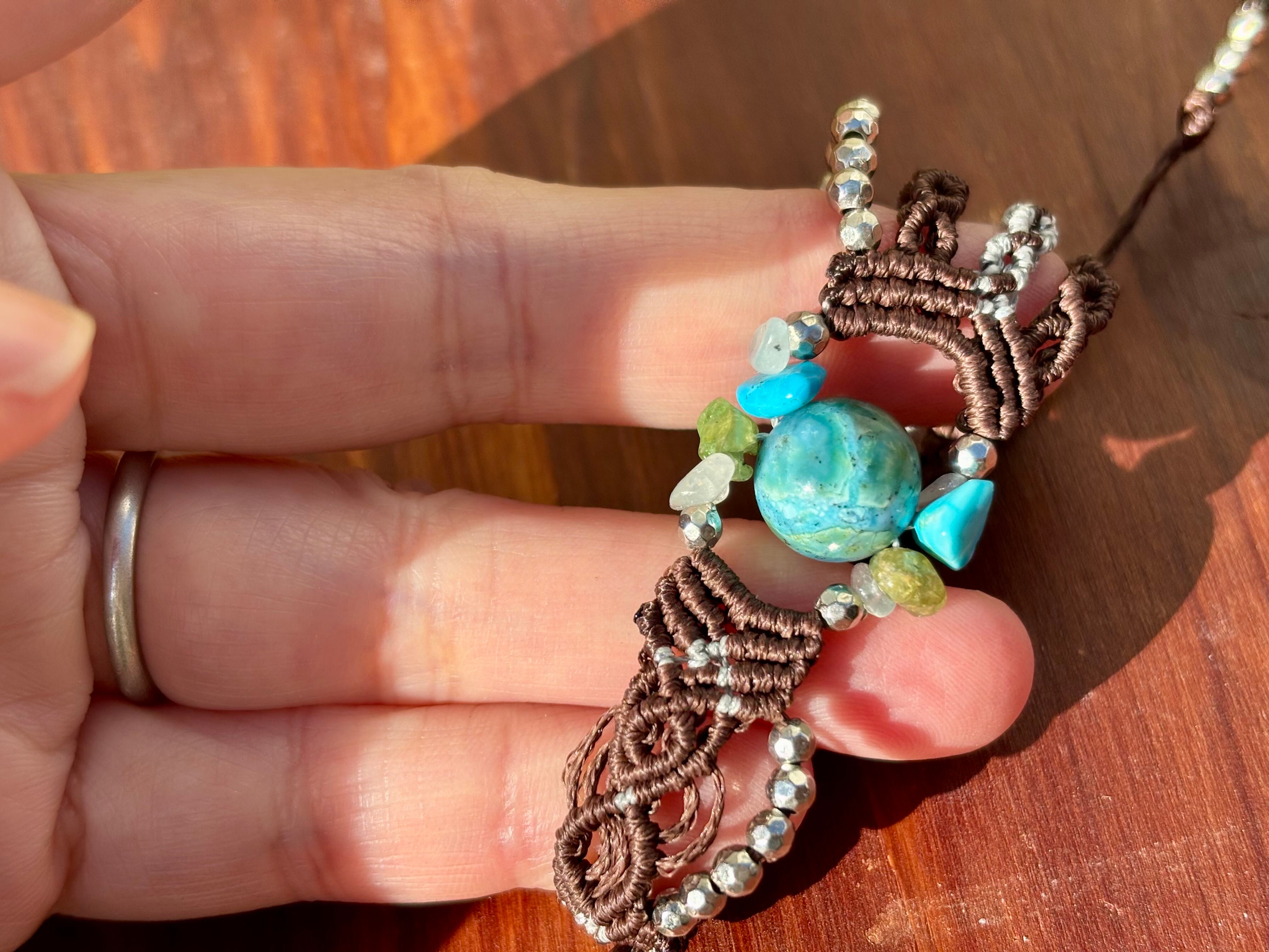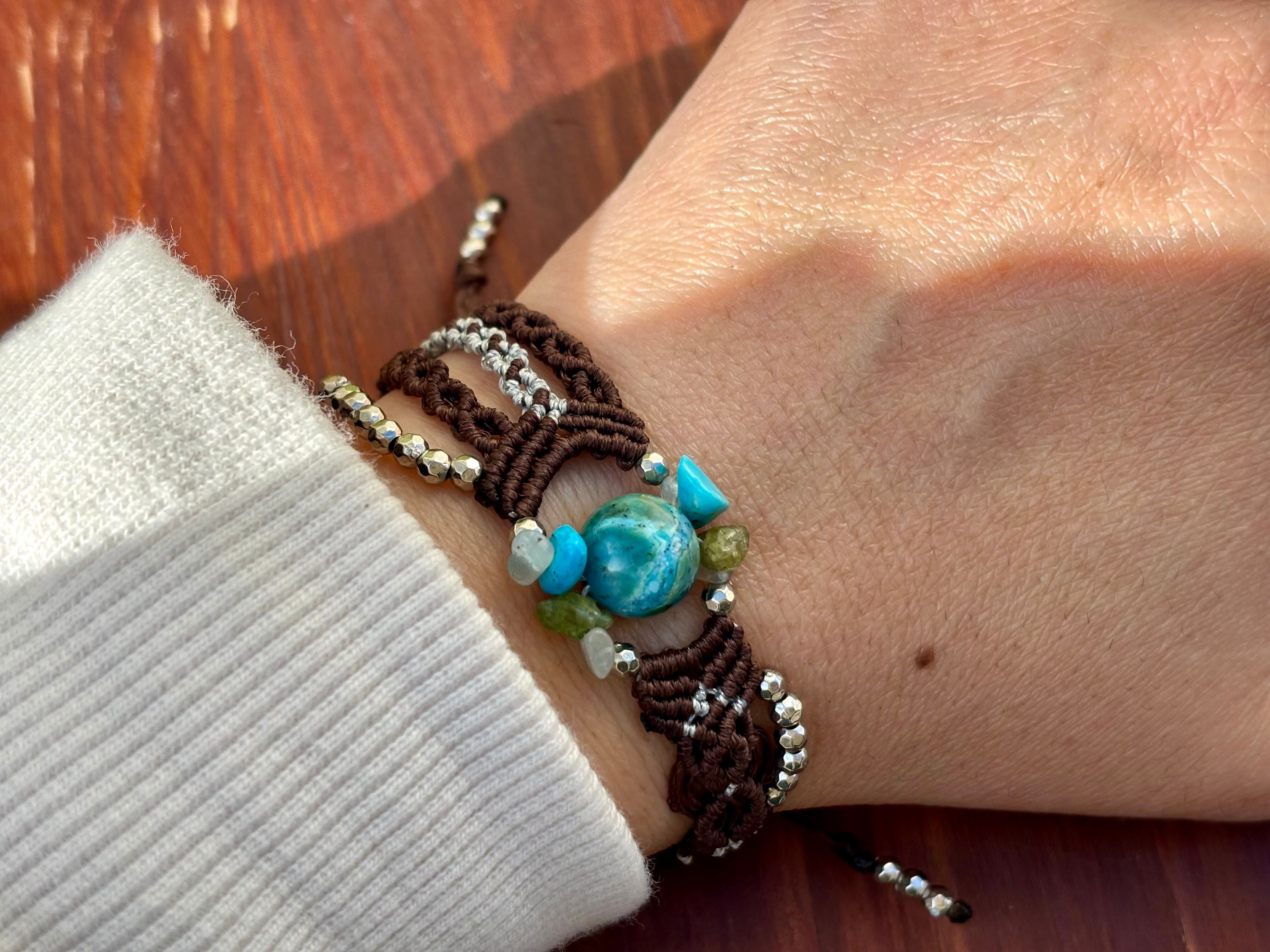 #476 World Heritage Ayuttaya (スキャポライトインクリソコラ×ペリドット×ターコイズ×アクアマリン マクラメ編みブレスレット)