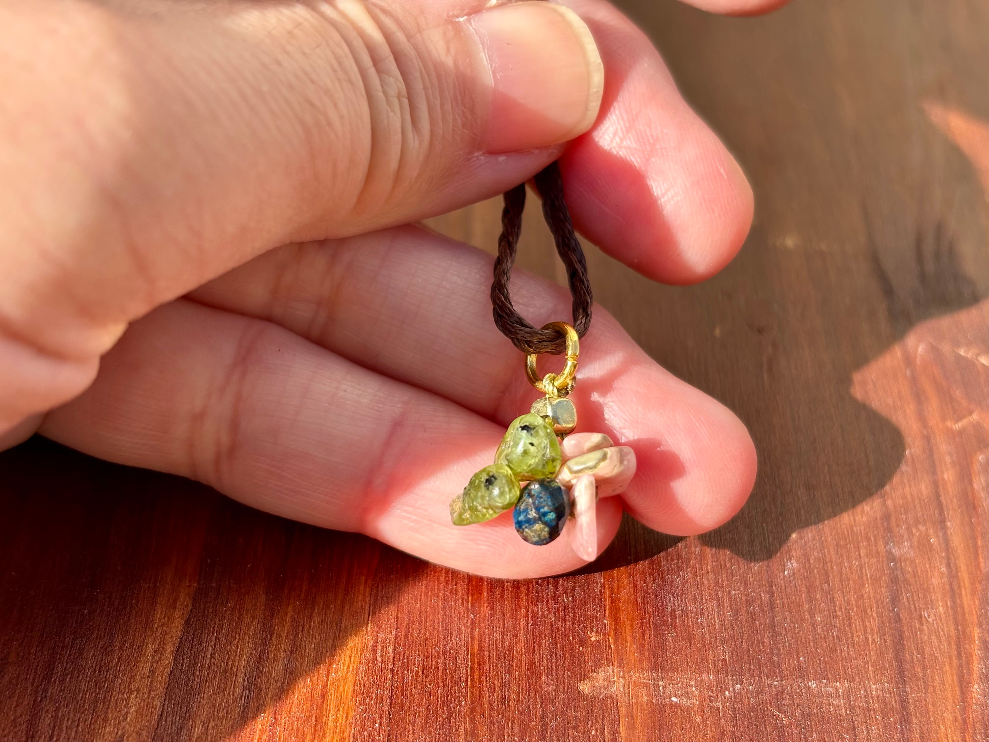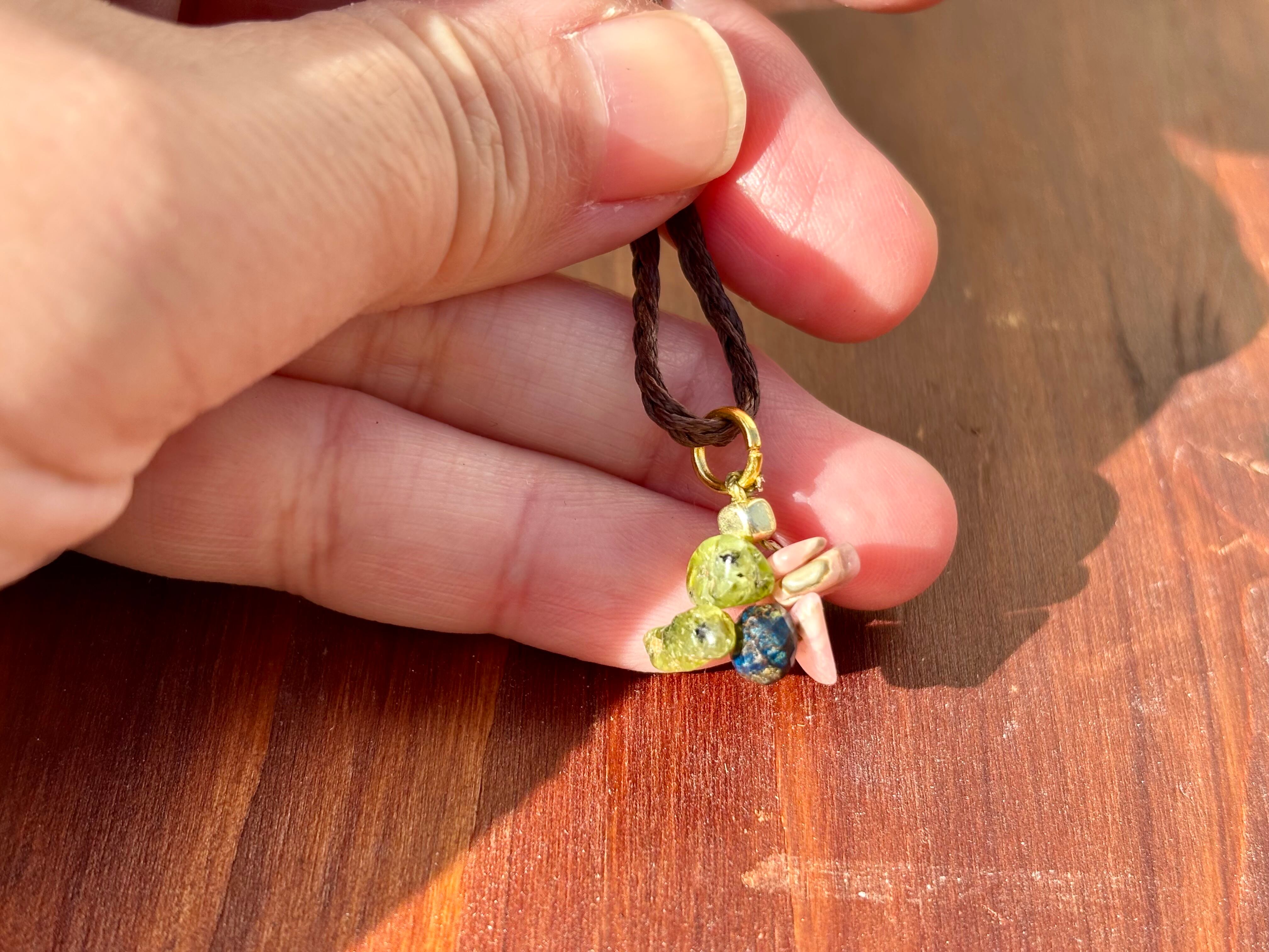 心を癒す美しい天然石を使った、このマクラメ編みネックレスは、あなたのスタイルに華やかさと神秘をプラスします。クリソコラ、インカローズ、ペリドットが見事に組み合わさり、唯一無二の魅力を放つ一点物です。それぞれの石が持つエネルギーは、あなたの日常に特別な輝きをもたらすことでしょう。