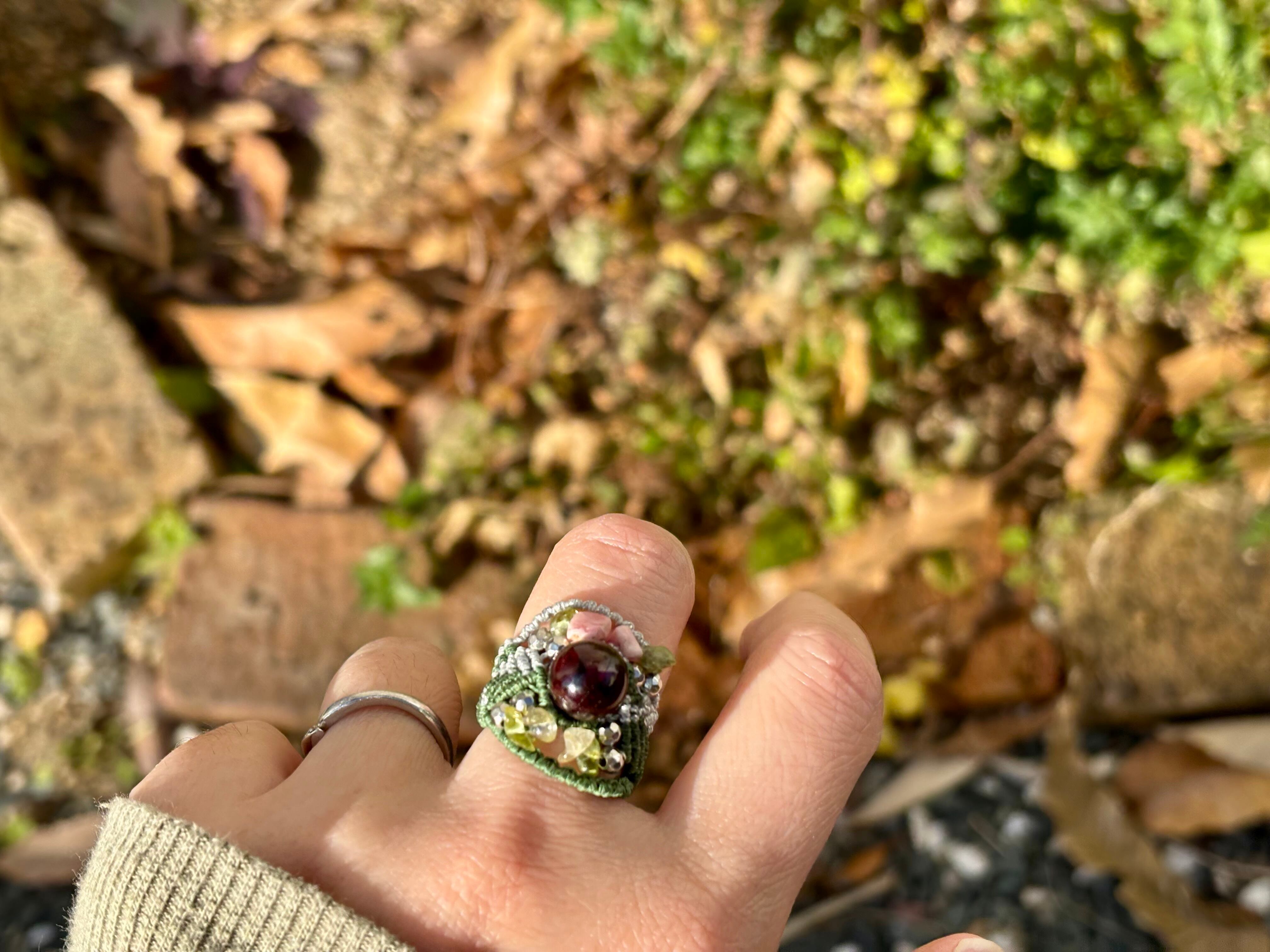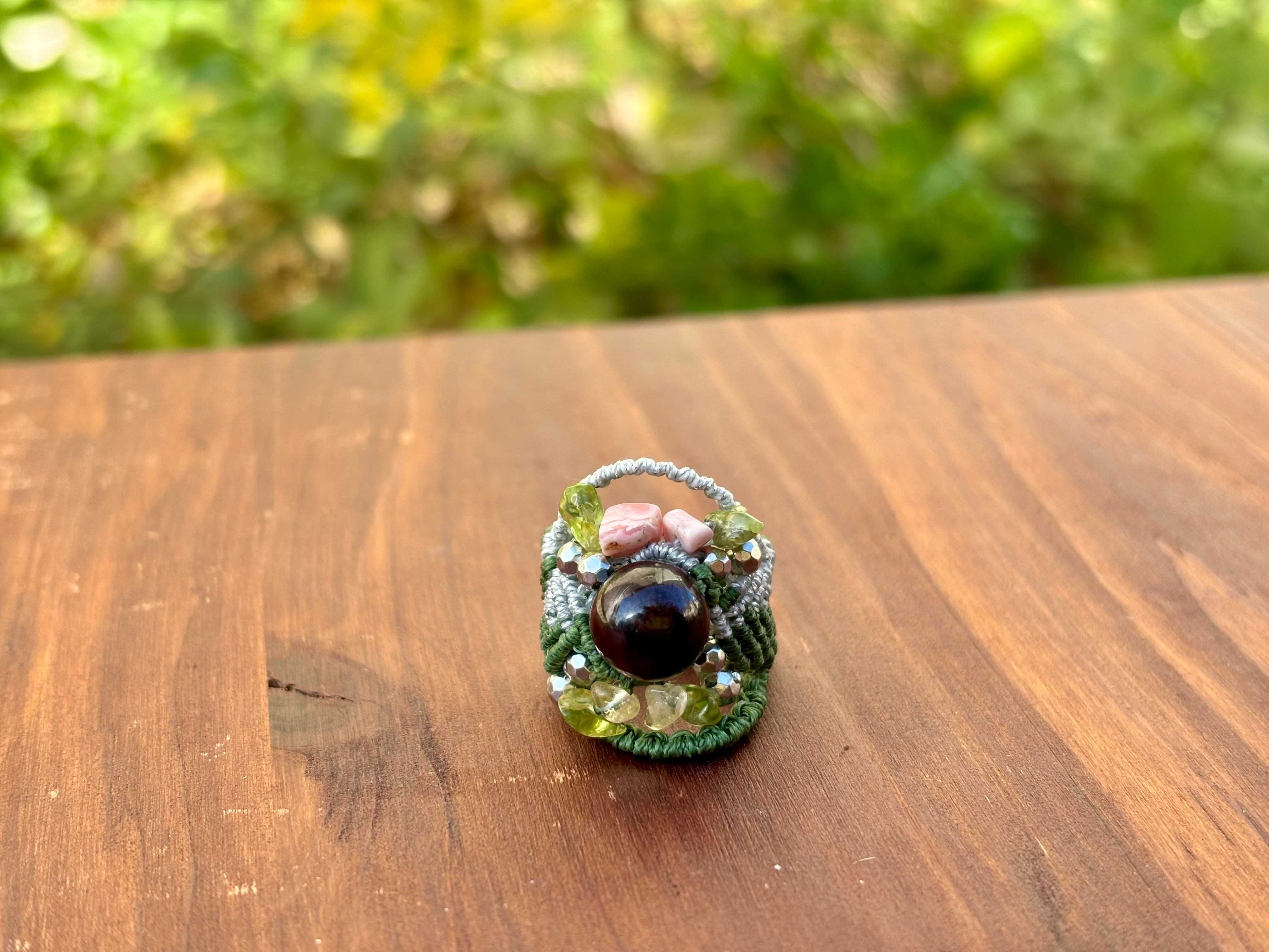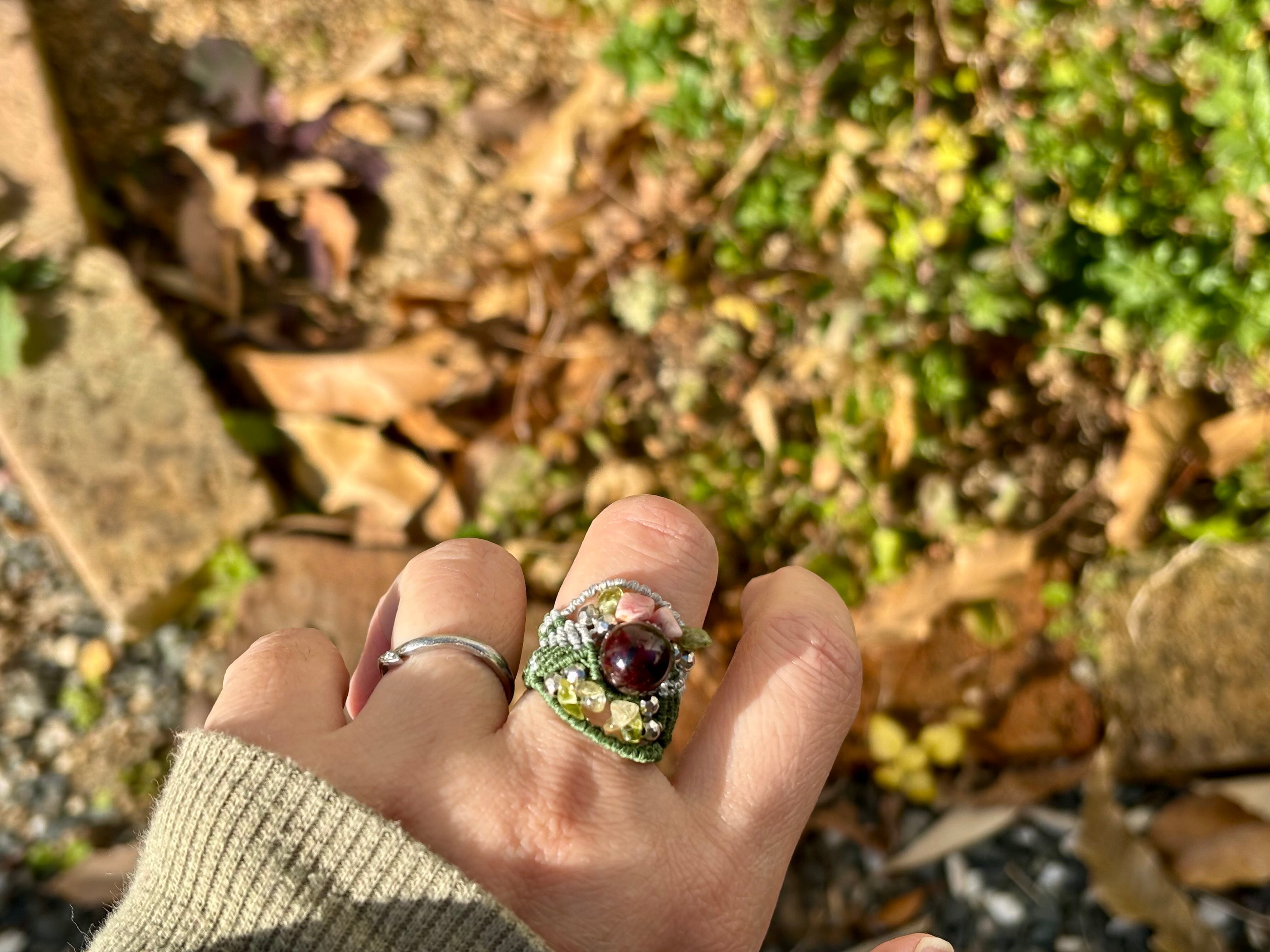 美しい天然石を贅沢に使用したこのマクラメ編みリングは、あなたのファッションスタイルに華やかさをプラスし、特別な存在感を放ちます。ガーネット、ペリドット、インカローズ、シトリンがバランスよく配置された一点物で、それぞれの石が持つ特別なエネルギーが日常を彩ることでしょう。天然石のヒーリング効果も魅力的です。