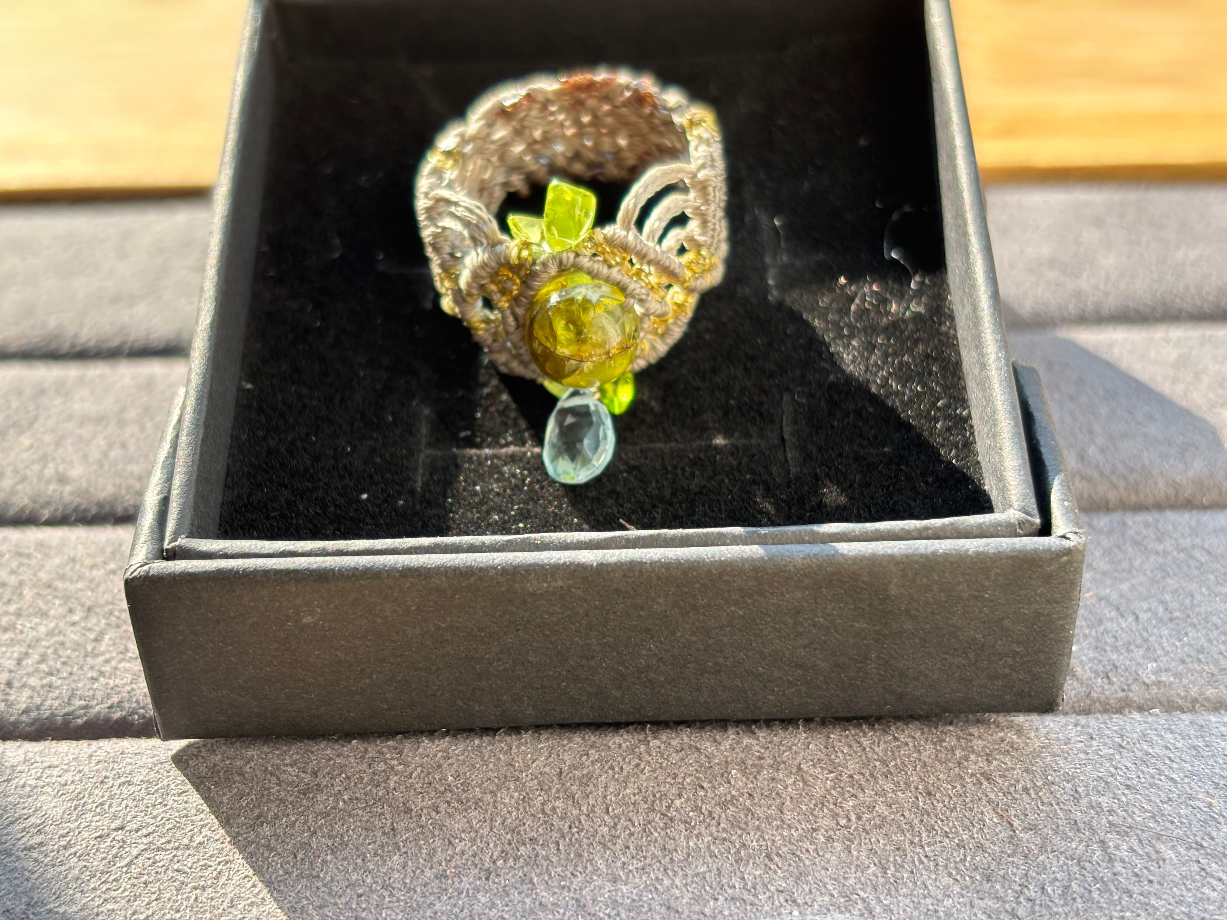 シンプルながらも独自の魅力が詰まった、#509 一点物Mont-Saint Michaelリング。ペリドットとブルートパーズを贅沢に使用したマクラメ編みの指輪は、まるでモンサンミッシェルのように、見る人の心をつかみます。天然石の煌めきを存分にお楽しみいただけるこの一点物は、お手元に華やかさをプラスします。