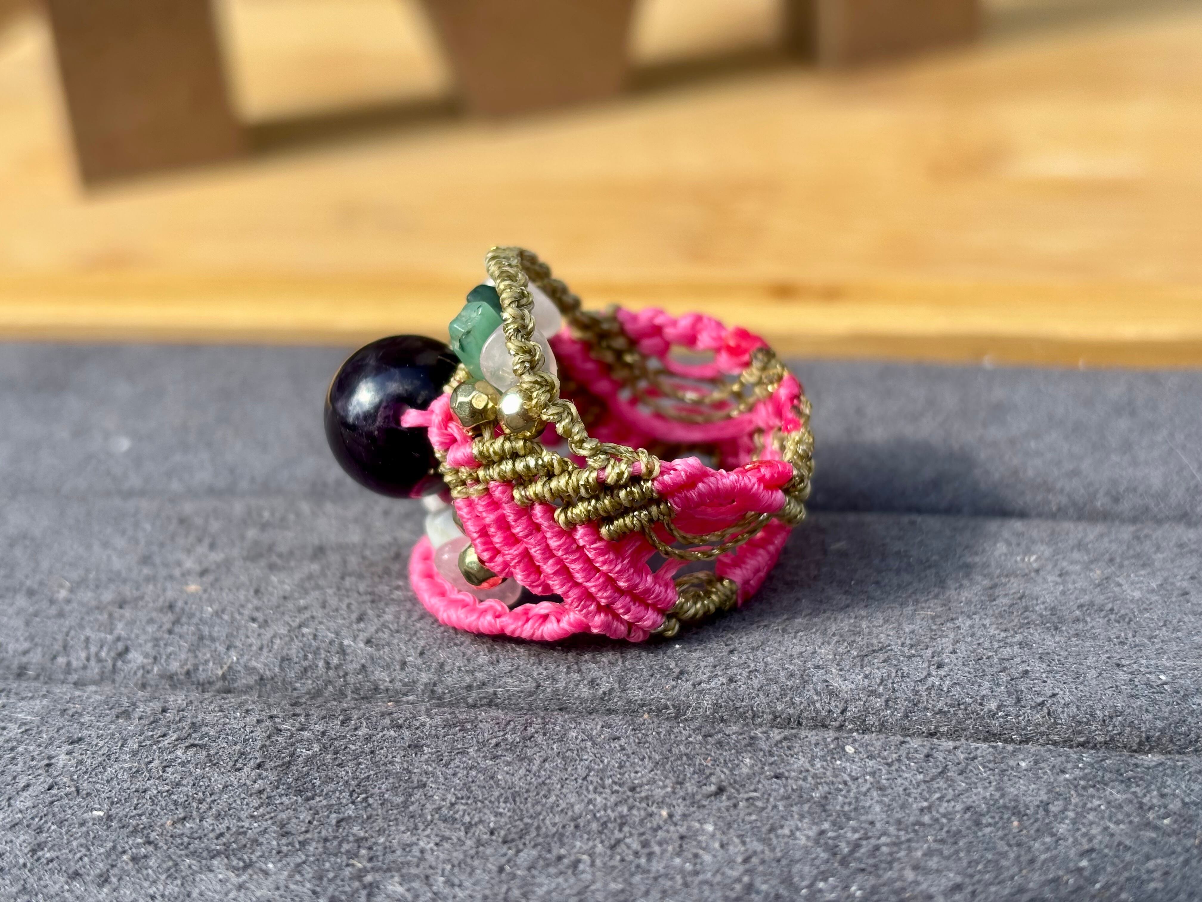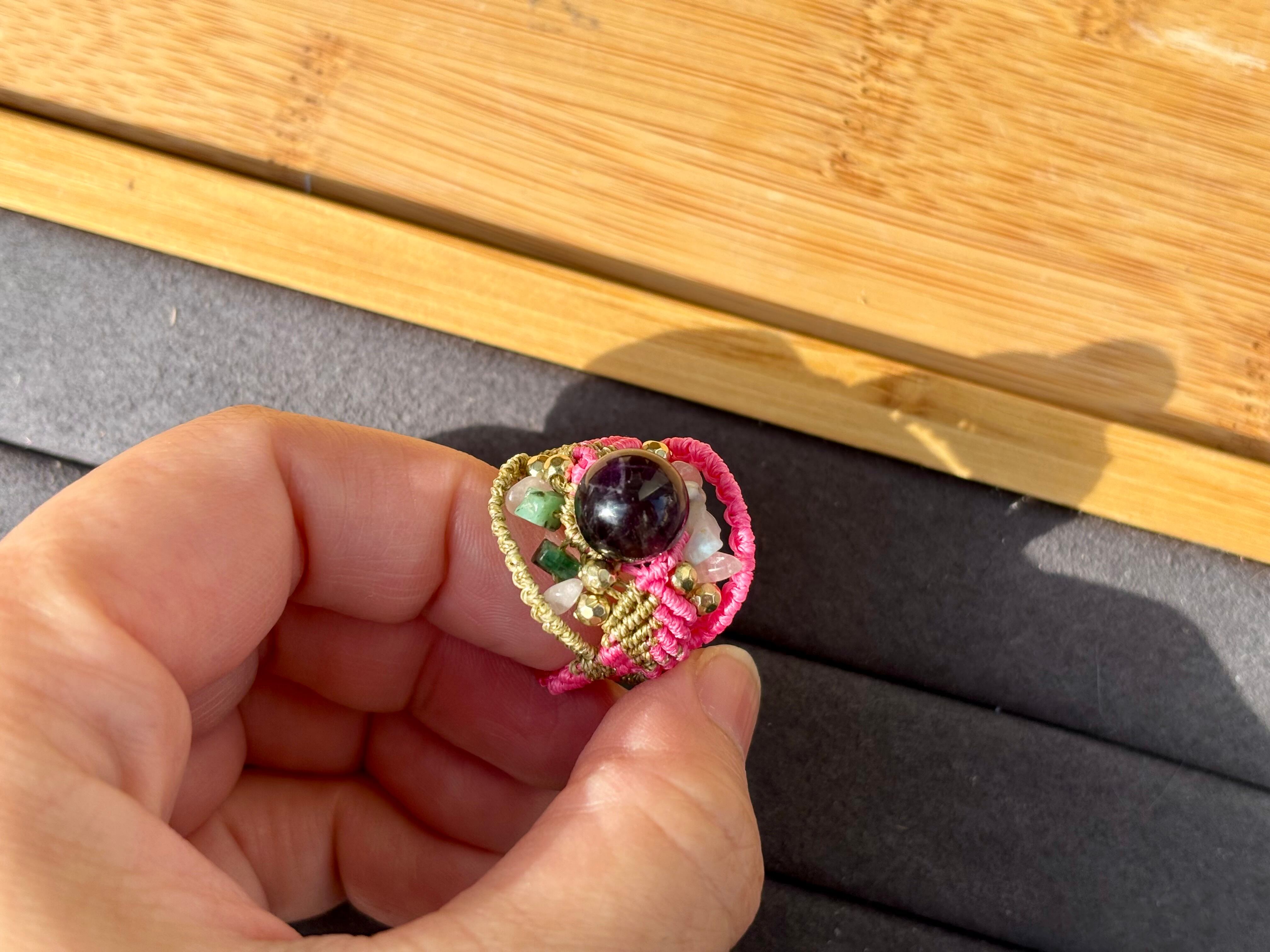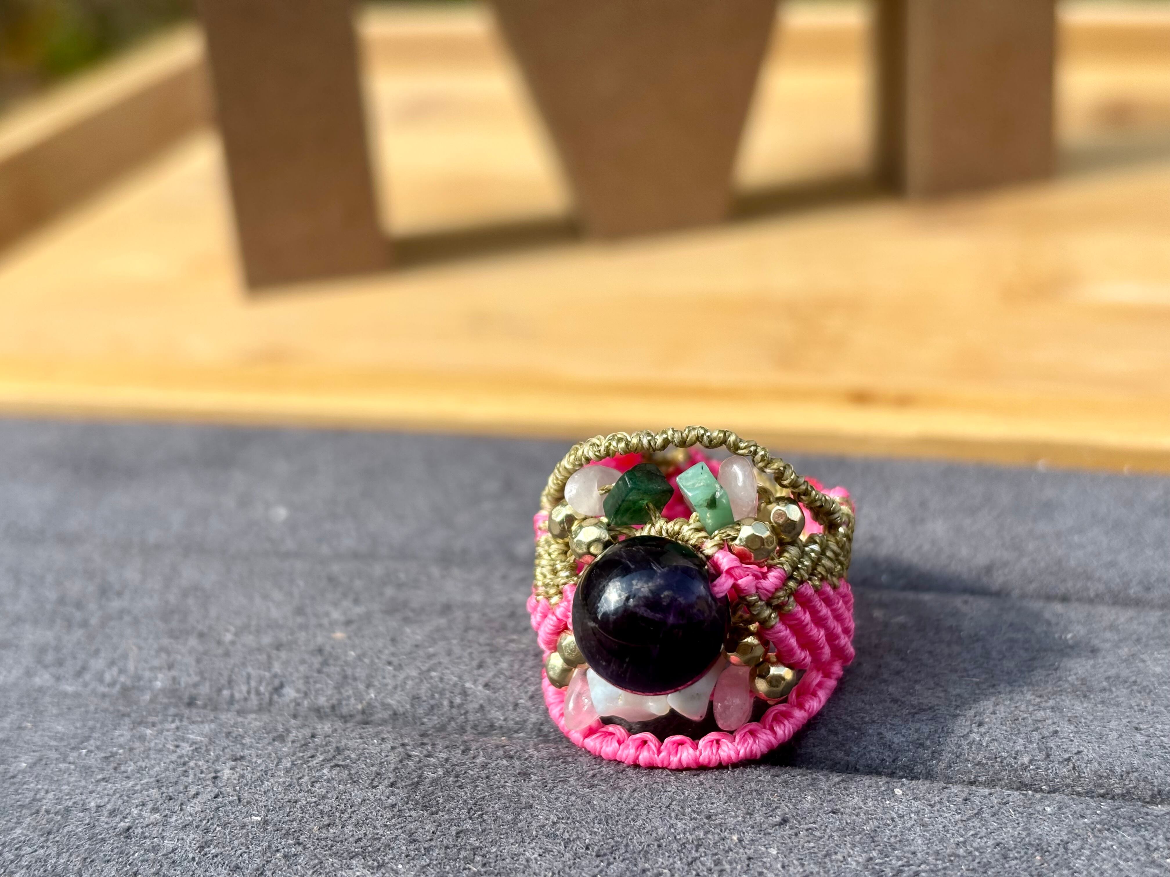 この美しいWorld Heritage Ayuttaya リングは、アメジスト、ローズクォーツ、ラリマー、エメラルドの天然石を使用した、特別なマクラメ編みリングです!それぞれの石が持つエネルギーを最大限に引き出し、身に着けることであなたに素敵な変化をもたらします。 アメジストは、心の平和や調和を象徴し、ストレスから解放される手助けをします。ローズクォーツは愛と美のシンボルで、優しさを与えてくれるでしょう。エメラルドは幸せな愛を象徴し、ラリマーは心を穏やかに保つ力を持っています。このリングを通じて、あなたの日常がより豊かで穏やかなものになることをお楽しみに!