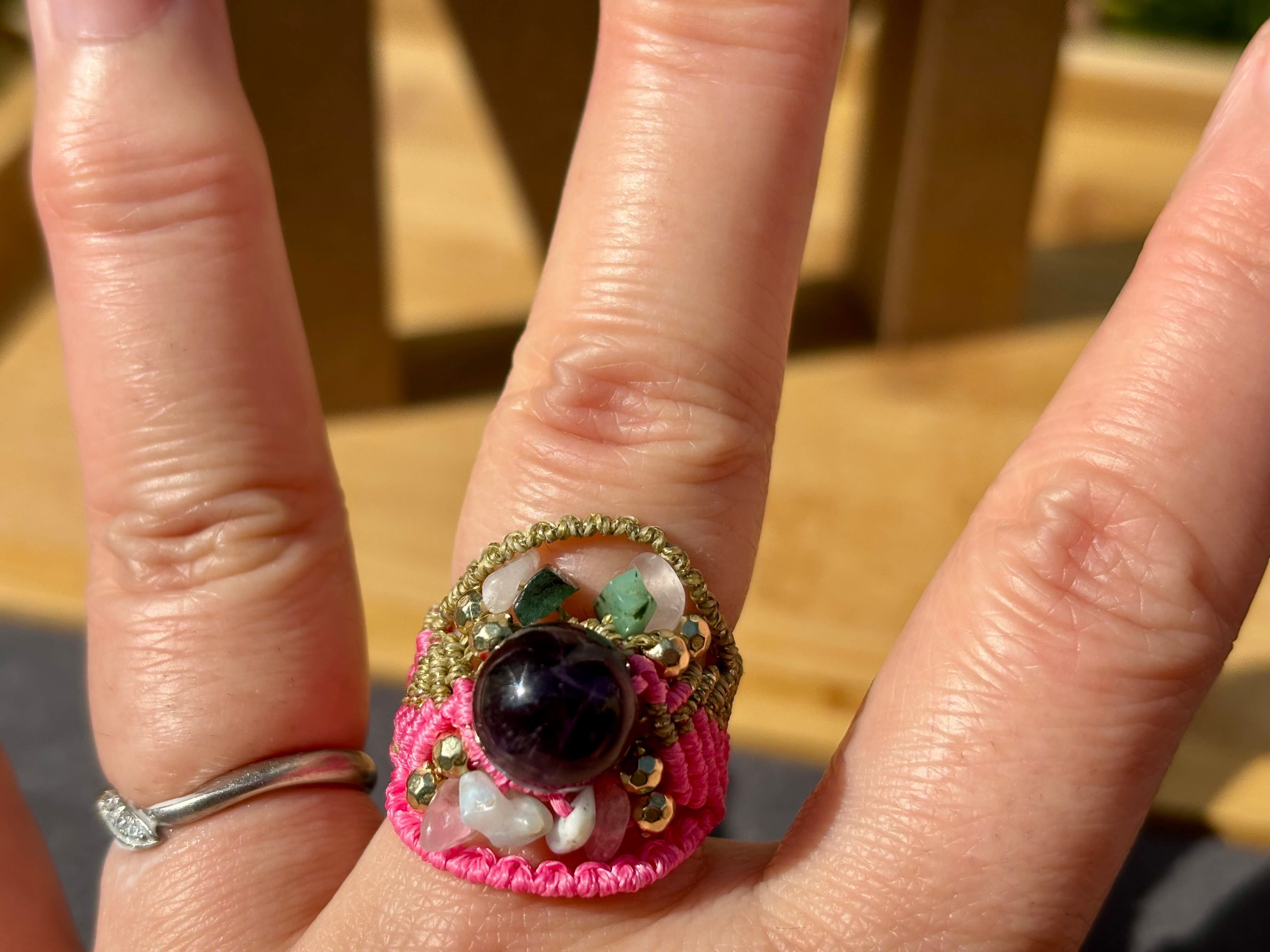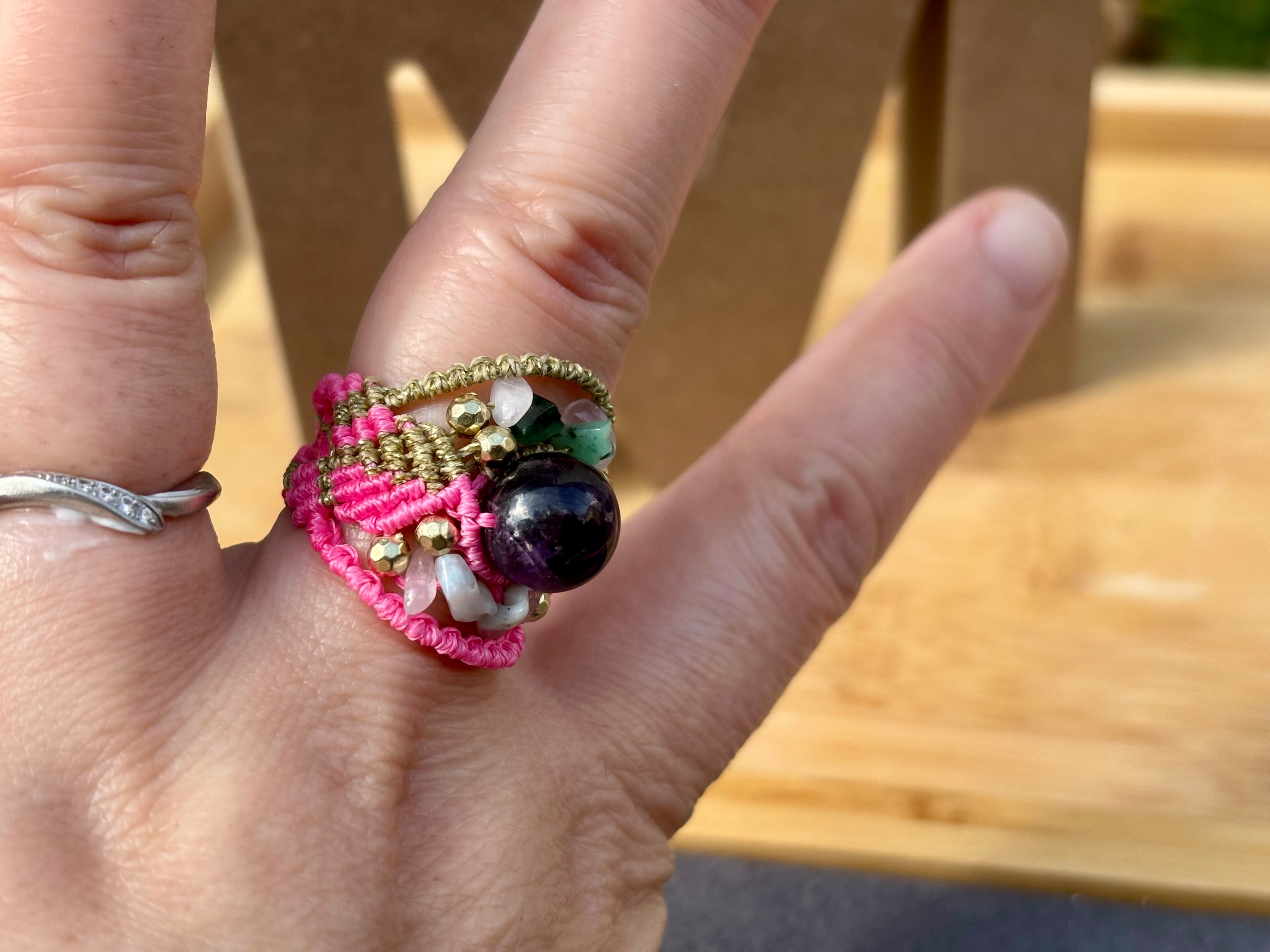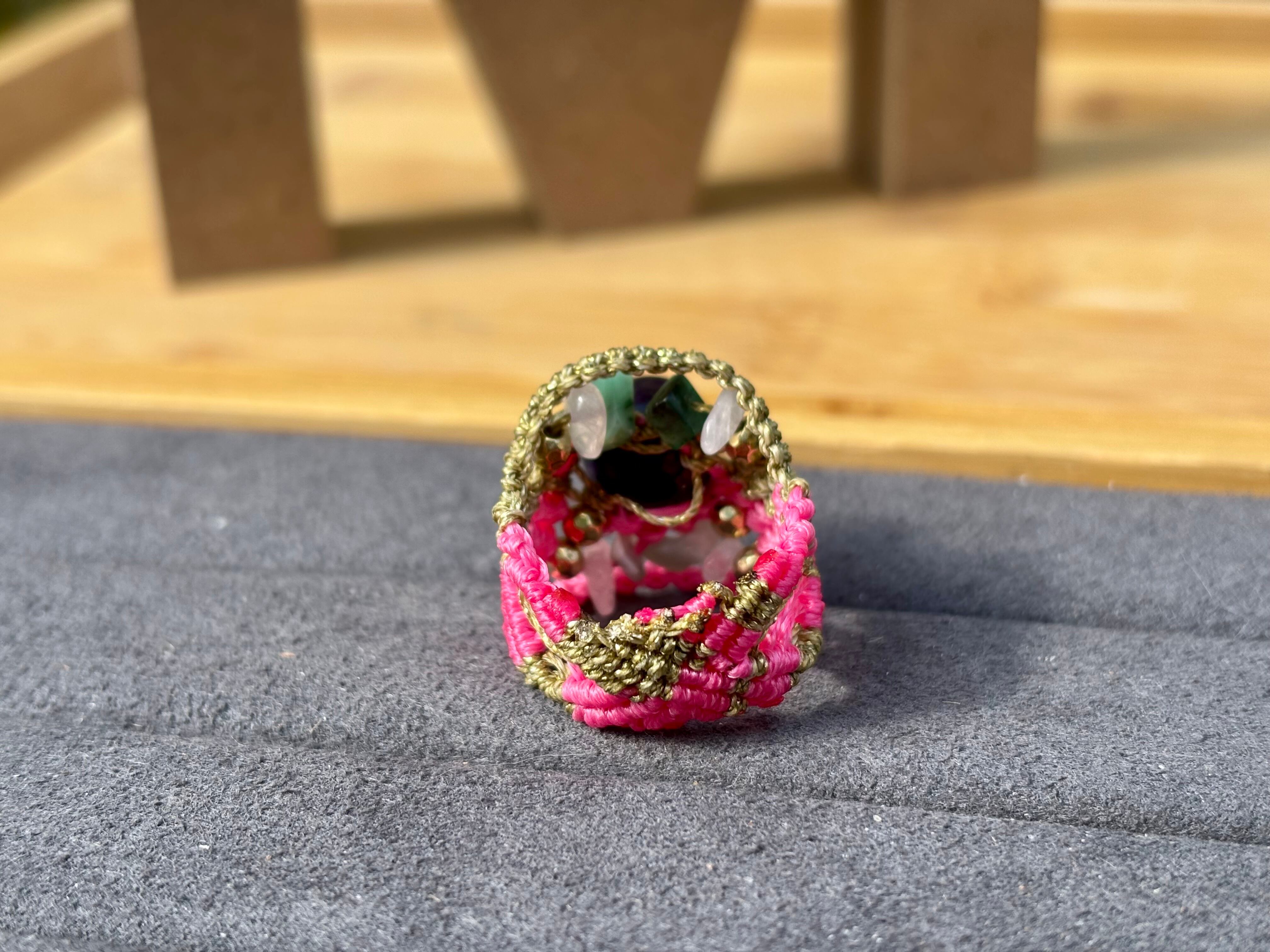 この美しいWorld Heritage Ayuttaya リングは、アメジスト、ローズクォーツ、ラリマー、エメラルドの天然石を使用した、特別なマクラメ編みリングです!それぞれの石が持つエネルギーを最大限に引き出し、身に着けることであなたに素敵な変化をもたらします。 アメジストは、心の平和や調和を象徴し、ストレスから解放される手助けをします。ローズクォーツは愛と美のシンボルで、優しさを与えてくれるでしょう。エメラルドは幸せな愛を象徴し、ラリマーは心を穏やかに保つ力を持っています。このリングを通じて、あなたの日常がより豊かで穏やかなものになることをお楽しみに!